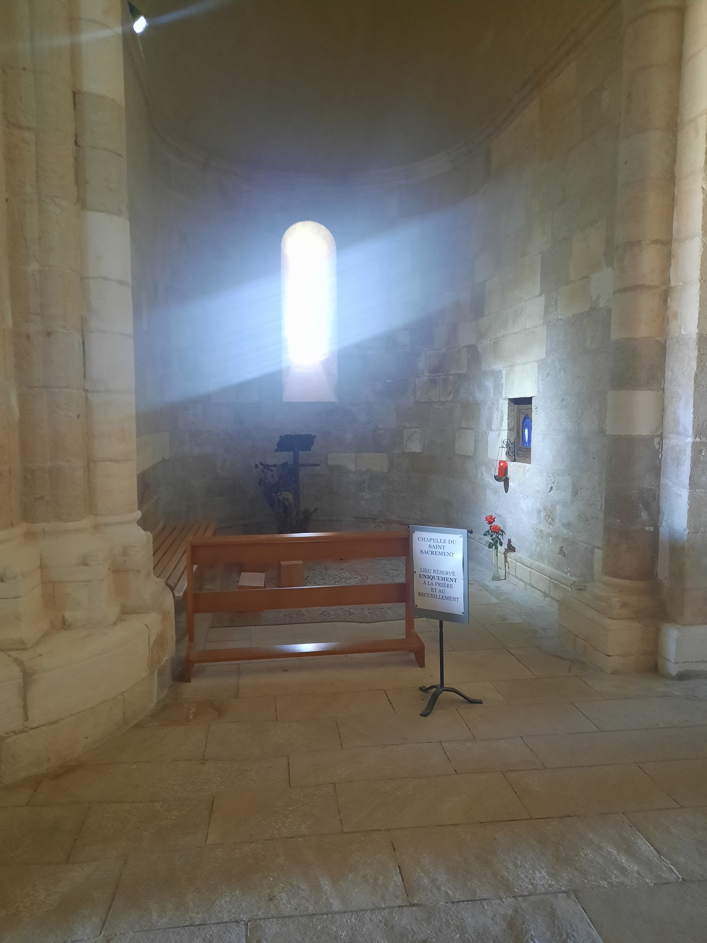 Petite église au milieu d'un cimetière merovingien, la luminosité à l'intérieur surprend.