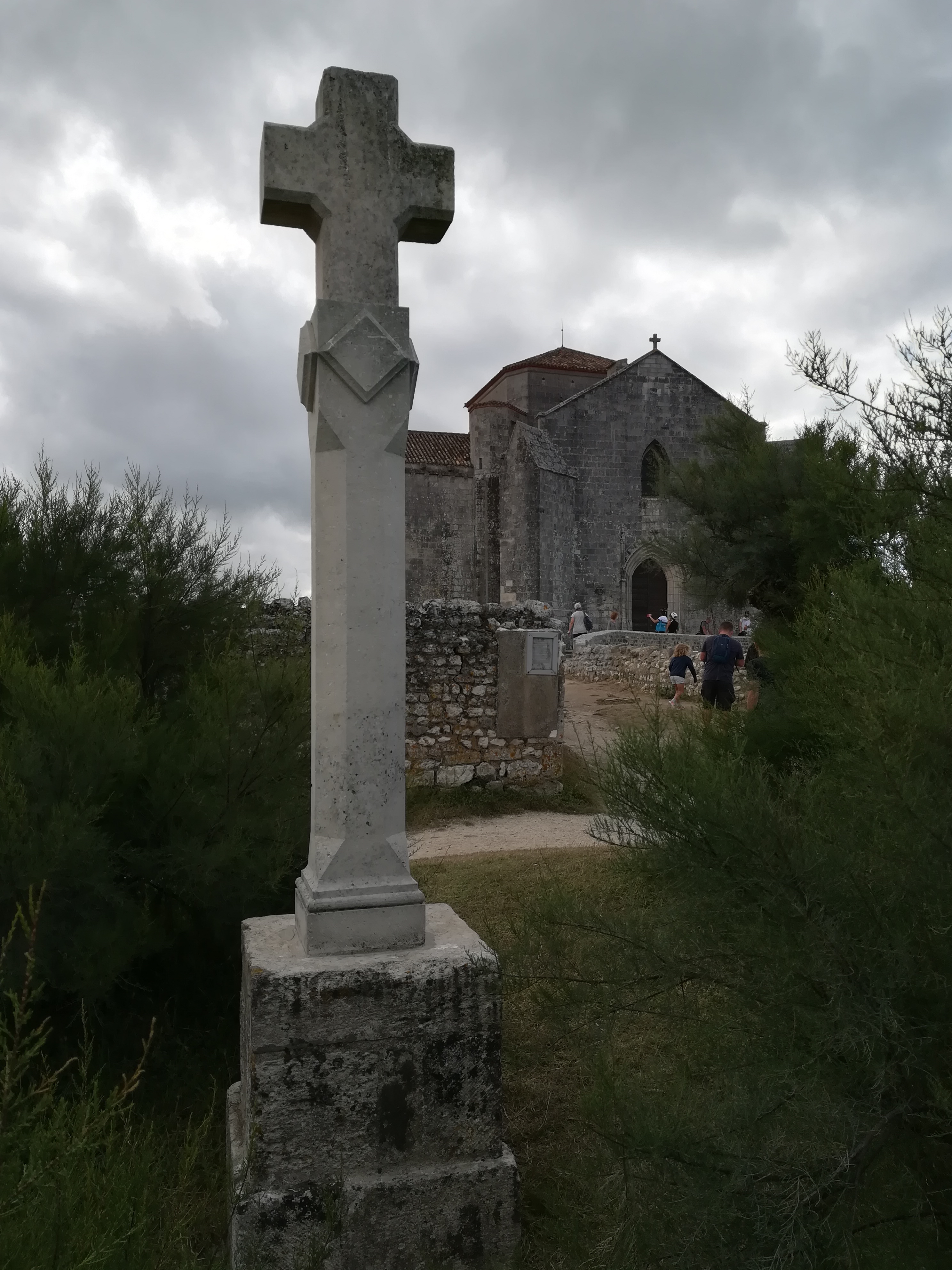 Calme, harmonie romane, alliance divine avec lhomme et la nature, lumière ambrée sur les murs plats de la mer et les arcs de calcaire sélevant entre les croix et les roses trémières. Lieu de prière.