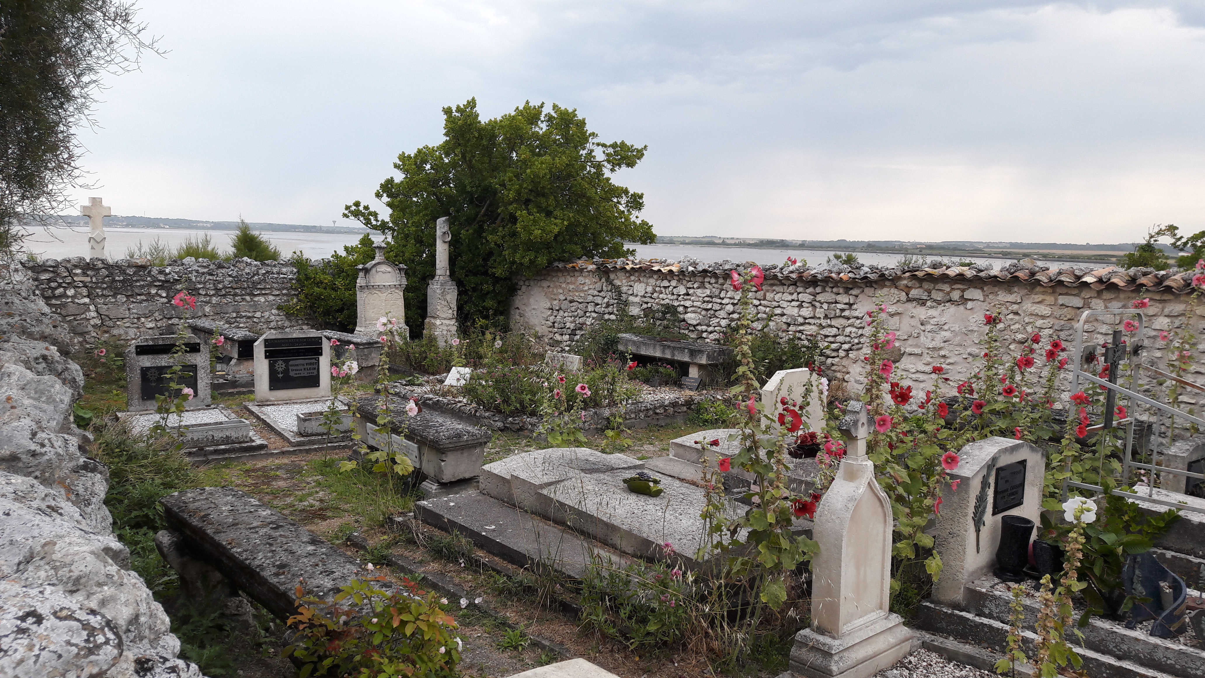 L'église est juchée sur un haut balcon dominant l'estuaire de la Gironde. Le cimetière s'abime en oubli et en poussières sous le ciel bleu. Un parfum de nostalgie s'effrite dans la douceur de l'air...temps suspendu...