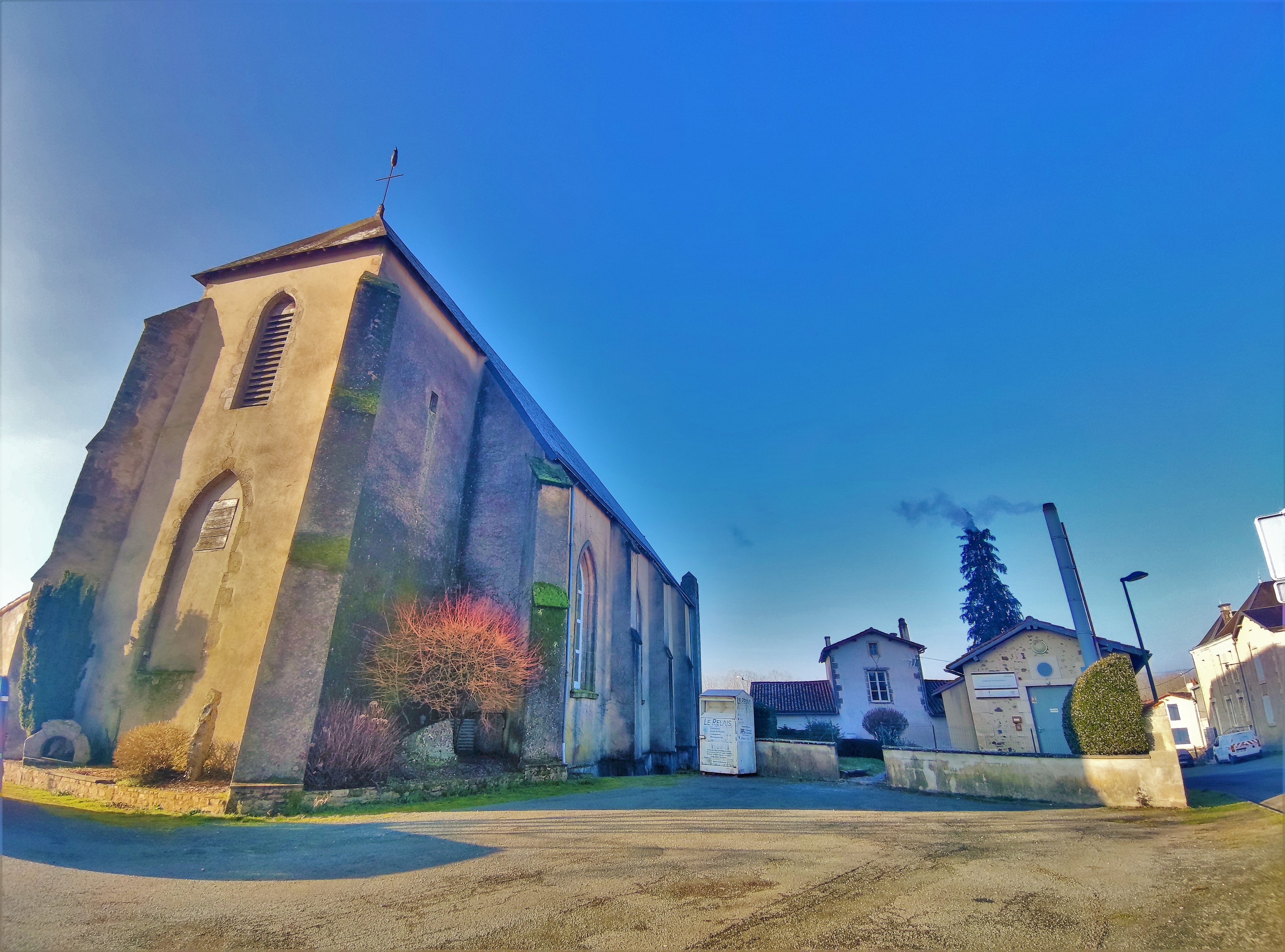 Ce n'est pas un édifice harmonieux, une originalité, le clocher se situe à l'Est adossé au chevet plat. Une église primitive d'époque médiévale et le cimetière attenant furent vendus en 1799 comme biens nationaux. Les deux ont totalement disparu. L'église actuelle date du milieu du 19ème siècle, des travaux de restauration ont eu lieu en 2002. Extérieurement, ses dimensions n'en font pas un édifice harmonieux, une originalité le clocher se situe à l'Est adossé au chevet plat. La flèche ayant souffert des aléas climatiques en 1914, fut jugée irréparable et démontée, ce qui nuit à l'allure générale de l'église. J'ai démarché la mairie pour la visiter, cela s'est avéré compliqué, la secrétaire n'ayant pas l'accord du maire pour prêter les clés. D'après cette dernière, celui-ci ne comprenait pas ma démarche, il fallait que je le contacte à sa permanence du lundi. Devant des attitudes aussi peu accueillantes, je me suis contenté des extérieurs. La façade est épaulée de 2 contreforts dont les pinacles ont disparu. On devine les verres peints qui occupent les baies de la nef, le chœur est aveugle, le clocher ayant obturé la baie du chevet.