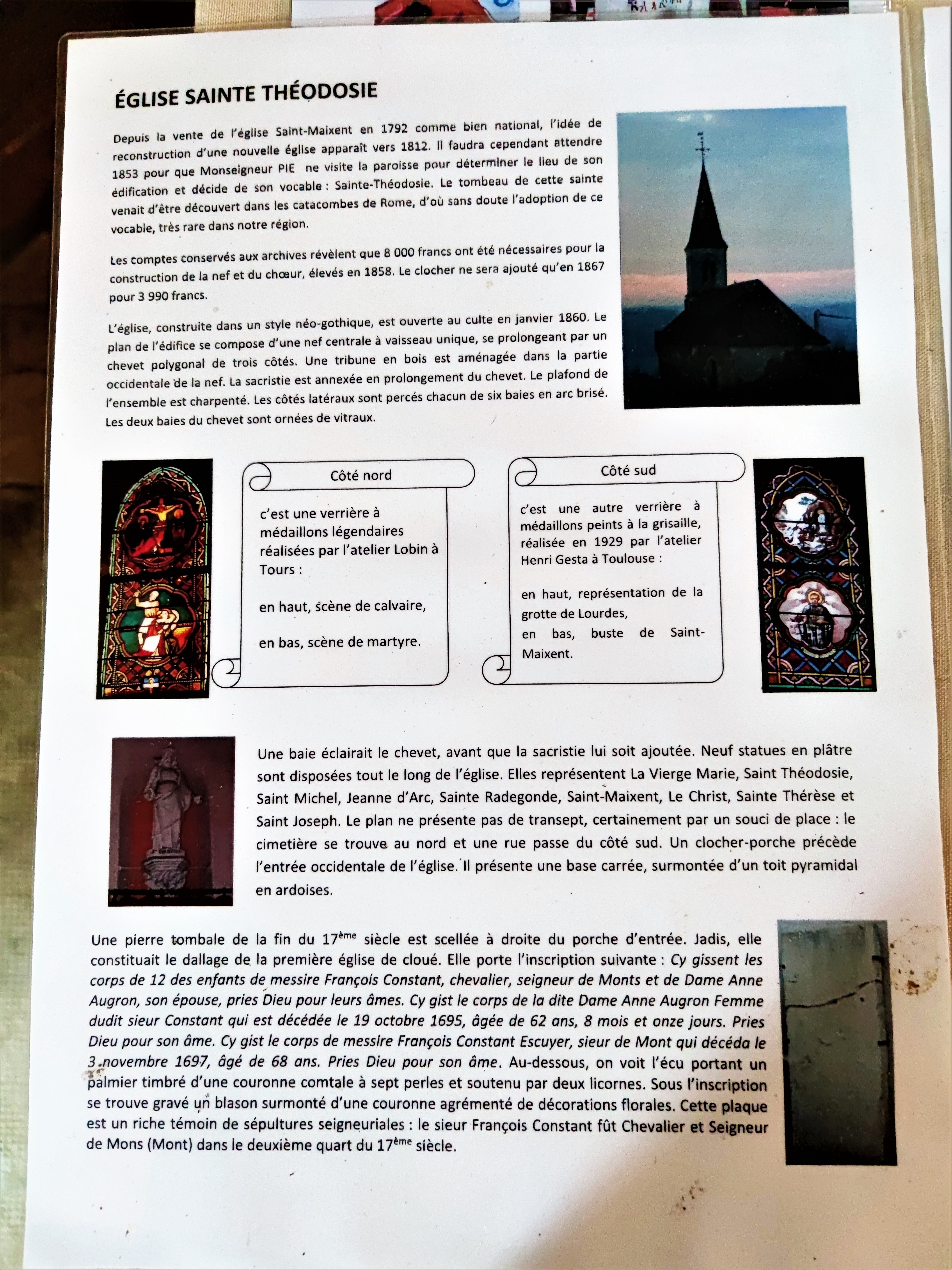 L'intérêt de cette église est d'exister, située à 50m de l'ancienne église, elle jouxte le cimetière. Cette église Sainte Theudosie fut construite au 19ème pour remplacer l'ancienne église Saint-Maixent vendue comme bien national en 1792, le culte fut à nouveau célébré dans une église paroissiale en 1860. Pour y pénétrer, il faut emprunter les clés à la mairie, deux portes sont à franchir. Adossée à l'angle Sud-Ouest du cimetière, on entre dans l'église au Sud, par un clocher porche, le sanctuaire est au Nord. Quelques éléments anciens ont été récupérés : une pierre tombale du 17ème est fixée à la façade, deux décors sculptés de chapiteaux supportent le maître-autel et les vestiges d'un gisant du 13ème sont placés à l’entrée. Peu de vitraux dans cet édifice, la baie axiale du sanctuaire est condamnée et voilée par un rideau, les deux baies latérales célèbrent la titulaire Sainte Theudosie et l'ancien titulaire Saint Maixent.