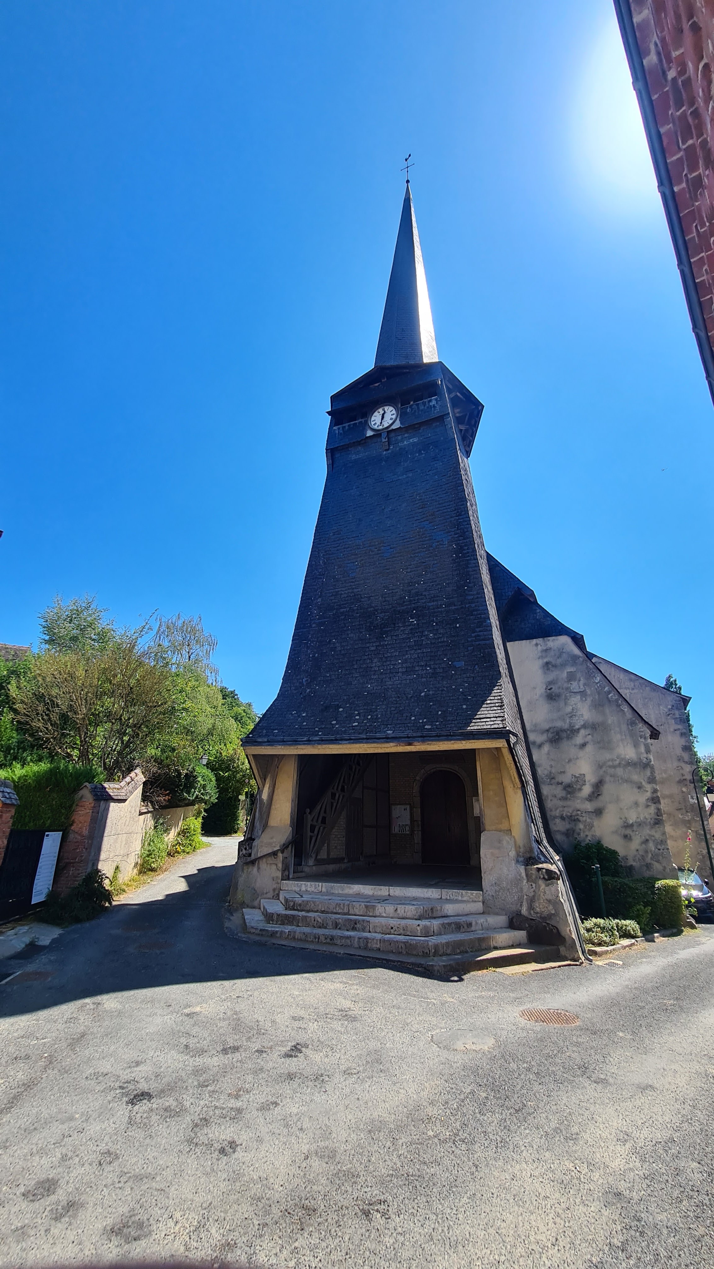 Curieux clocher très pointu et couvert d'ardoises jusqu'à très bas. Voisine avec de belles maisons à colombage restaurées.