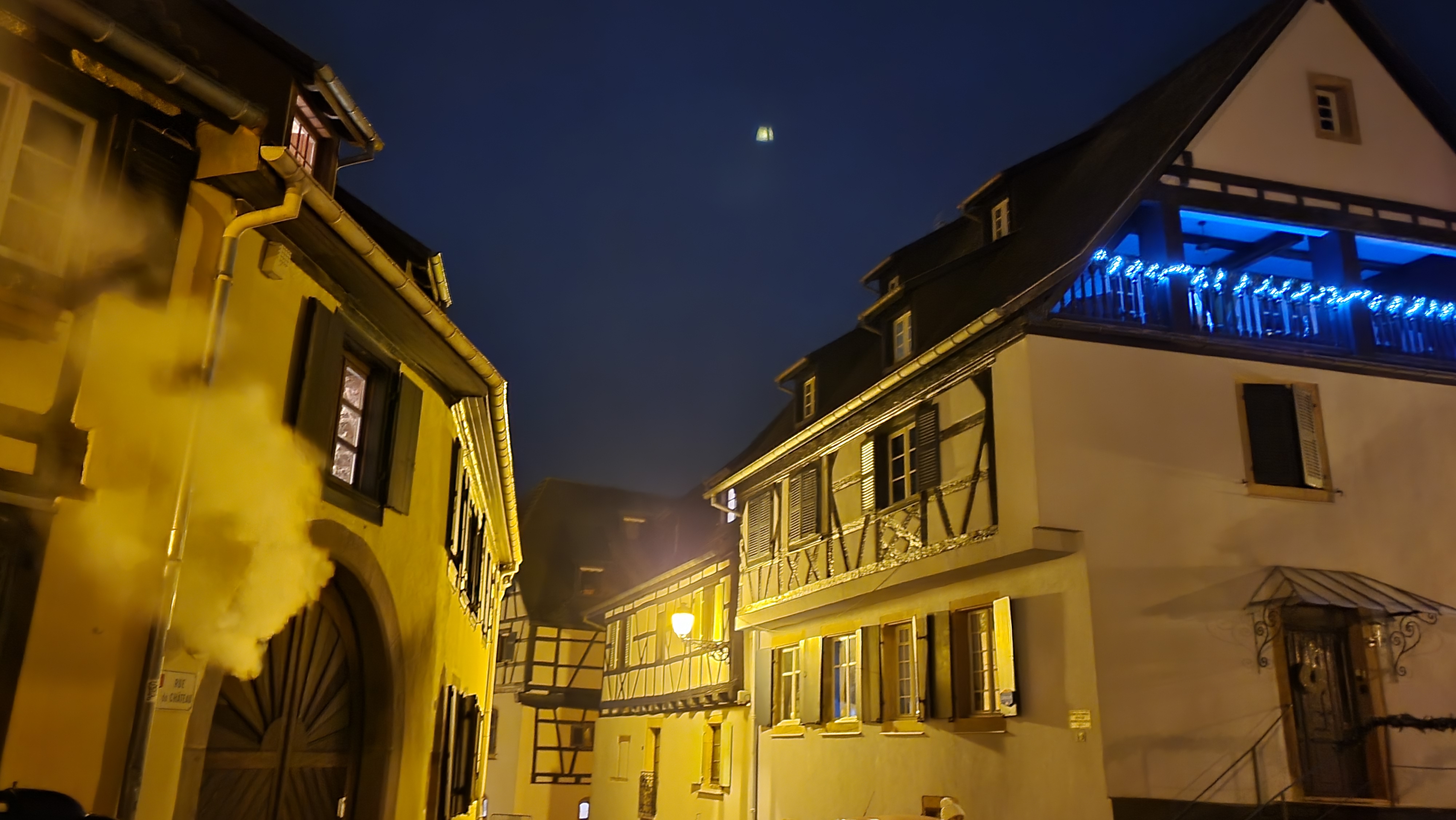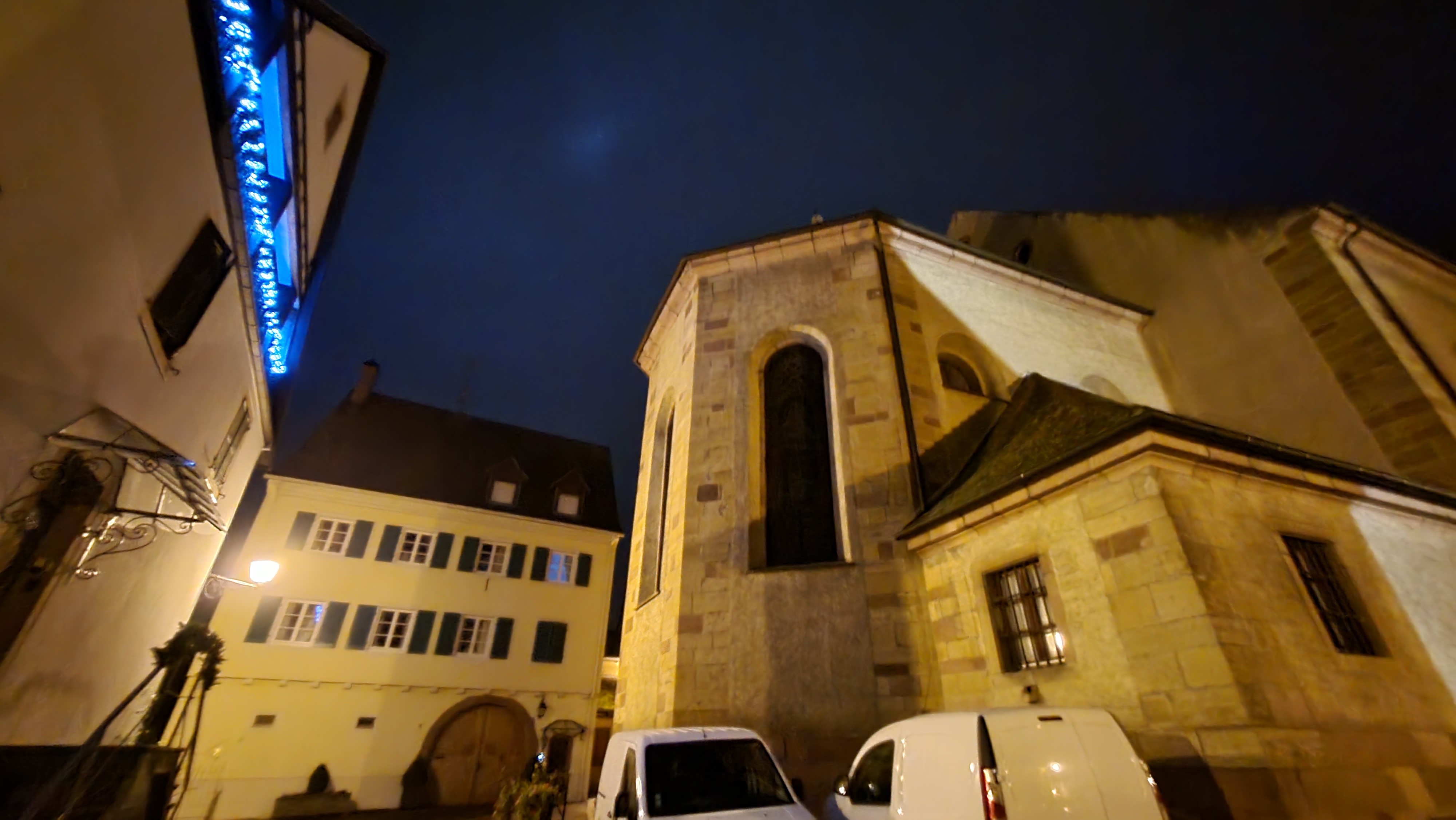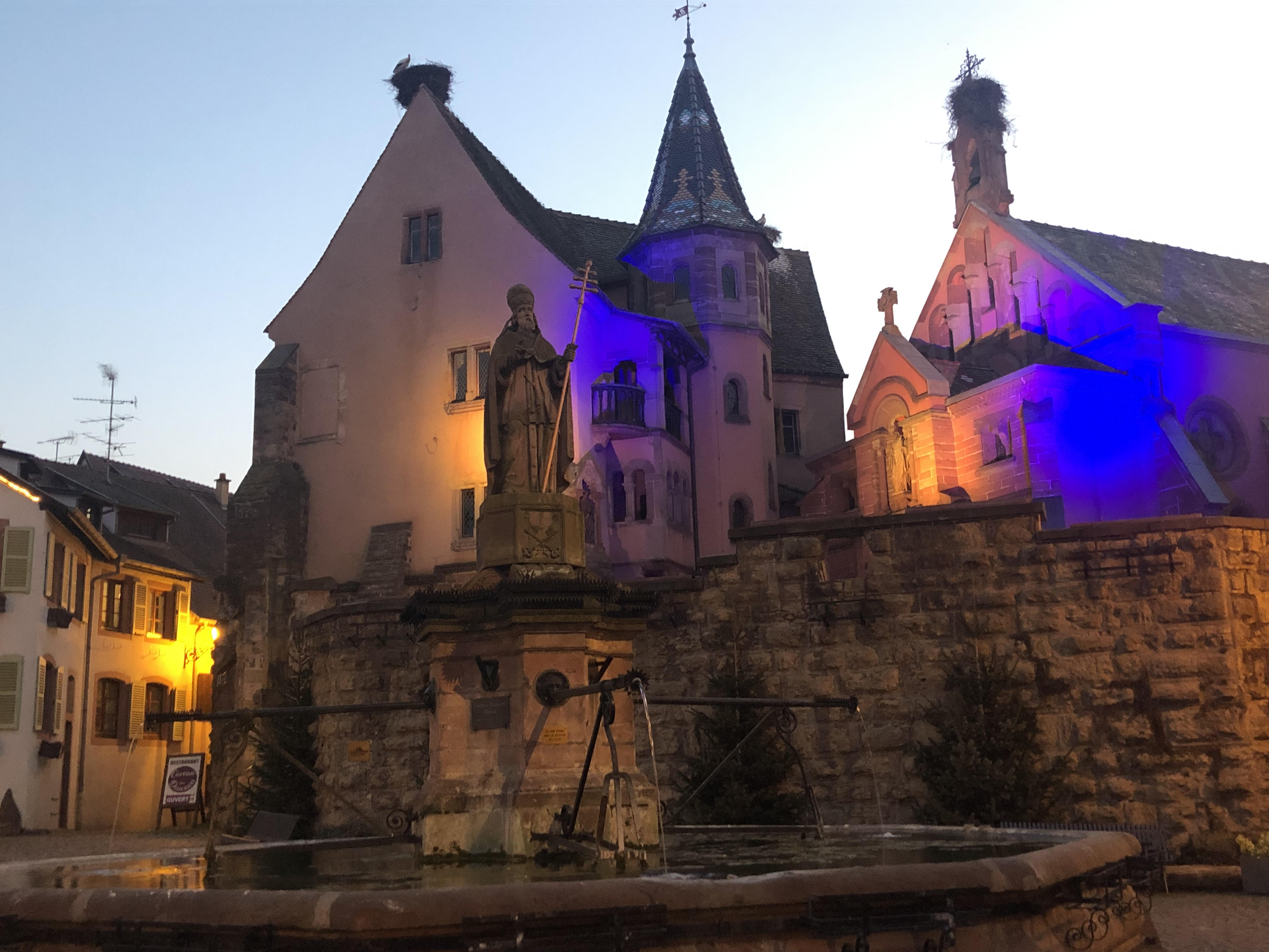 Très belle église Saints-Pierre-et-Paul au cœur d'Eguisheim, illuminée la nuit de couleurs chaleureuses offrant une ambiance tamisée exceptionnelle
