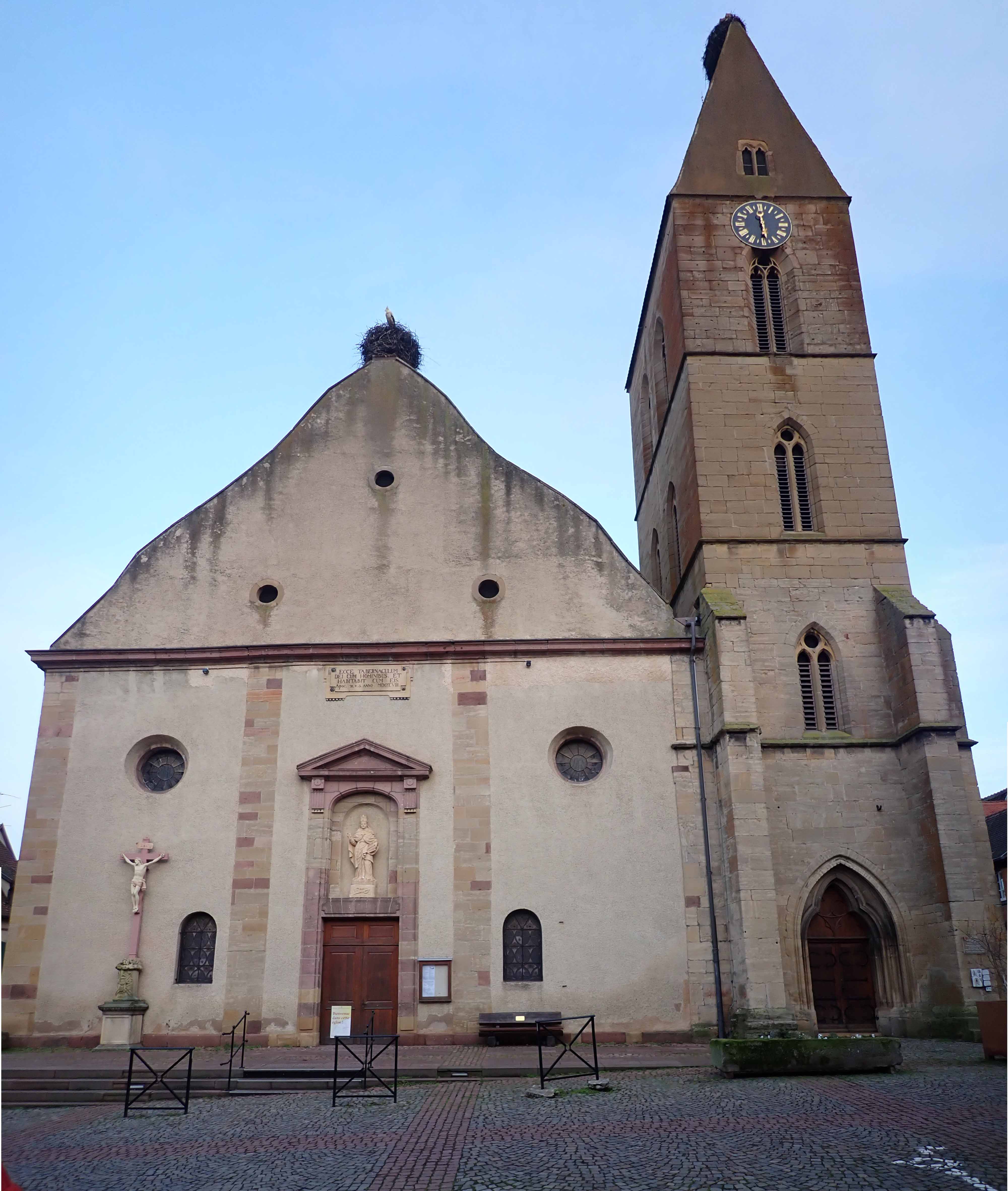 On considère qu'elle date du XIe siècle et a été reconstruite en style gothique en 1220. Au cours du XVIIIe siècle, elle devint trop petite pour la croissance rapide de la population et en 1787 une partie s'effondra, elle fut donc démolie en 1807 et reconstruite dans le style actuel de « grange ». L'imposante tour de quatre étages avec un clocher à pignon est de style roman et est le seul vestige de l'église d'origine. Nous ne pouvions pas accéder à son intérieur car il était fermé, mais à l'intérieur se trouve une curieuse sculpture en bois polychrome de la Vierge appelée Vierge ouvrant, car elle peut être ouverte à deux vantaux, étant le seul exemplaire de ce type conservé avec celui de Kaysersberg.