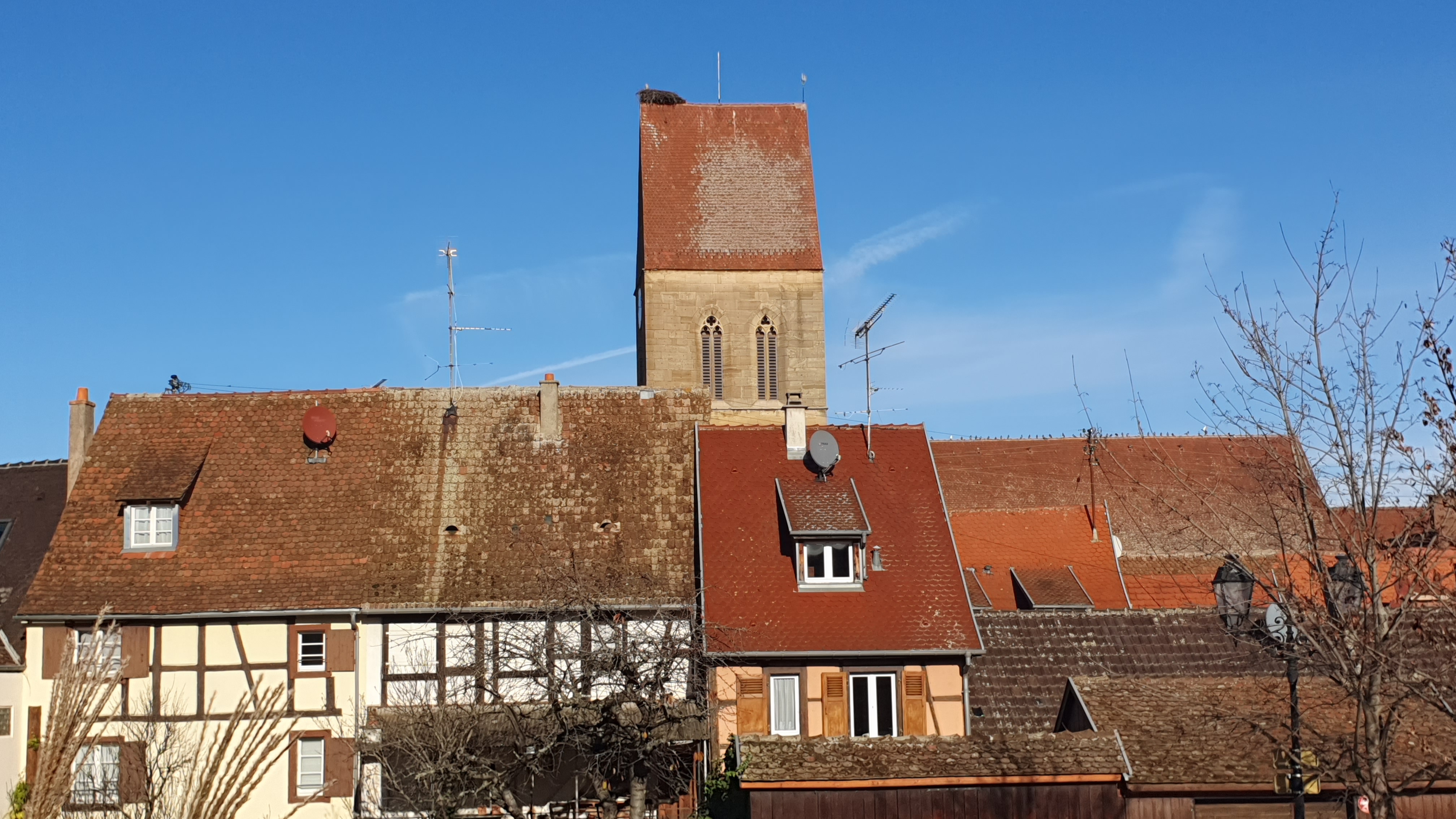 Grande église au clocher robuste et imposant sur lequel nichent les cigognes. Bâtiment très pittoresque