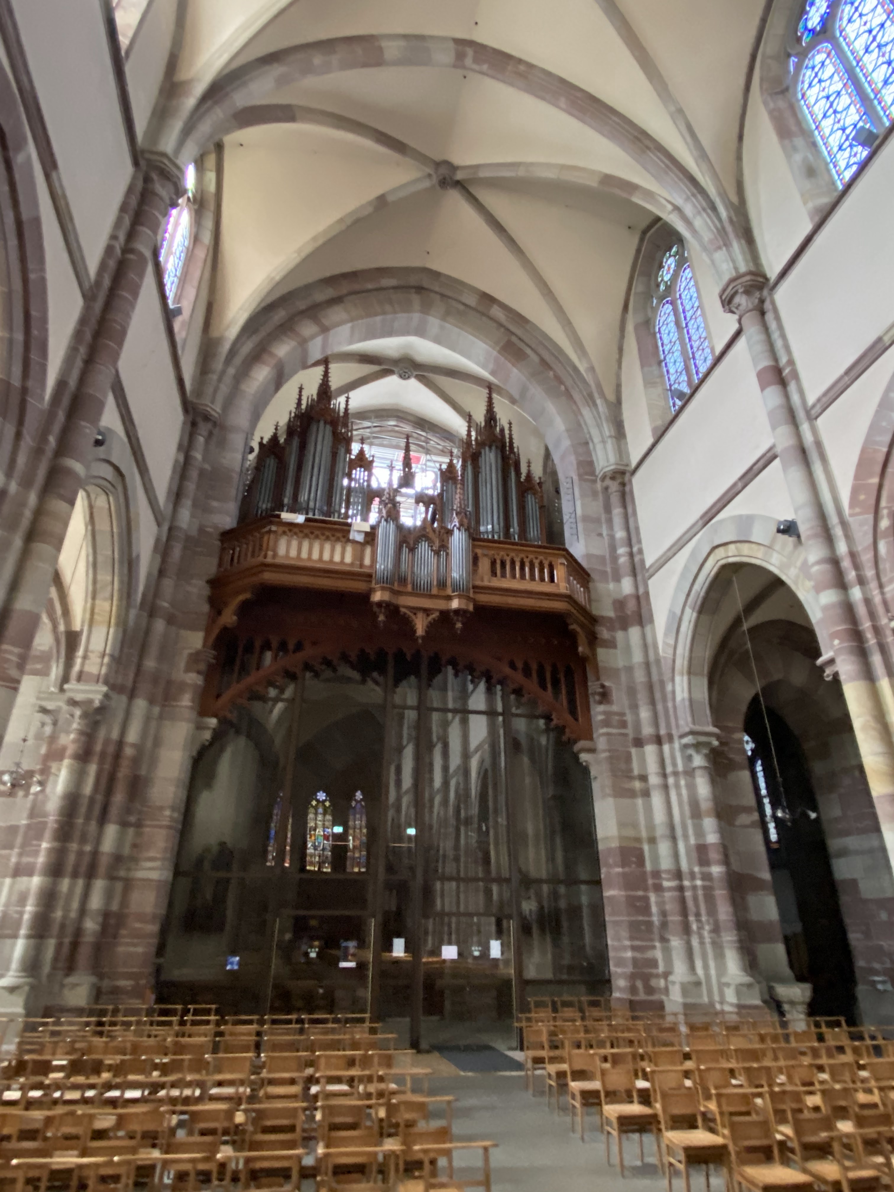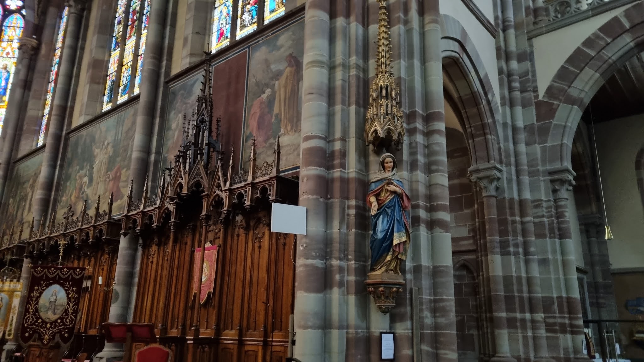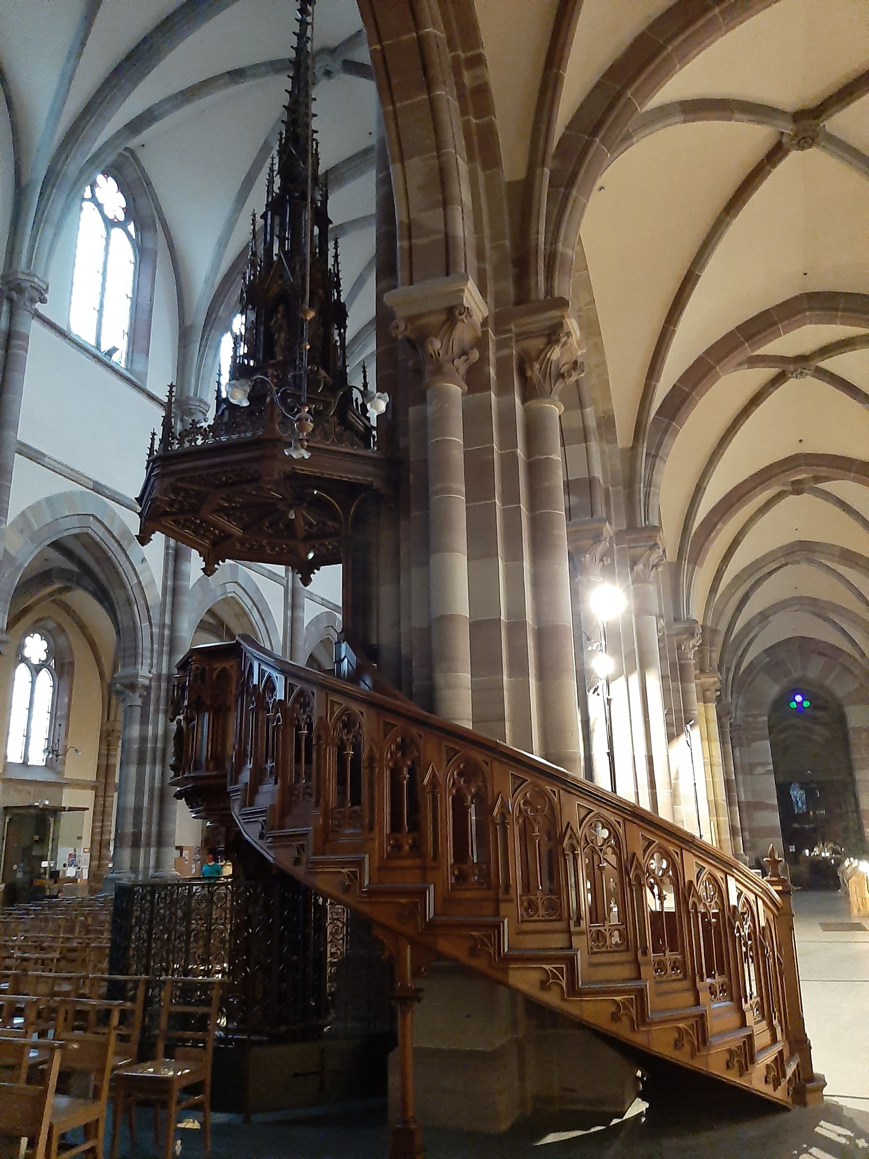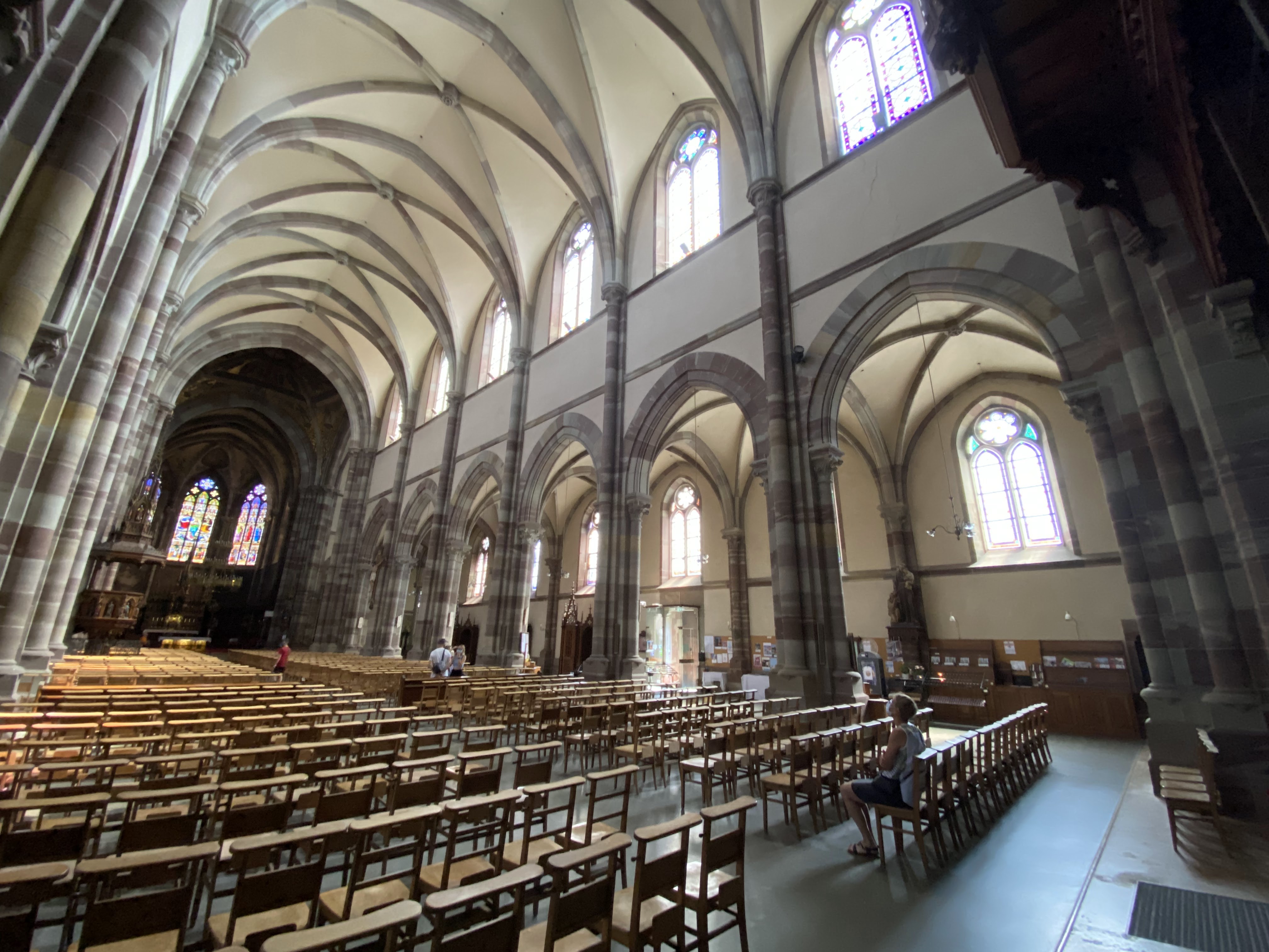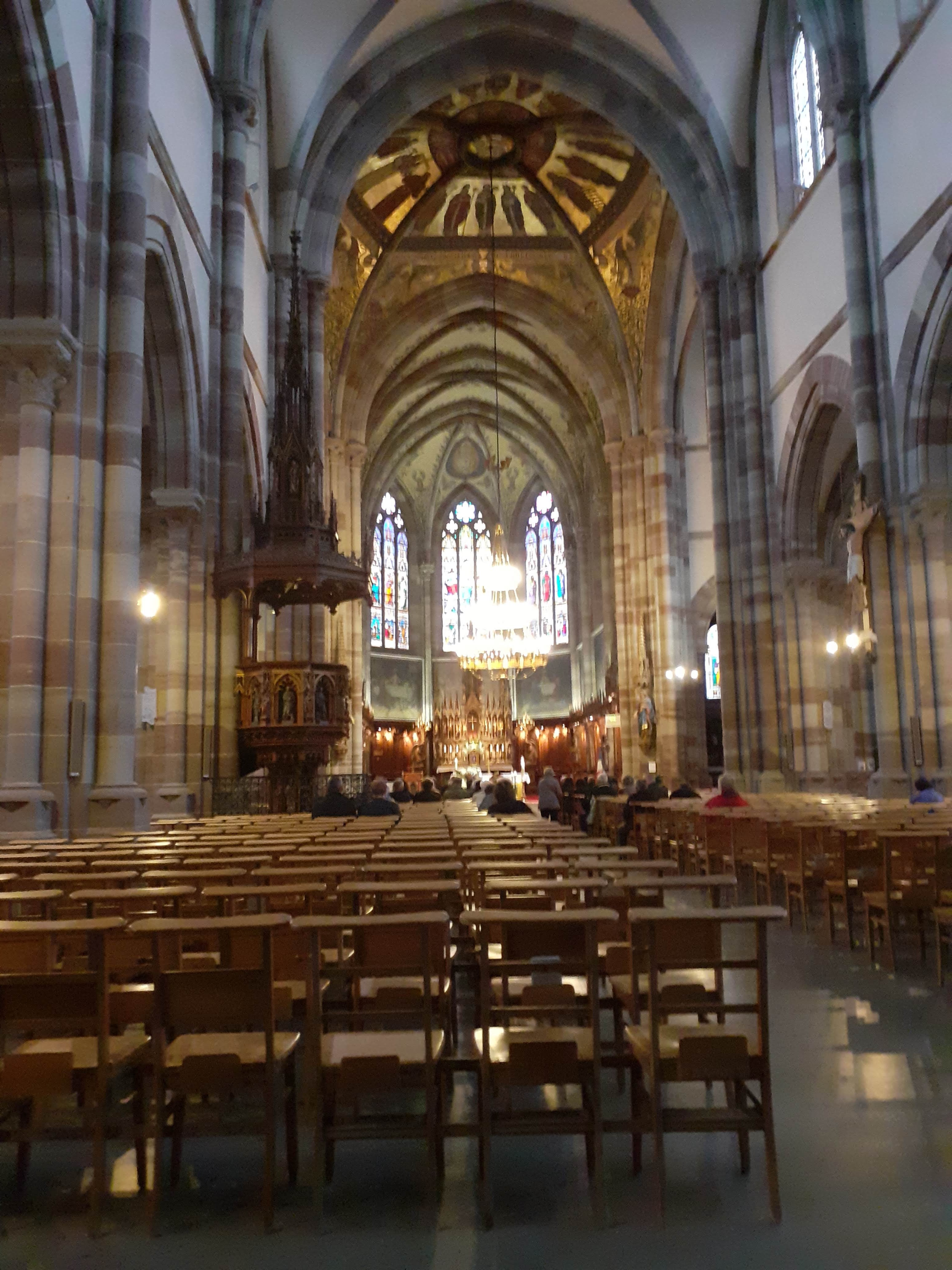 Édifice calme et apaisant, malgré les travaux. Elle est belle, malgré l'austérité, le grès rouge est vraiment beau.
