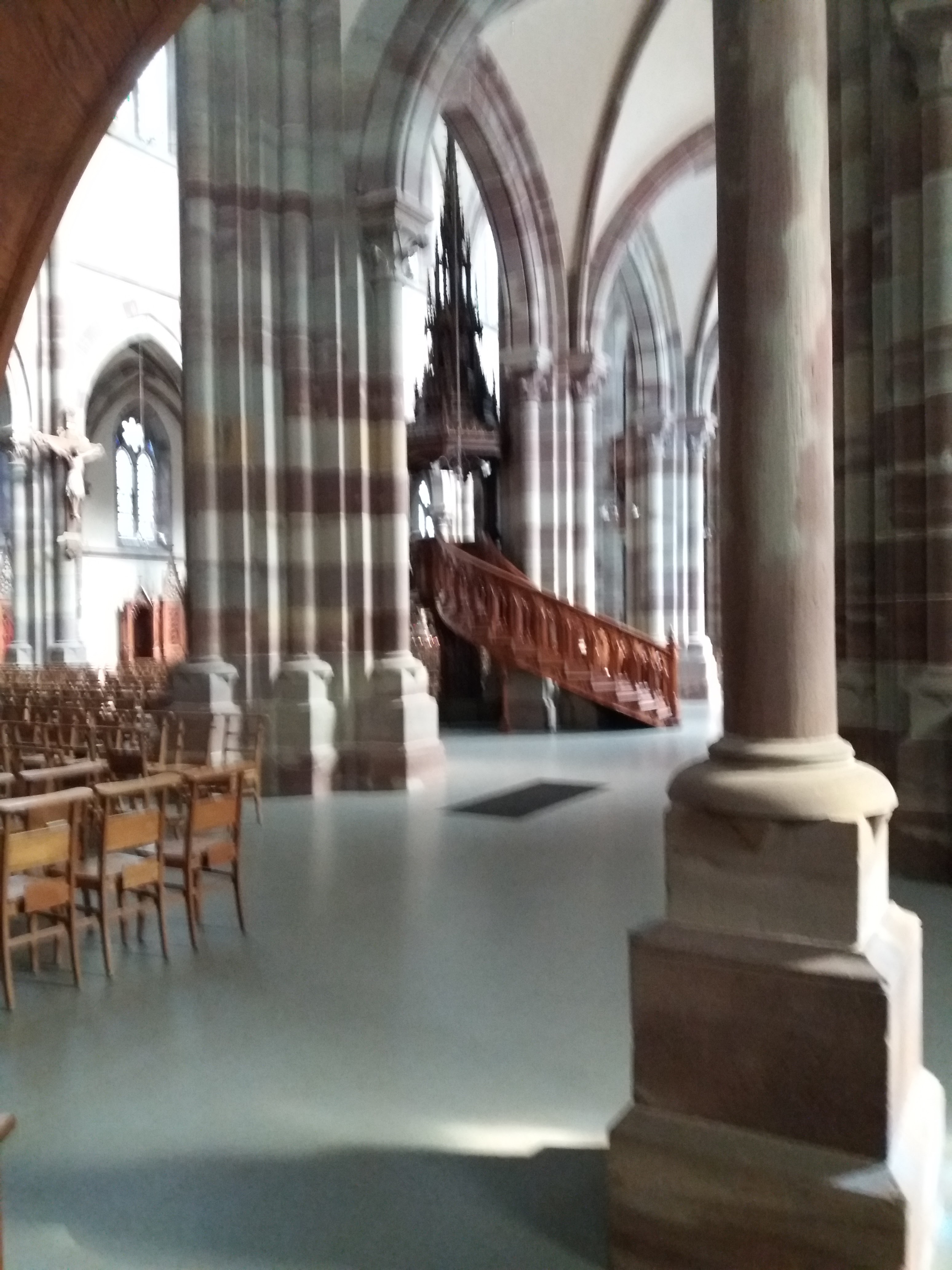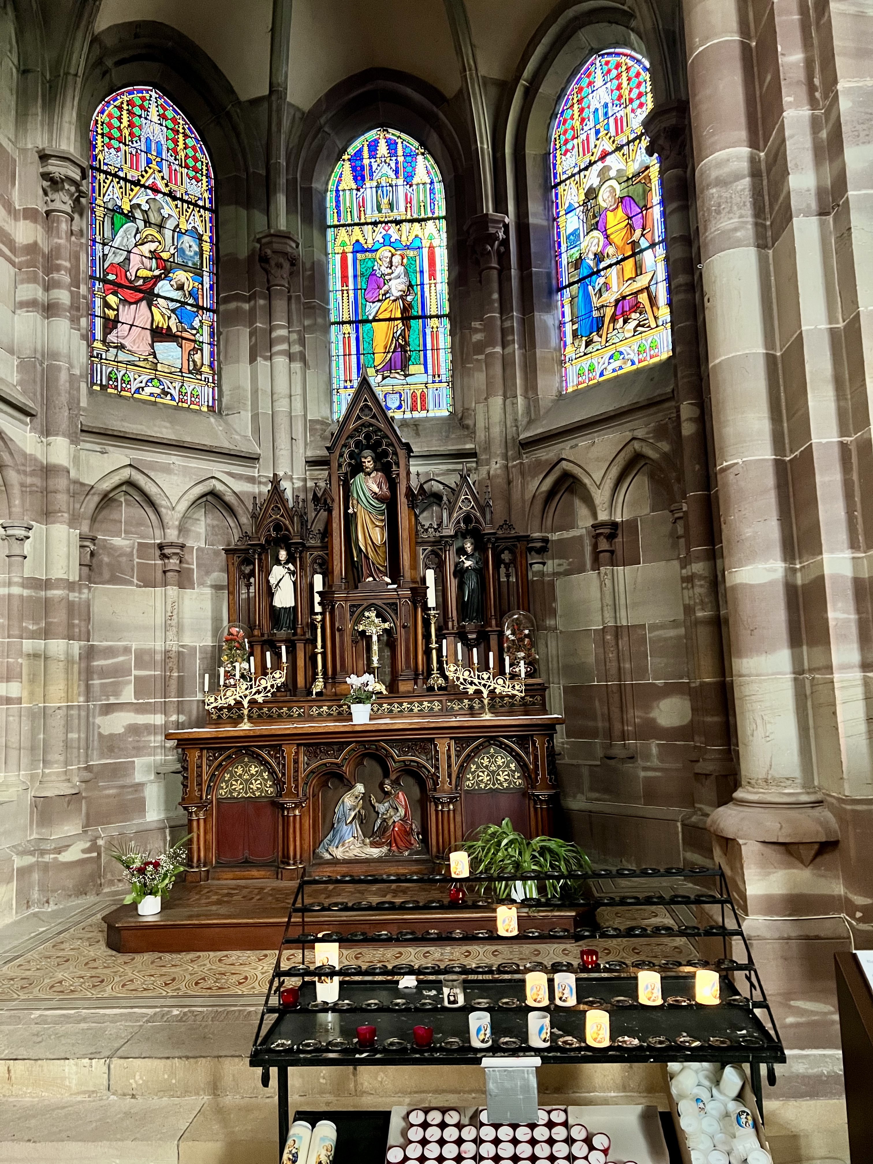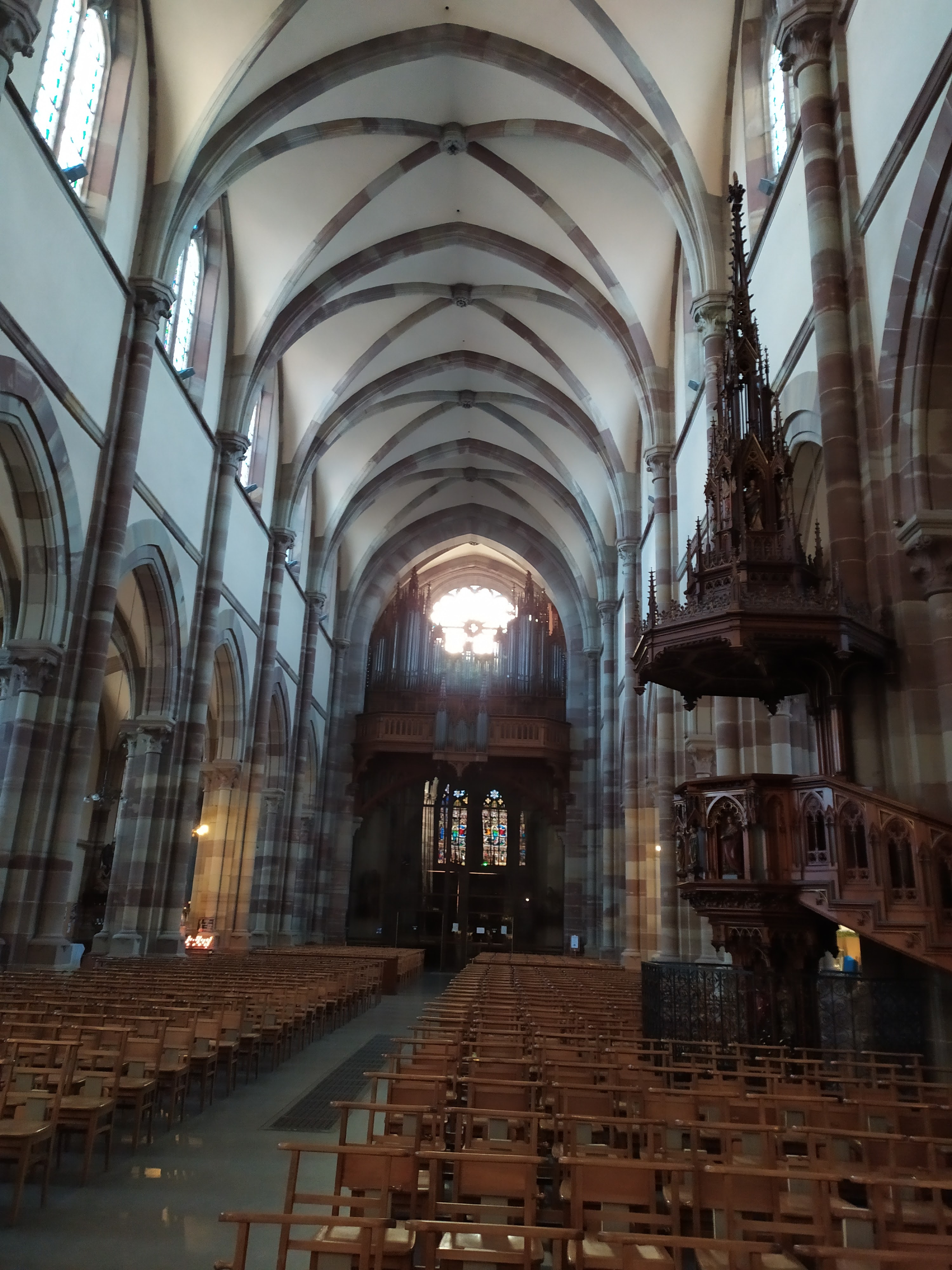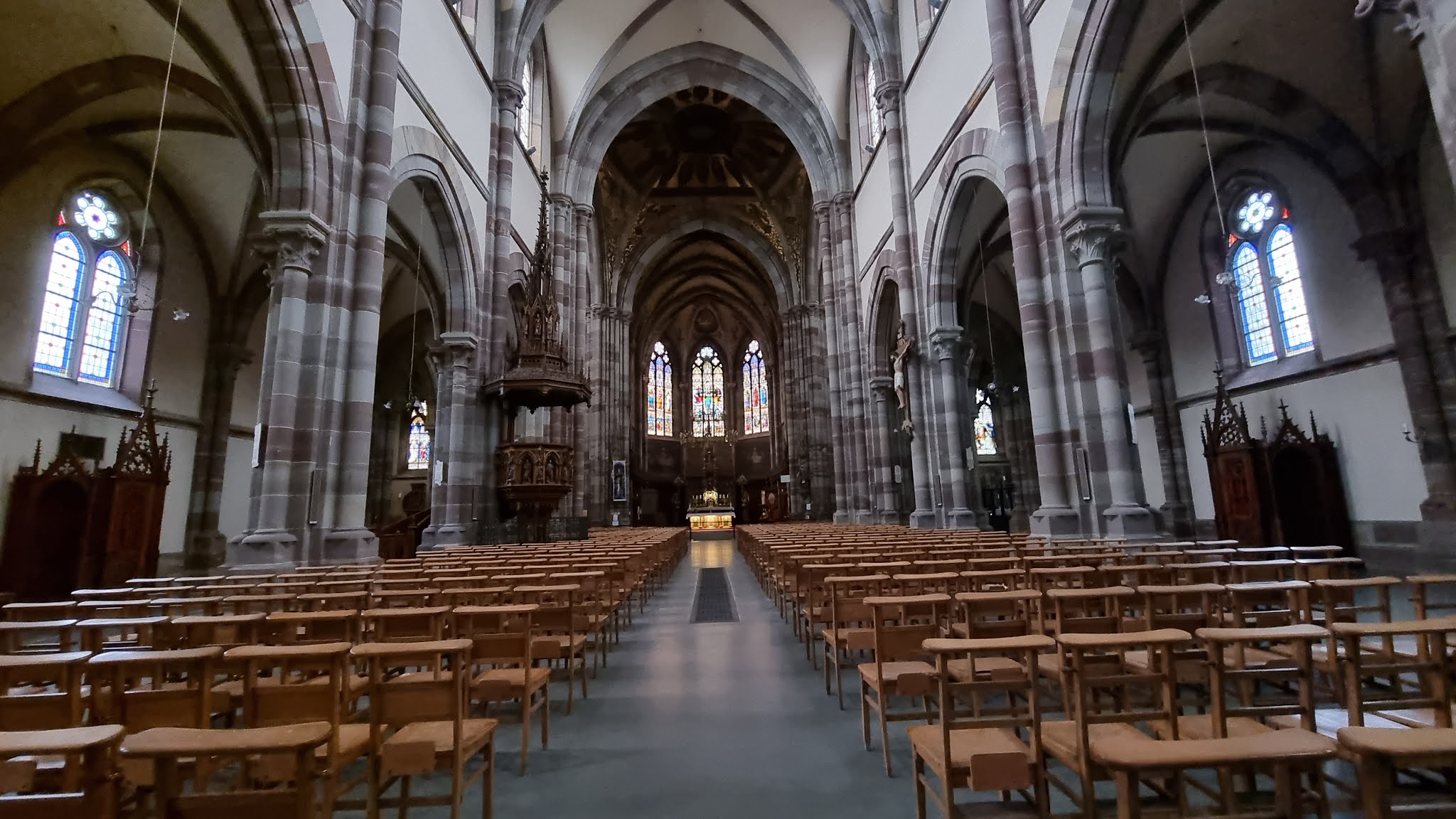 Édifice calme et apaisant, malgré les travaux. Elle est belle, malgré l'austérité, le grès rouge est vraiment beau.