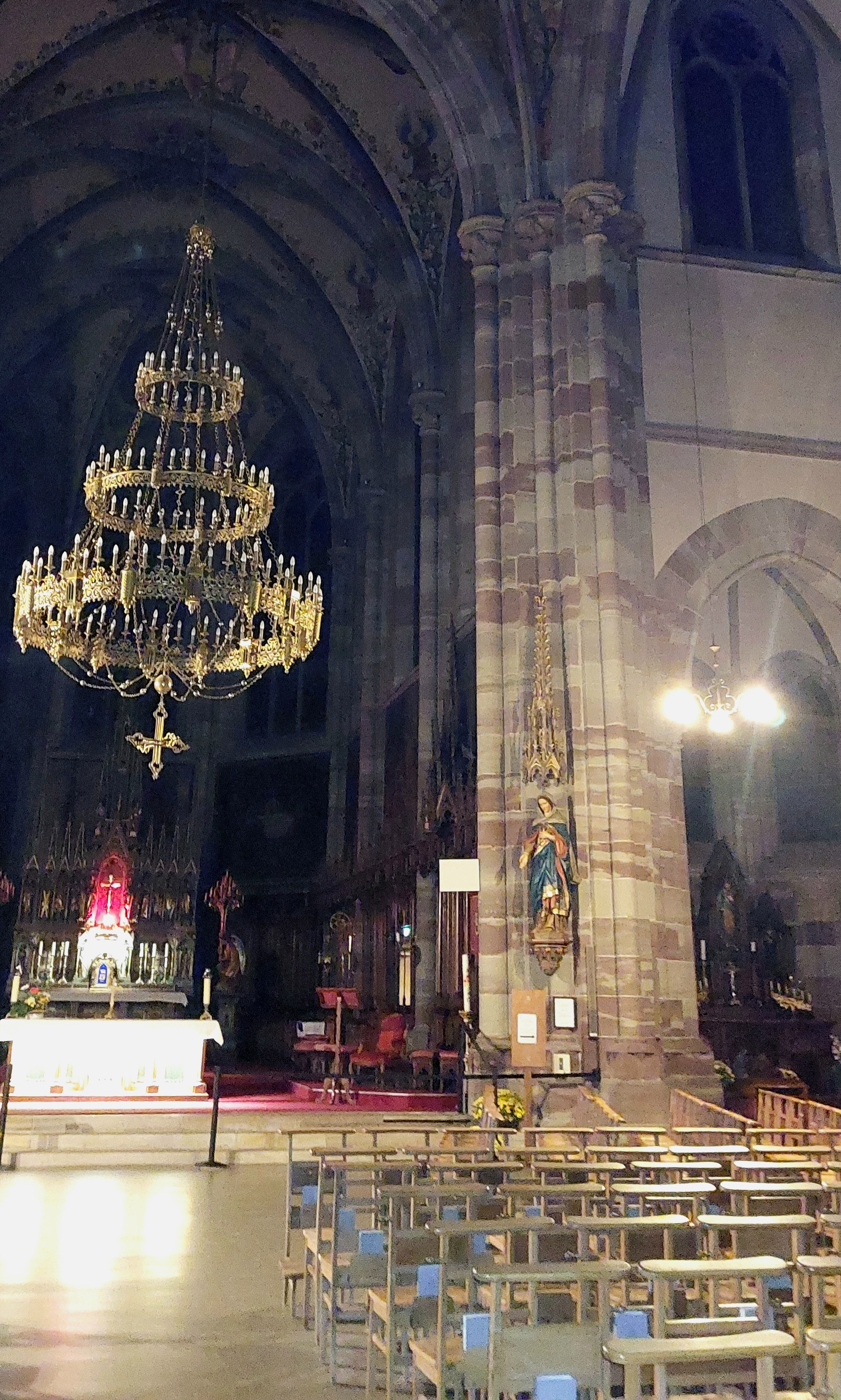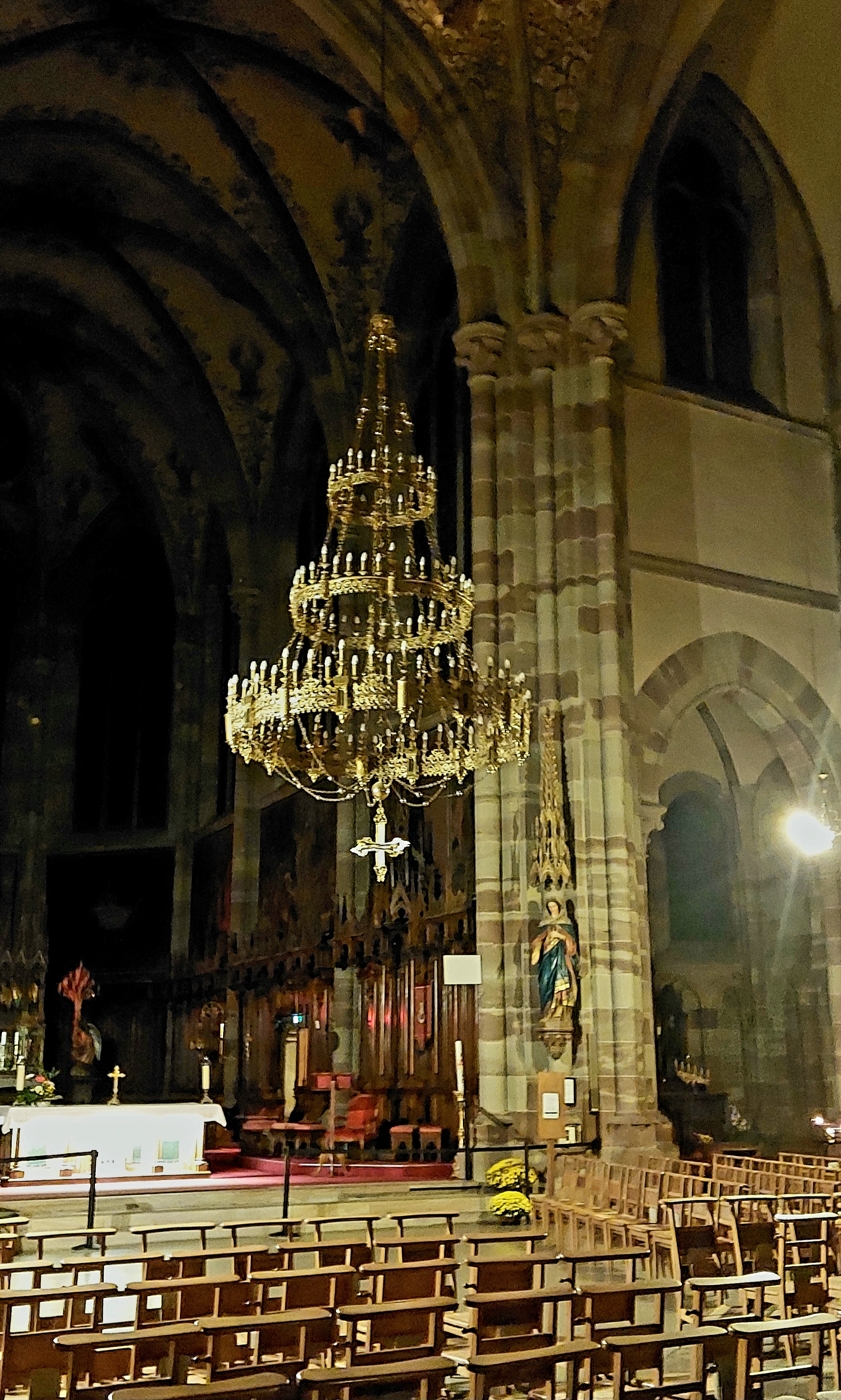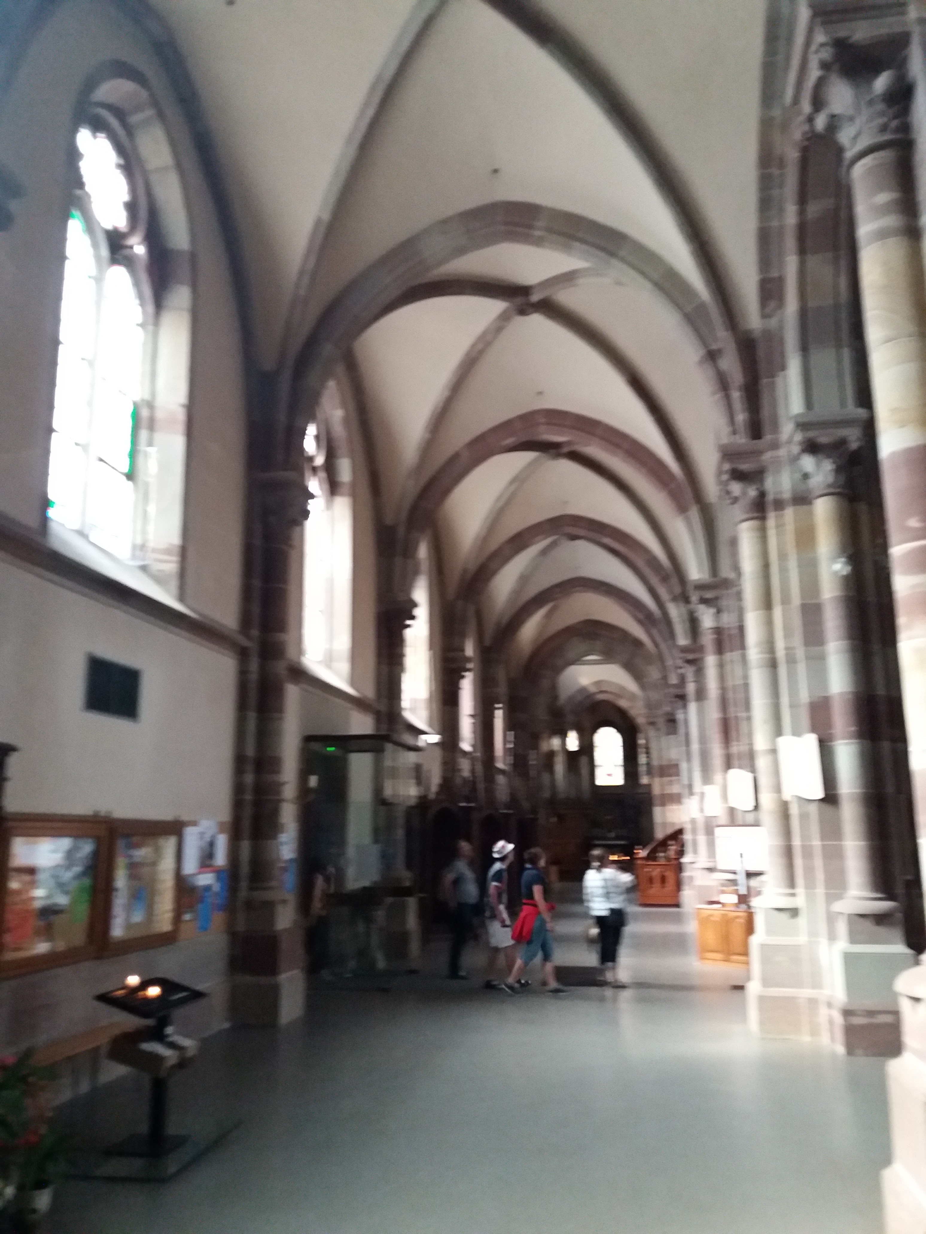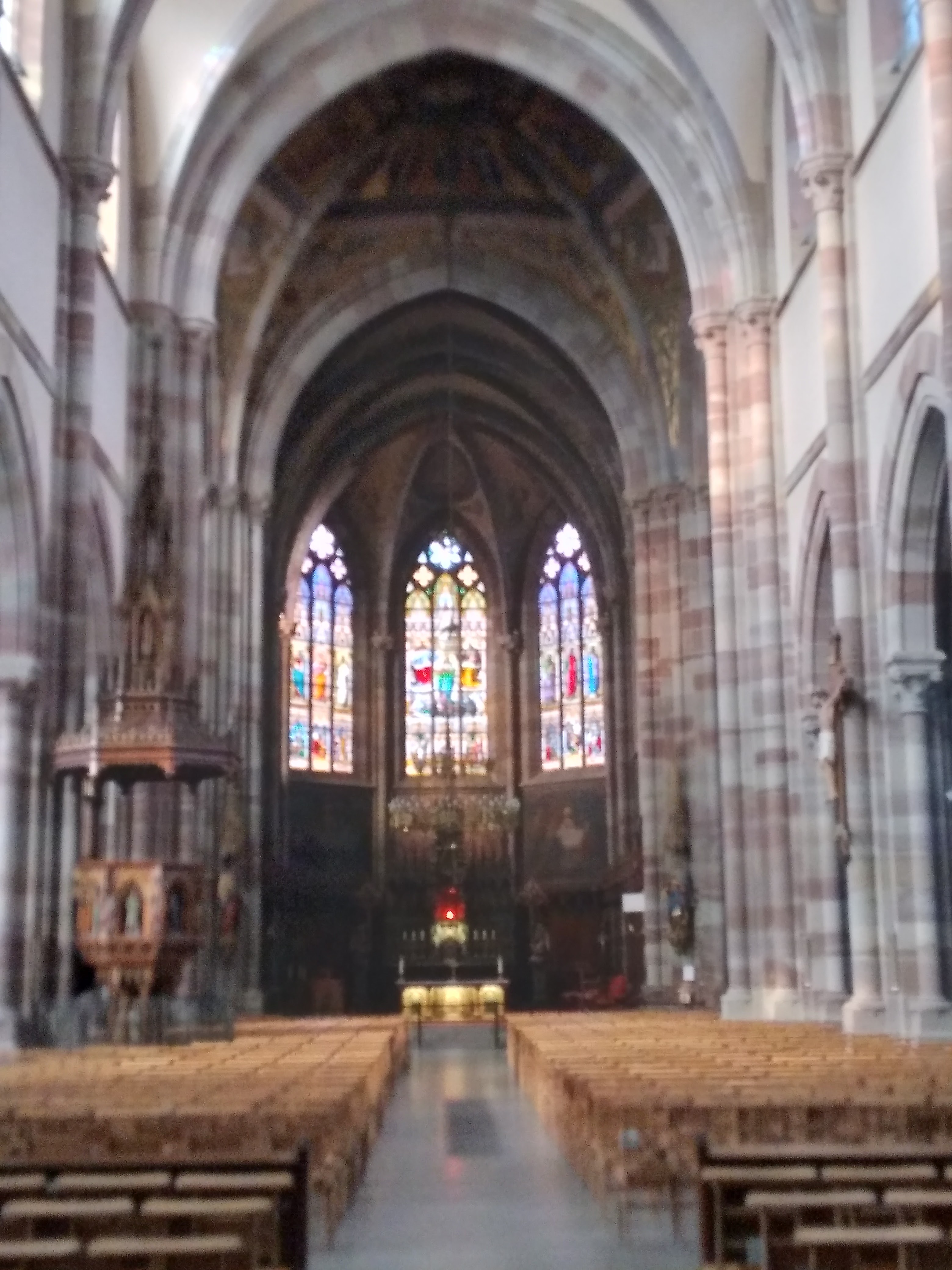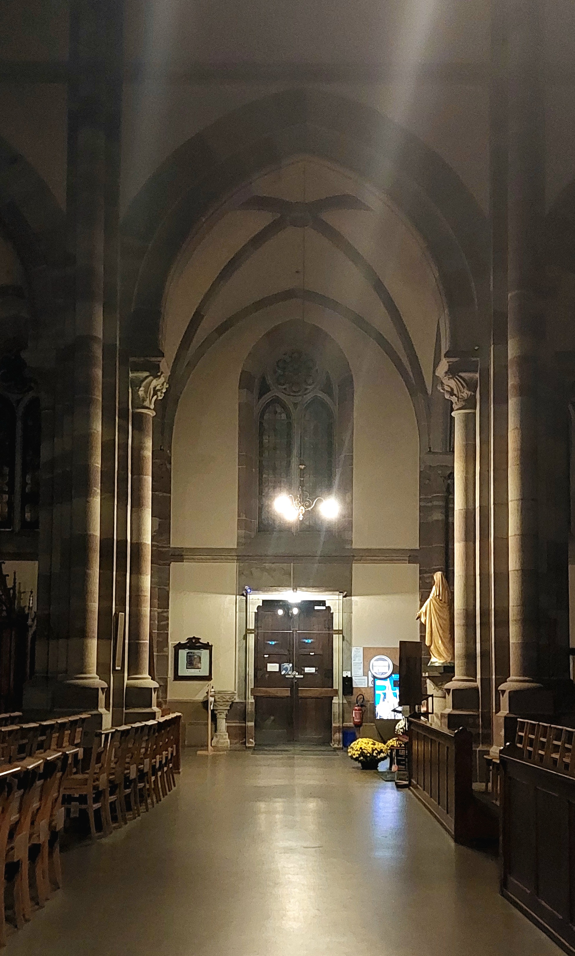 Édifice calme et apaisant, malgré les travaux. Elle est belle, malgré l'austérité, le grès rouge est vraiment beau.