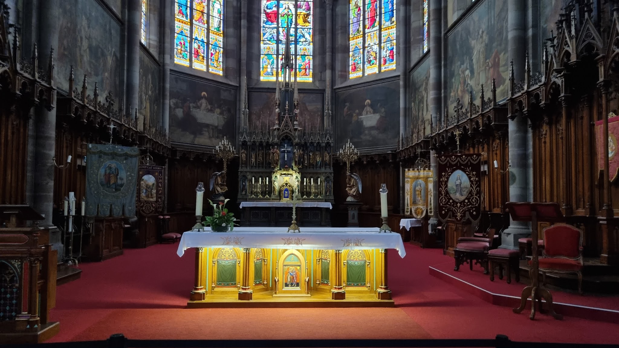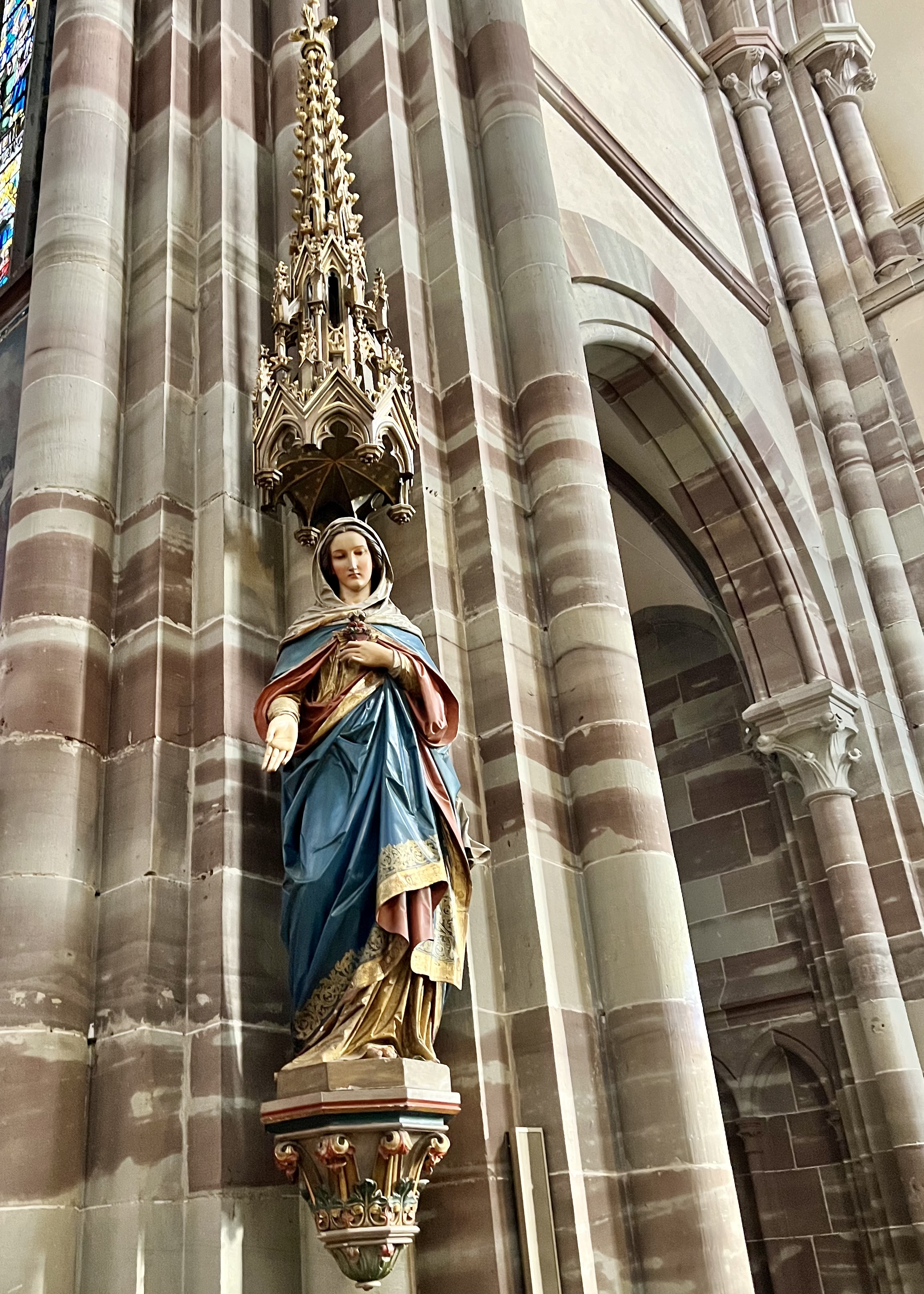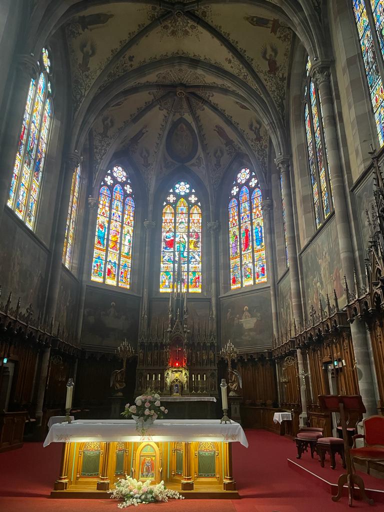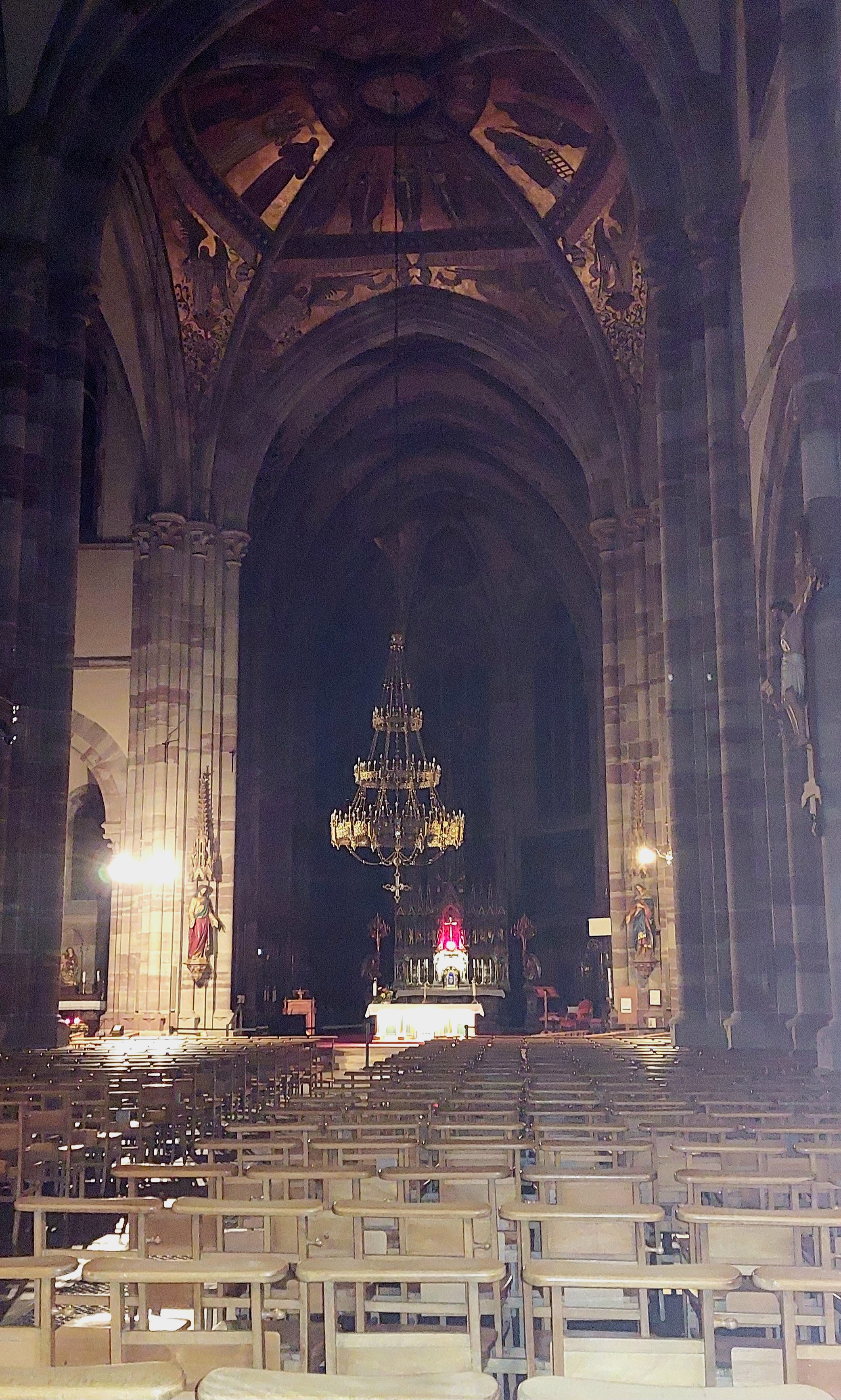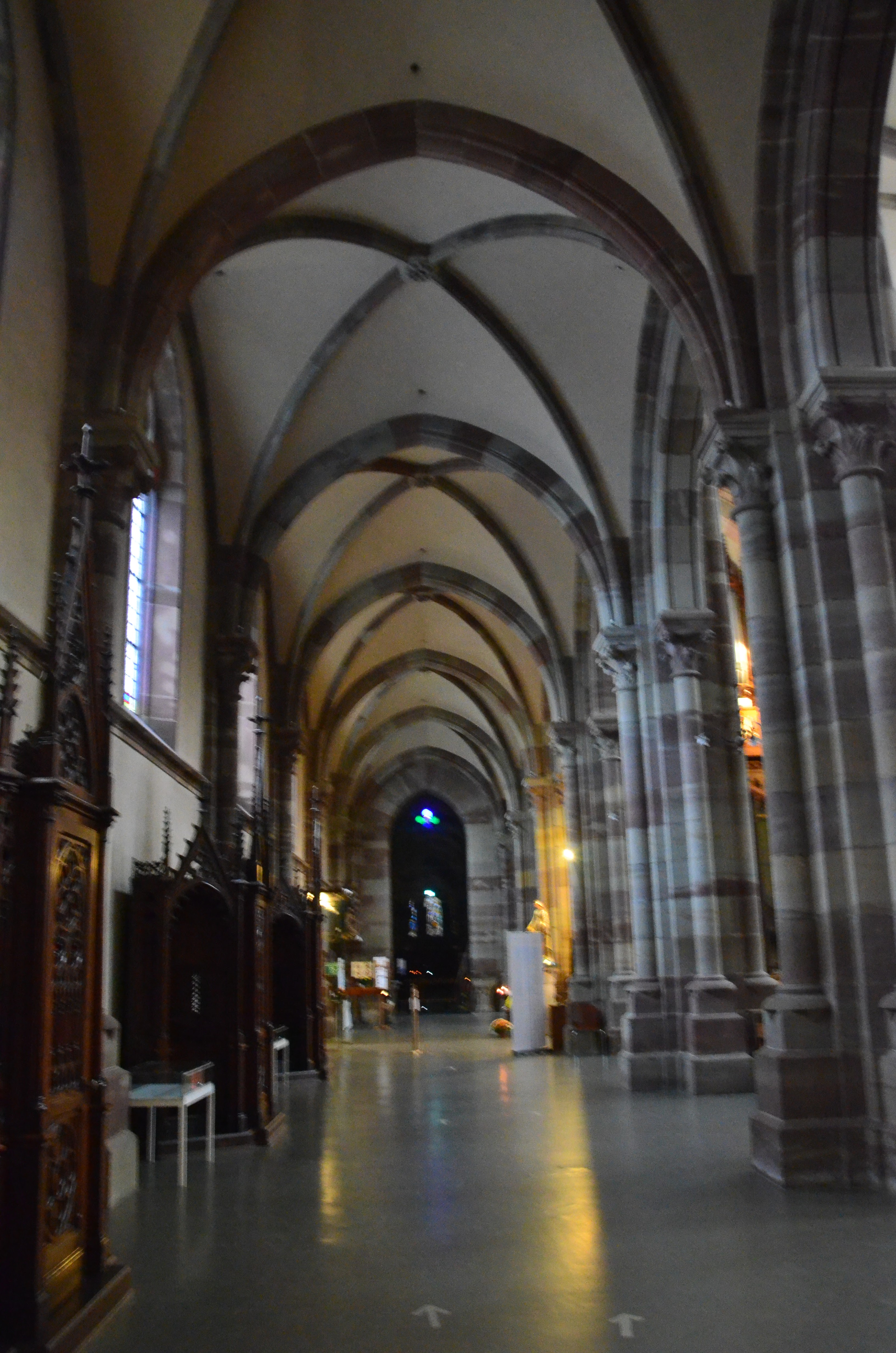 Édifice calme et apaisant, malgré les travaux. Elle est belle, malgré l'austérité, le grès rouge est vraiment beau.