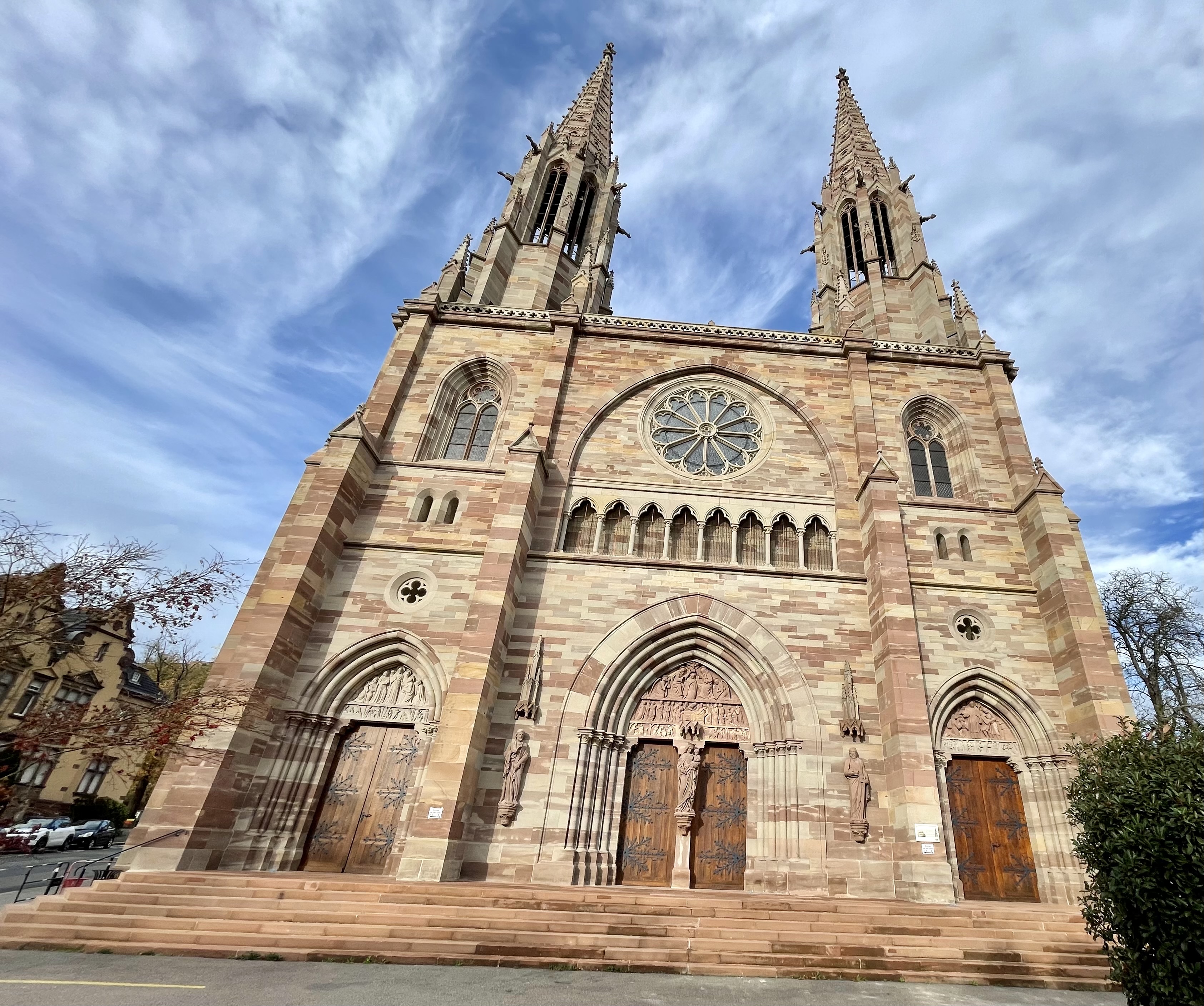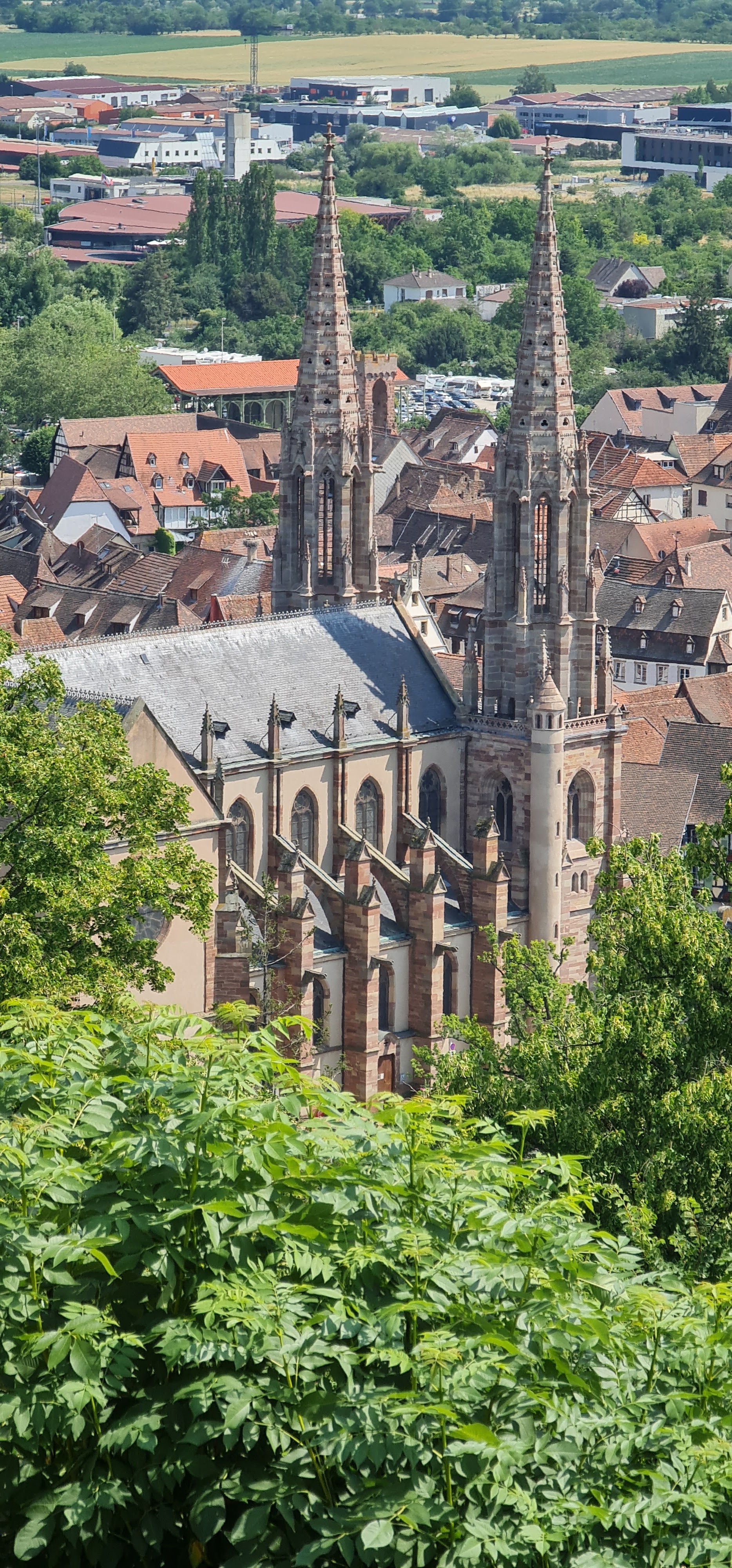 Construite entre 1865 et 1870 engrès rose des Vosges (une pierre calcaire emblématique de l'est de la France) dans un style néo-gothique, par l'architecte Eugène Petit. Son intérieur abrite de remarquables vitraux du 16ème siècle ainsi qu'un orgue historique datant de 1773 et toujours utilisé lors de concerts.