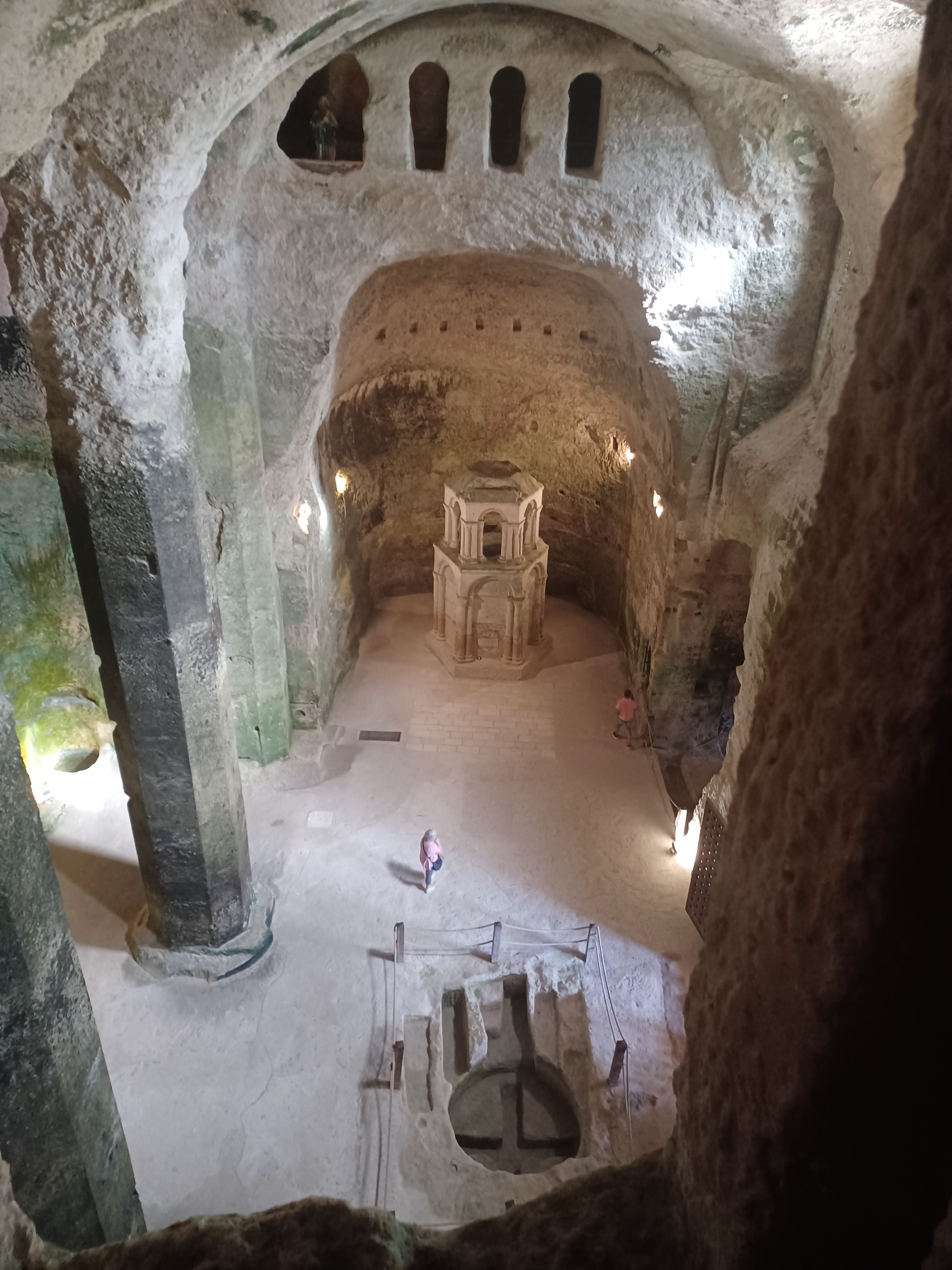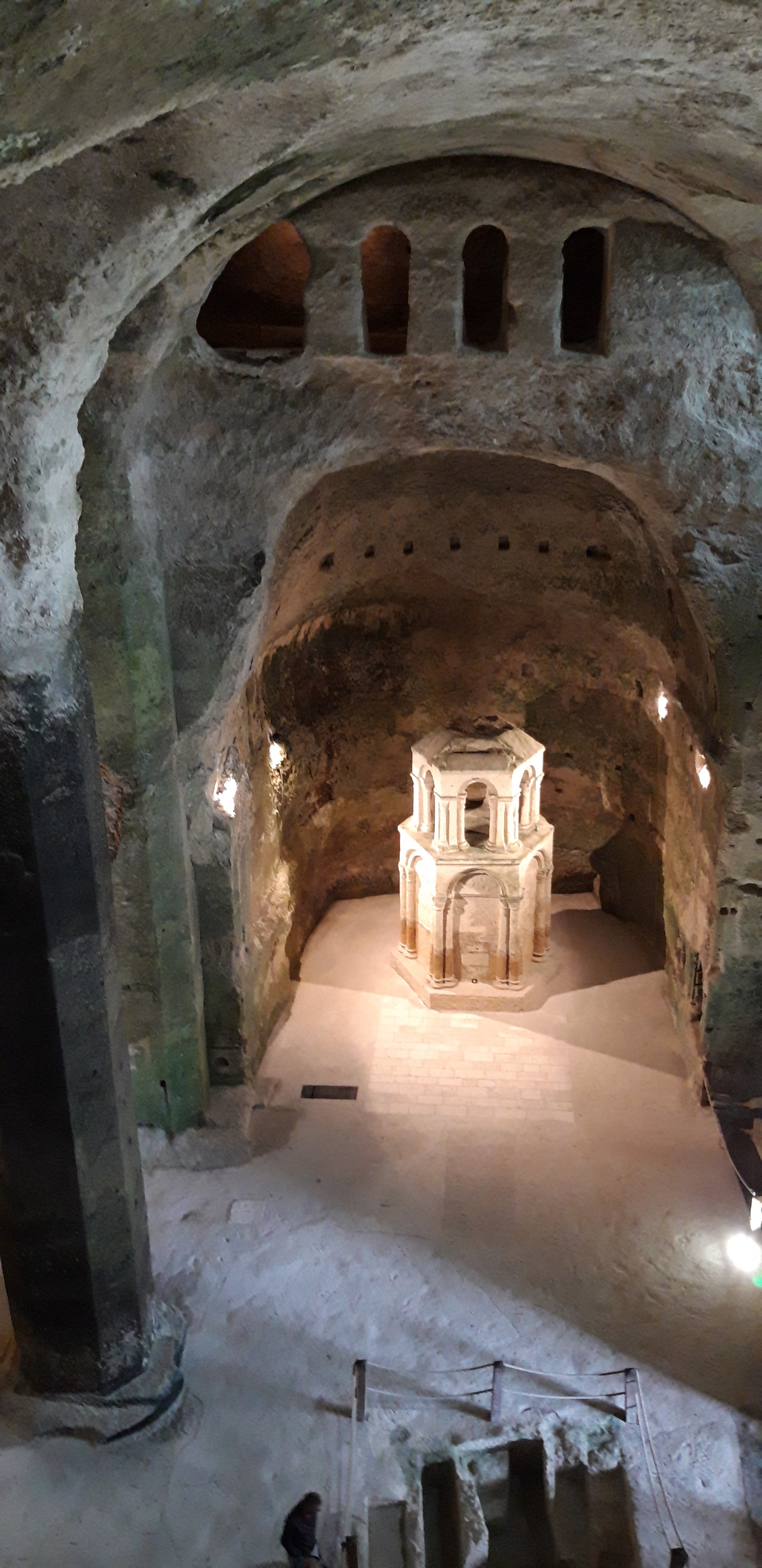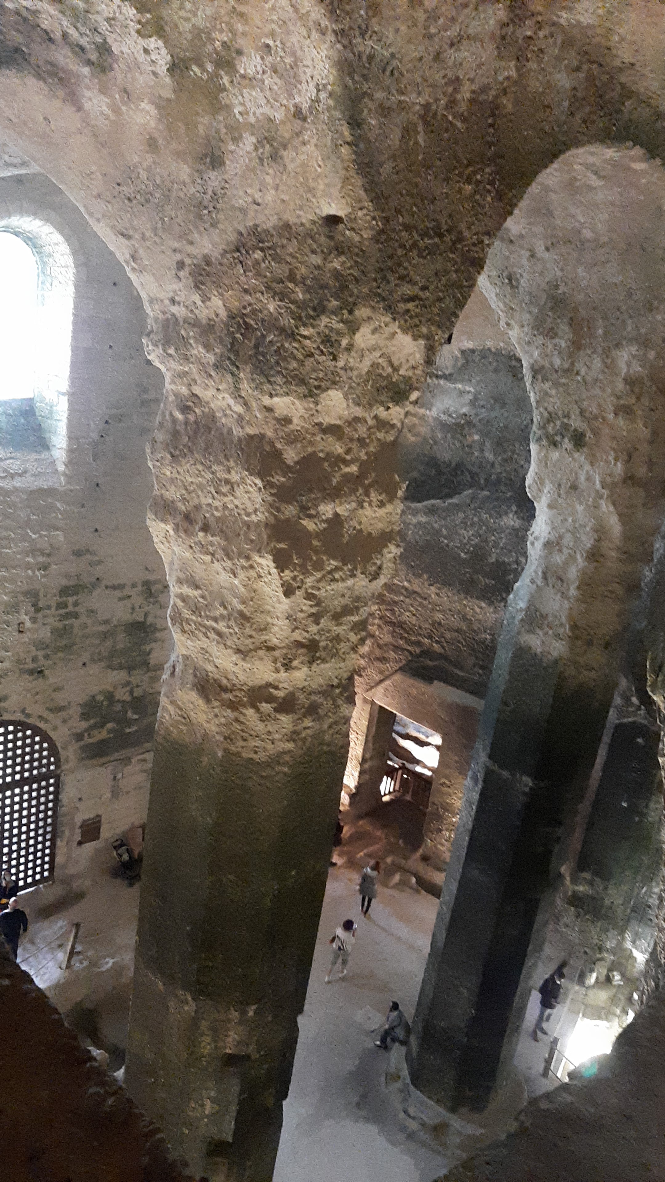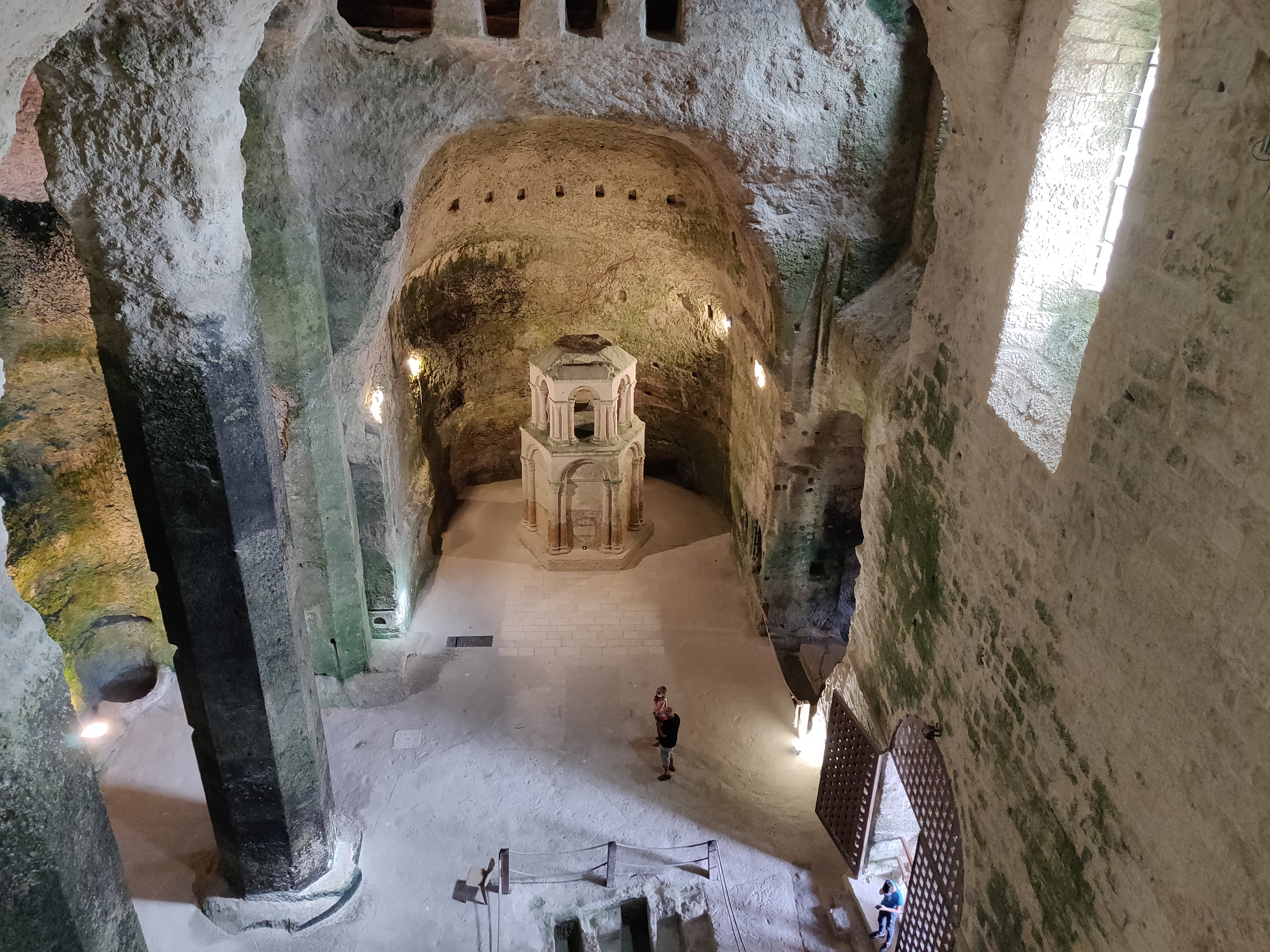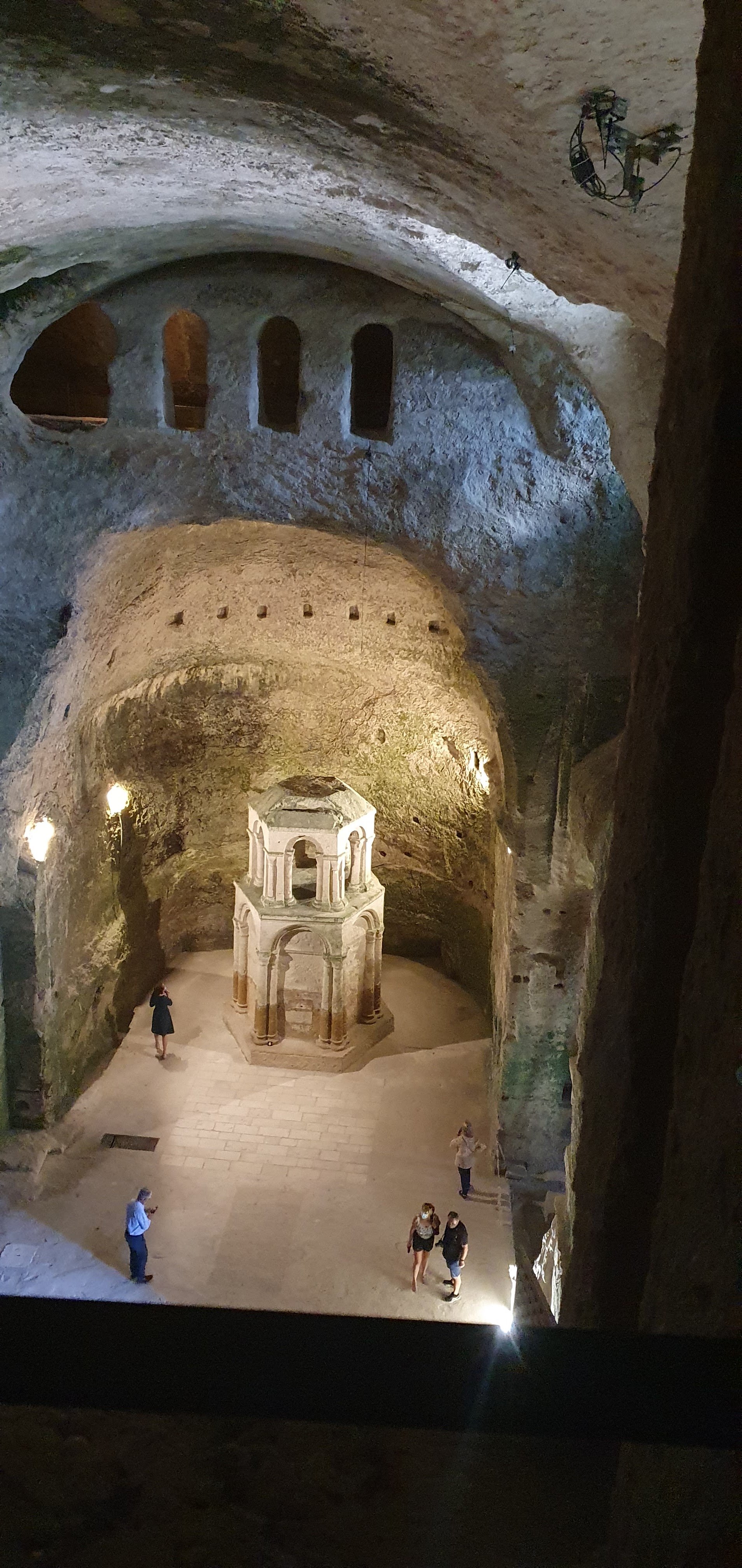 Grandiose et fascinante. Des églises ou des chapelles troglodytes, j’en avais déjà visité, mais là, on est dans les dimensions d’une cathédrale. Les immenses colonnes situées dans la nef qui accueille les visiteurs sont terriblement impressionnantes. Nos ancêtres du moyen-âge, habités par la foi, ont démontré par cet ouvrage un immense courage, des connaissances techniques et des savoir-faire exceptionnels. Sa nef grandiose, son reliquaire monumental taillé à même la roche, sa nécropole de 200 tombes, son ossuaire, son déambulatoire à plus de 10 mètres de hauteur m’ont laissé des souvenirs que je crois inoubliables.