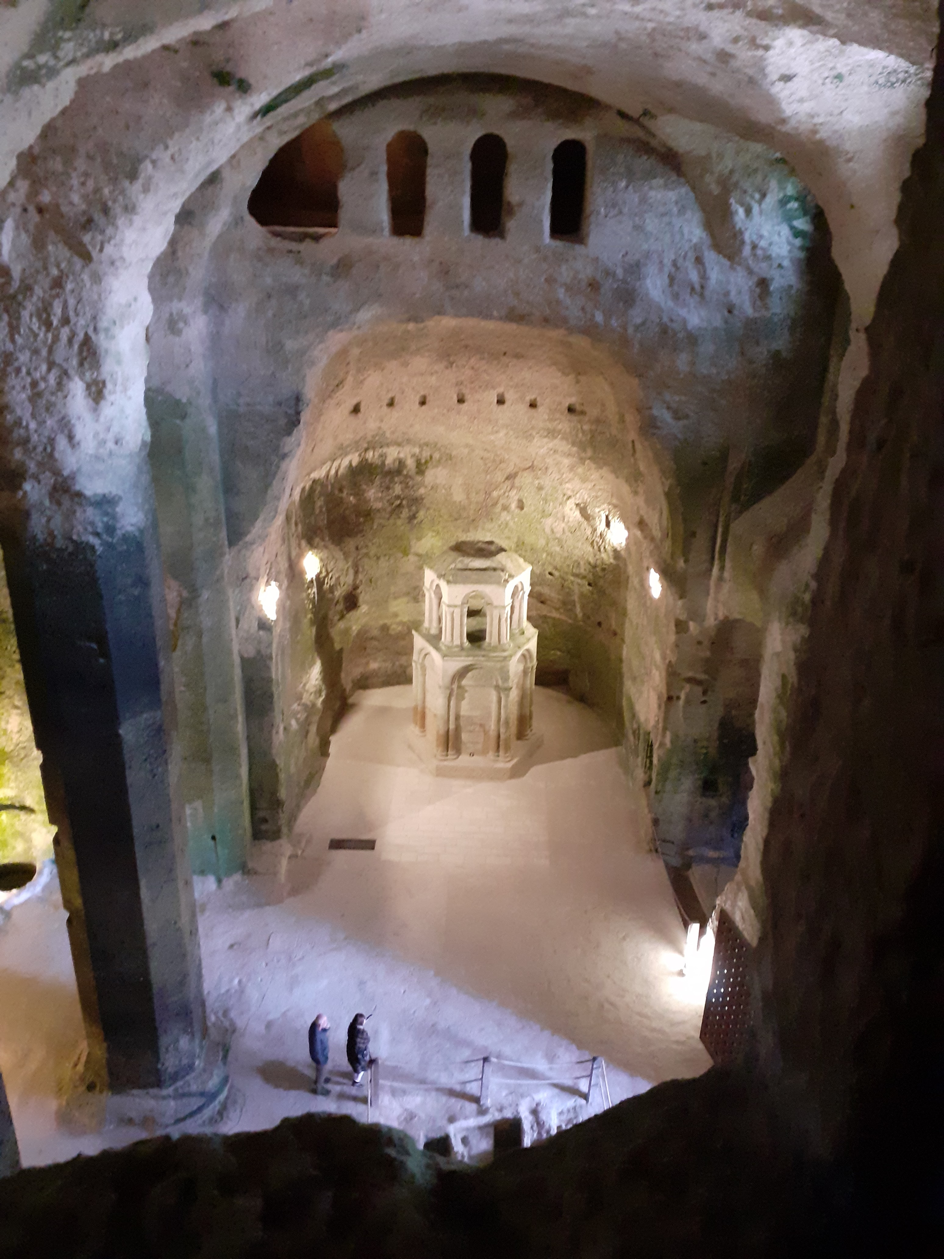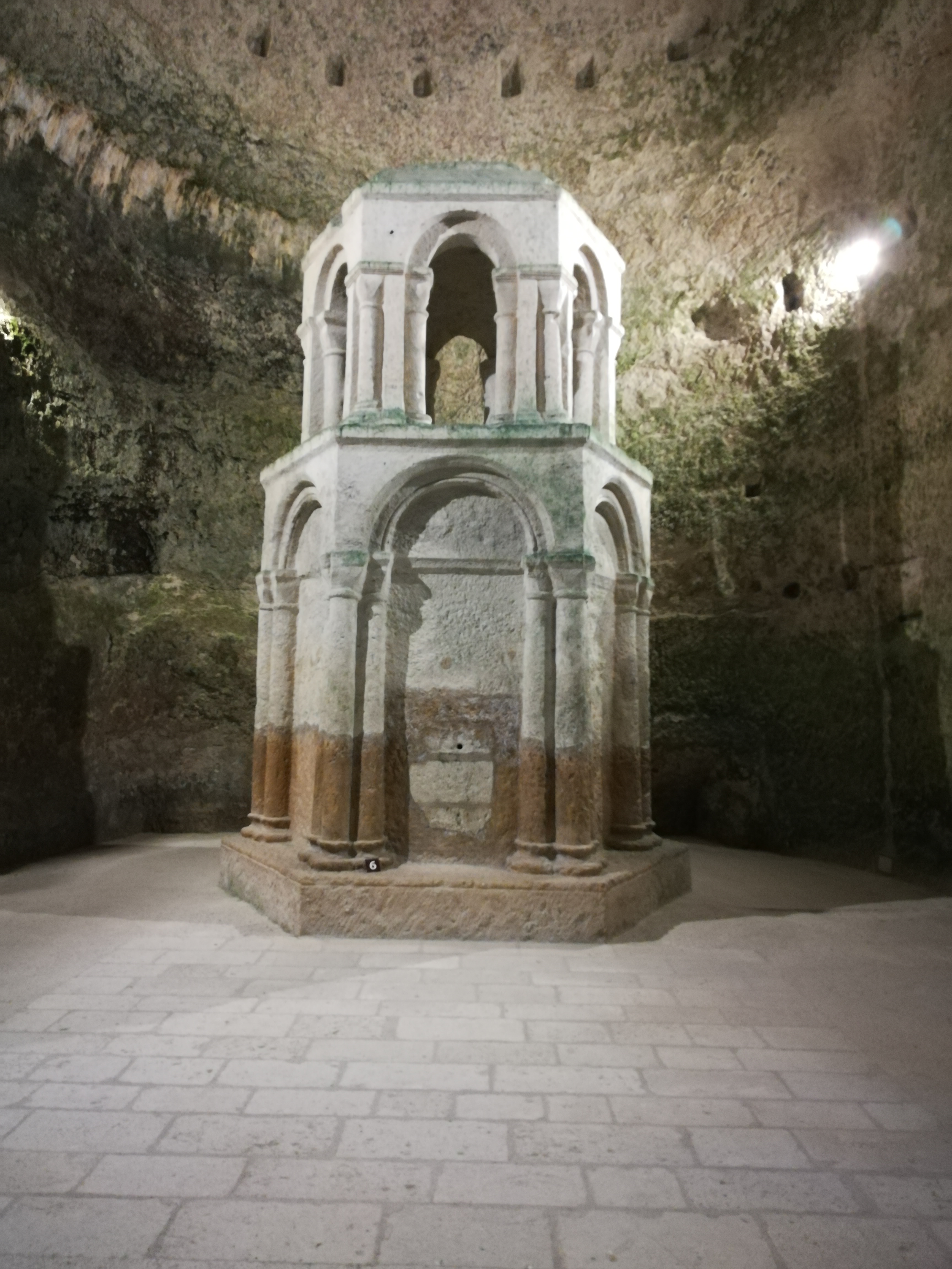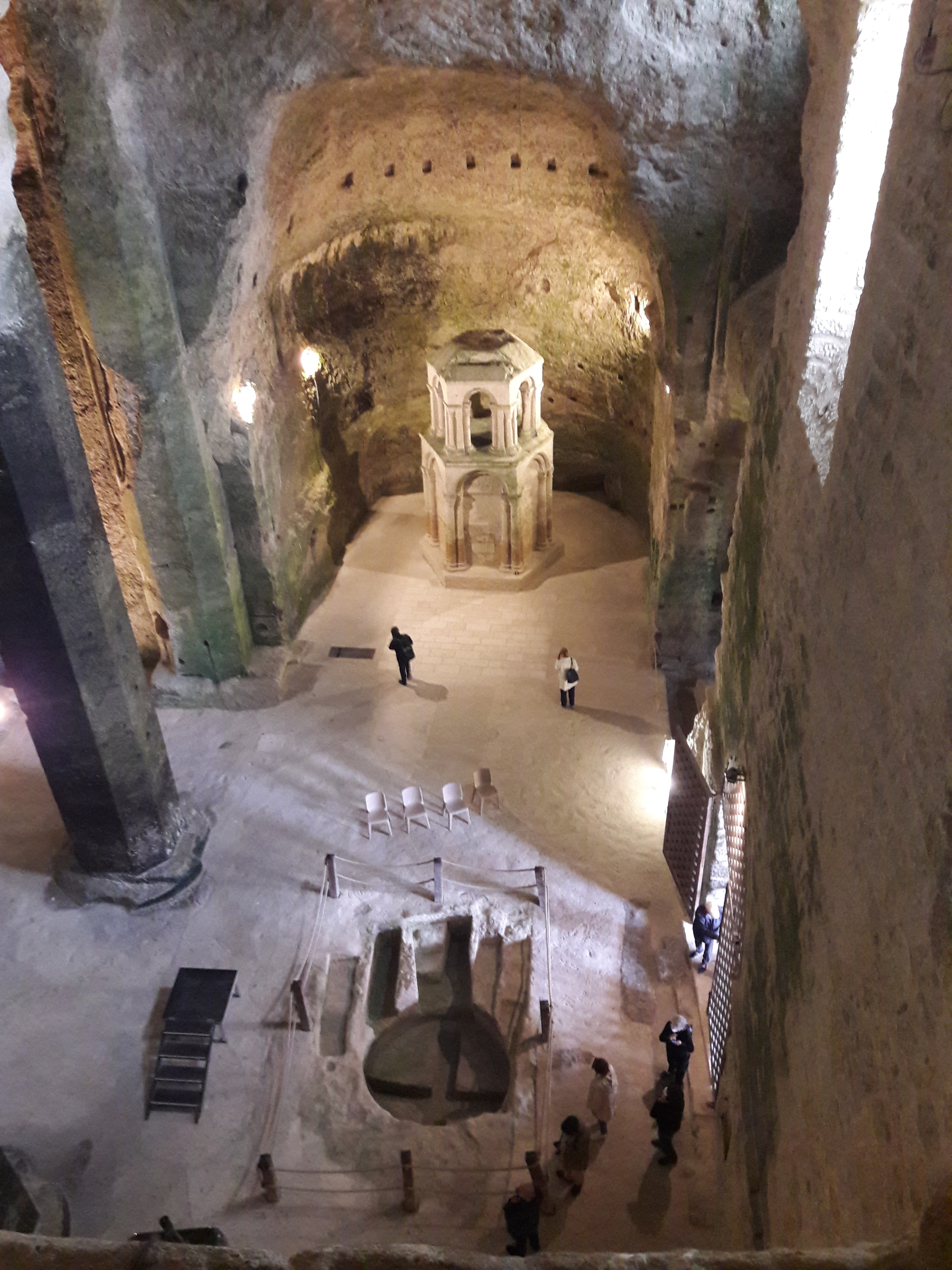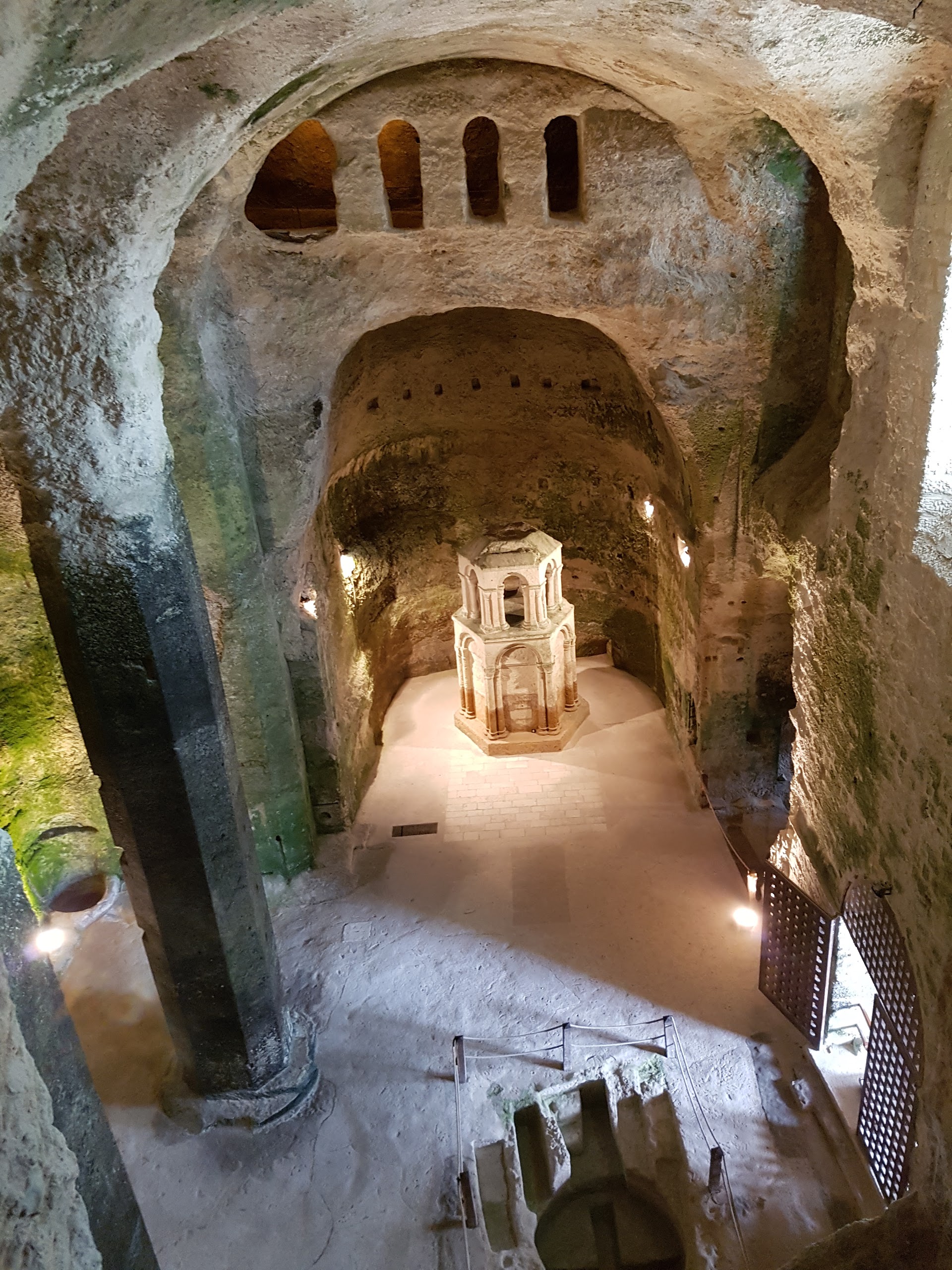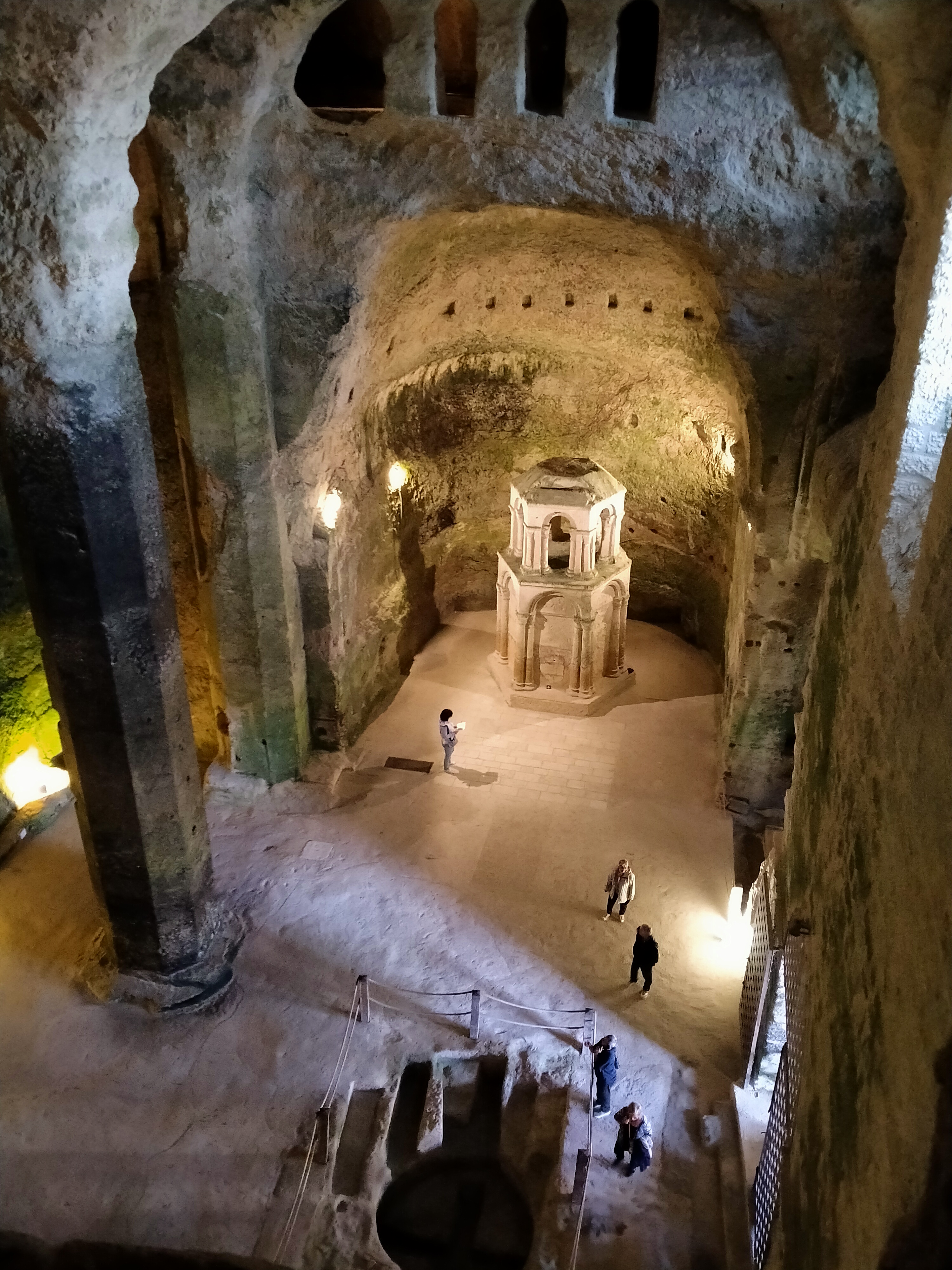 Grandiose et fascinante. Des églises ou des chapelles troglodytes, j’en avais déjà visité, mais là, on est dans les dimensions d’une cathédrale. Les immenses colonnes situées dans la nef qui accueille les visiteurs sont terriblement impressionnantes. Nos ancêtres du moyen-âge, habités par la foi, ont démontré par cet ouvrage un immense courage, des connaissances techniques et des savoir-faire exceptionnels. Sa nef grandiose, son reliquaire monumental taillé à même la roche, sa nécropole de 200 tombes, son ossuaire, son déambulatoire à plus de 10 mètres de hauteur m’ont laissé des souvenirs que je crois inoubliables.