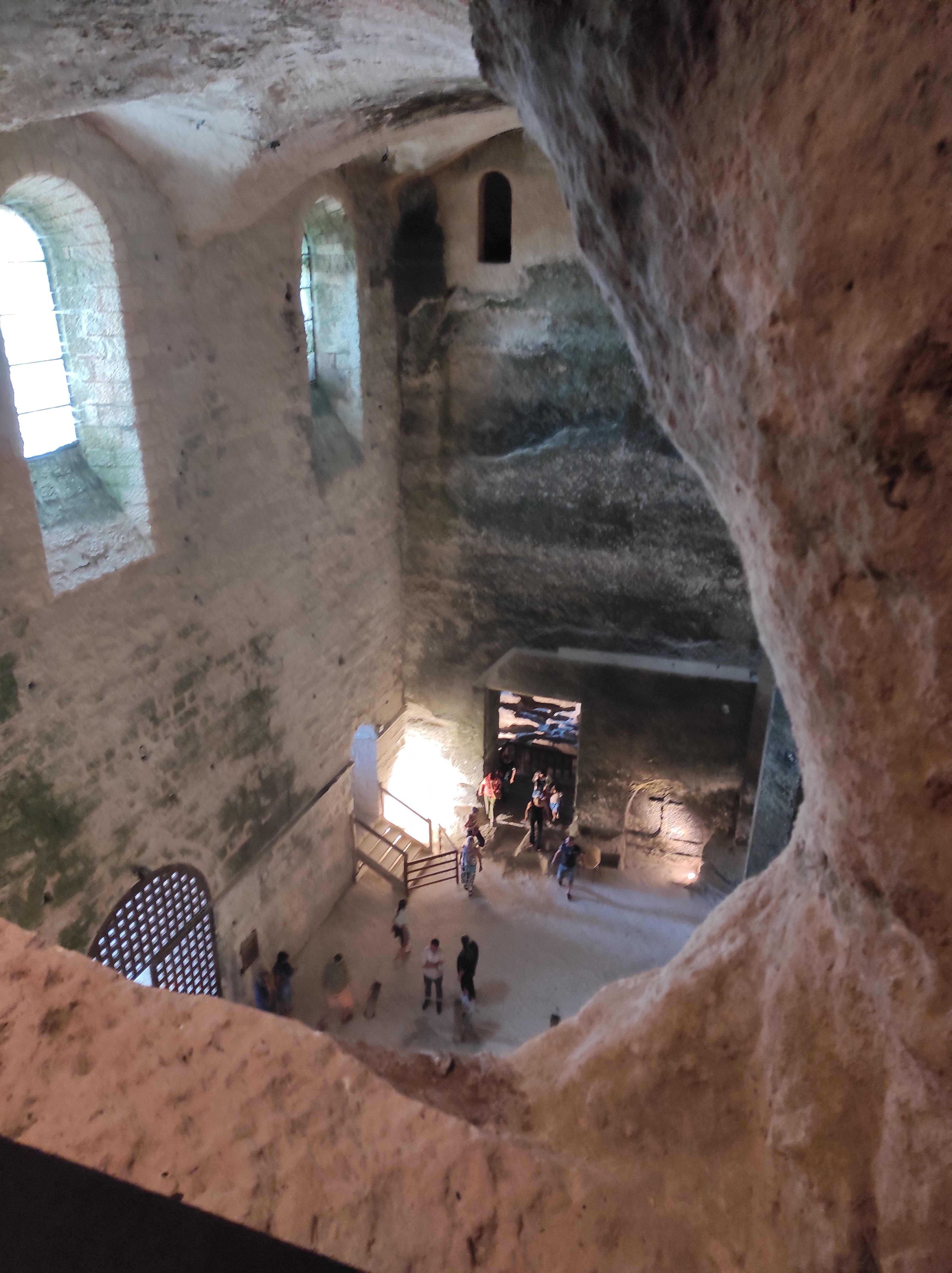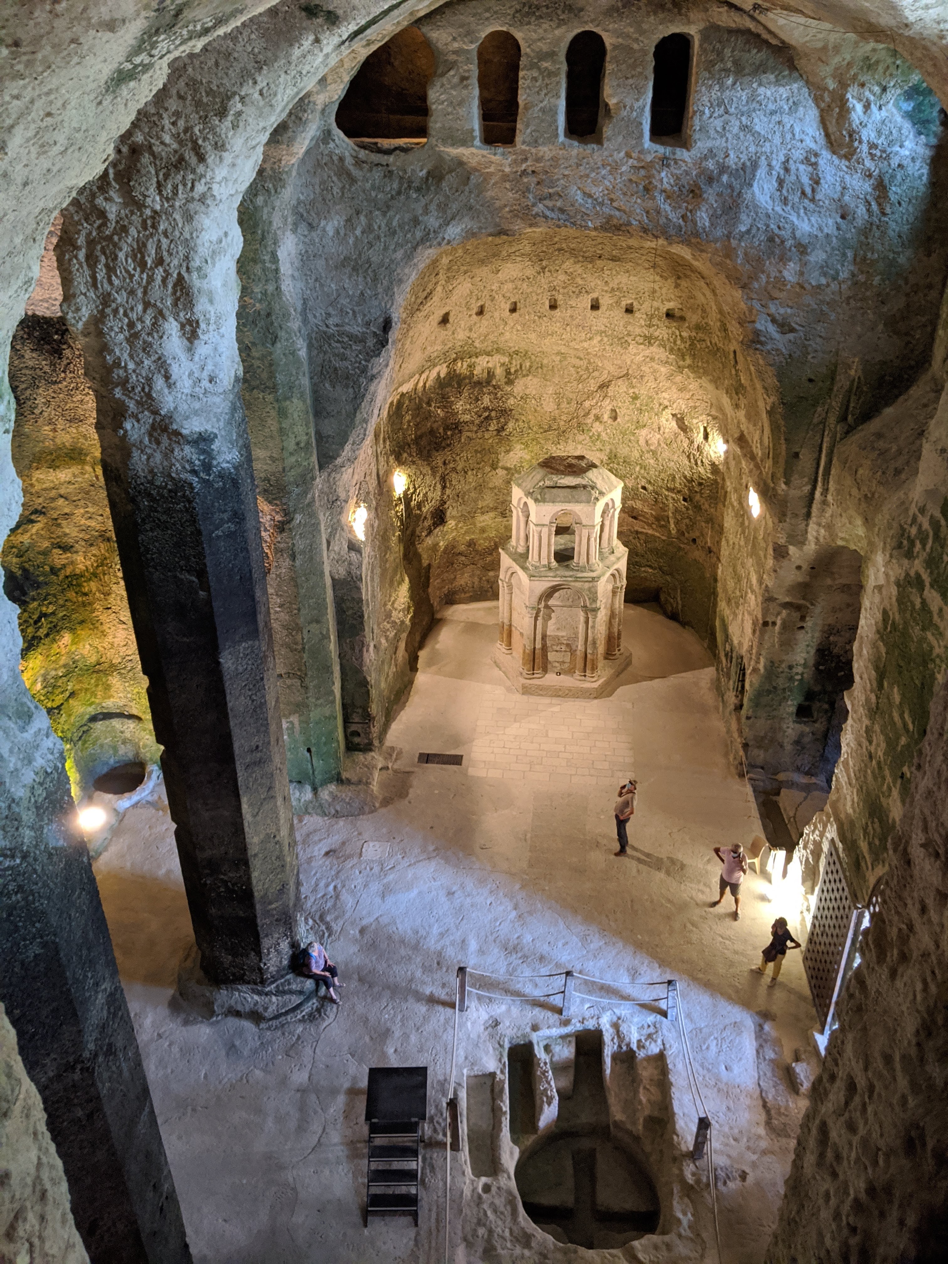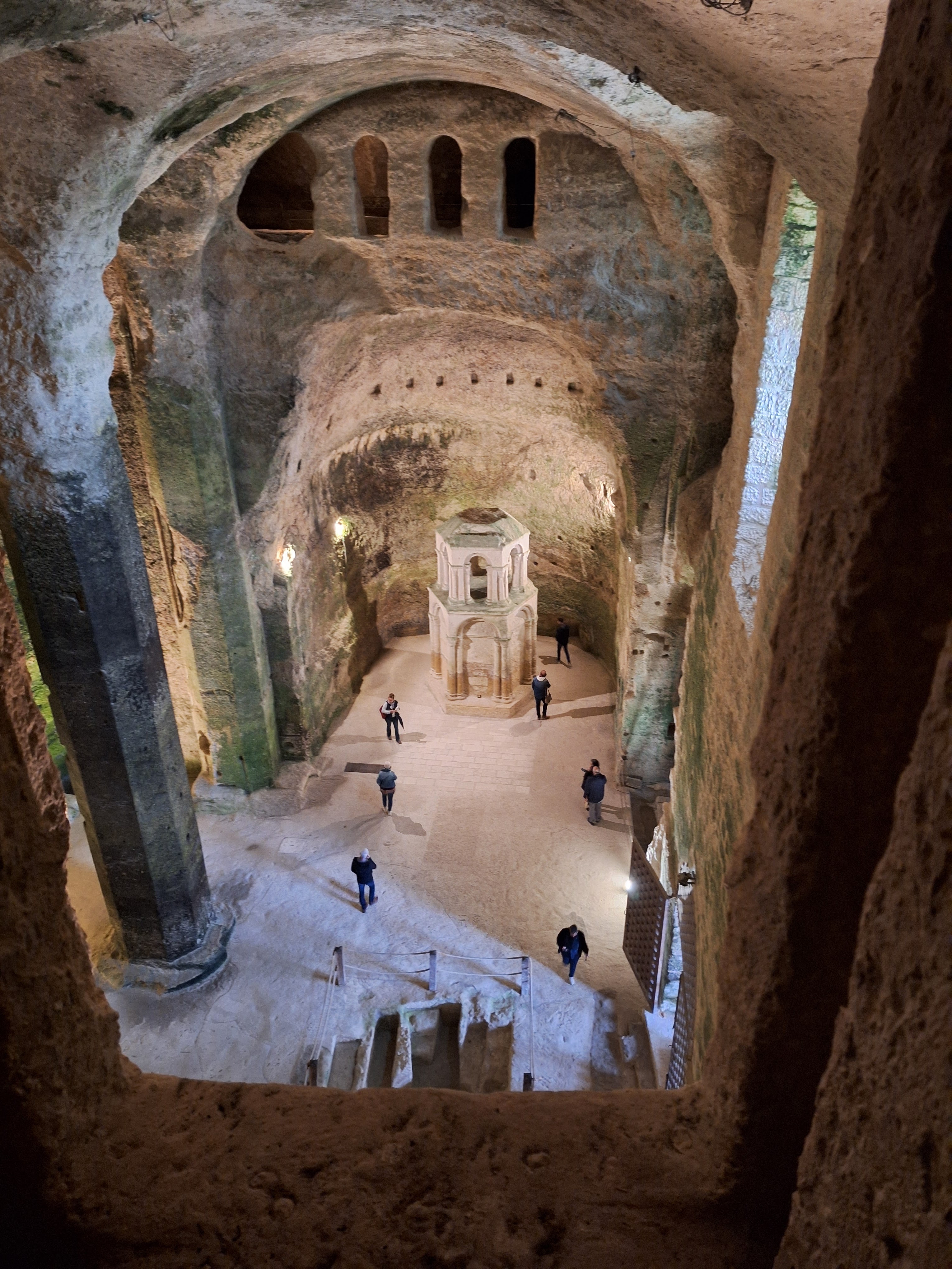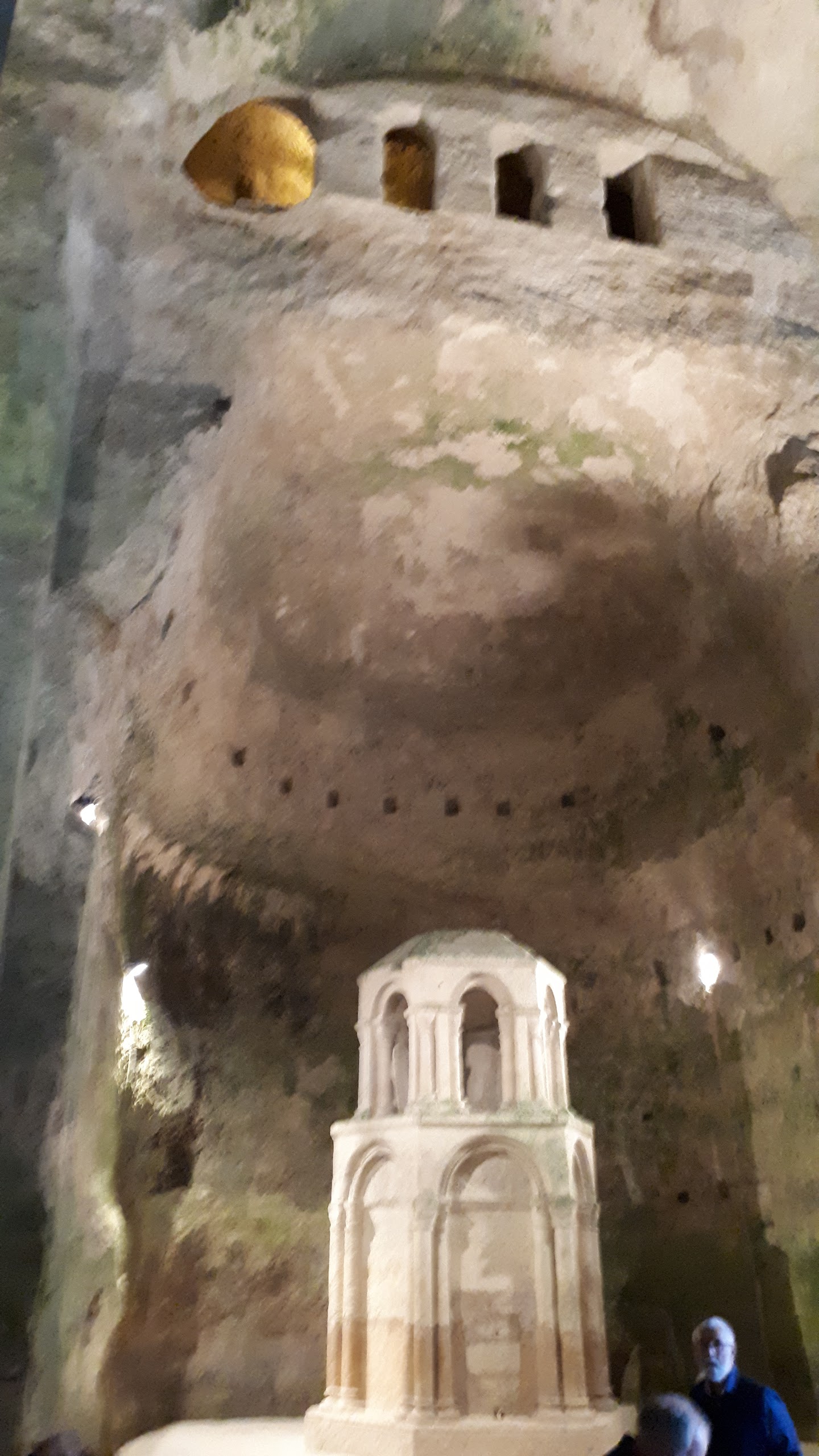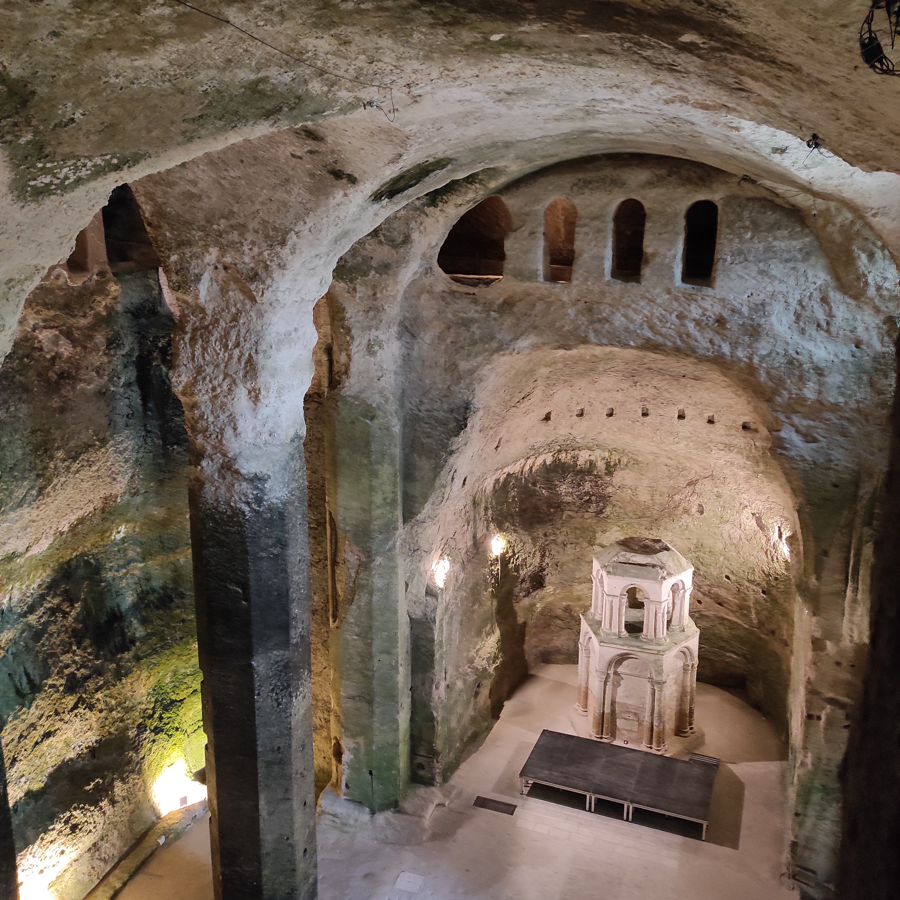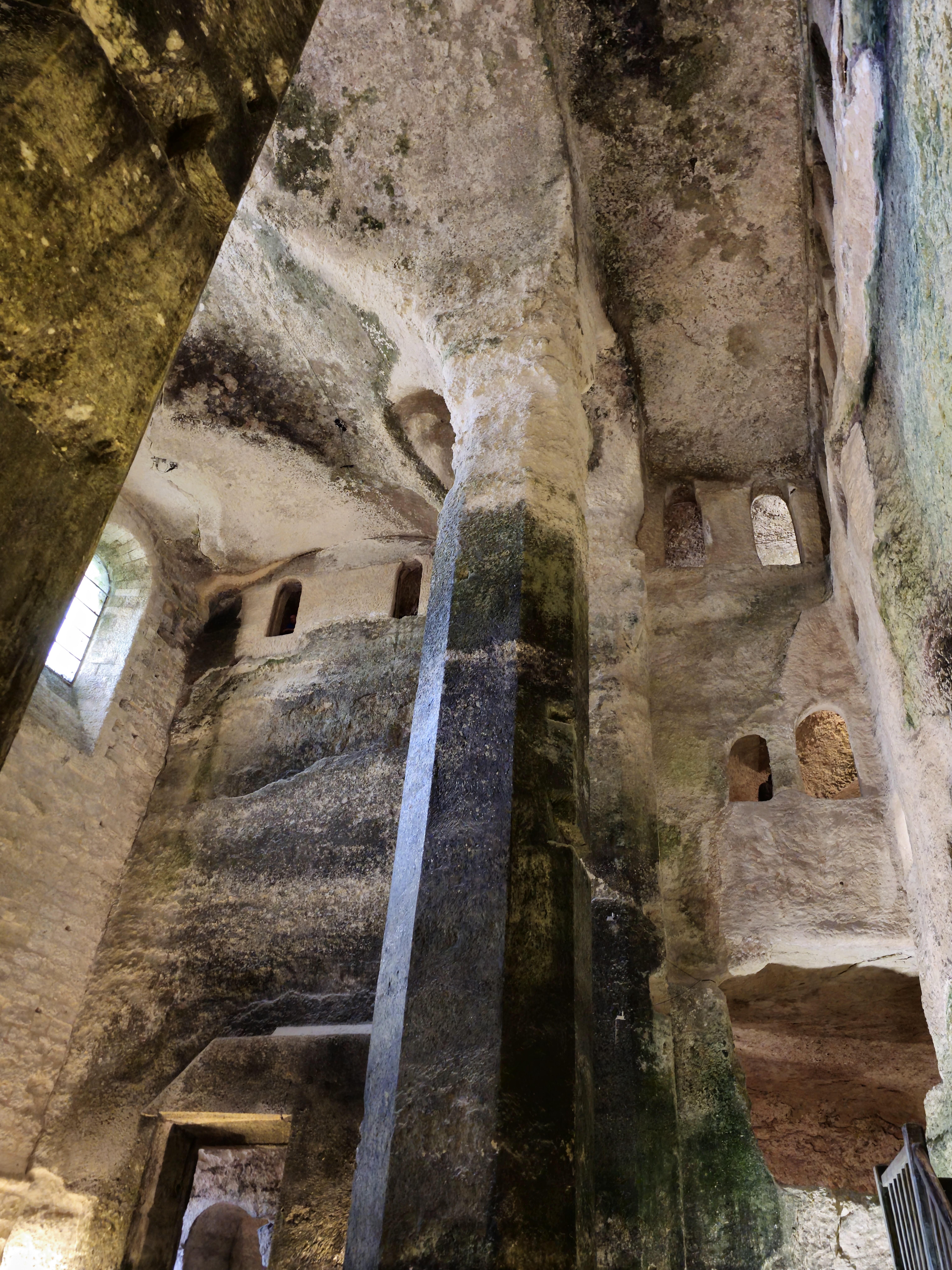 Grandiose et fascinante. Des églises ou des chapelles troglodytes, j’en avais déjà visité, mais là, on est dans les dimensions d’une cathédrale. Les immenses colonnes situées dans la nef qui accueille les visiteurs sont terriblement impressionnantes. Nos ancêtres du moyen-âge, habités par la foi, ont démontré par cet ouvrage un immense courage, des connaissances techniques et des savoir-faire exceptionnels. Sa nef grandiose, son reliquaire monumental taillé à même la roche, sa nécropole de 200 tombes, son ossuaire, son déambulatoire à plus de 10 mètres de hauteur m’ont laissé des souvenirs que je crois inoubliables.