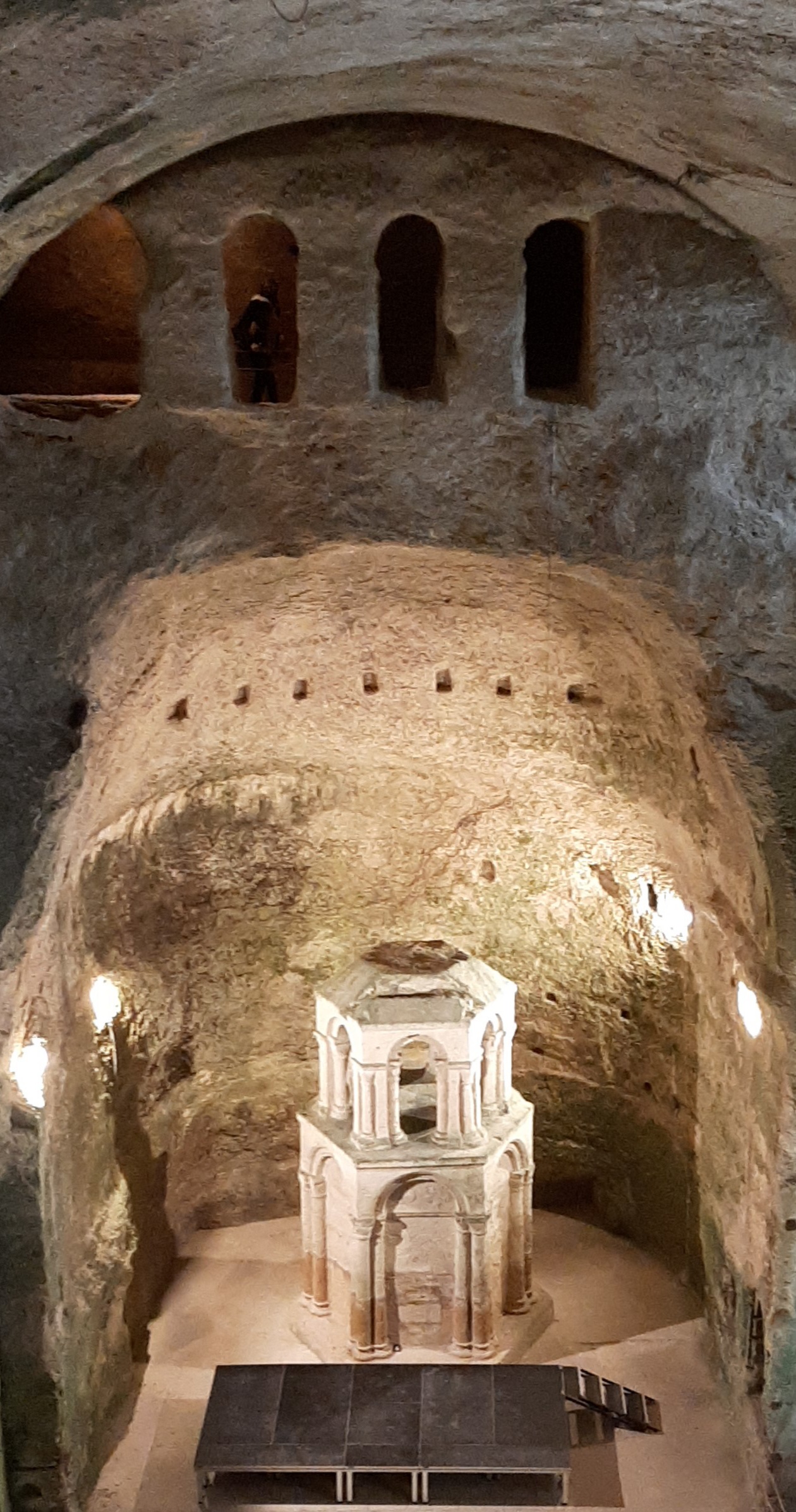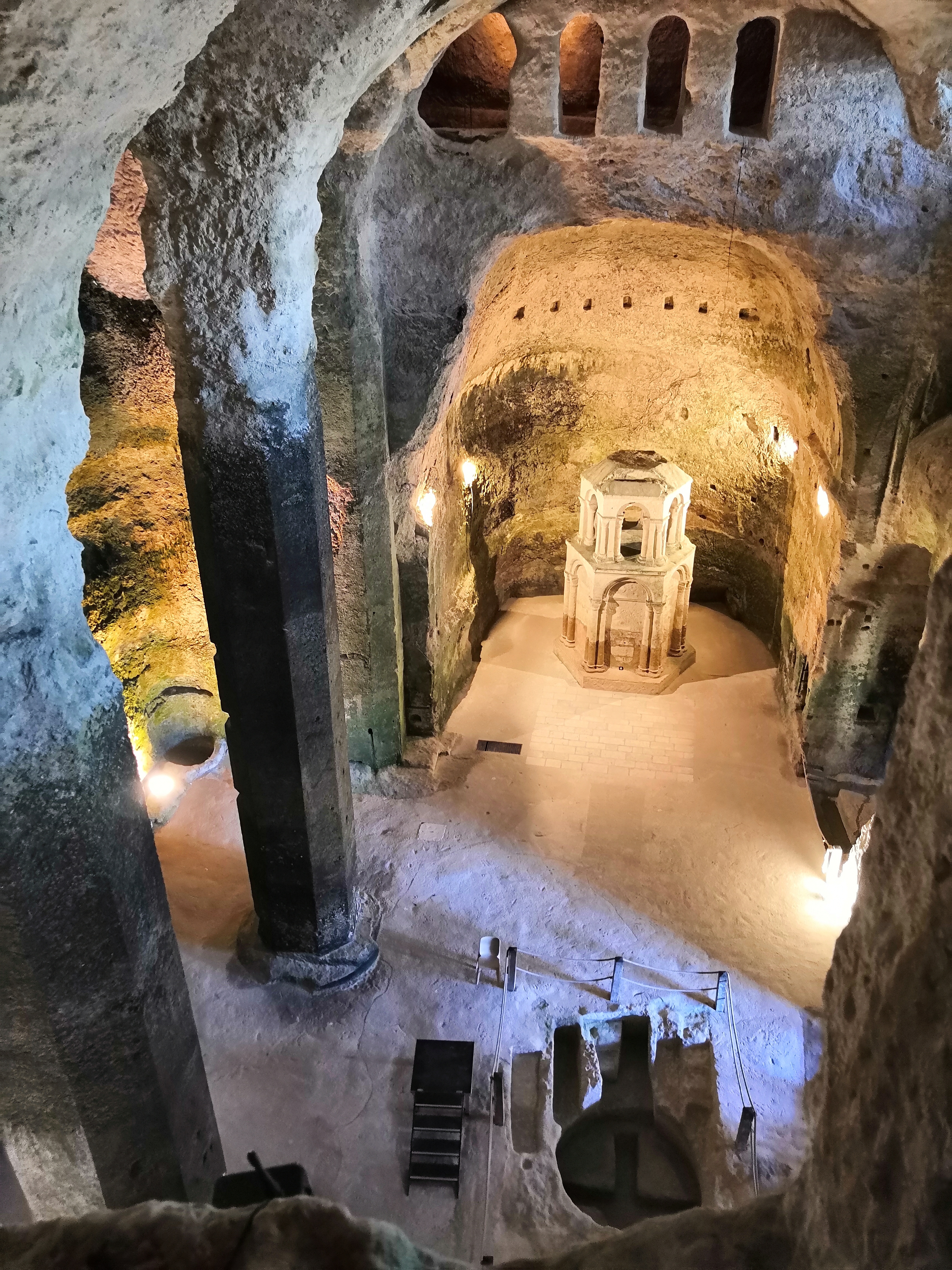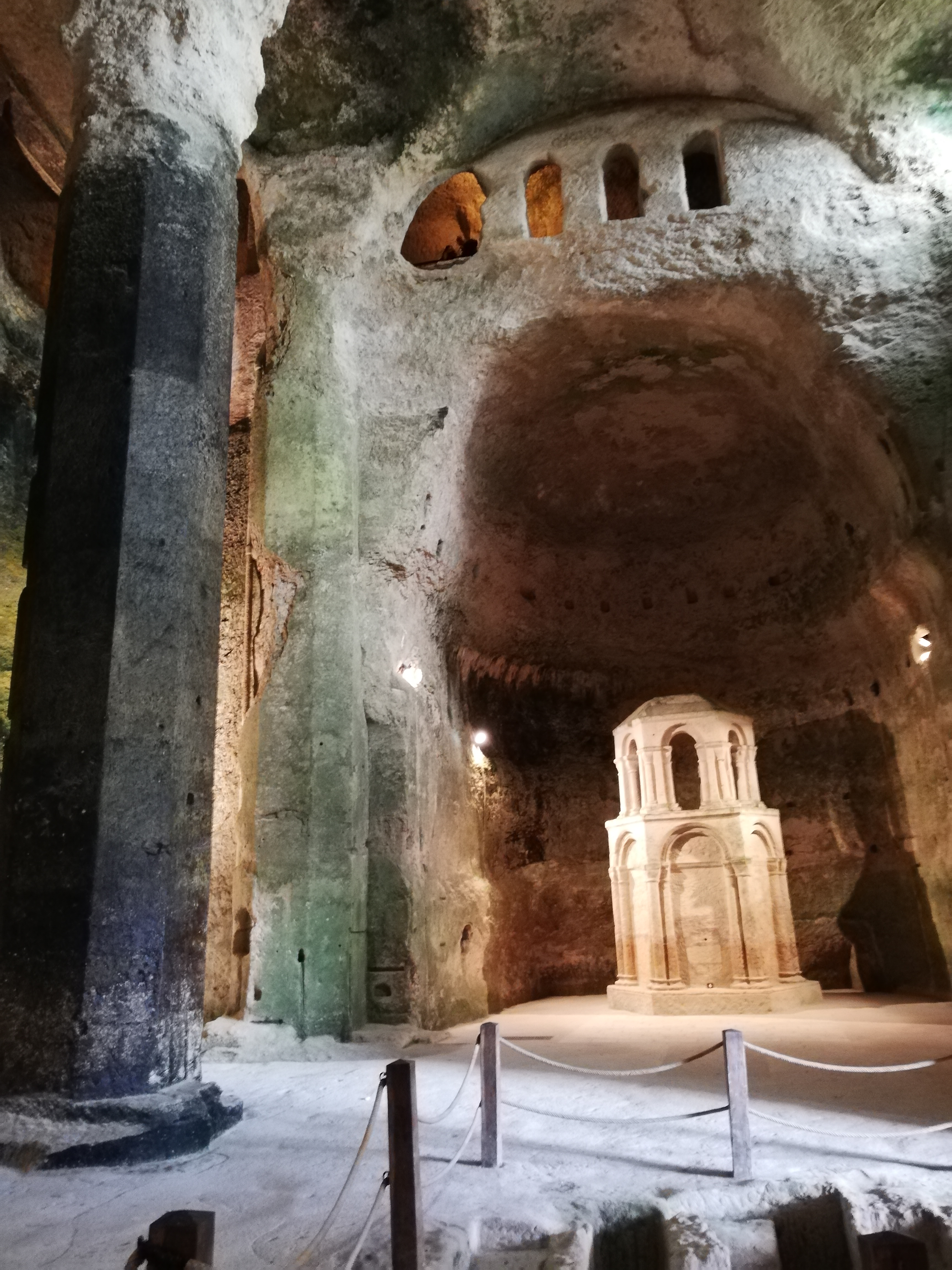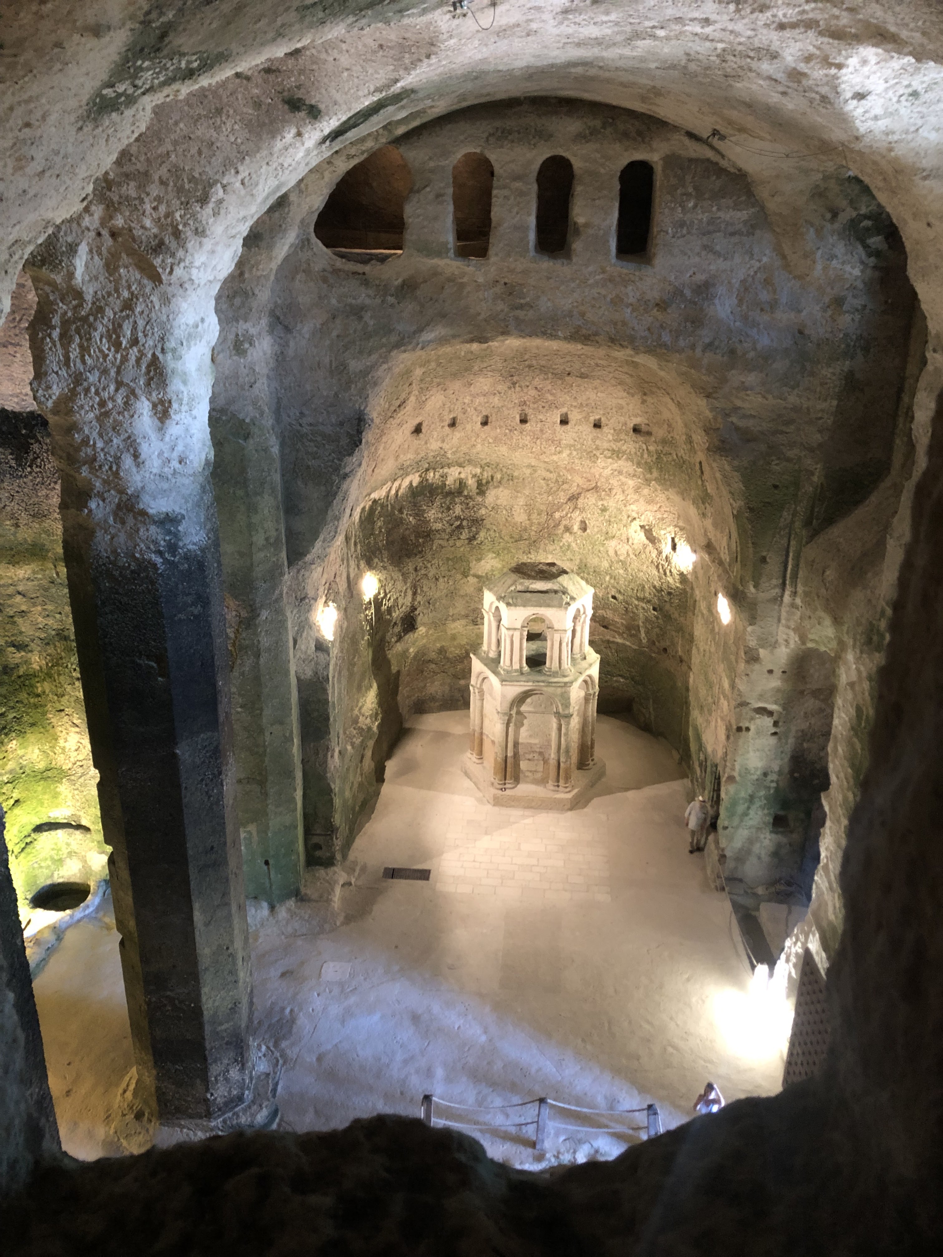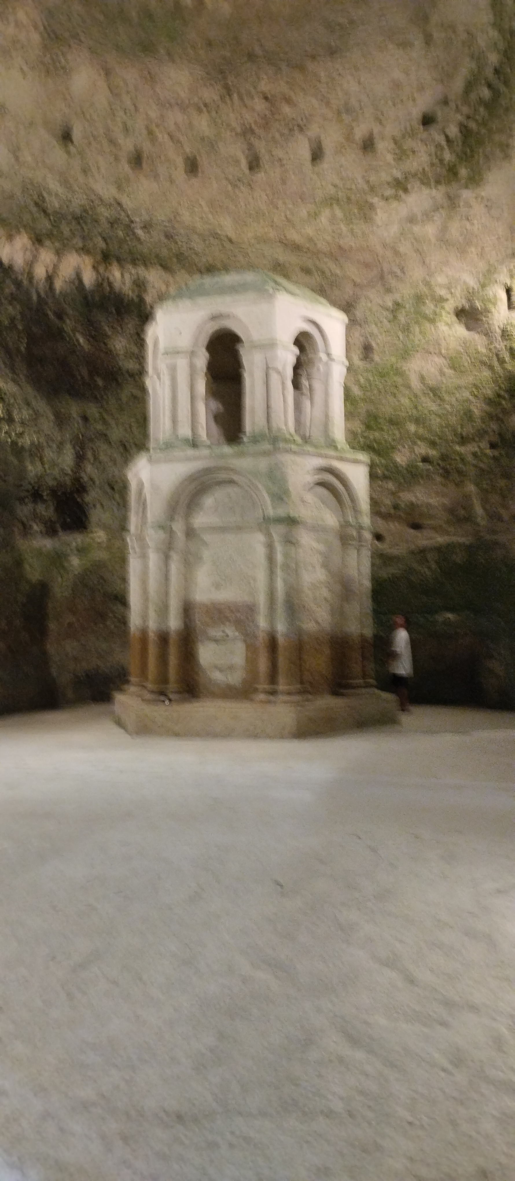 Grandiose et fascinante. Des églises ou des chapelles troglodytes, j’en avais déjà visité, mais là, on est dans les dimensions d’une cathédrale. Les immenses colonnes situées dans la nef qui accueille les visiteurs sont terriblement impressionnantes. Nos ancêtres du moyen-âge, habités par la foi, ont démontré par cet ouvrage un immense courage, des connaissances techniques et des savoir-faire exceptionnels. Sa nef grandiose, son reliquaire monumental taillé à même la roche, sa nécropole de 200 tombes, son ossuaire, son déambulatoire à plus de 10 mètres de hauteur m’ont laissé des souvenirs que je crois inoubliables.