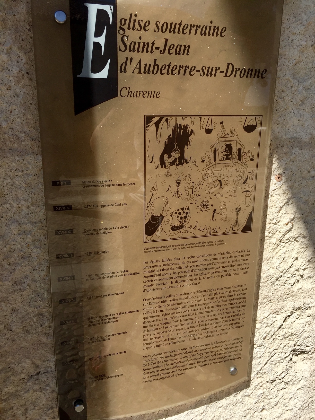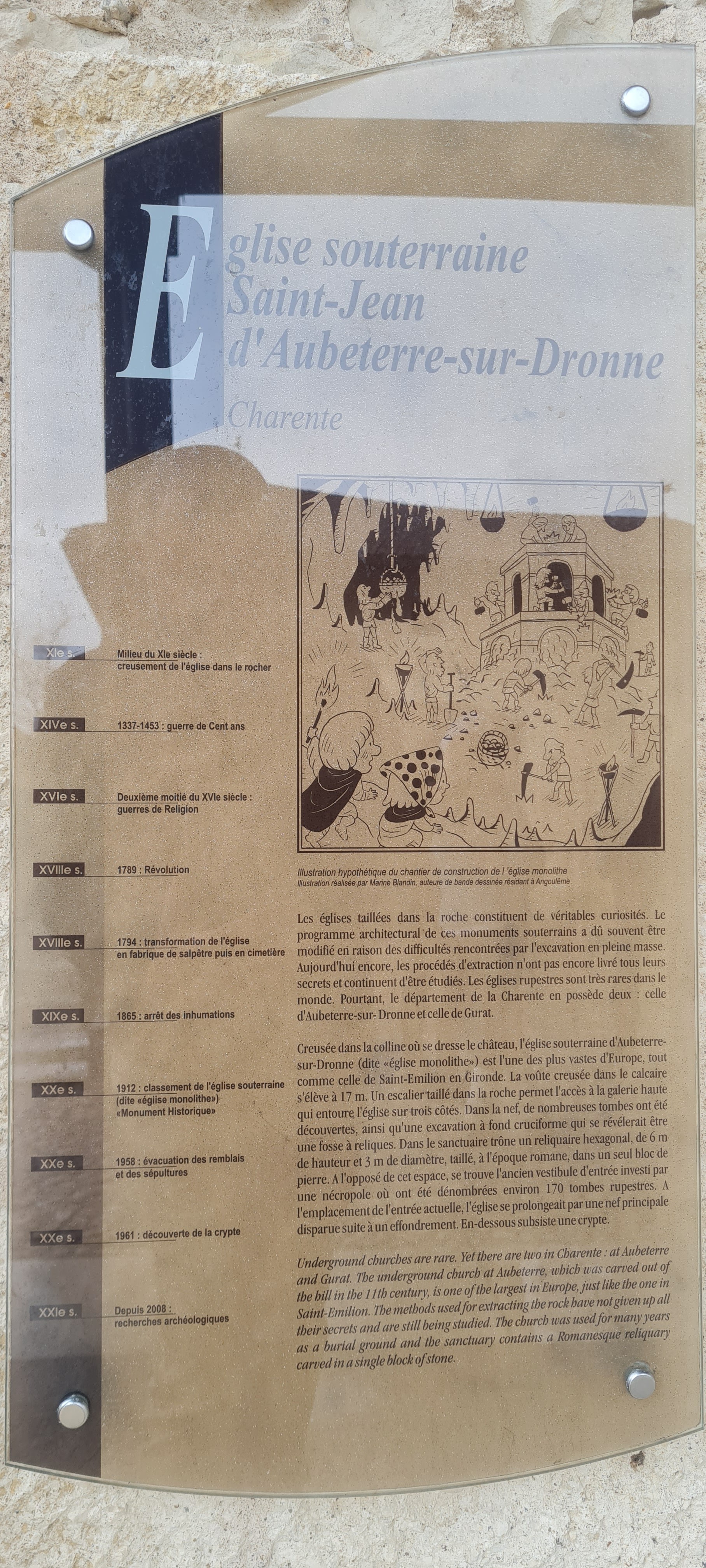Une belle église troglodytique datant de la fin du XIe siècle et creusée sur l'initiative du vicomte de Castillon, marié à la dame d'Aubeterre, au retour de la 1ère croisade. Malheureusement la guide est un peu pénible : maladroitement théâtrale, elle se permet en plus une confusion très problématique puisqu'elle confond aristocratie et bourgeoisie. 🙄