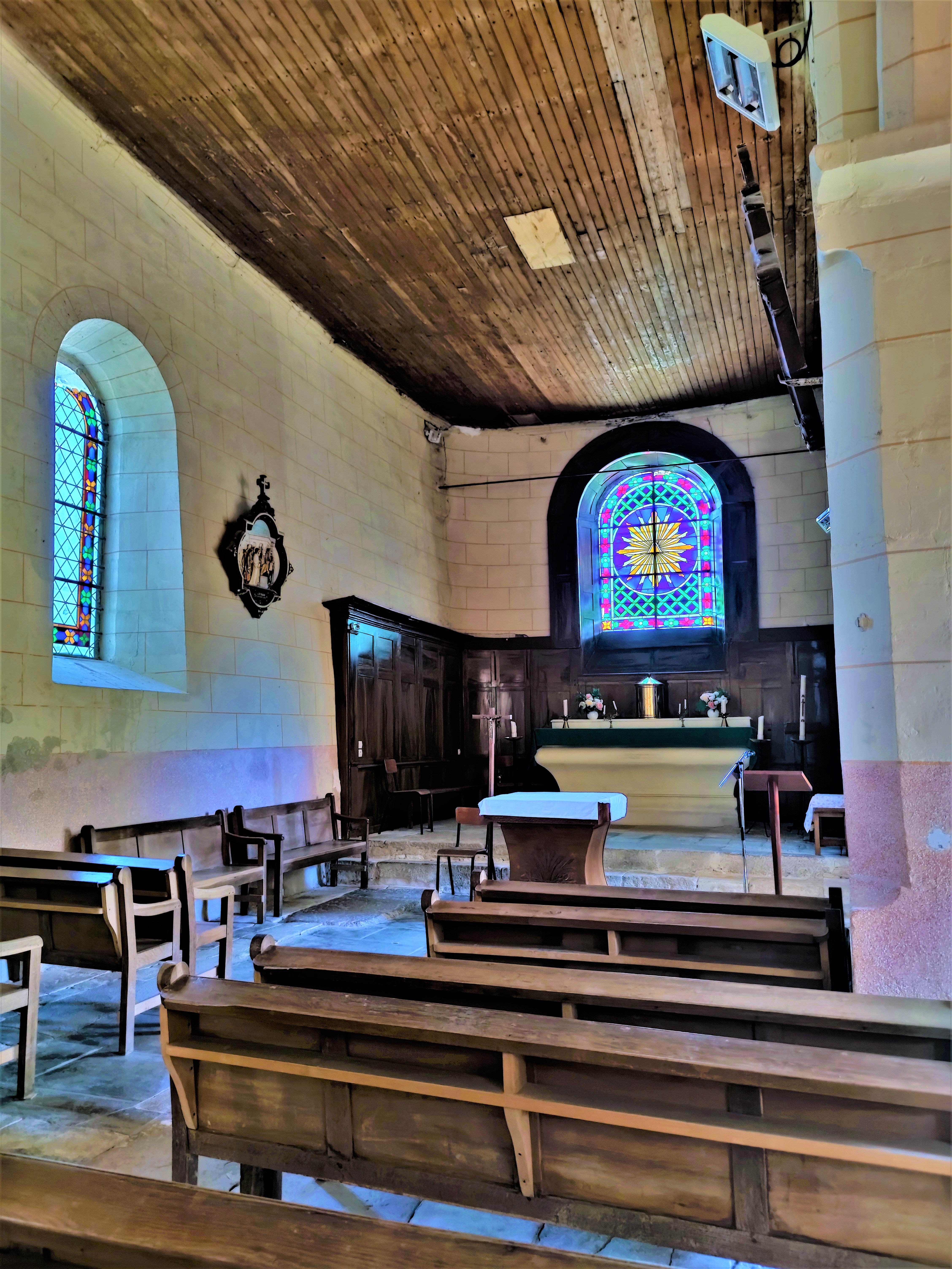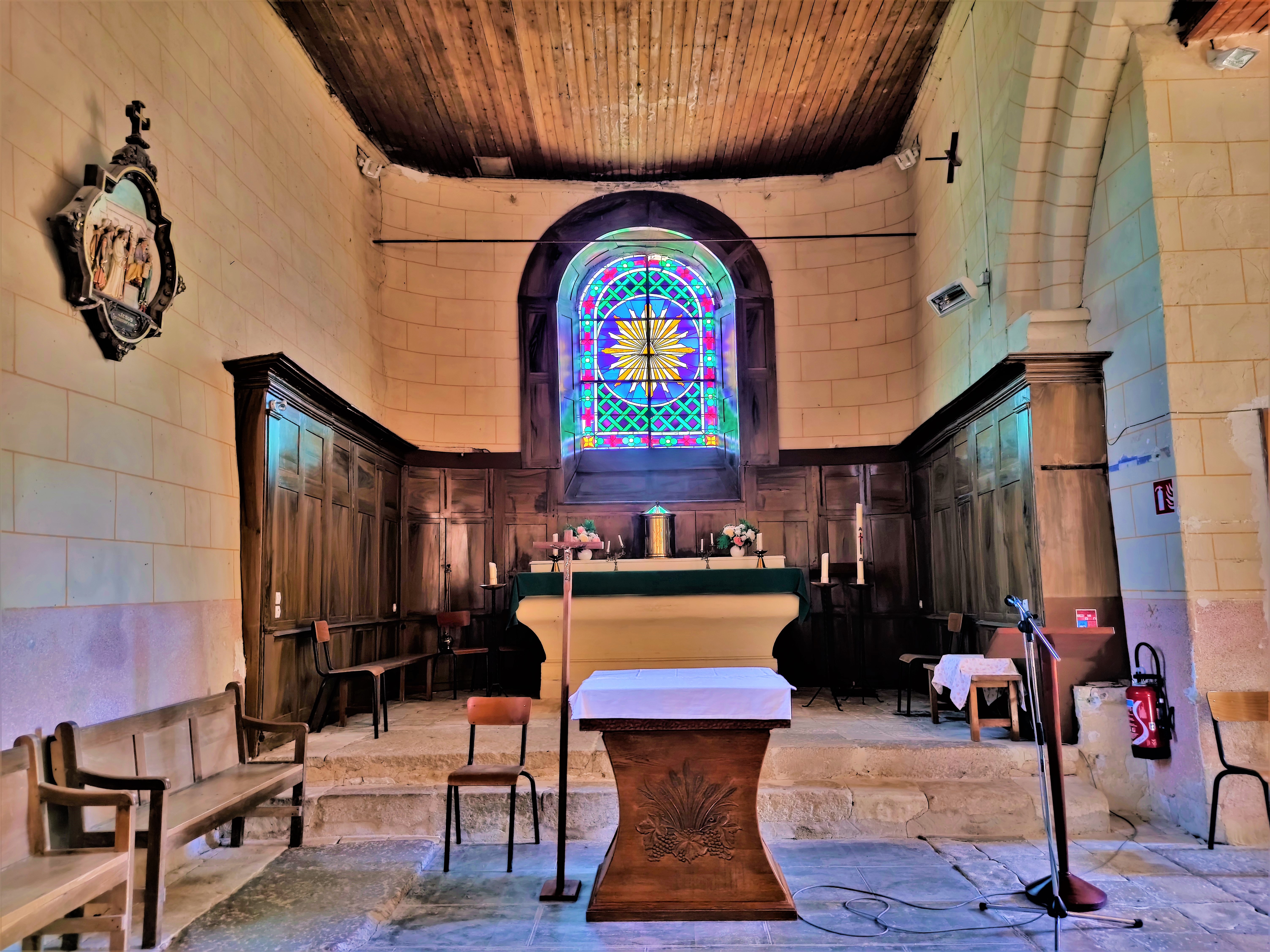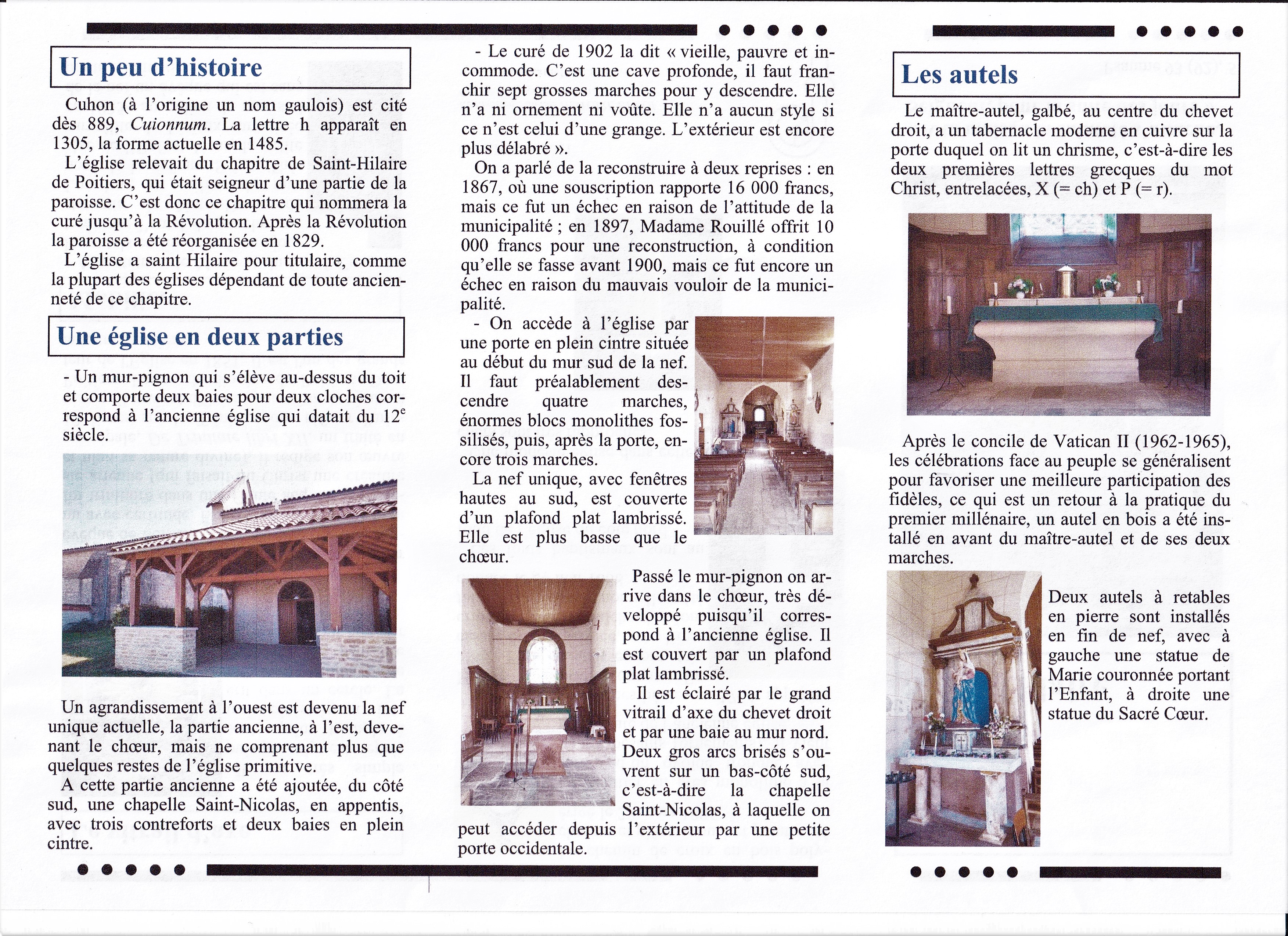 Pour découvrir l'intérieur de cet édifice accolé au cimetière, il faut s'adresser à la mairie située juste à côté. Cuhon, petit village de 400 habitants possède une modeste église dont l'ancienneté diverge selon les sources. Du 15ème siècle mais sans certitude pour la Plateforme Ouverte du Patrimoine, le Centre théologique de Poitiers date sa première pierre du 12ème siècle. Cette dernière datation semble plus vraisemblable au regard des vestiges bâtis de la région et des origines gauloises de cette cité. De cette église primitive, reste le clocher-mur à 2 baies et 2 cloches qui surplombe l'édifice en son milieu. Il représente la partie haute de la façade Ouest de l'ancienne église romane. Cette dernière, qui fut agrandie au Sud d'un collatéral, la chapelle Saint-Nicolas, abrite aujourd'hui le chœur. La nef fut construite en prolongement vers l'ouest, l'entrée se faisant par la porte en plein cintre, située à l'extrémité côté Sud. Des aménagements récents ont été réalisés, constatant que les paroissiens utilisaient le parking situé au Nord. Un abri a été construit devant le portail septentrional qui est devenu l'entrée principale. Nommé, selon les régions, auvent, balet, caquetoire, galerie, salle de discussion, cette construction favorise les rencontres et les échanges. L'intérieur de l'église, très simple, se prête parfaitement à la méditation, le recueillement, la prière etc…