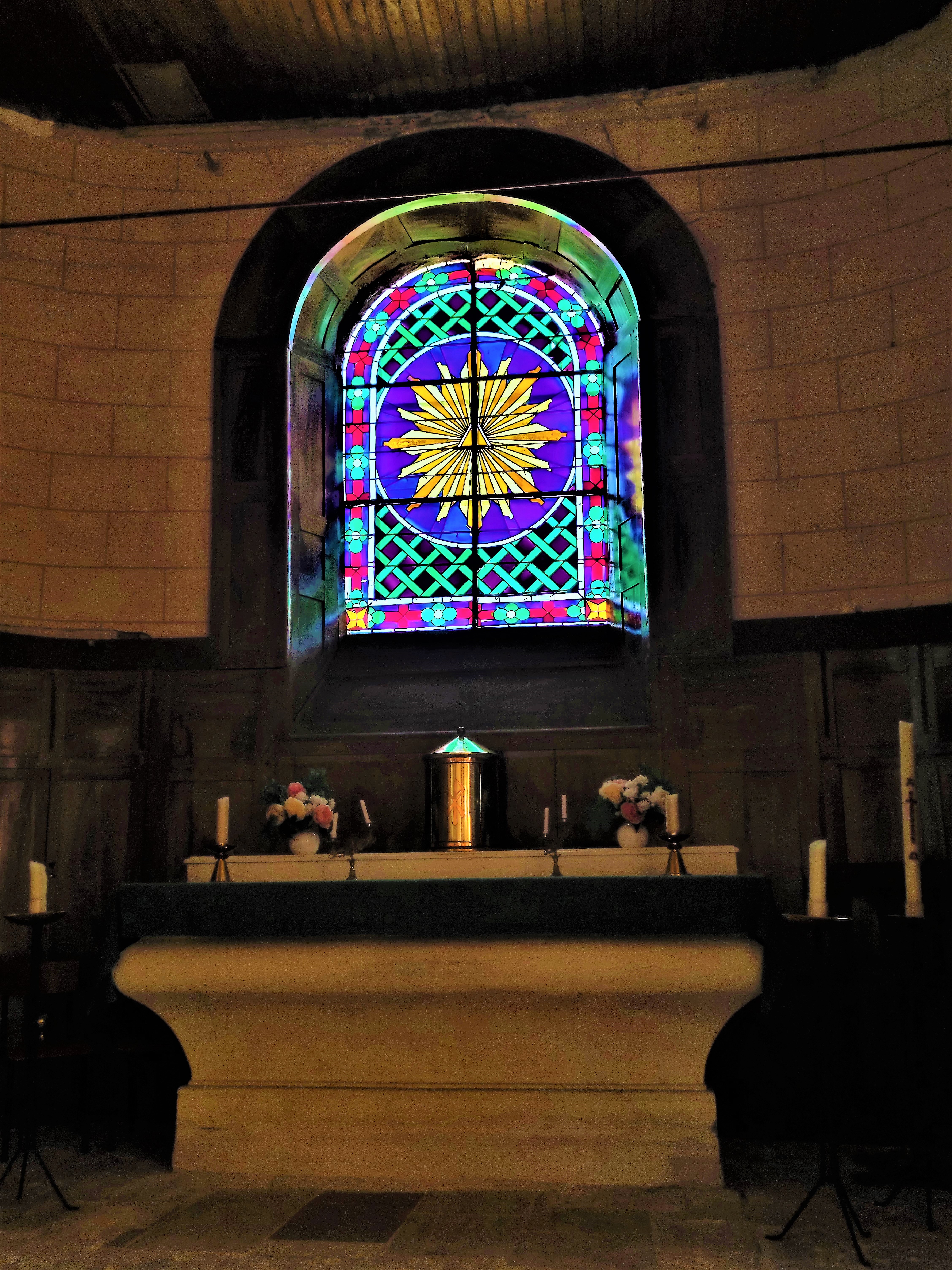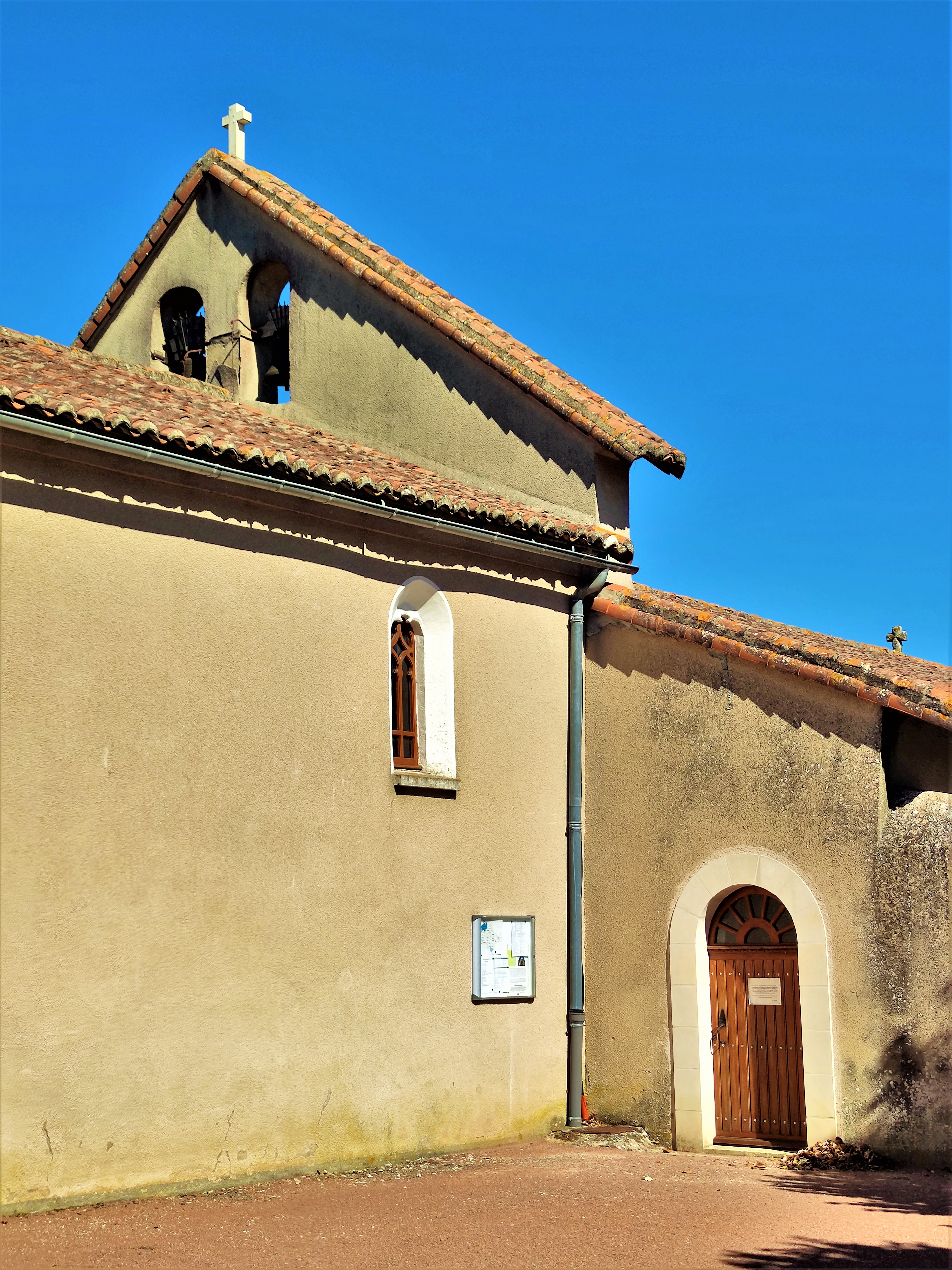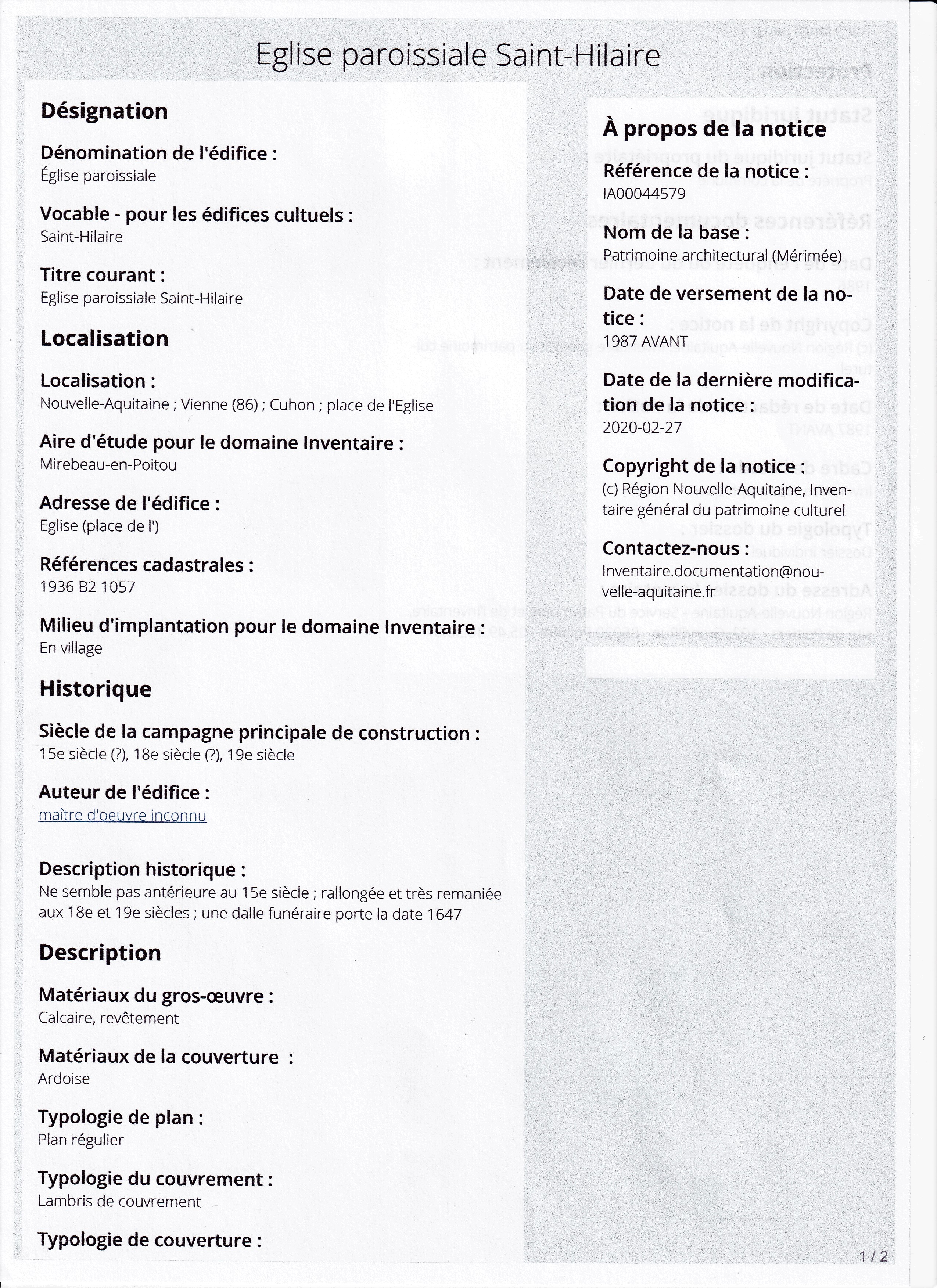Pour découvrir l'intérieur de cet édifice accolé au cimetière, il faut s'adresser à la mairie située juste à côté. Cuhon, petit village de 400 habitants possède une modeste église dont l'ancienneté diverge selon les sources. Du 15ème siècle mais sans certitude pour la Plateforme Ouverte du Patrimoine, le Centre théologique de Poitiers date sa première pierre du 12ème siècle. Cette dernière datation semble plus vraisemblable au regard des vestiges bâtis de la région et des origines gauloises de cette cité. De cette église primitive, reste le clocher-mur à 2 baies et 2 cloches qui surplombe l'édifice en son milieu. Il représente la partie haute de la façade Ouest de l'ancienne église romane. Cette dernière, qui fut agrandie au Sud d'un collatéral, la chapelle Saint-Nicolas, abrite aujourd'hui le chœur. La nef fut construite en prolongement vers l'ouest, l'entrée se faisant par la porte en plein cintre, située à l'extrémité côté Sud. Des aménagements récents ont été réalisés, constatant que les paroissiens utilisaient le parking situé au Nord. Un abri a été construit devant le portail septentrional qui est devenu l'entrée principale. Nommé, selon les régions, auvent, balet, caquetoire, galerie, salle de discussion, cette construction favorise les rencontres et les échanges. L'intérieur de l'église, très simple, se prête parfaitement à la méditation, le recueillement, la prière etc…