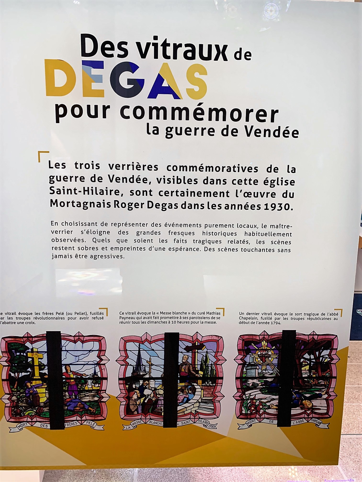 Un bel édifice en forme de Croix Grecque, sans coupole, bâti au début du 20ème siècle, béni en 1904. Construite trop vite, il fallu moins d'un siècle pour que cette église révèle les malfaçons et les erreurs dans le choix des matériaux qui menaçaient son avenir. En 1962, une intervention pour chaîner l'édifice s'avère indispensable. En 2007, elle est fermée pour causes de sécurité, des briques tombent de la voûte. En 2013, l'administration municipale vote à 14 voix contre 10 la décision de sa destruction. Cette destruction est pas encore commencée en 2016, année qui décidera de la survie de l'édifice. Cette année 2016, la décision de la restauration est prise, l'activité cultuelle pourra se dérouler dans le chœur et une partie de la nef, le reste de l'édifice accueillera le Centre d'Interprétation du Vitrail Vendéen. Cette activité culturelle va permettre d'organiser de façon pérenne l'existence de cette église. Les vitraux de l'église Saint-Hilaire traitent des guerres de Vendée, ils sont l'oeuvre de Roger Degas (1899-1981), maître verrier, né à Mortagne-sur-Sèvre, où il possédait aussi son atelier. De belle facture et historiquement remarquables, ces vitraux et le Centre d'interprétation se côtoient dans une belle harmonie.
