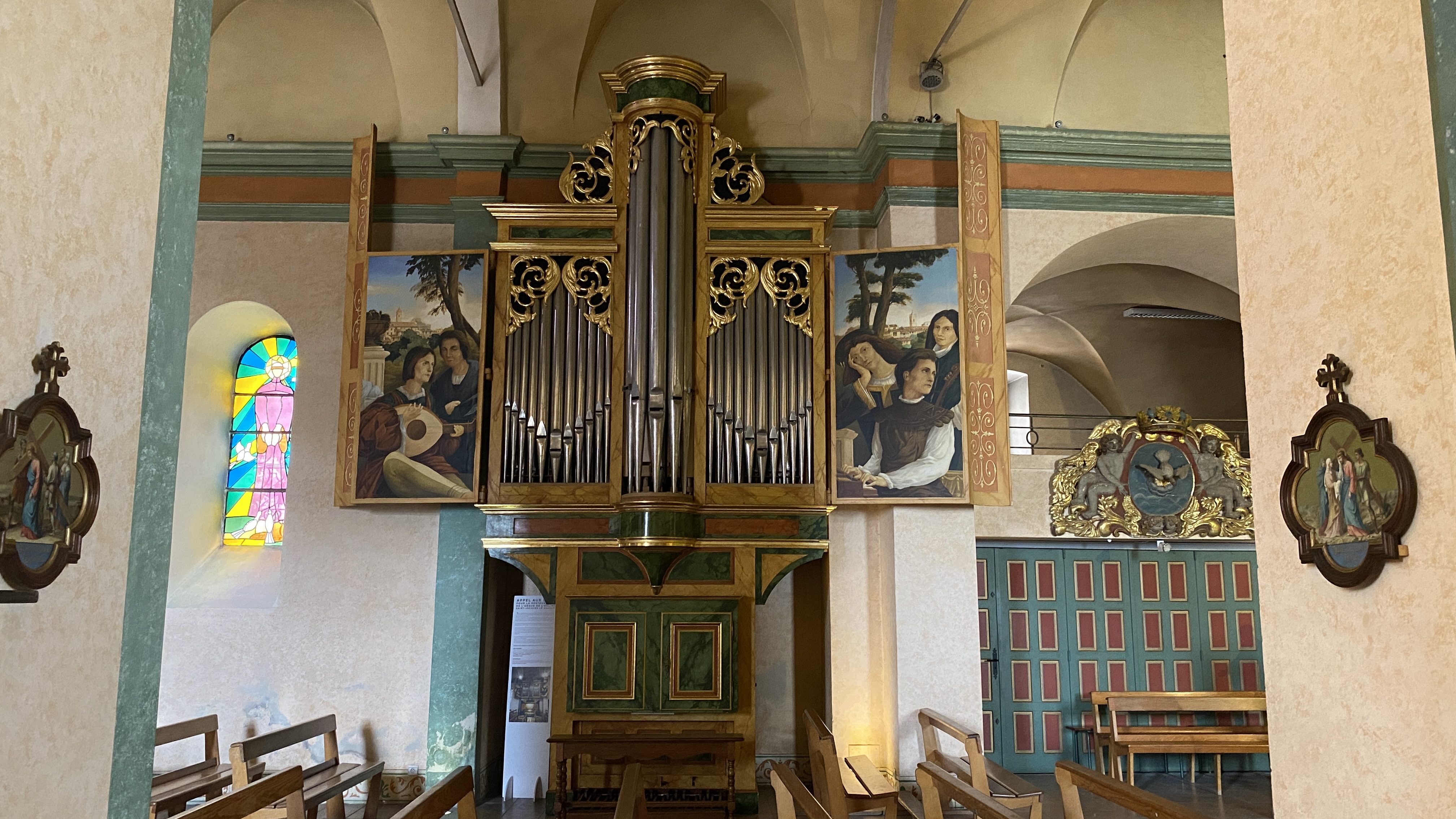 Petite église du centre médiéval de Mougins. Les fresques et l'orgue au mur sont magnifiques