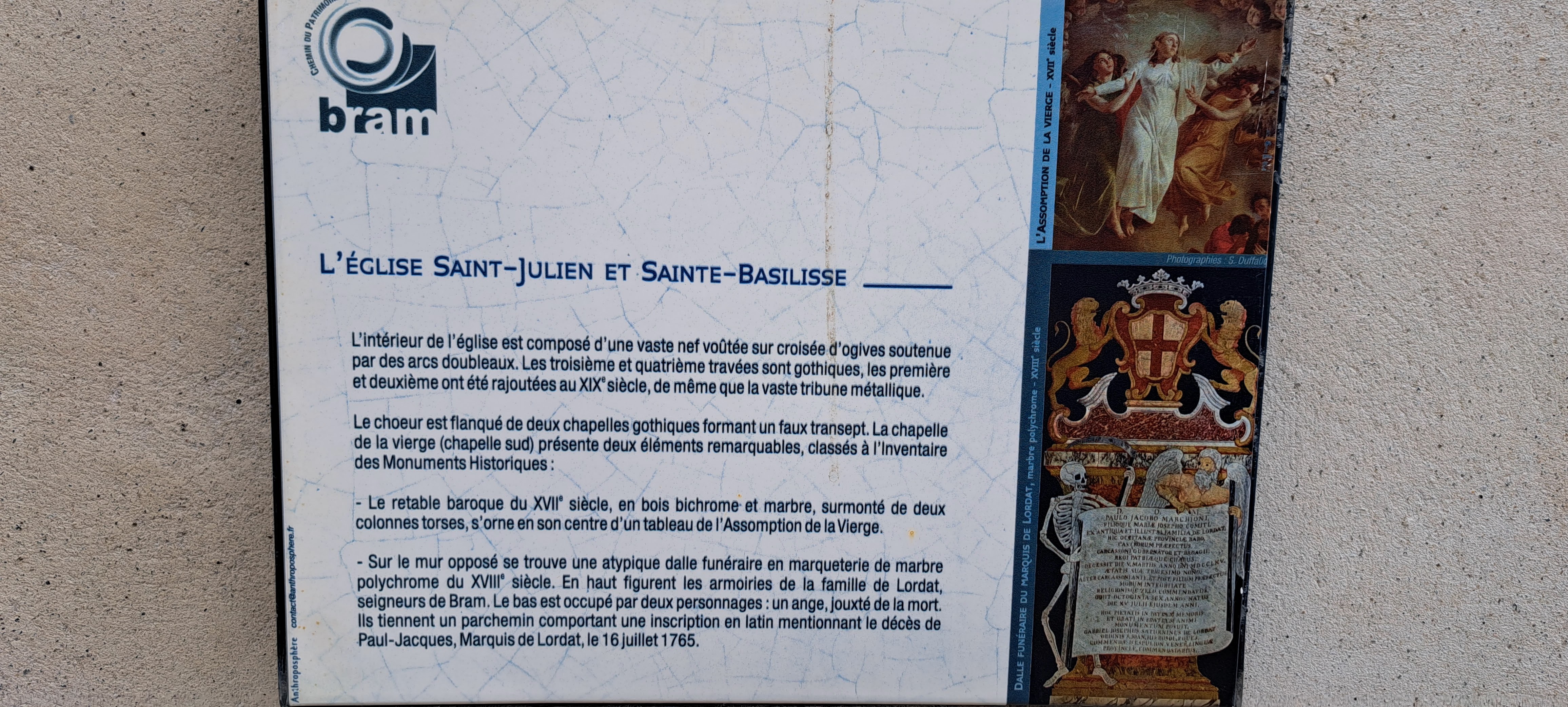 Belle église, à l'épicentre de la circulade de BRAM. Très nombreuses statues. L'église est encore en partie peinte. L'interrupteur de commande de l'éclairage se trouve sur le pilier en face de l'entrée latérale.