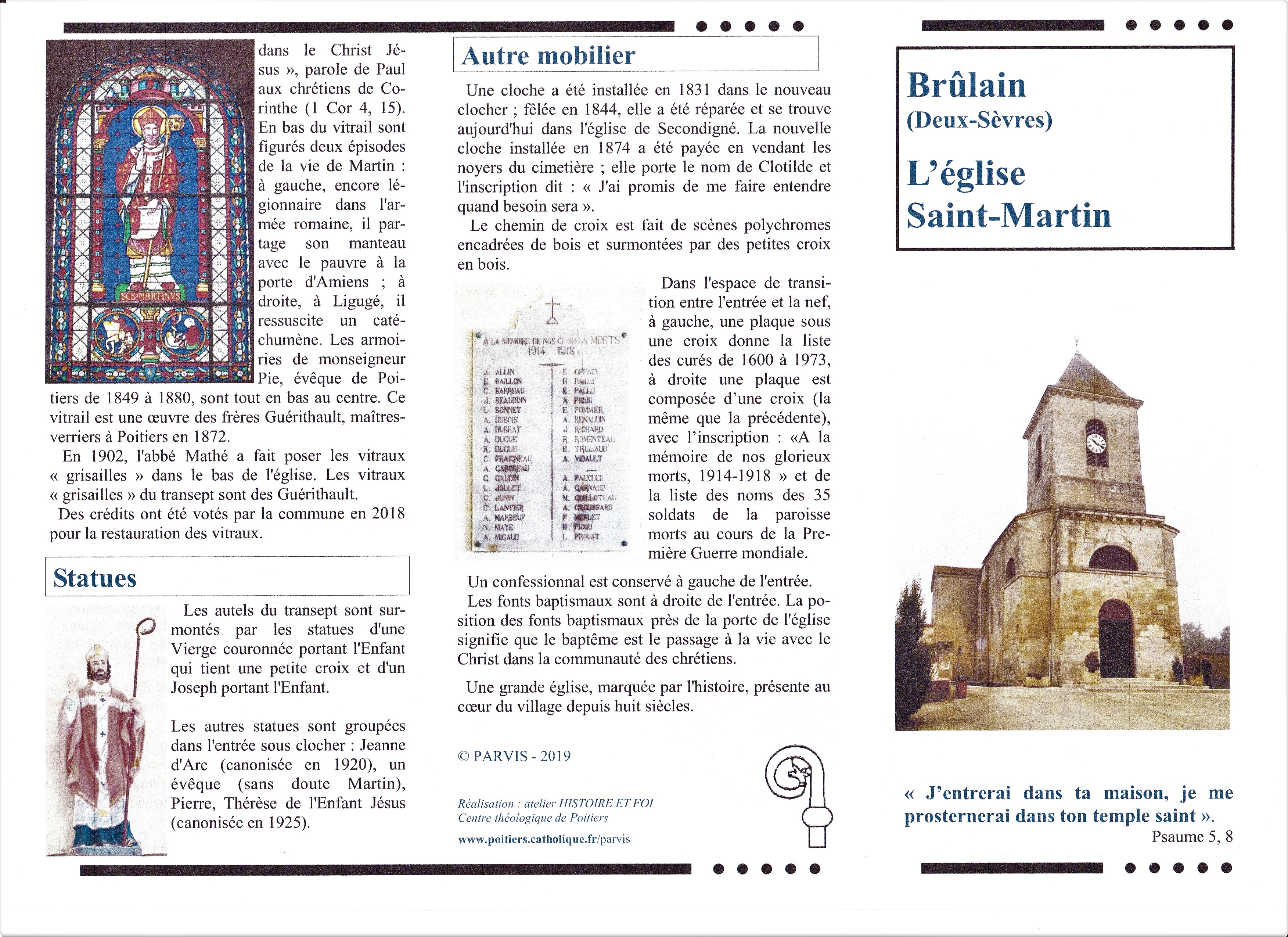Voici toutes les informations sur le Église catholique Eglise St-Martin (de Brûlain) qui ce trouve au , 79230 Brûlain (79). Sur cette fiche vous trouverez les photos, l'adresse, les horaires d'ouverture, le numero de téléphone et les avis clients.Vous pouvez églement rédiger un avis si vous le souhaitez en bas de page.