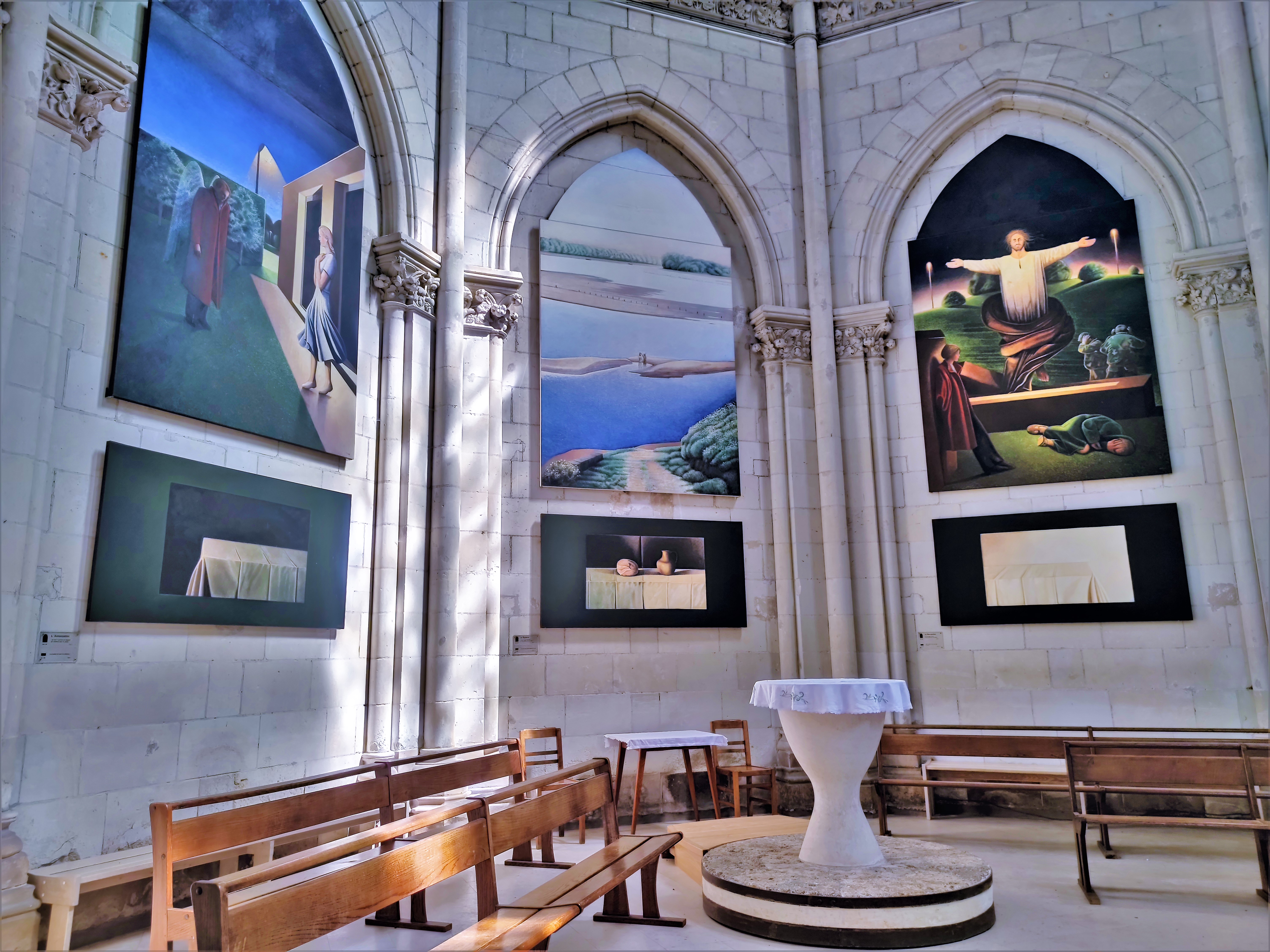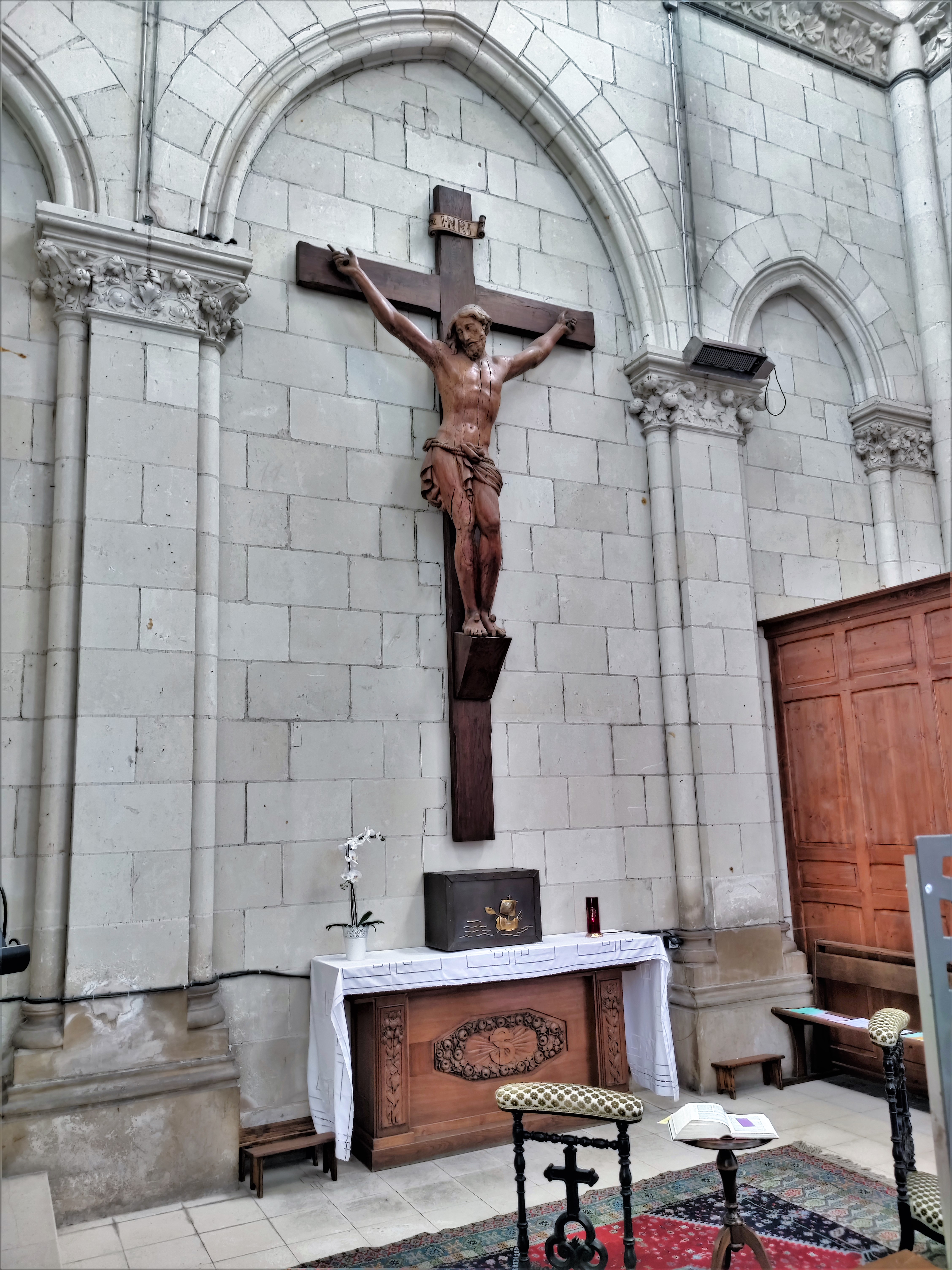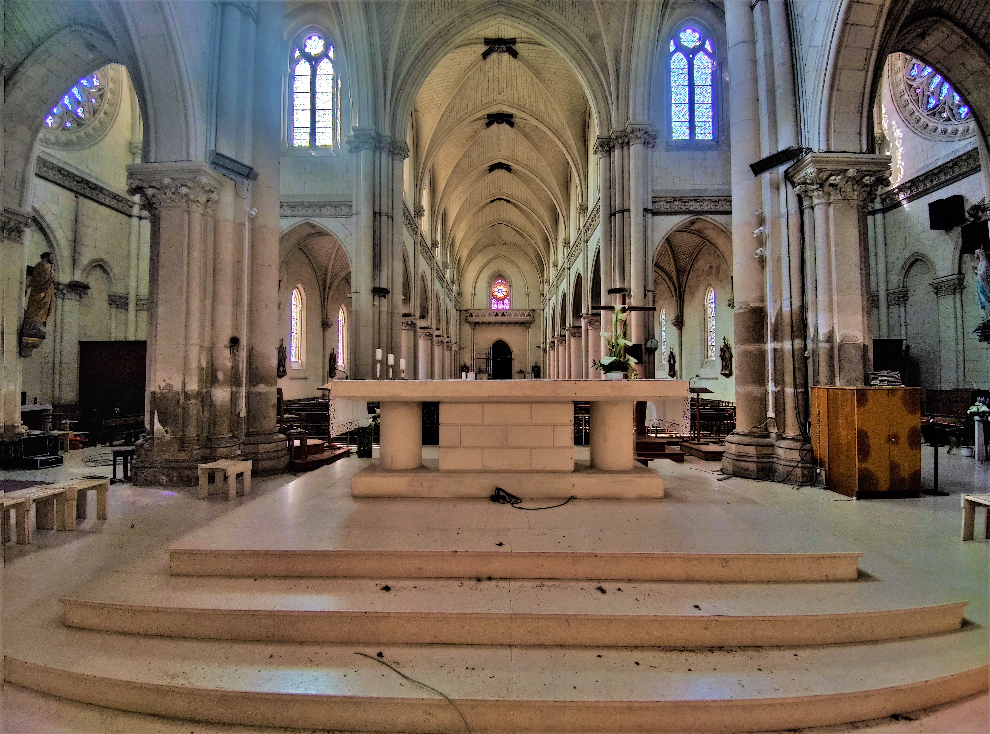 Une église néogothique de 1868, la façade est impressionnante, l'église est vaste et lumineuse, mais je l'ai trouvé froide et peu accueillante. Je n'ai pas trouvé cette église propre à rassembler, pas plus qu'à favoriser une démarche d'intériorité, quelle que soit sa position sur l'échelle des croyances. Le polyptyque de Bernard Bouin, œuvre d'art expression de la Foi, ce qui est commun dans les églises catholiques, offre à voir la belle réalisation d'un enfant du pays. Mais il m'est apparu dérangeant tant il semble transformer cette église en salle de cinéma. C'est mon opinion toute personnelle.