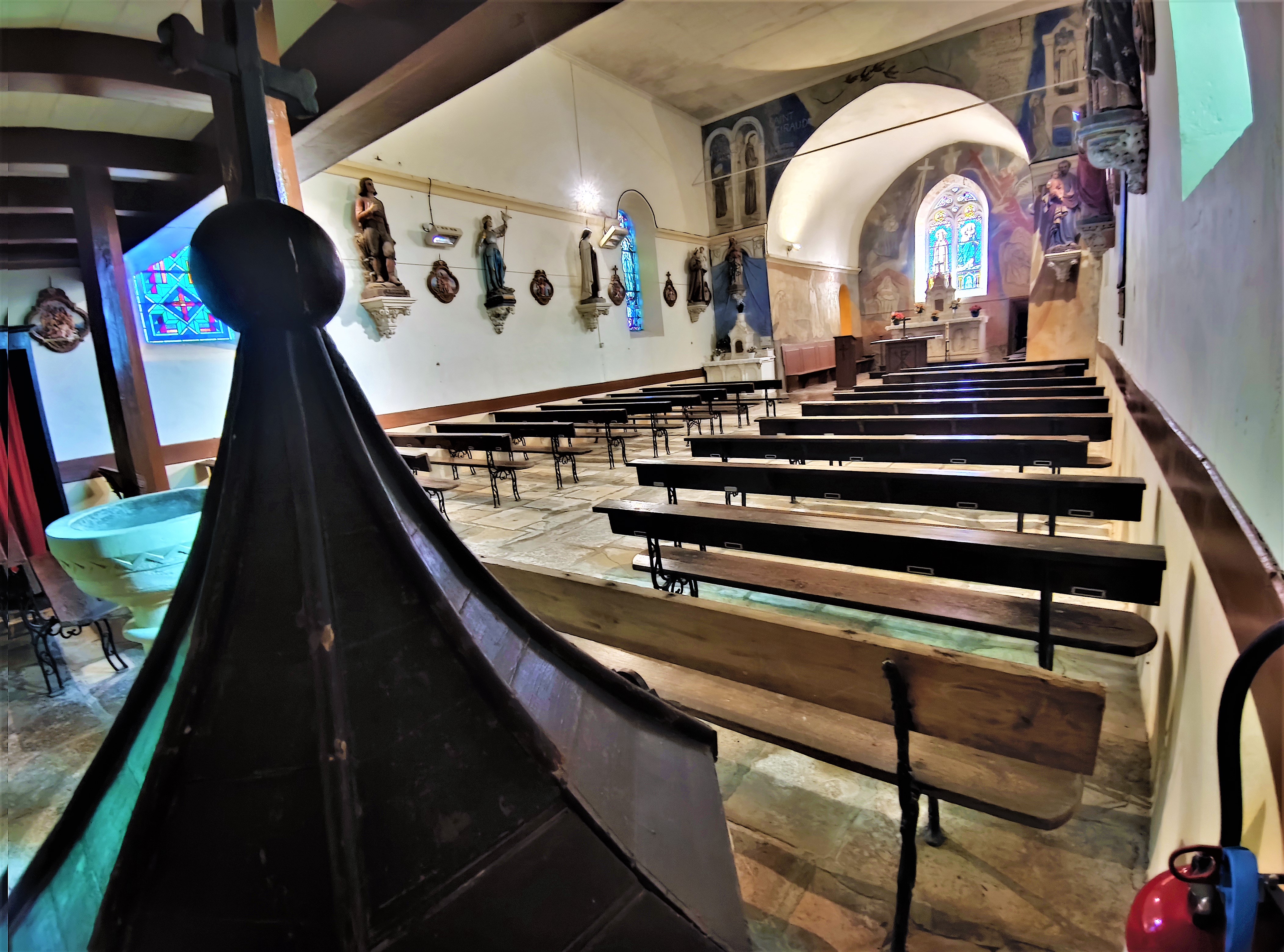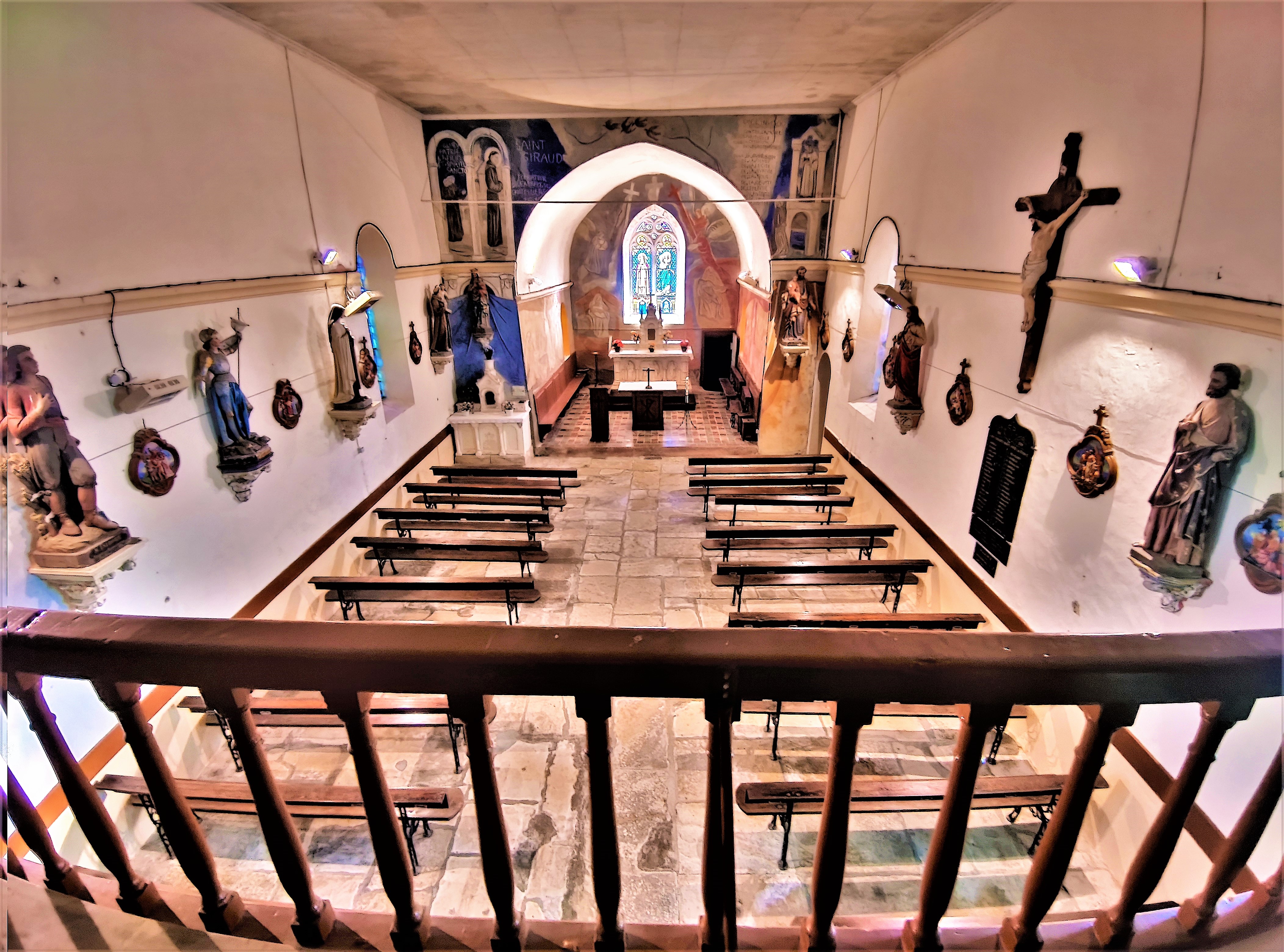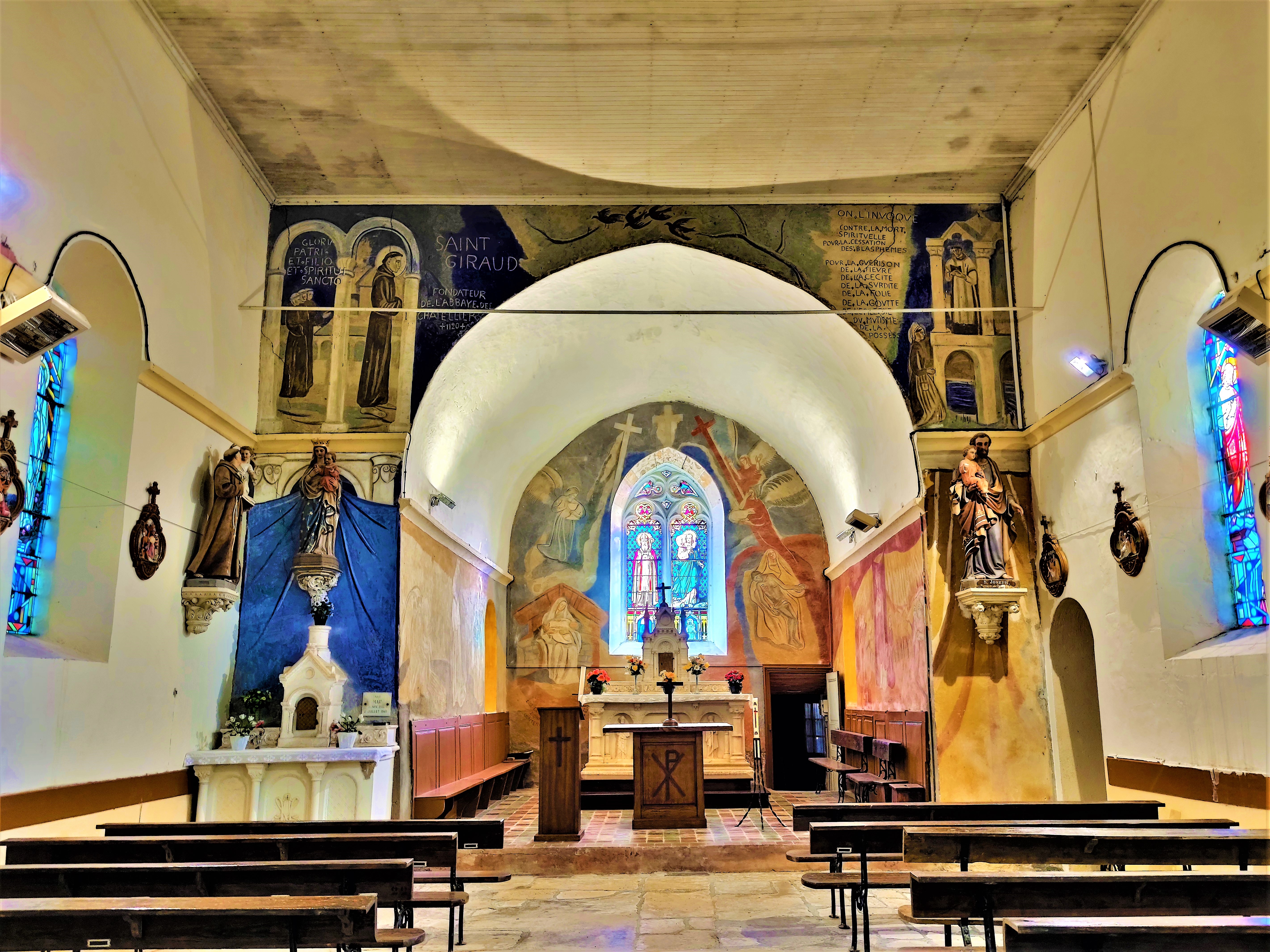 Le charme de cette église, a agit sur moi immédiatement. Le balet est une invitation à se mettre à l'abri des intempéries, la belle allure de cette église témoigne de l'attachement de la population à son patrimoine. L'église primitive était romane, elle a été souvent modifiée. La voûte, aujourd'hui disparue, fut, entre autres, relevée plusieurs fois. Pour la visiter, il faut aller jusqu'à la mairie de Les Châteliers située à 4kms, pour emprunter les clés. C'est une église accueillante, Vitraux et fresques apportent de joyeuses contributions colorées et lumineuses, à l'intérieur, l'ambiance est chaleureuse. Au 20ème siècle, des vitraux furent posés, créations de l'atelier Gouffault, maître-verrier à Orléans, aujourd'hui définitivement fermé. En 1941, Marie Baranger, peintre fresquiste à la carrière internationale (1902-2003) accompagnée du maçon, Mr Marsteau décora le chœur.
