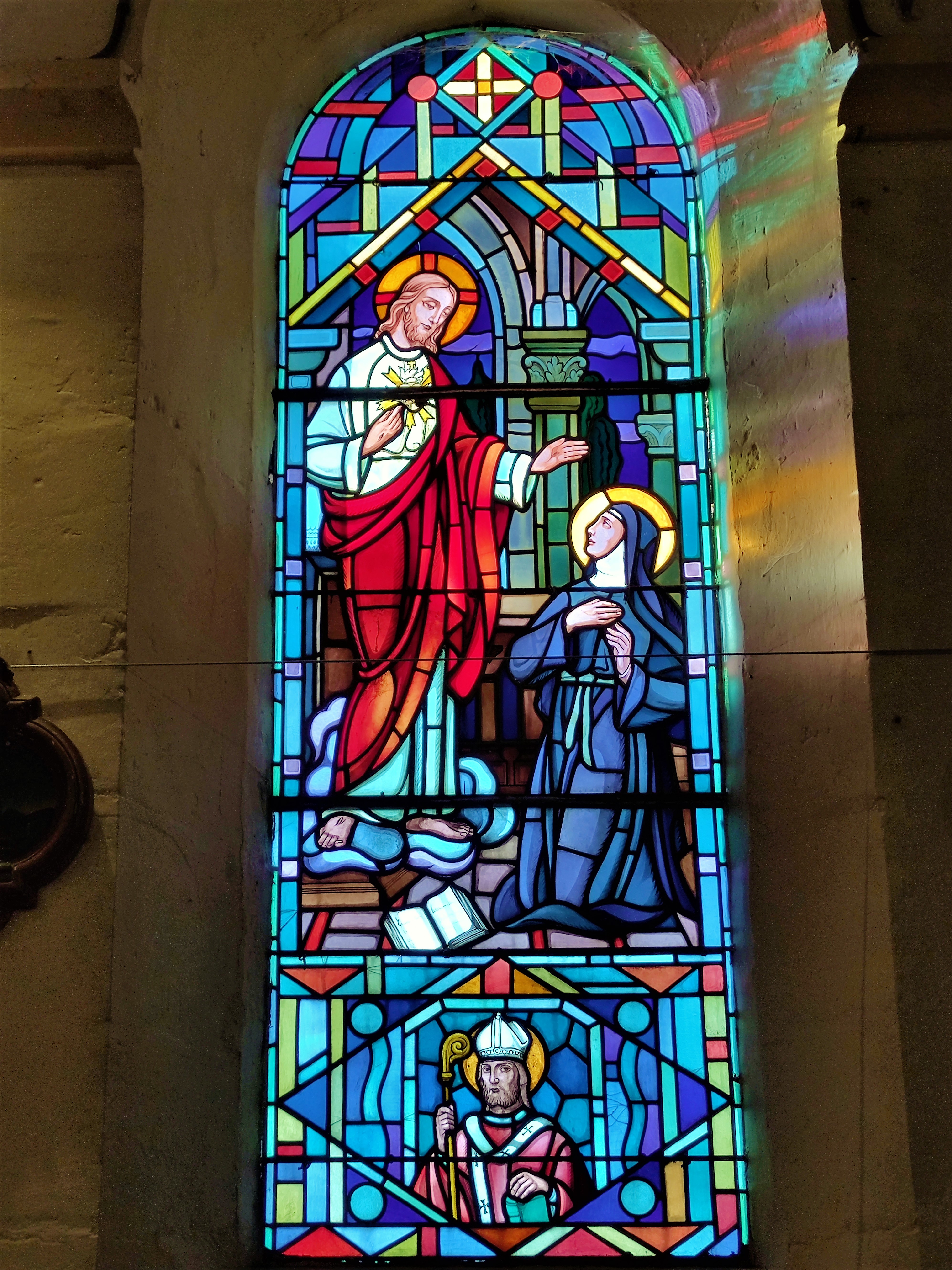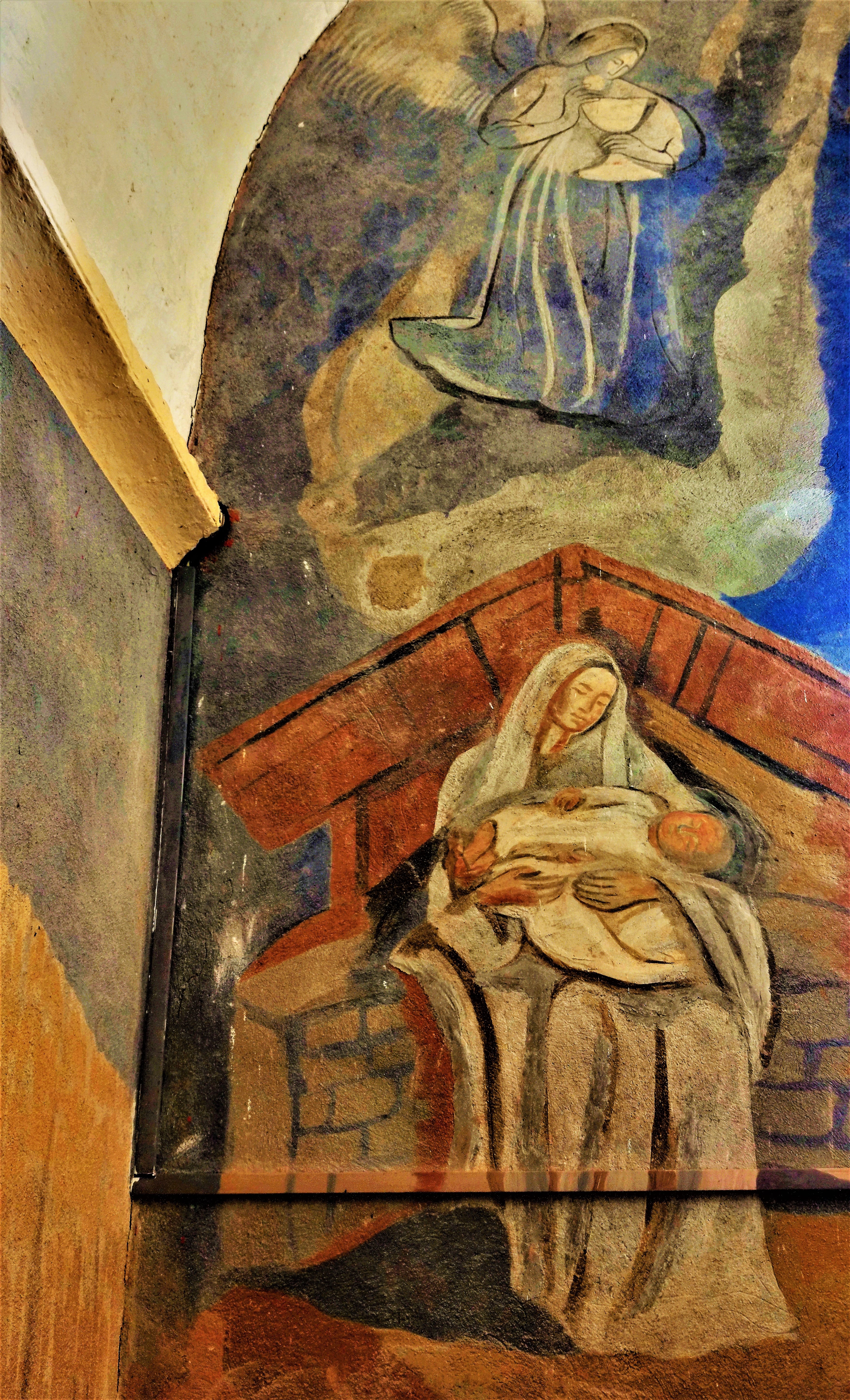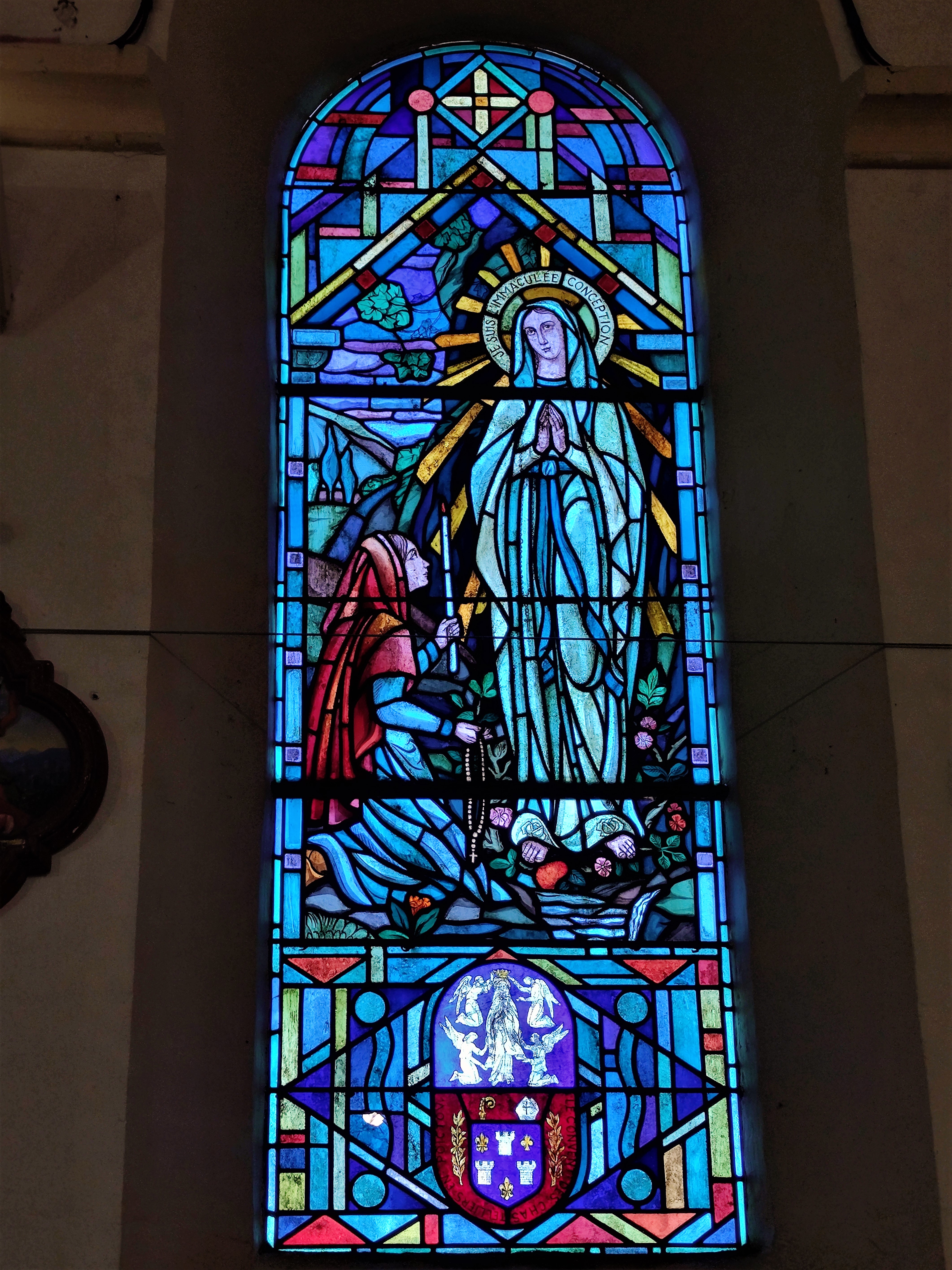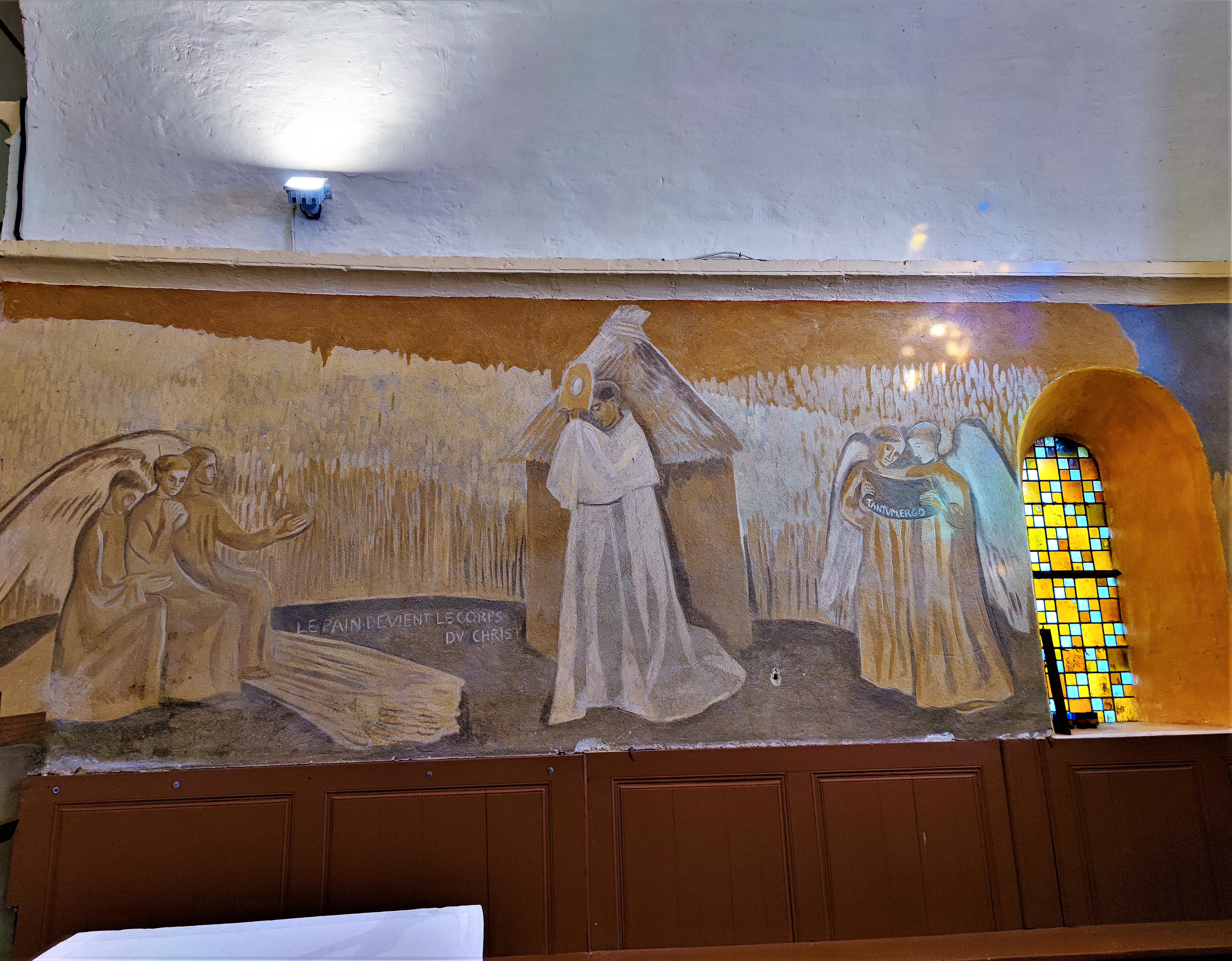 Le charme de cette église, a agit sur moi immédiatement. Le balet est une invitation à se mettre à l'abri des intempéries, la belle allure de cette église témoigne de l'attachement de la population à son patrimoine. L'église primitive était romane, elle a été souvent modifiée. La voûte, aujourd'hui disparue, fut, entre autres, relevée plusieurs fois. Pour la visiter, il faut aller jusqu'à la mairie de Les Châteliers située à 4kms, pour emprunter les clés. C'est une église accueillante, Vitraux et fresques apportent de joyeuses contributions colorées et lumineuses, à l'intérieur, l'ambiance est chaleureuse. Au 20ème siècle, des vitraux furent posés, créations de l'atelier Gouffault, maître-verrier à Orléans, aujourd'hui définitivement fermé. En 1941, Marie Baranger, peintre fresquiste à la carrière internationale (1902-2003) accompagnée du maçon, Mr Marsteau décora le chœur.