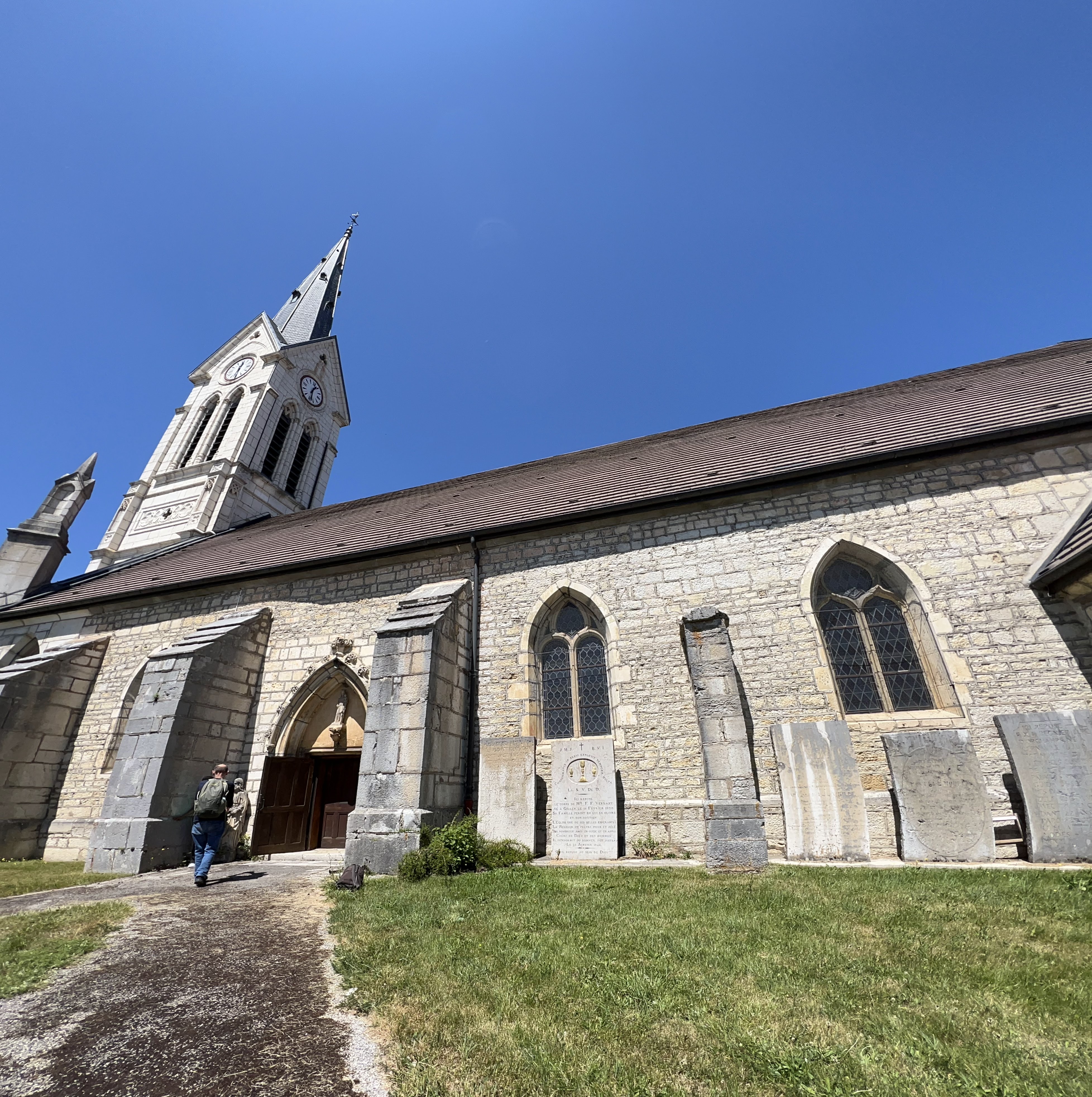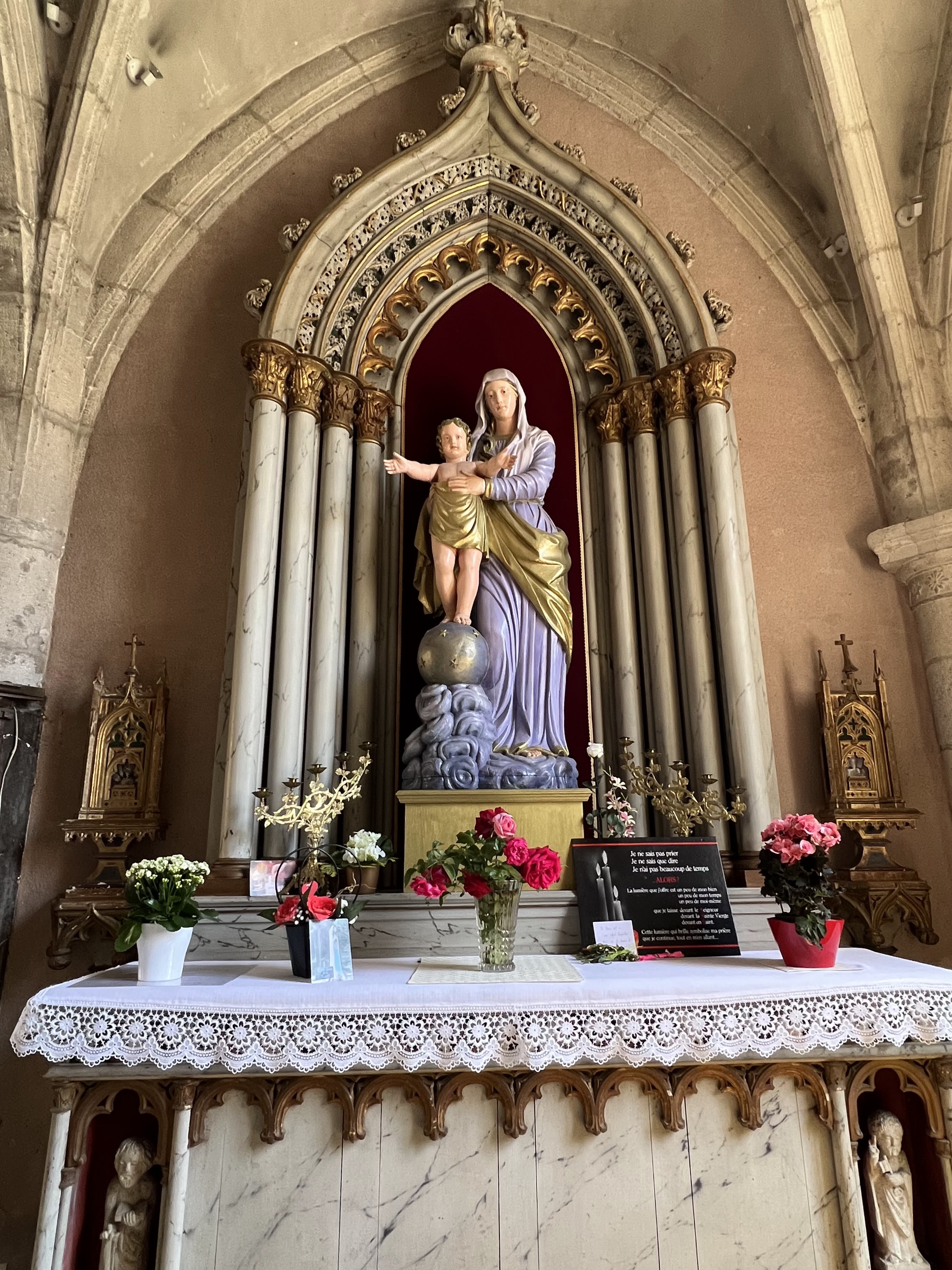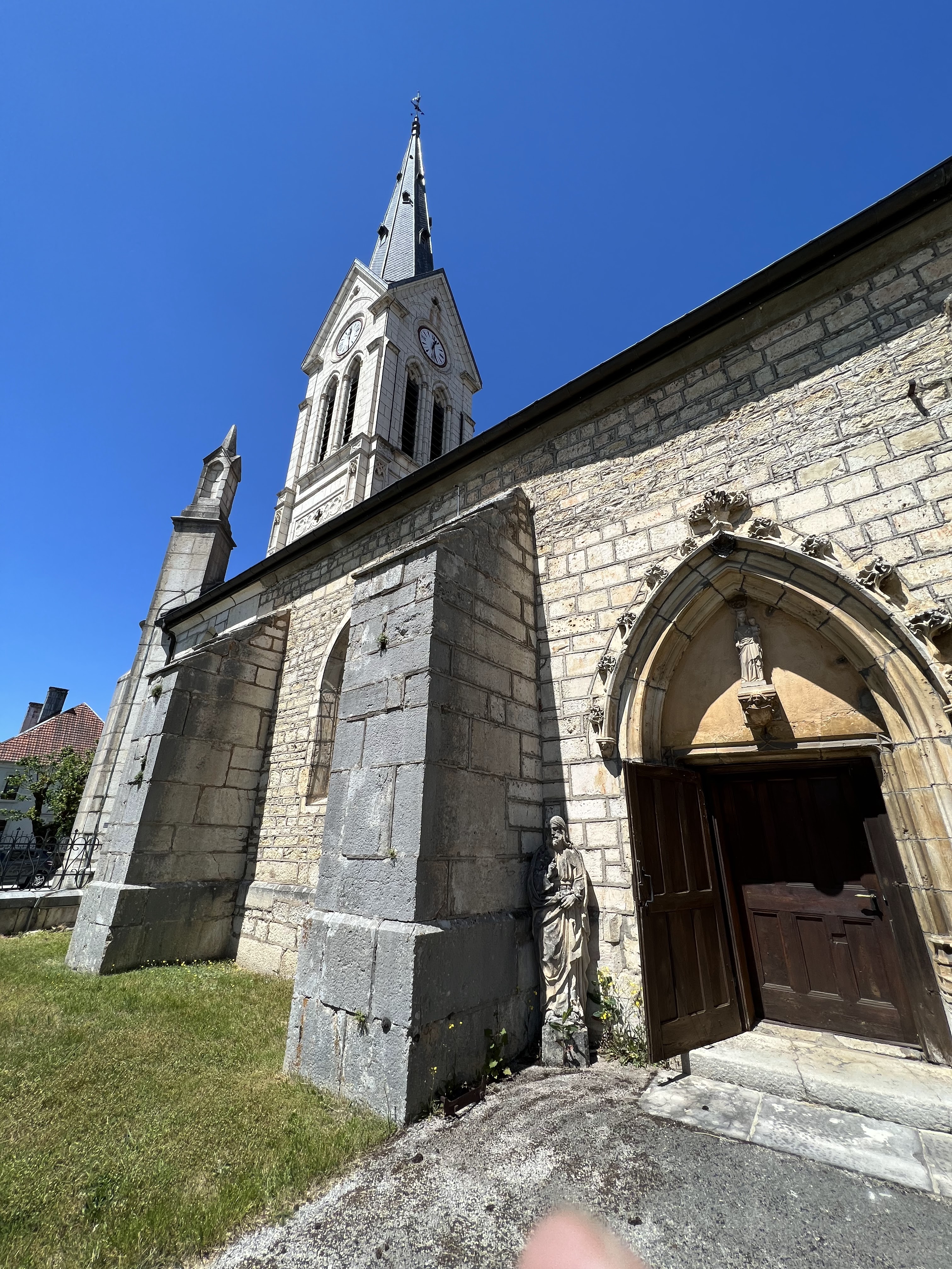 Petite église où l'on retrouve 14 chemins de croix de Gabriel Saury. Beaucoup de messages derrière son histoire. Pour le groupe qui souhaite en savoir plus sur cette station de Croix, vous pouvez demander à un homme qui connaît l'histoire derrière ces magnifiques sculptures.