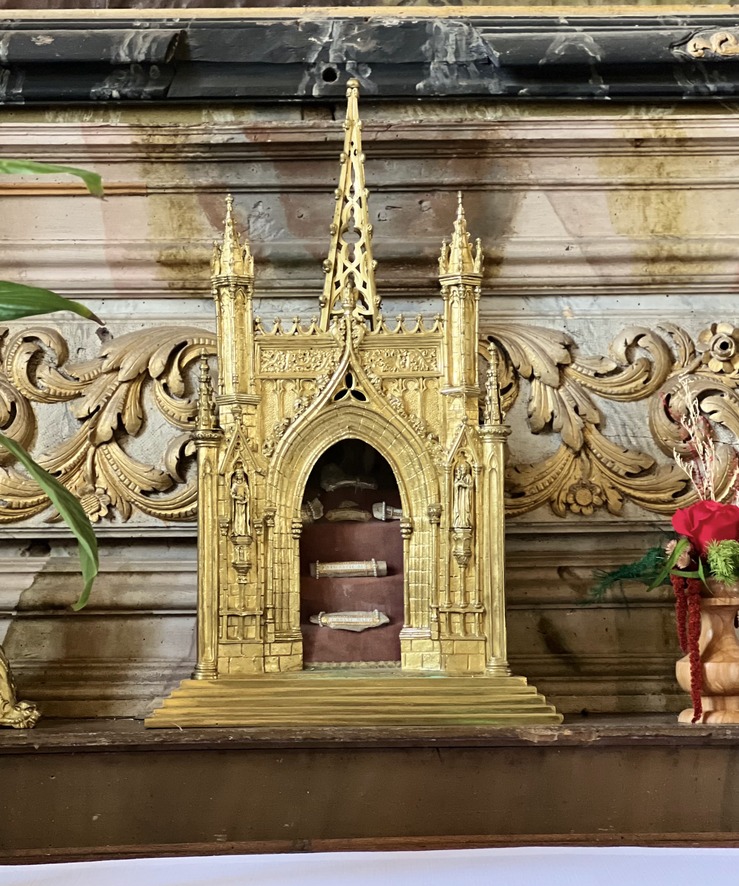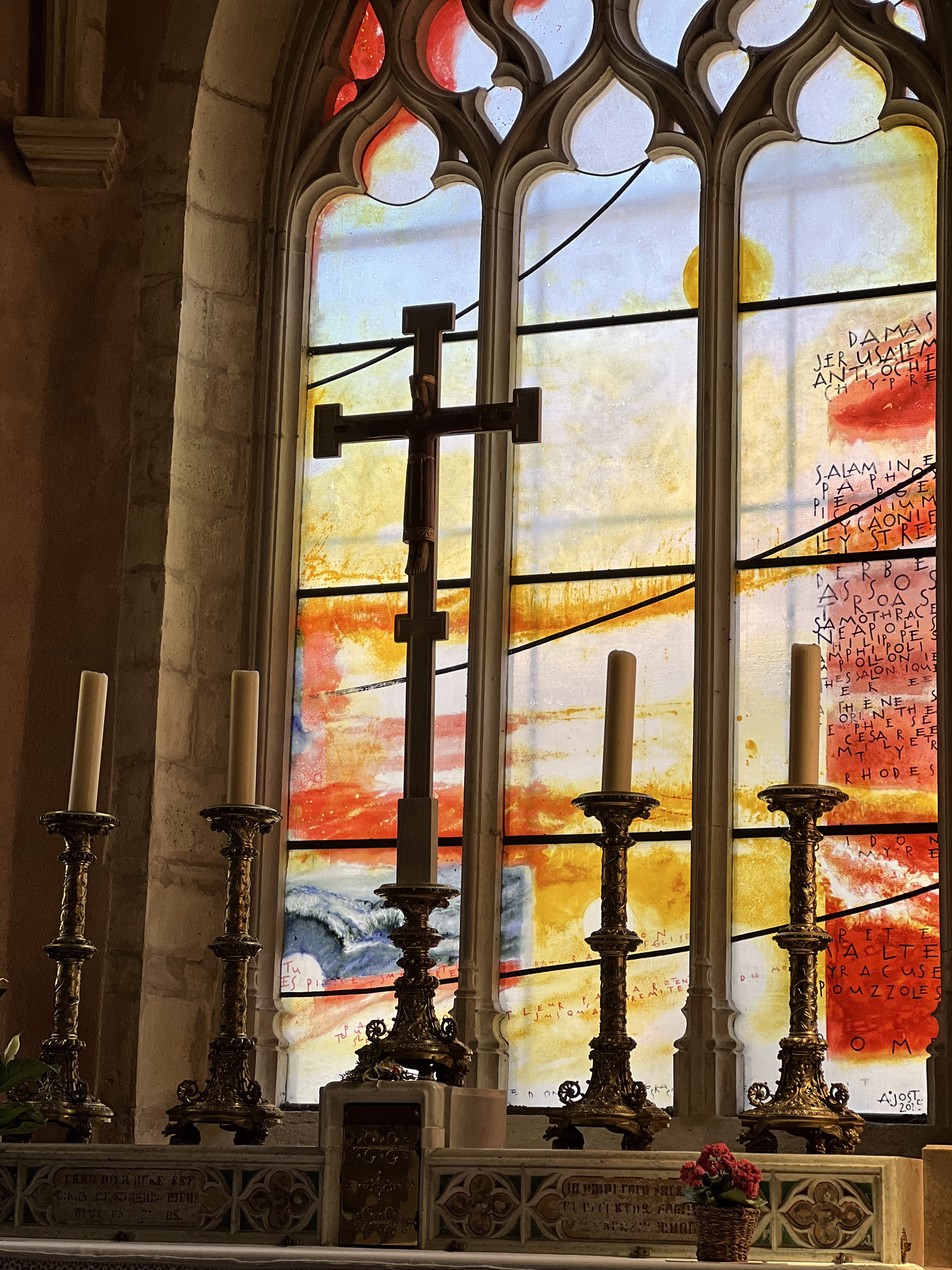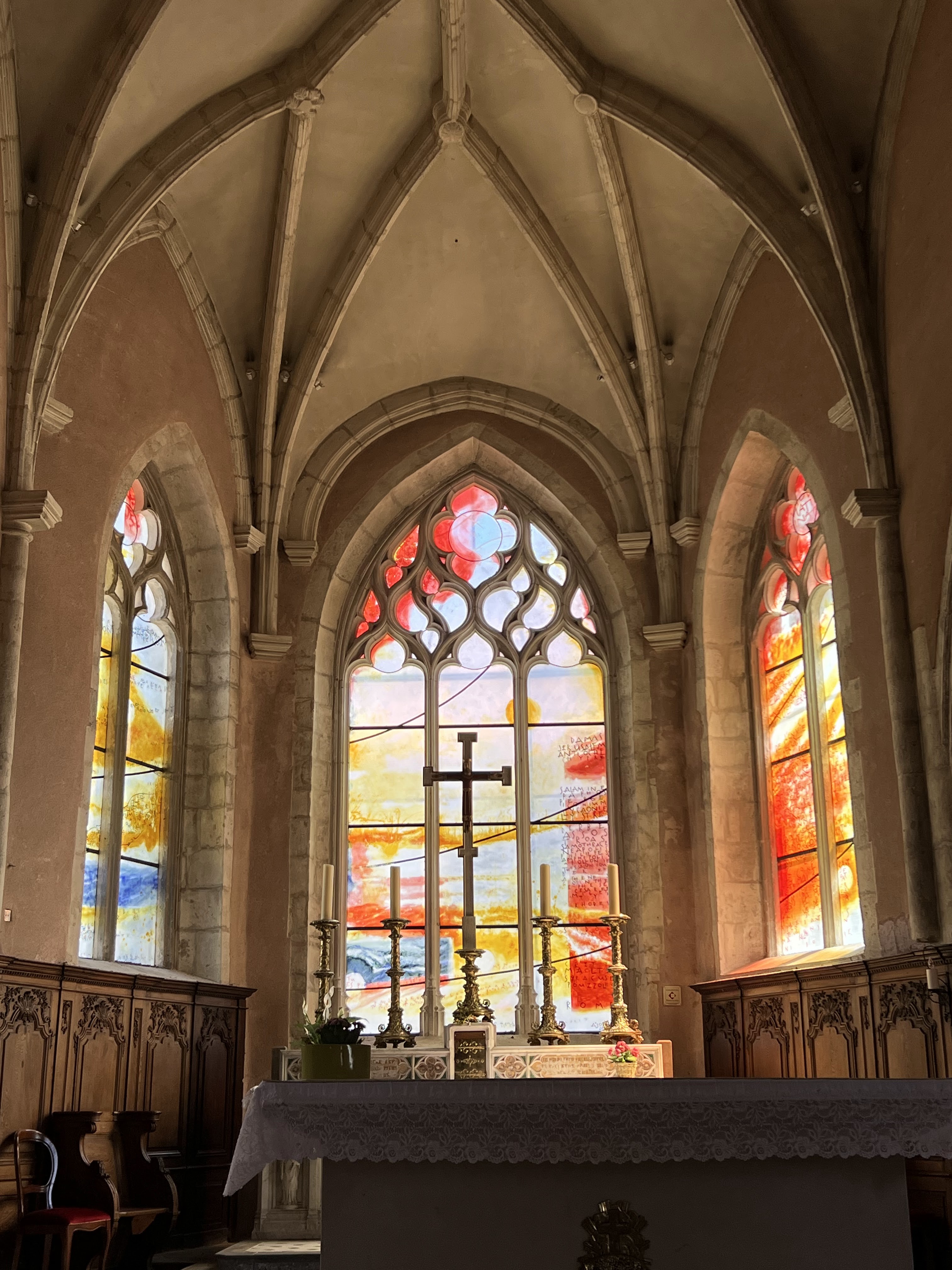Petite église où l'on retrouve 14 chemins de croix de Gabriel Saury. Beaucoup de messages derrière son histoire. Pour le groupe qui souhaite en savoir plus sur cette station de Croix, vous pouvez demander à un homme qui connaît l'histoire derrière ces magnifiques sculptures.