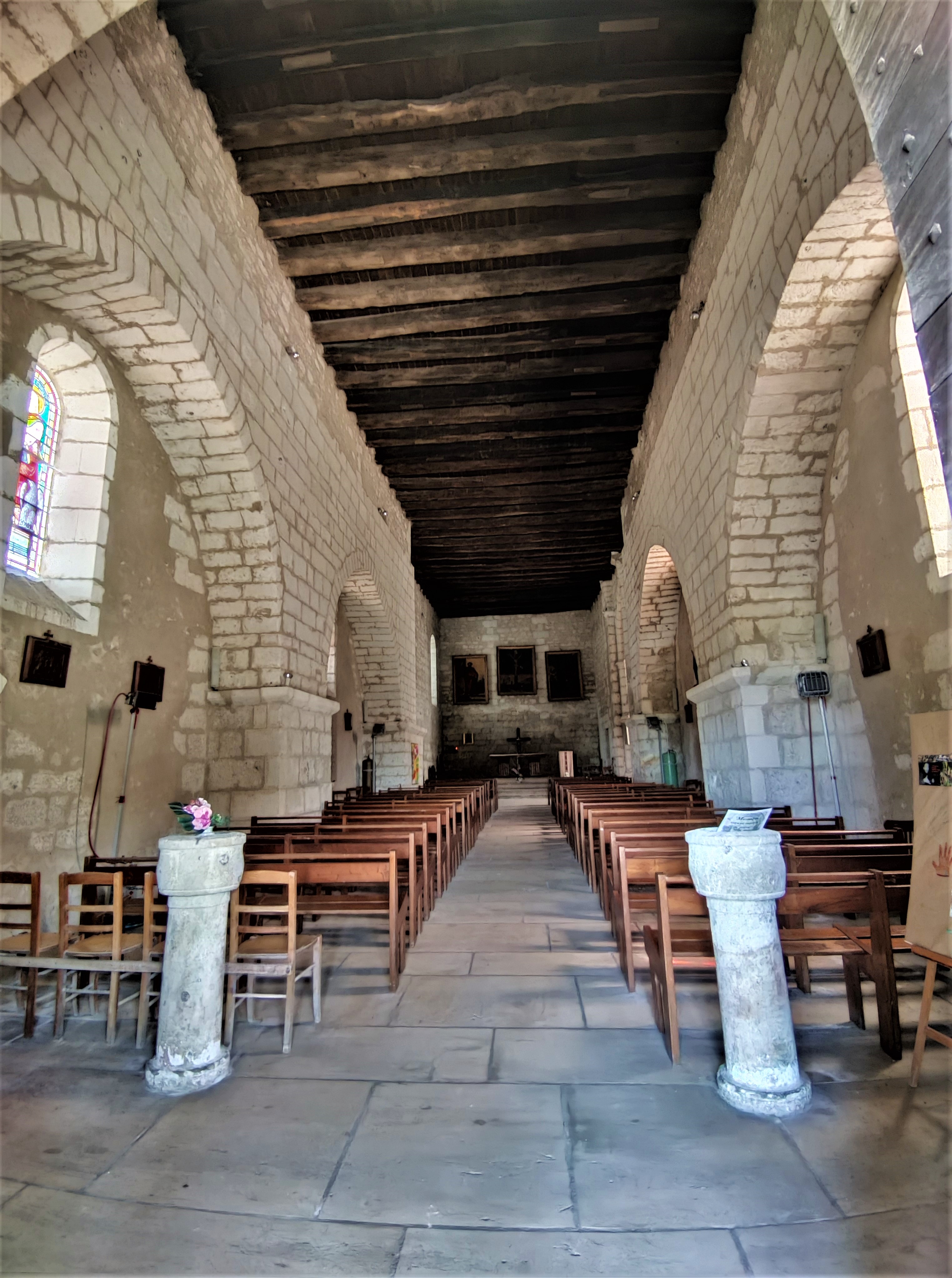 Ouverte et accueillante, cette église mérite une visite si l'on passe à proximité. Toute en longueur, elle occupe le centre de la place ou se situe aussi l'ancien château de 1830 qui abrite aujourd'hui la mairie et la poste. Ce patrimoine bâti confère une belle allure à ce cœur de cité. On entre dans l'église à l'Ouest. Il faut gravir une dizaines de marches pour accéder au portail abrité par un auvent, ballet ou caquetoir, abri qui invite à la rencontre et à l'échange. Le clocher est accolé au Sud du chœur. De solides arcatures contrefortent les murs gouttereaux des deux travées de la nef du 12ème. Cette dernière est plafonnée d'un plancher avec poutres apparentes qui se prolonge dans le chœur jusqu'au chevet. Pas d'arc triomphal pour entrer dans le chœur, reconstruit au 15ème. Il possède deux travées sans arcature et un chevet plat. La 1ère travée s'ouvre sur la partie basse du clocher qui abrite une chapelle voûtée d'ogives. Ouverte et accueillante, bien entretenue et bien tenue, cette église qui a dû s'adapter au cours des siècles, possède le charme des églises de villages. Une visite à faire si l'on passe à proximité.