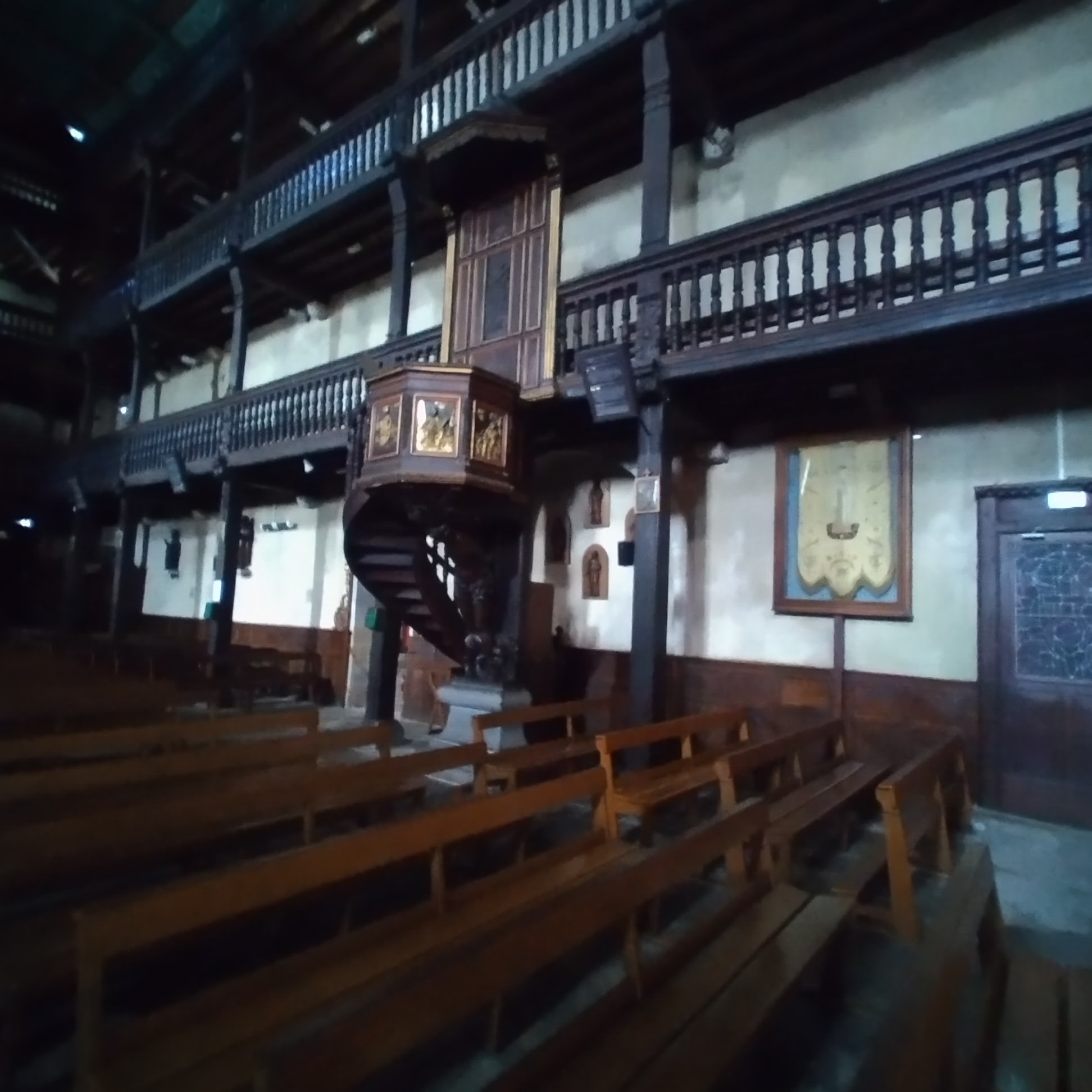Belle église avec un extérieur et un intérieur fortifiés avec balcons en bois