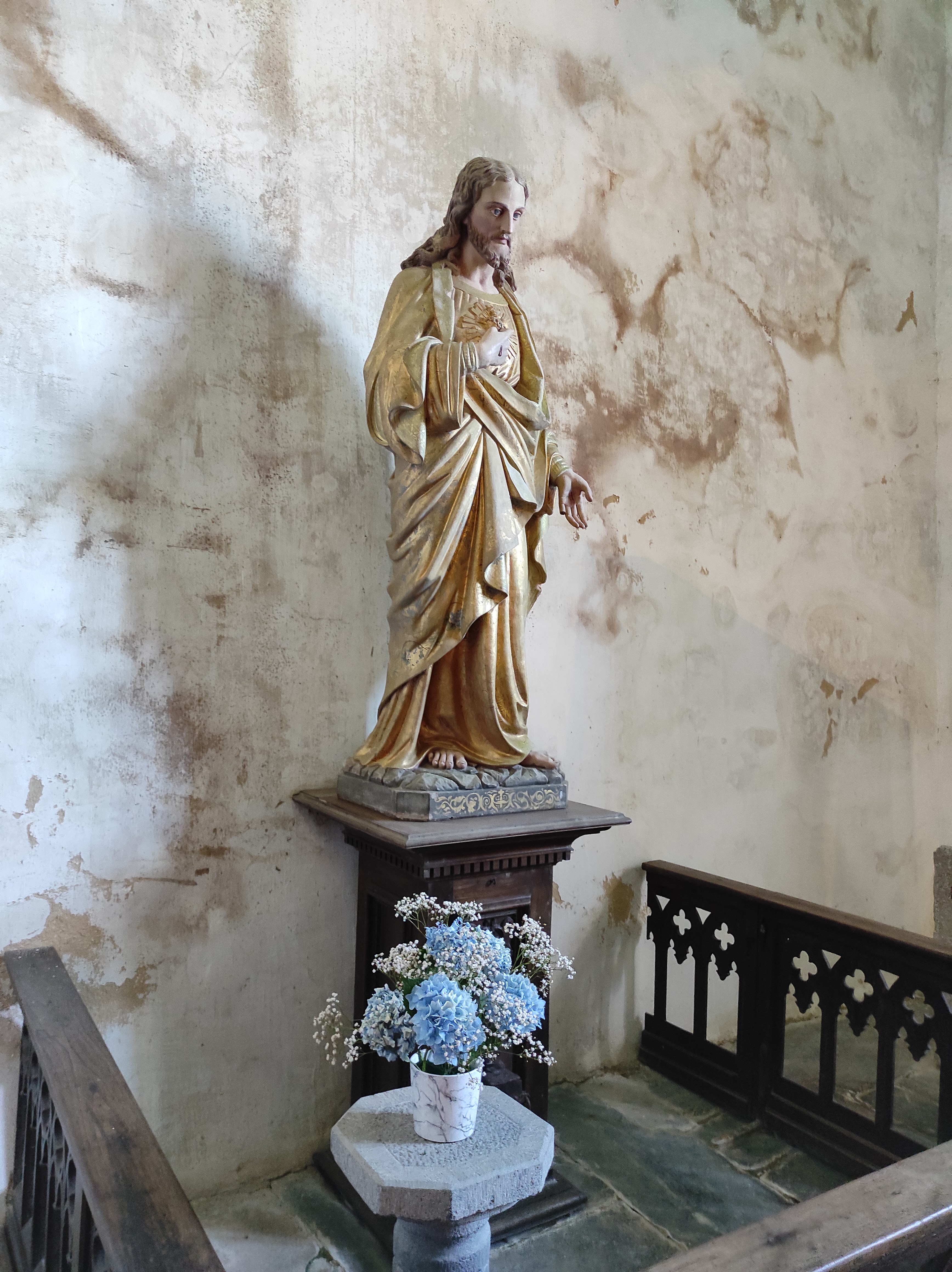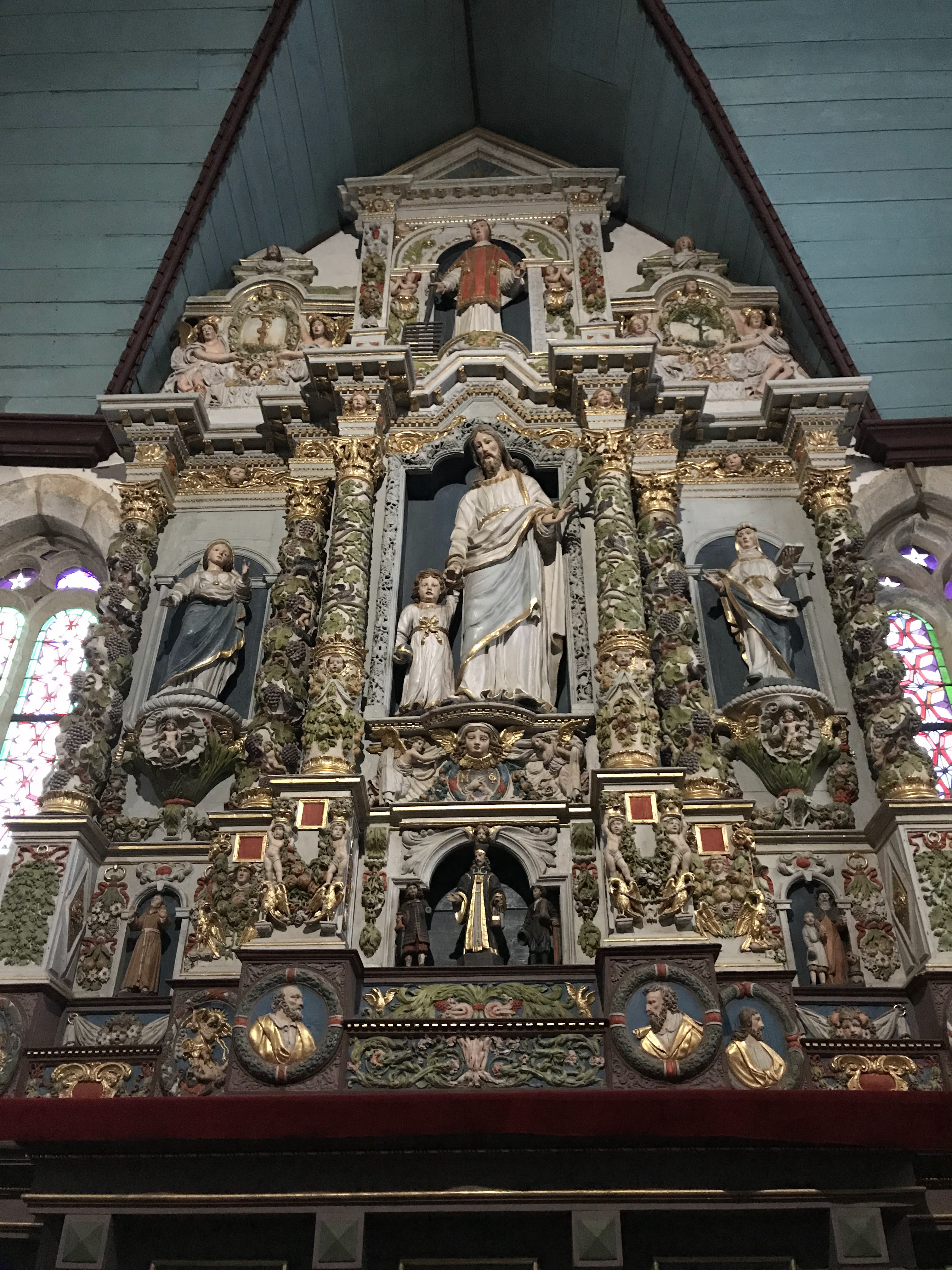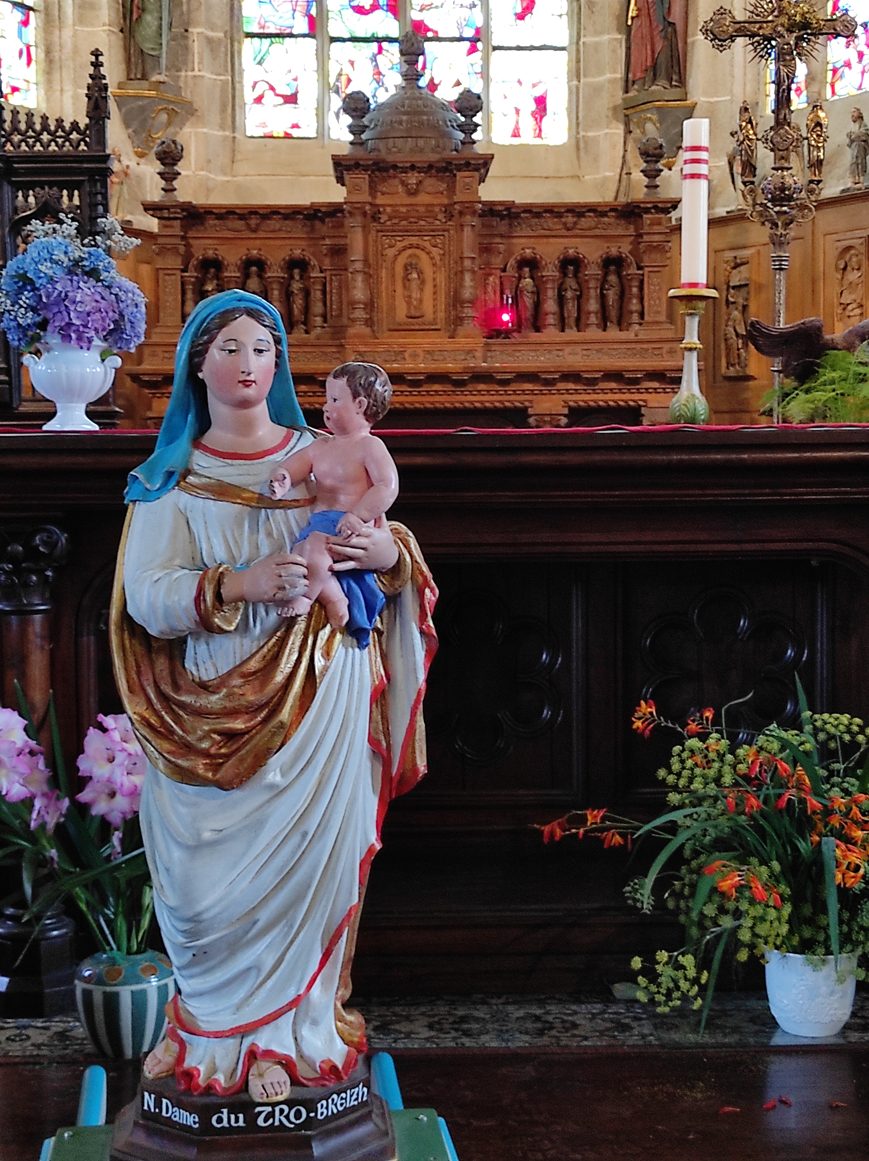 Superbe enclos paroissial. Très jolie statuaire naïve et intérieur d'église en coque de bateau retourné.