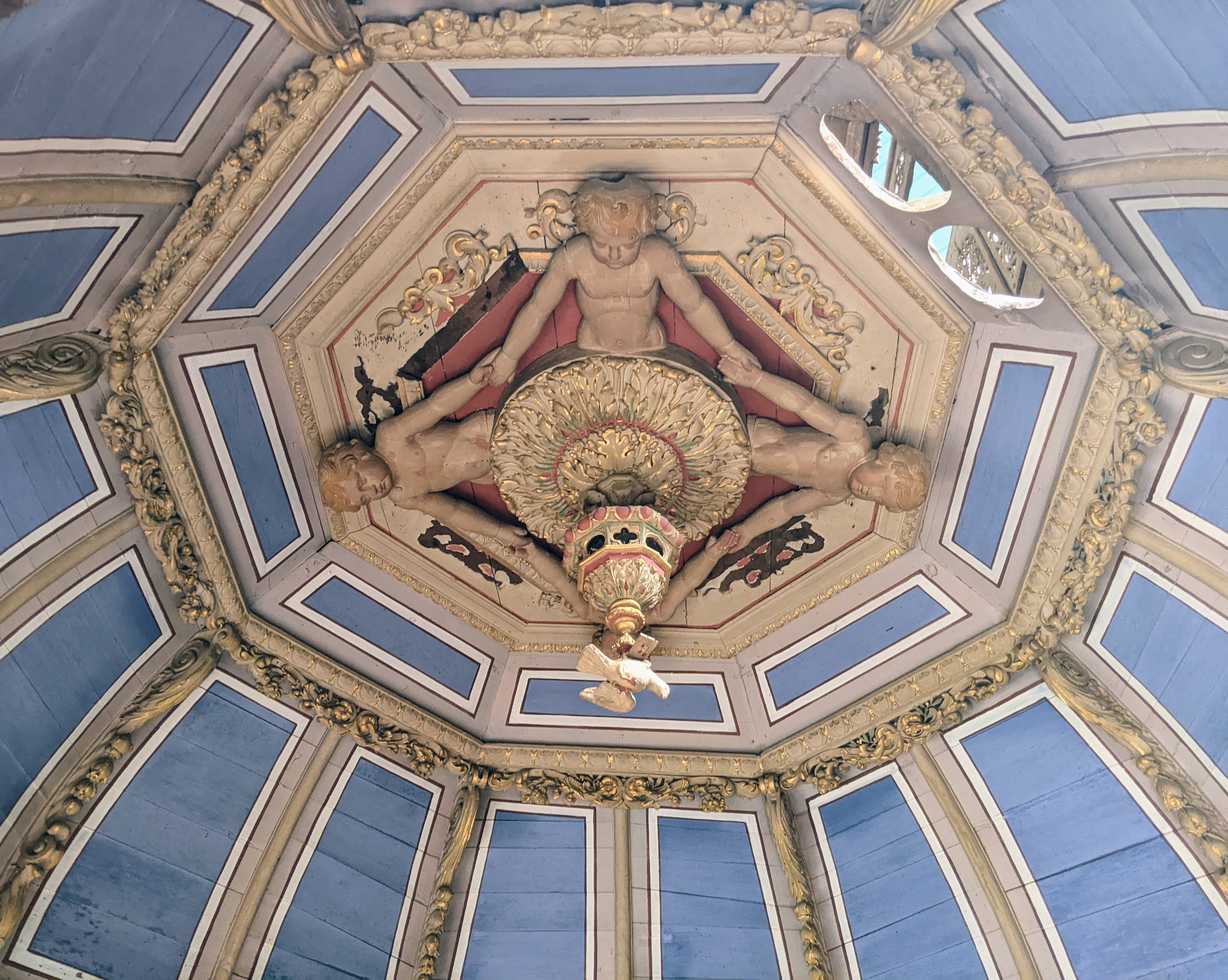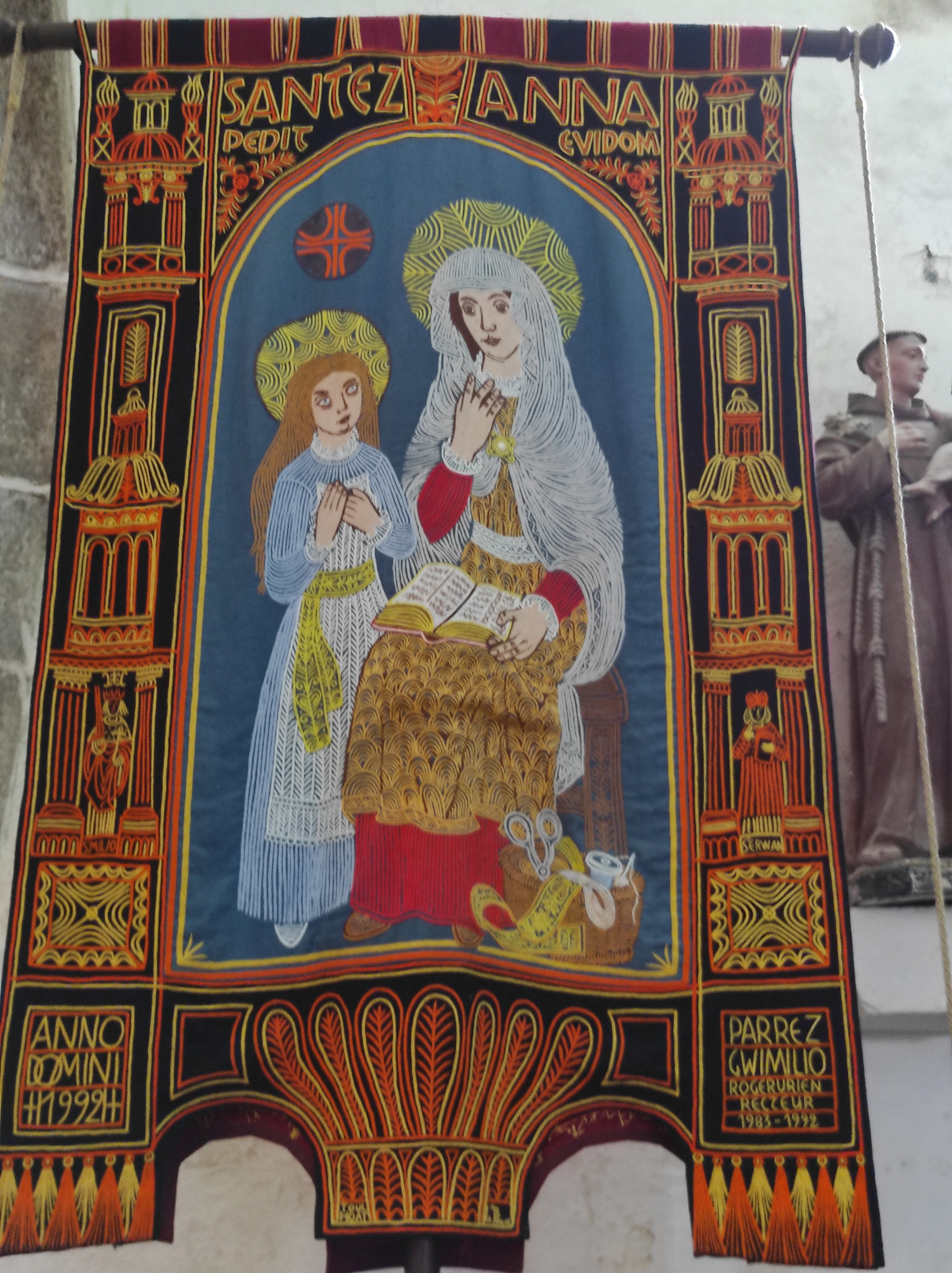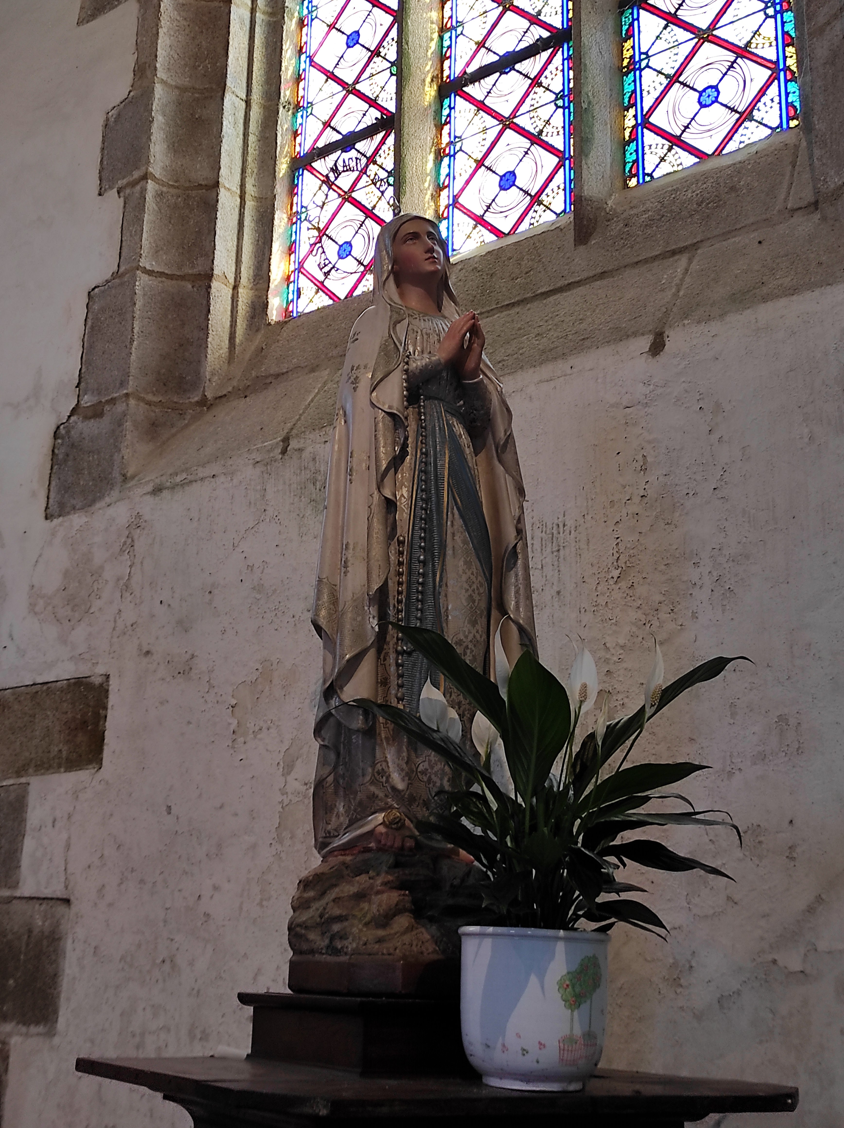 Superbe enclos paroissial. Très jolie statuaire naïve et intérieur d'église en coque de bateau retourné.