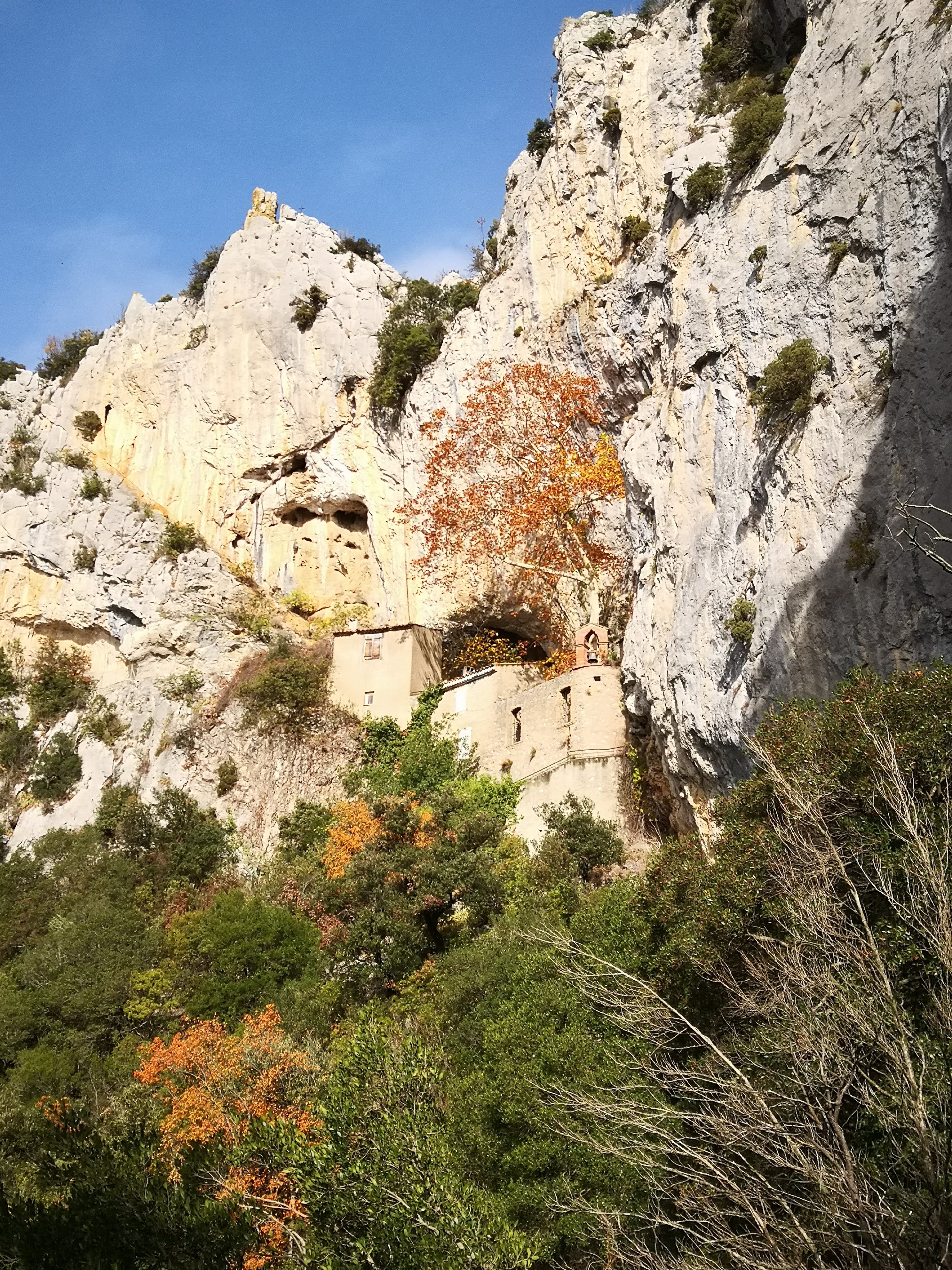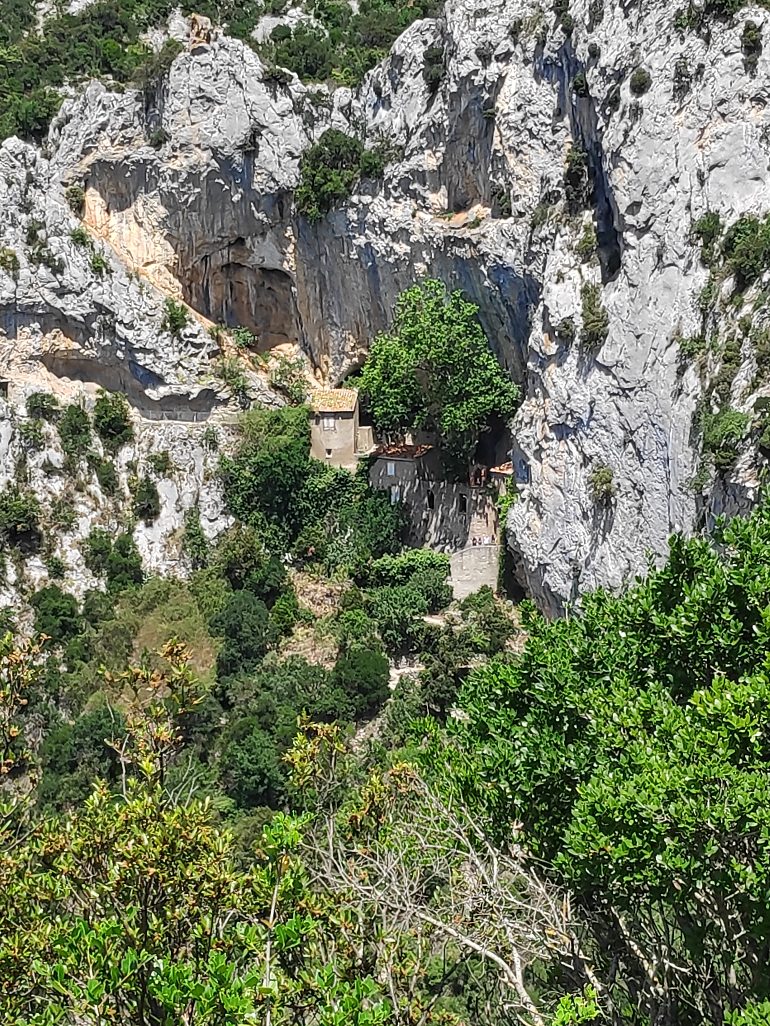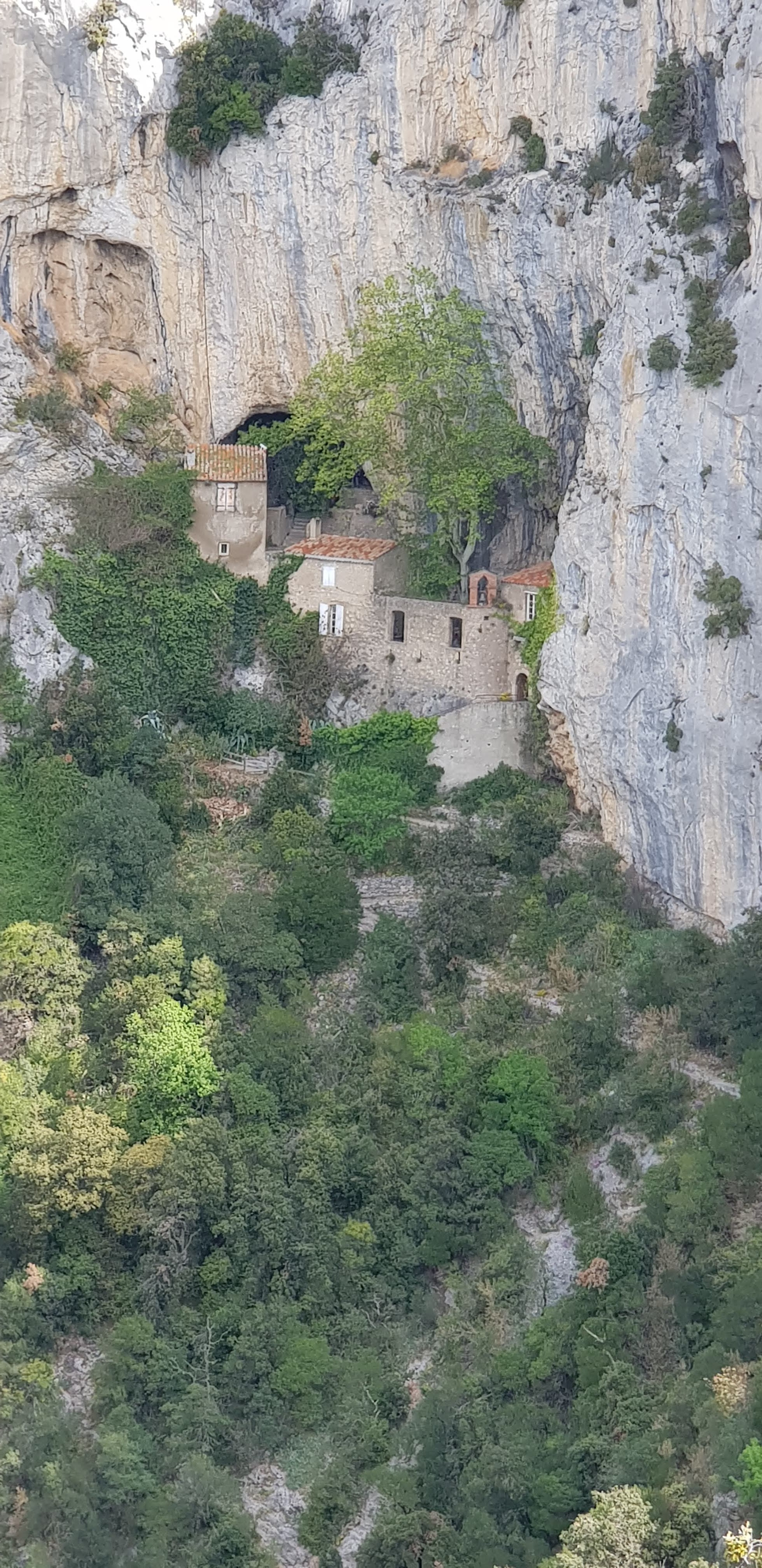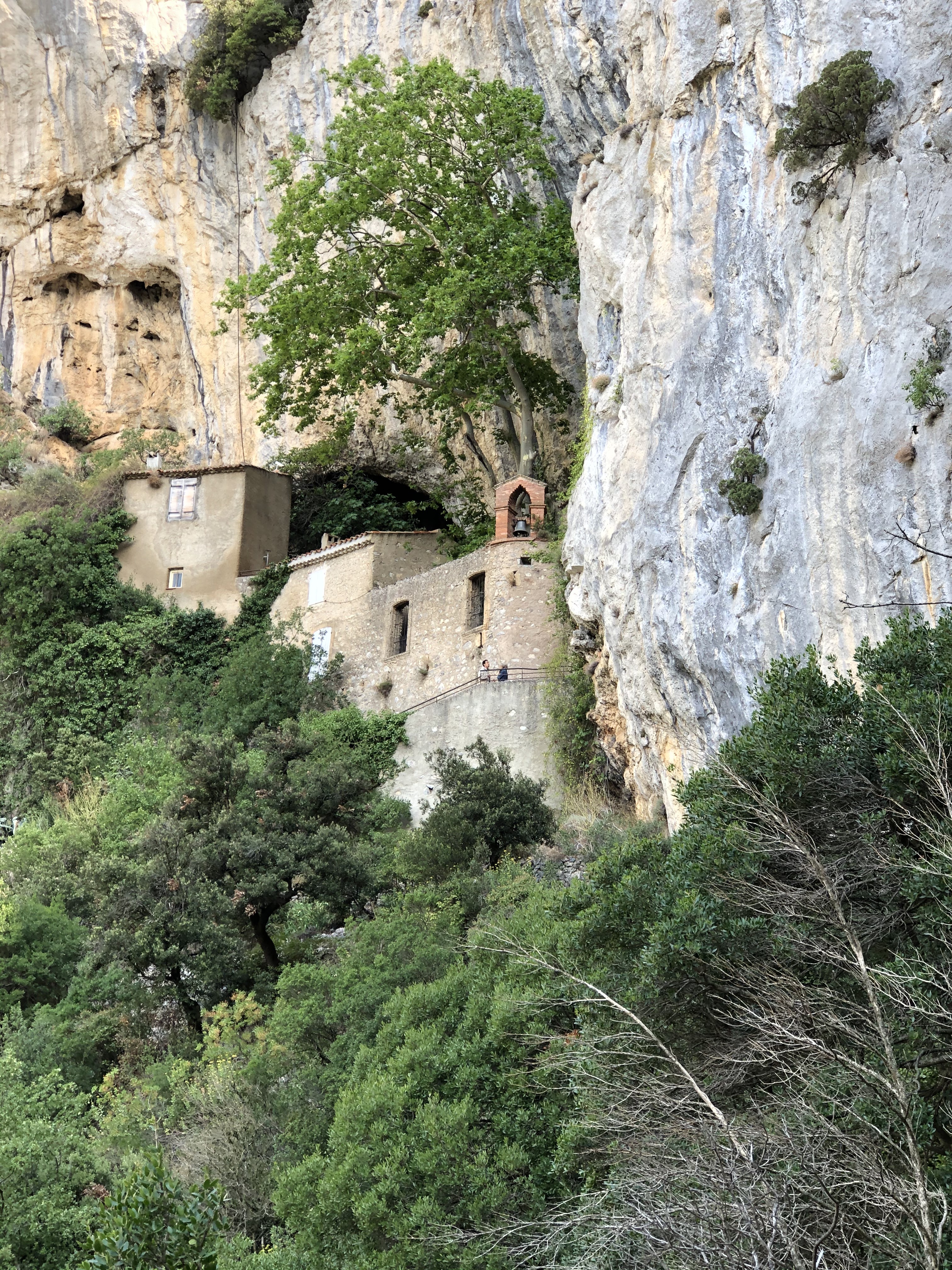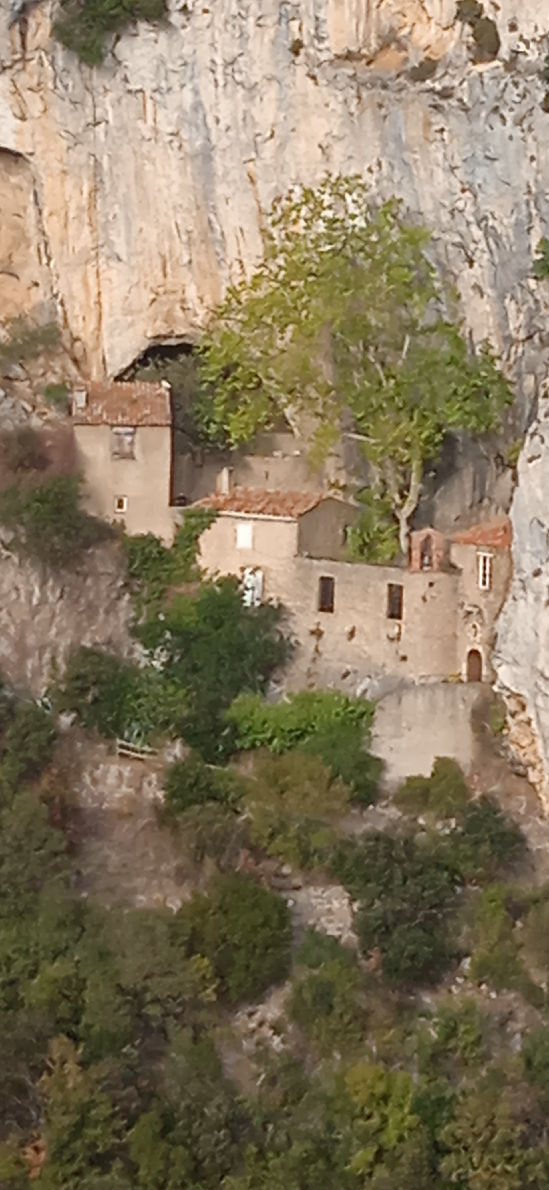 Magnifique l’ermitage : une petite église dans la grotte et des petites maisons . Et aussi la vue de la gorge