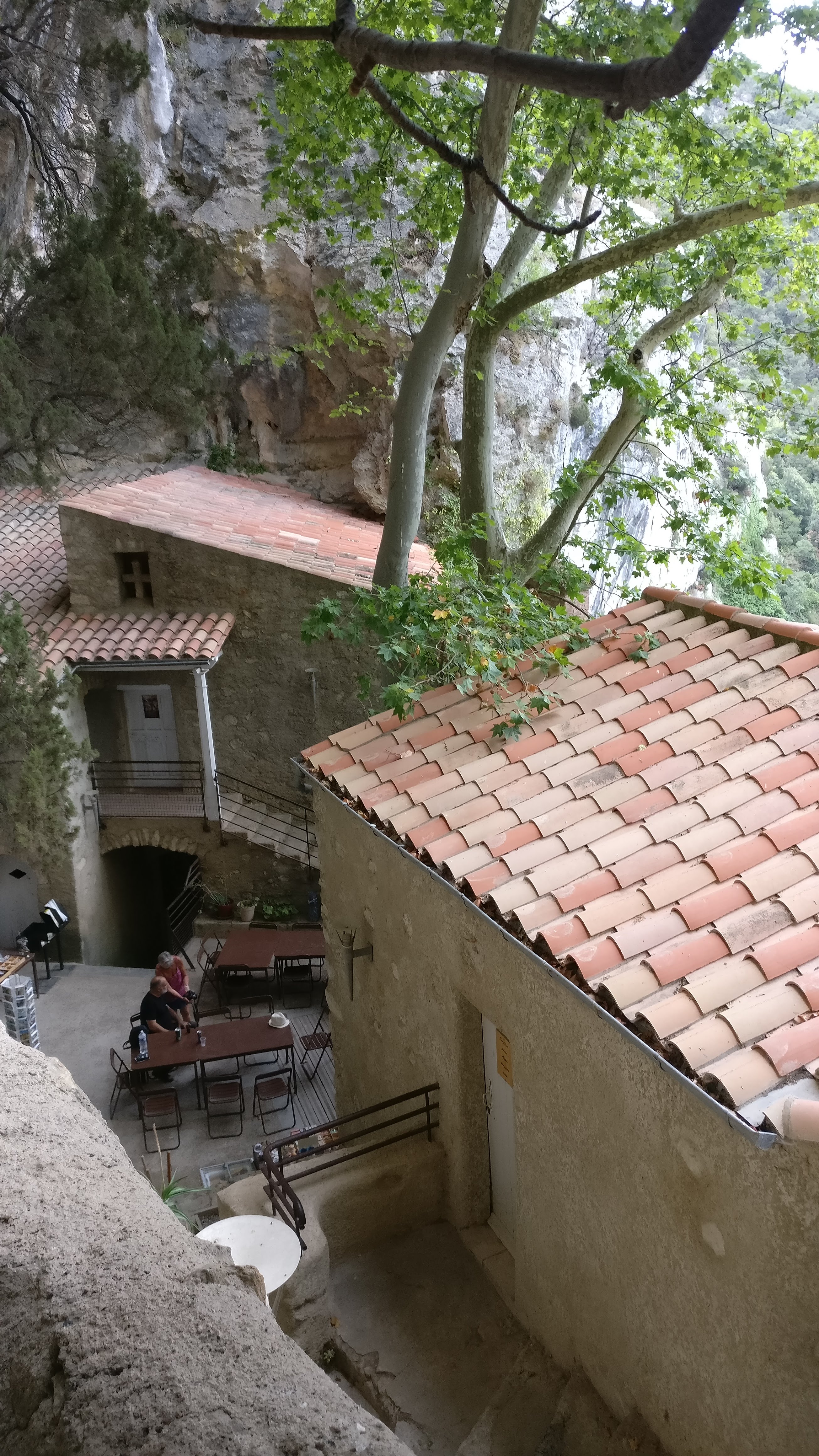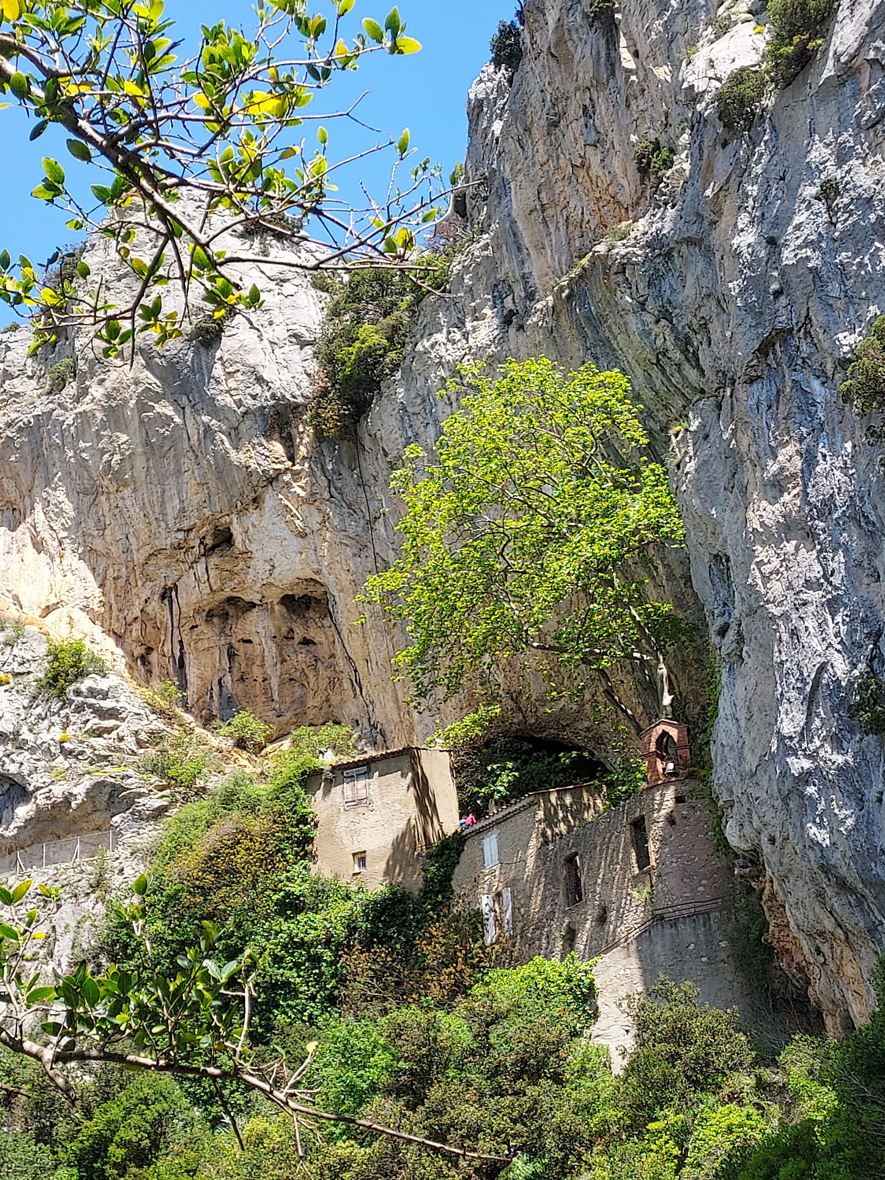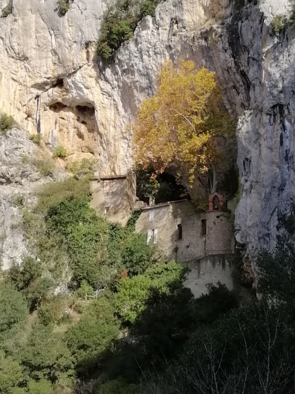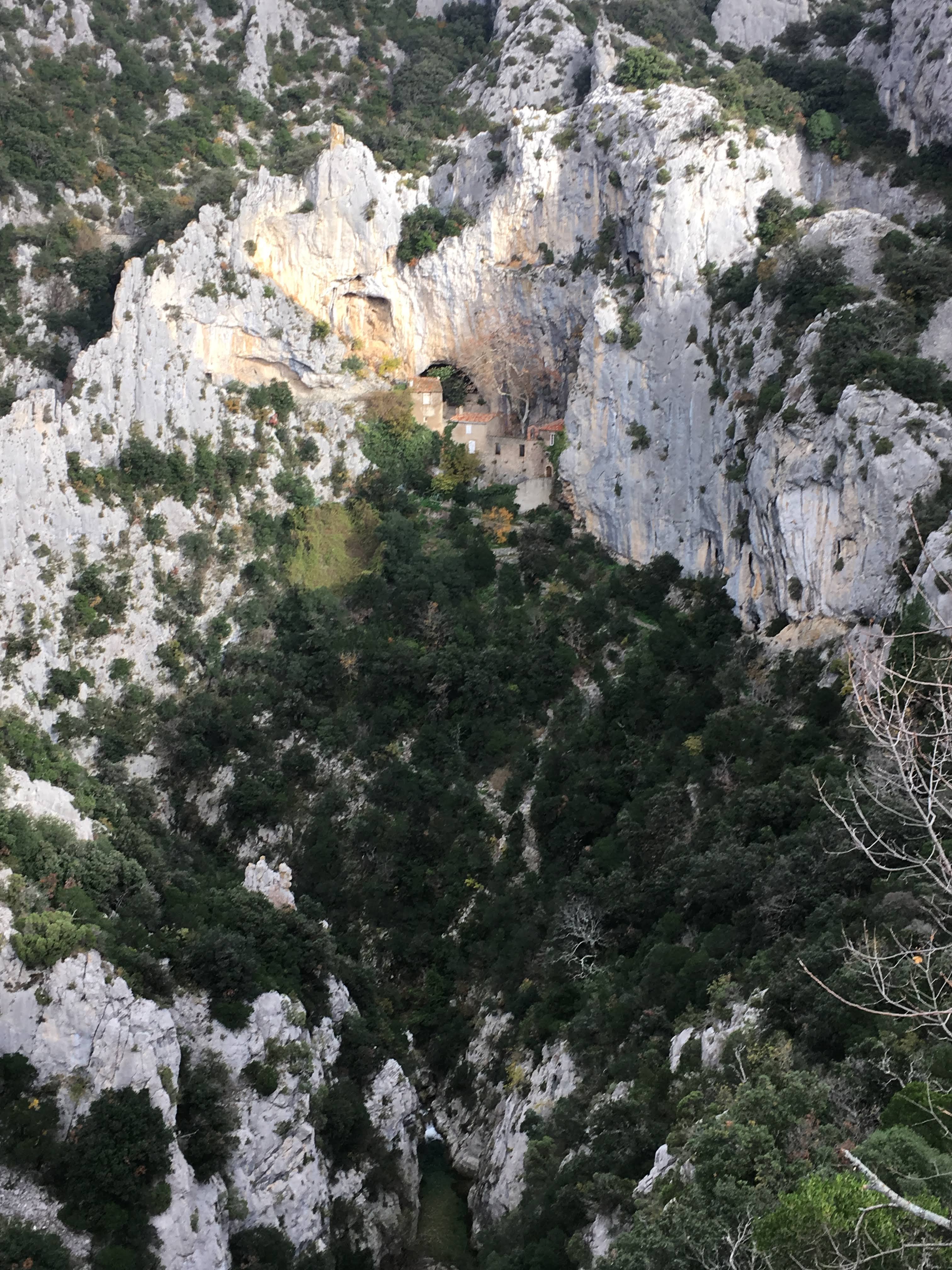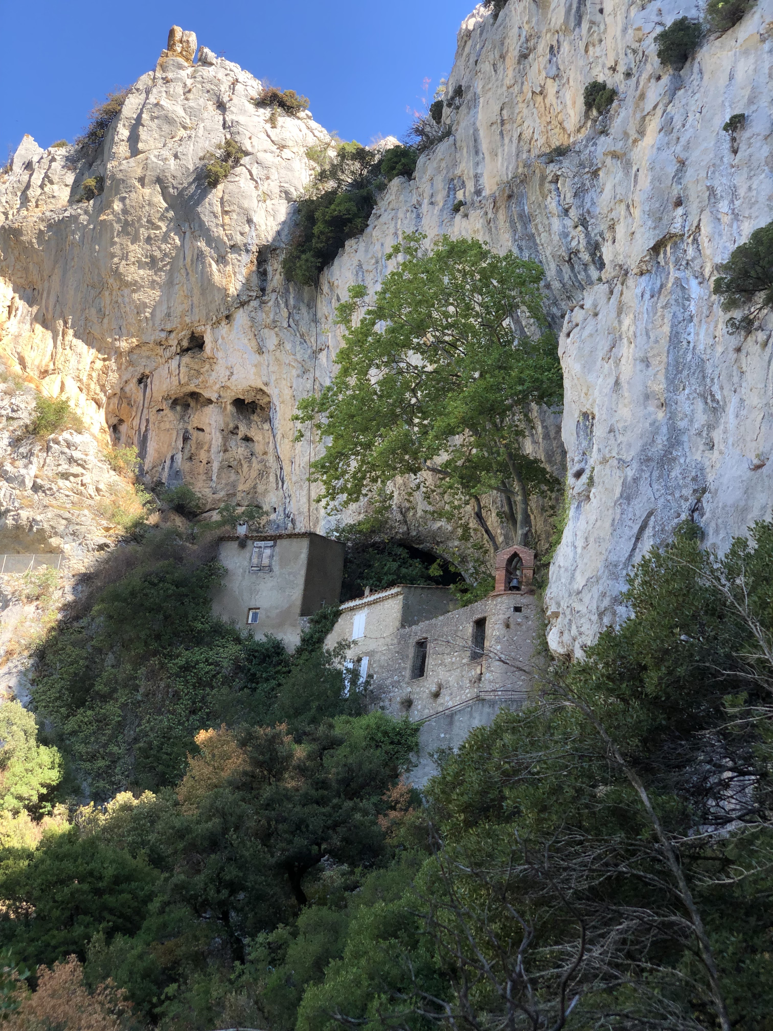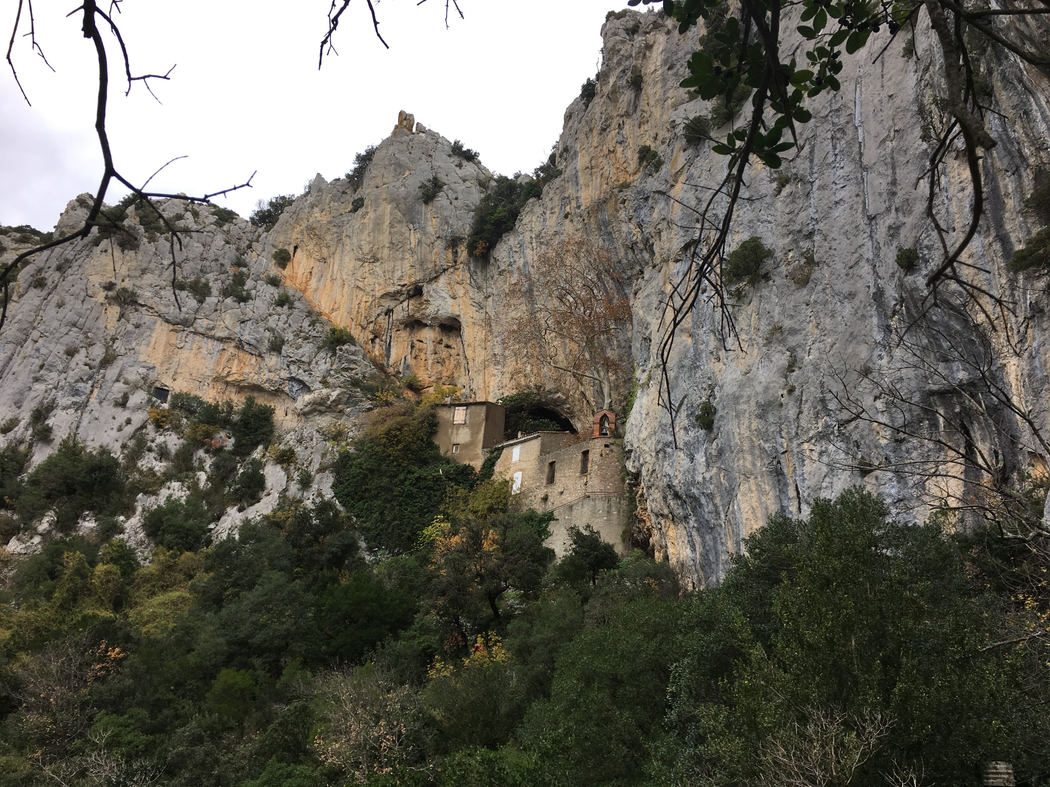 Magnifique l’ermitage : une petite église dans la grotte et des petites maisons . Et aussi la vue de la gorge
