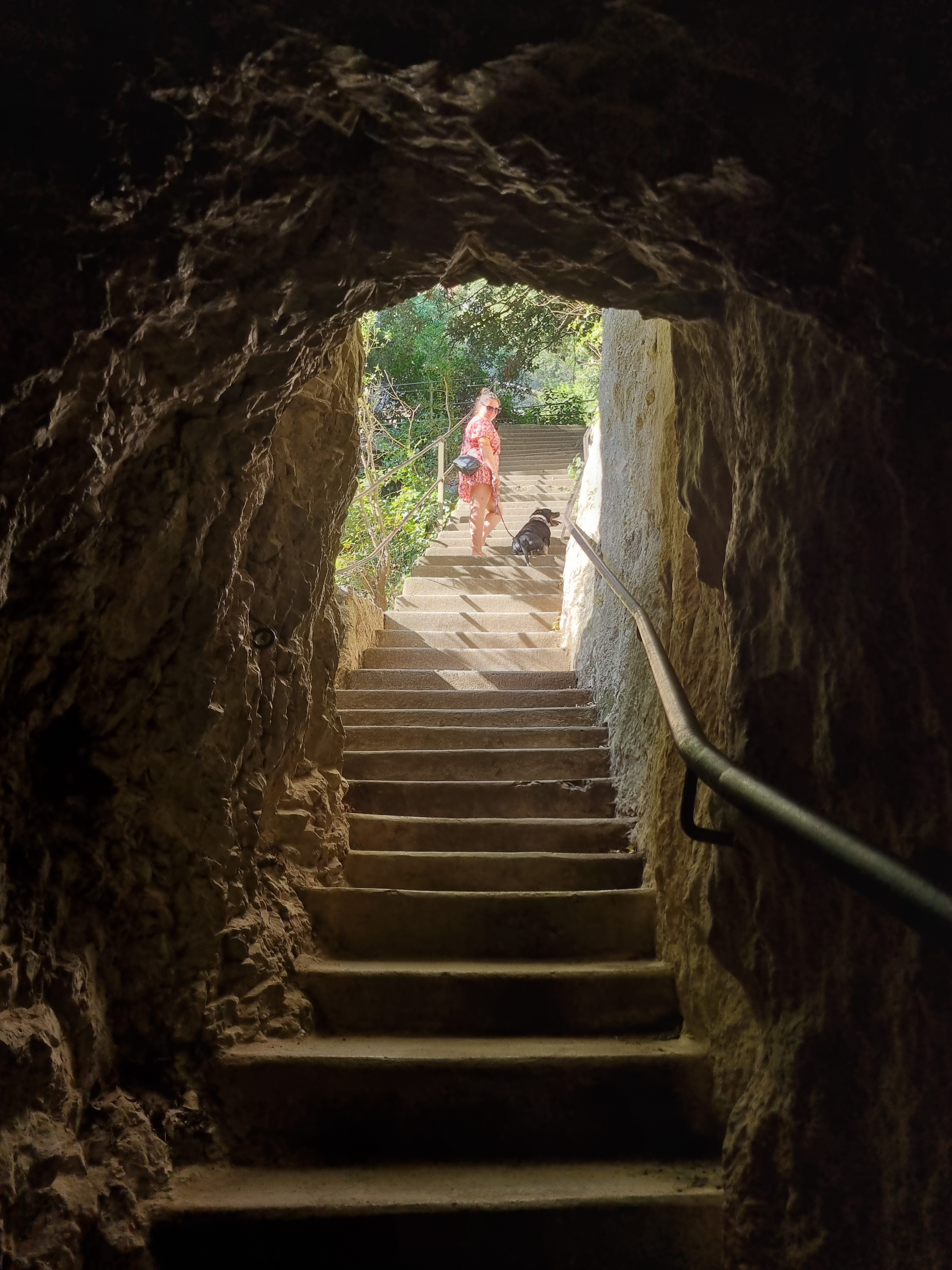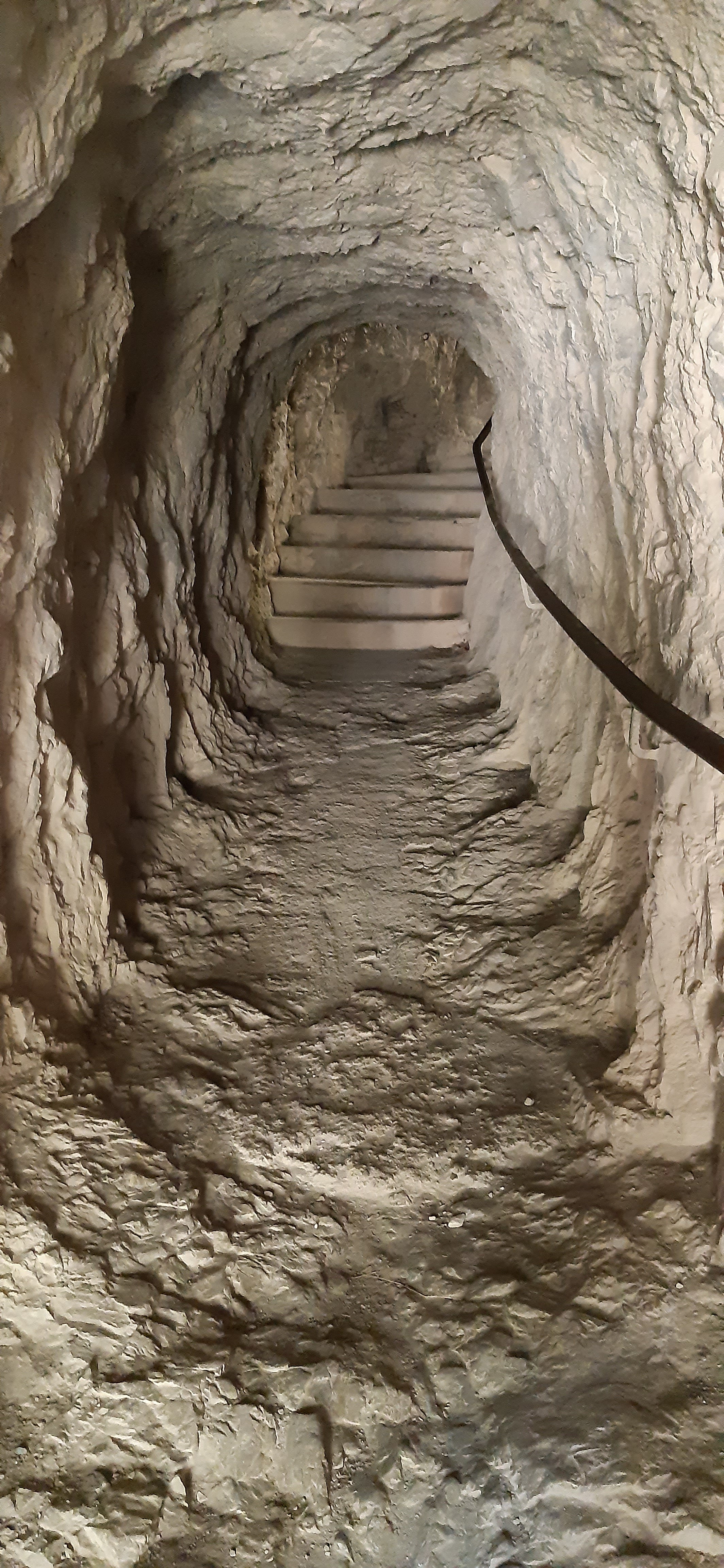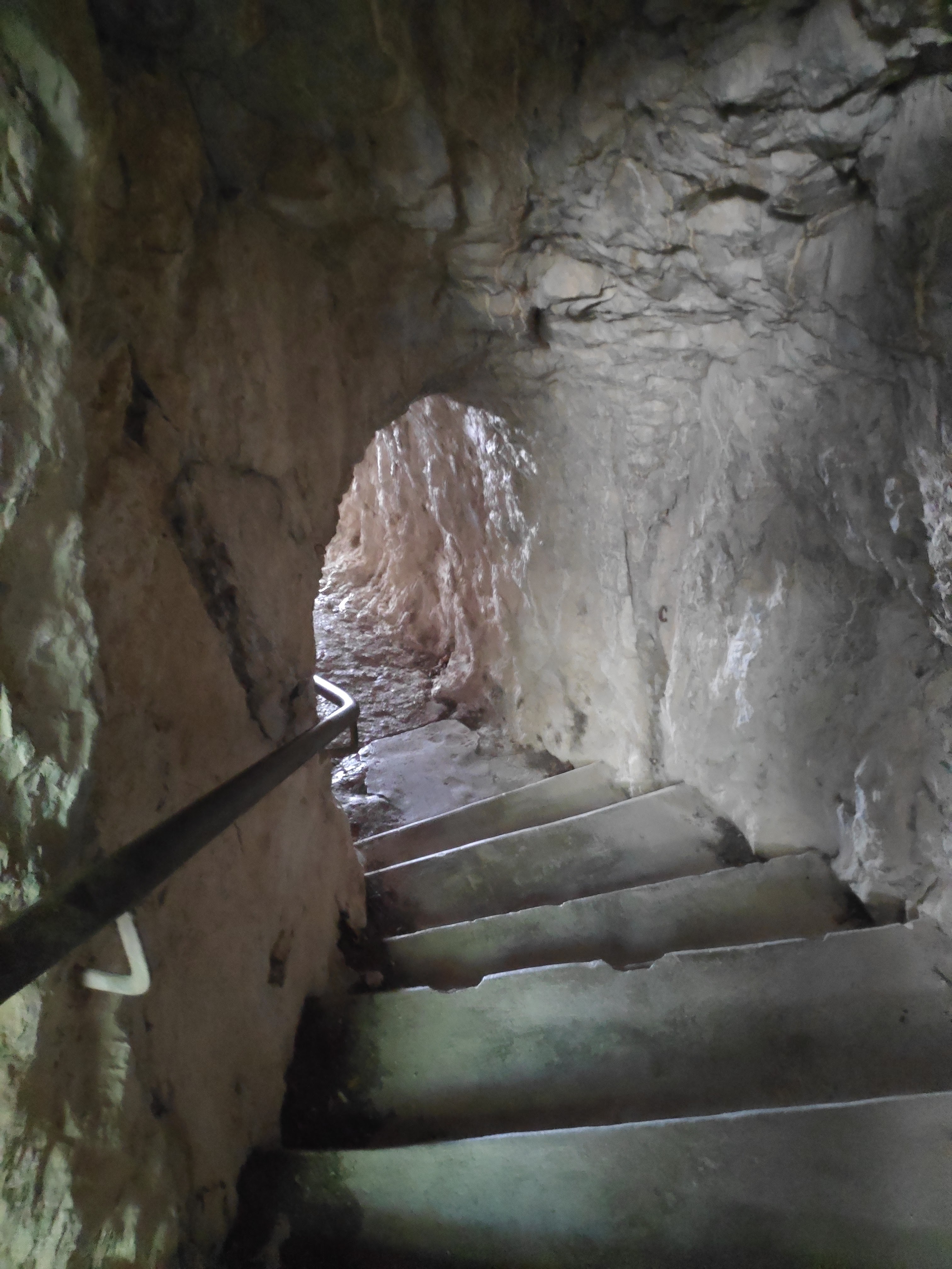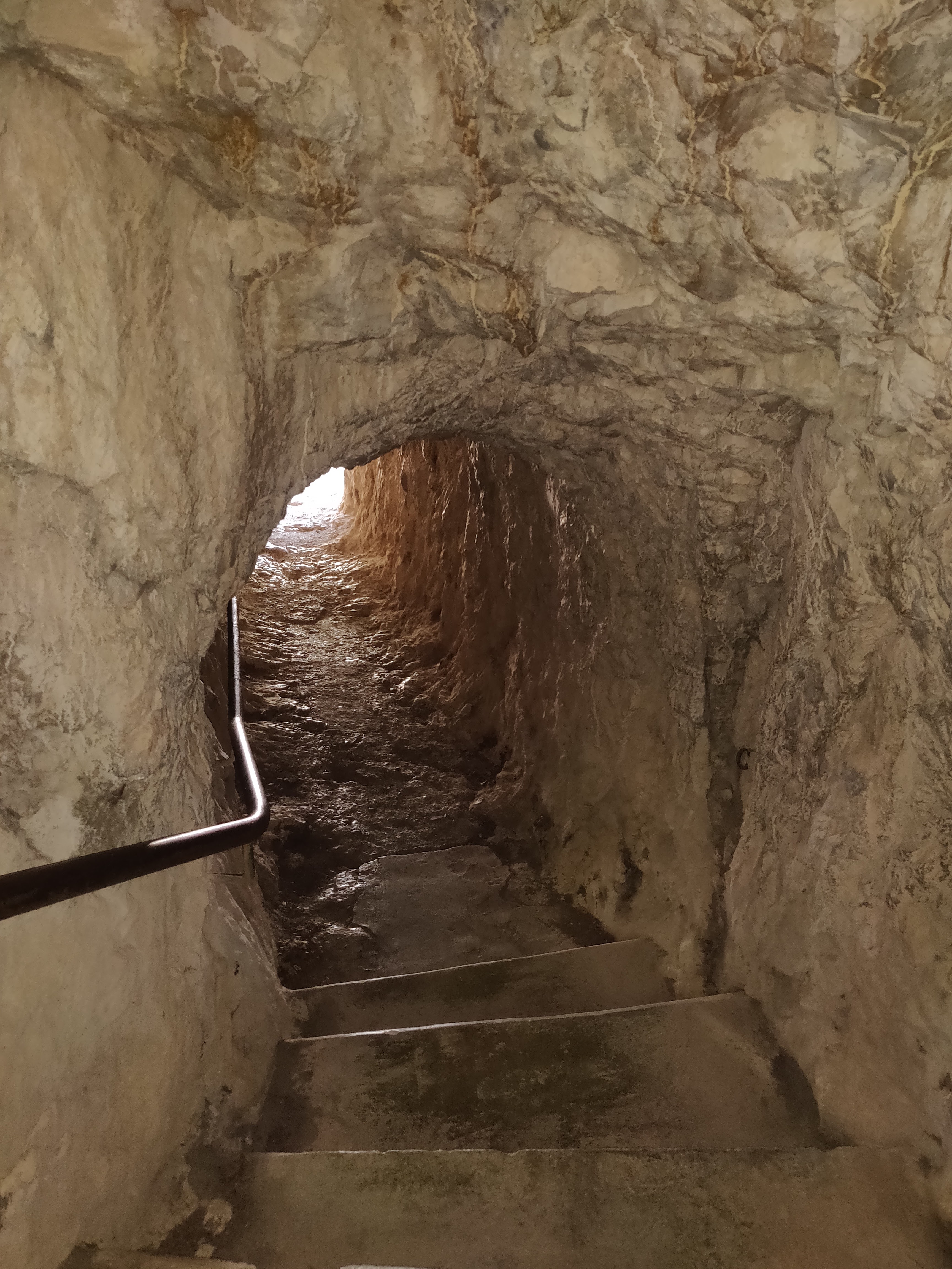 je recommande de descendre par le sentier, de visiter puis de remonter par l'escalier et le tunel
