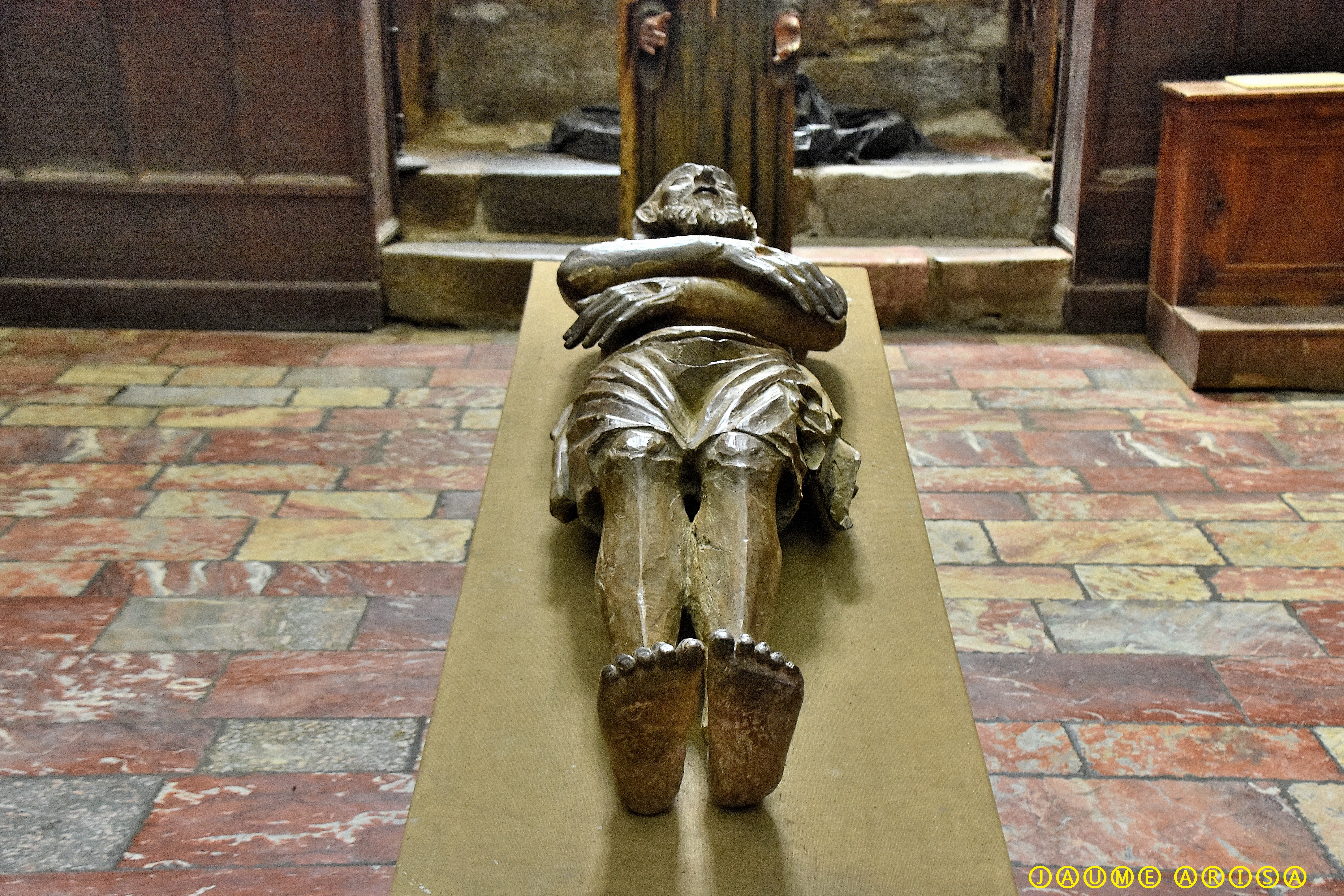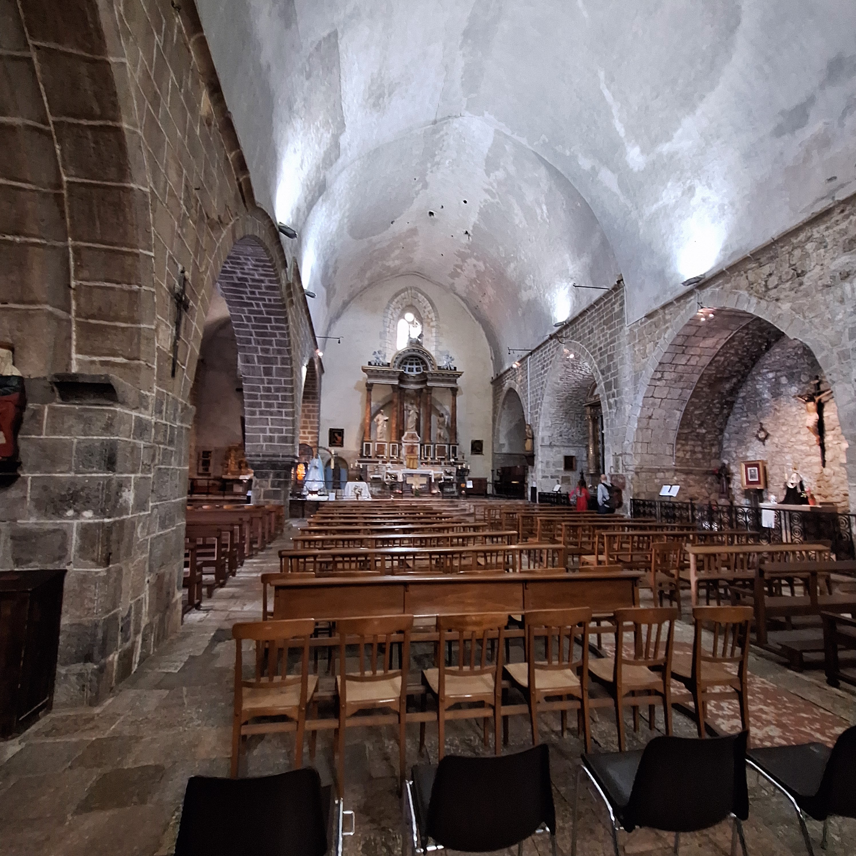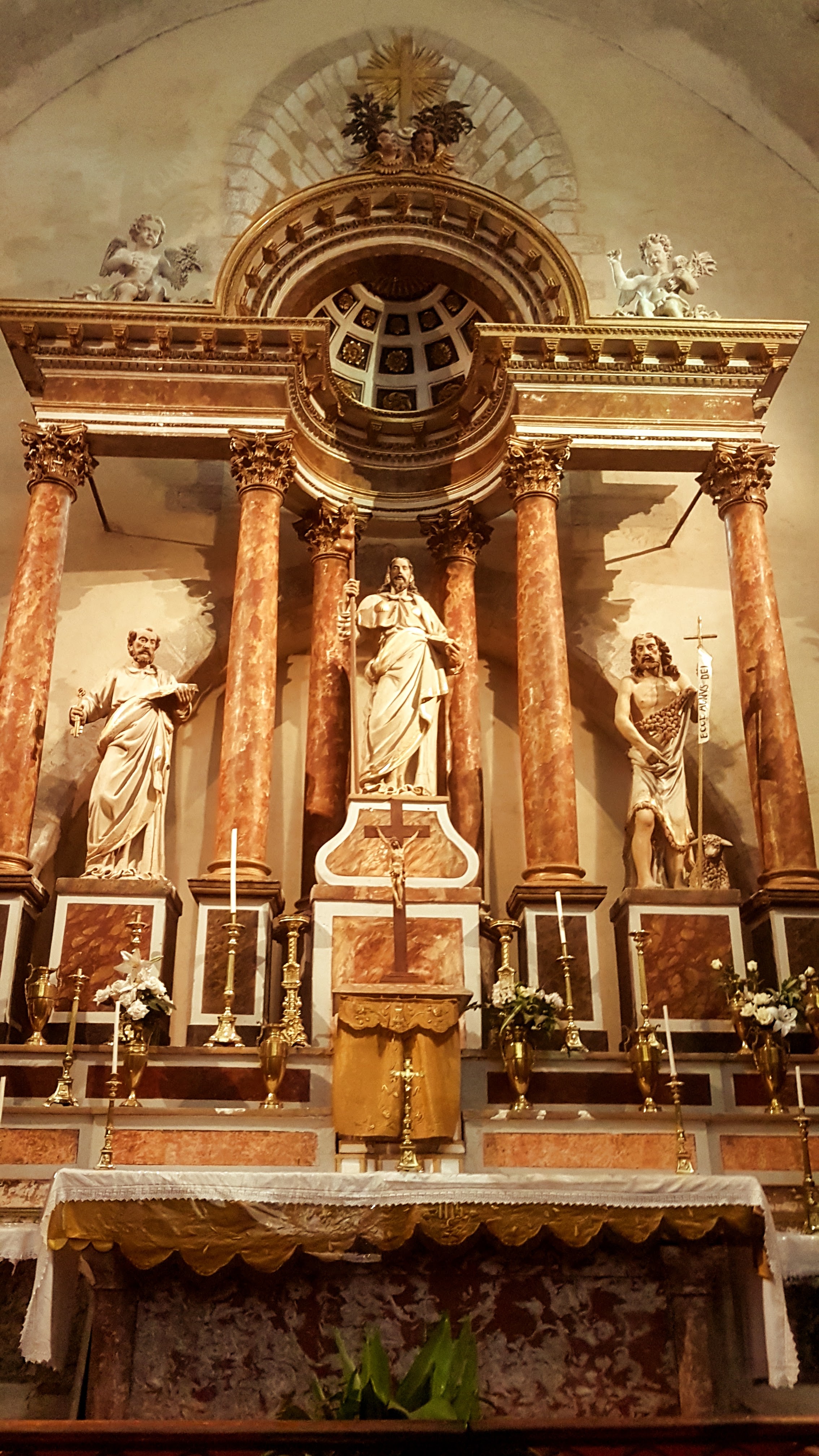 On descend quelques marches en entrant dans l'église. Elle possède une belle collection de statues anciennes à ne pas manquer !