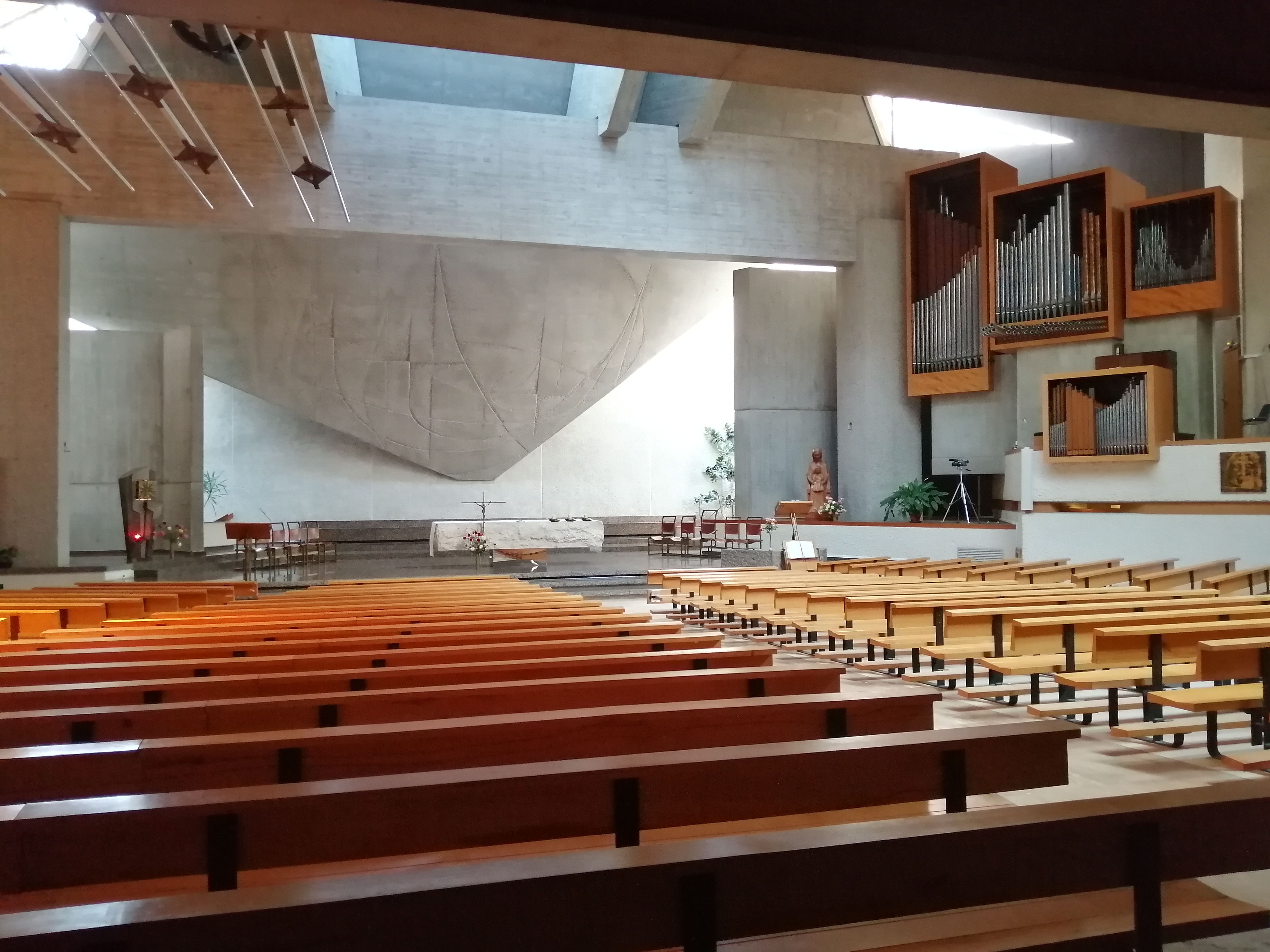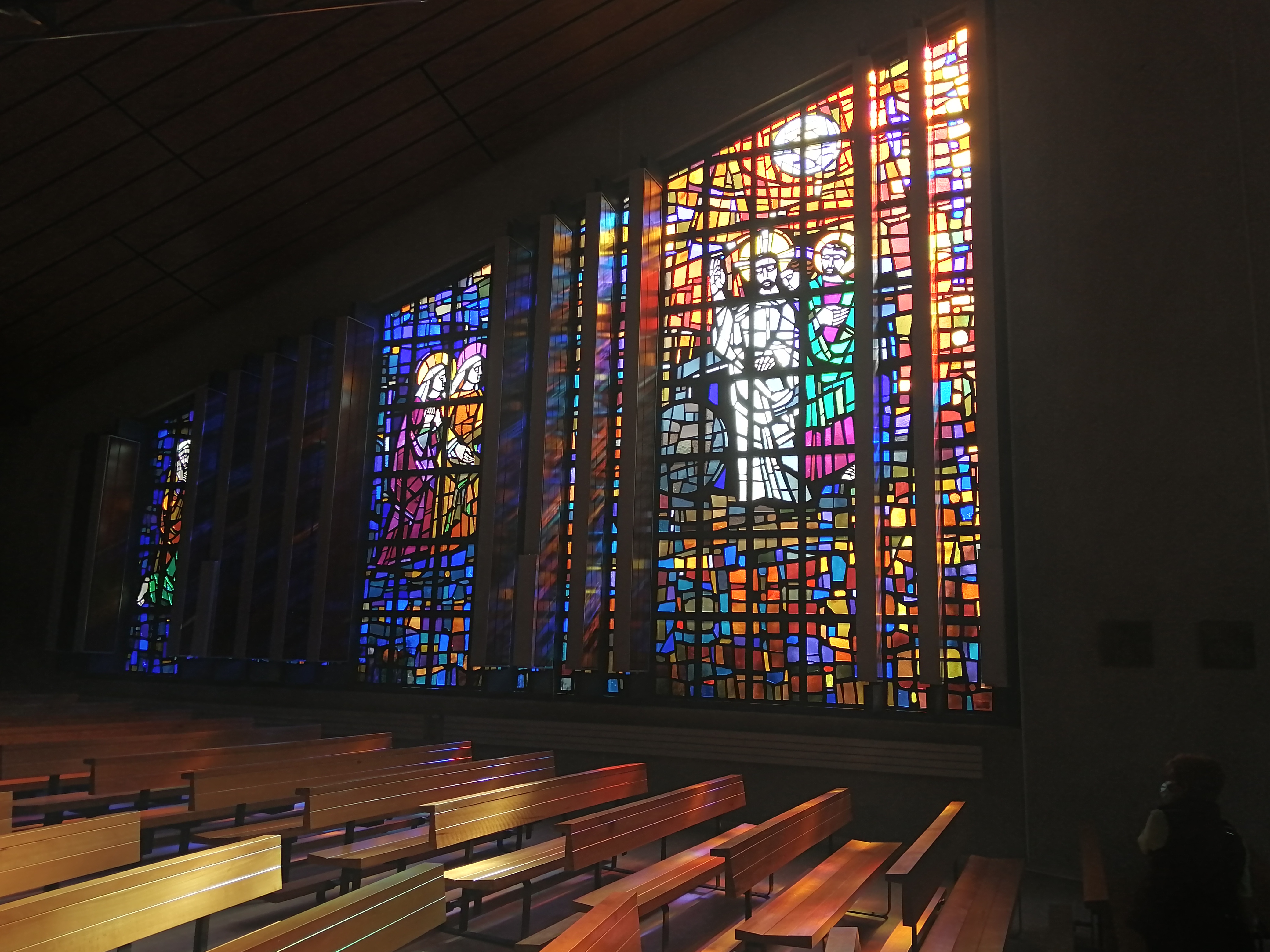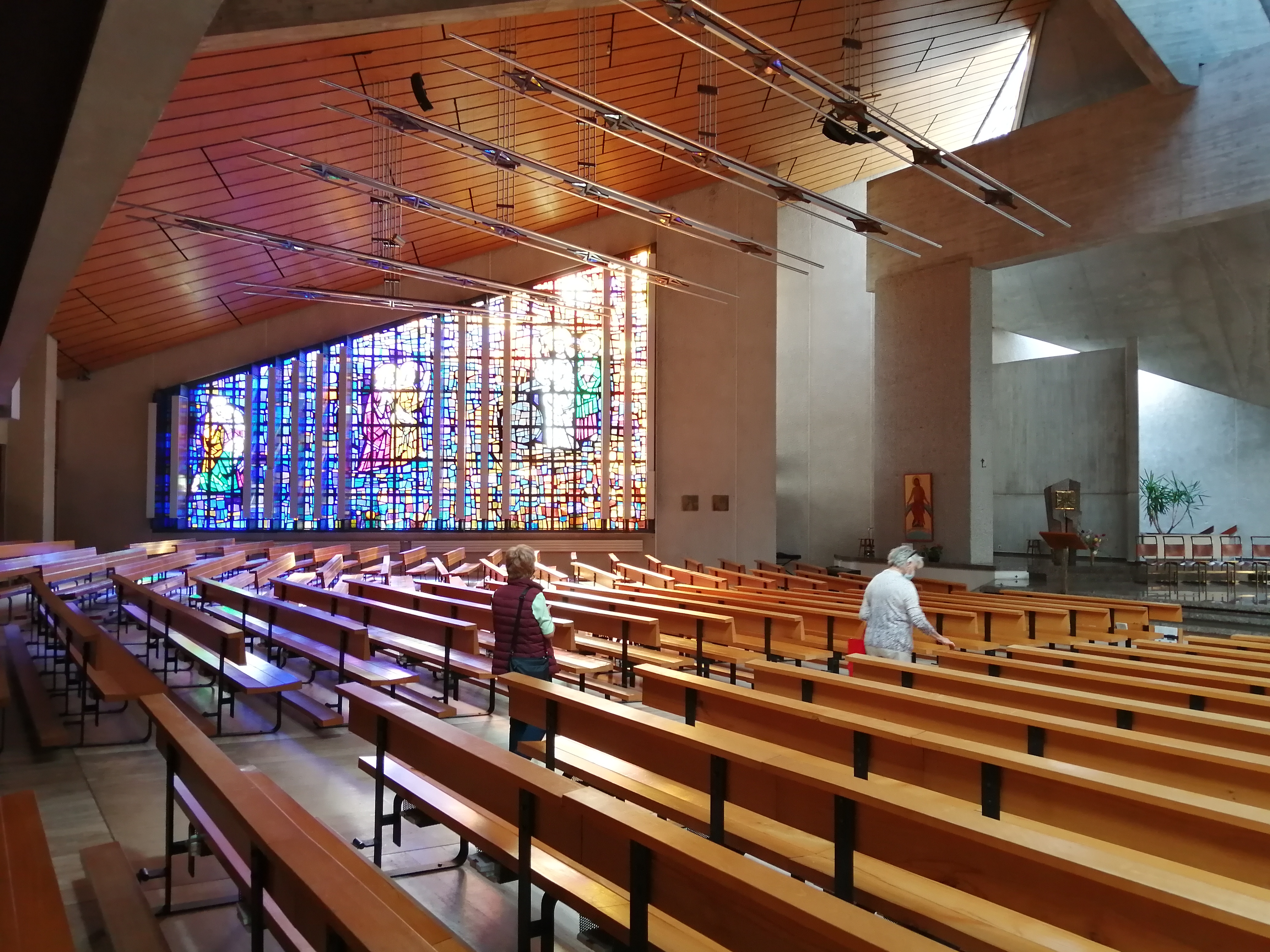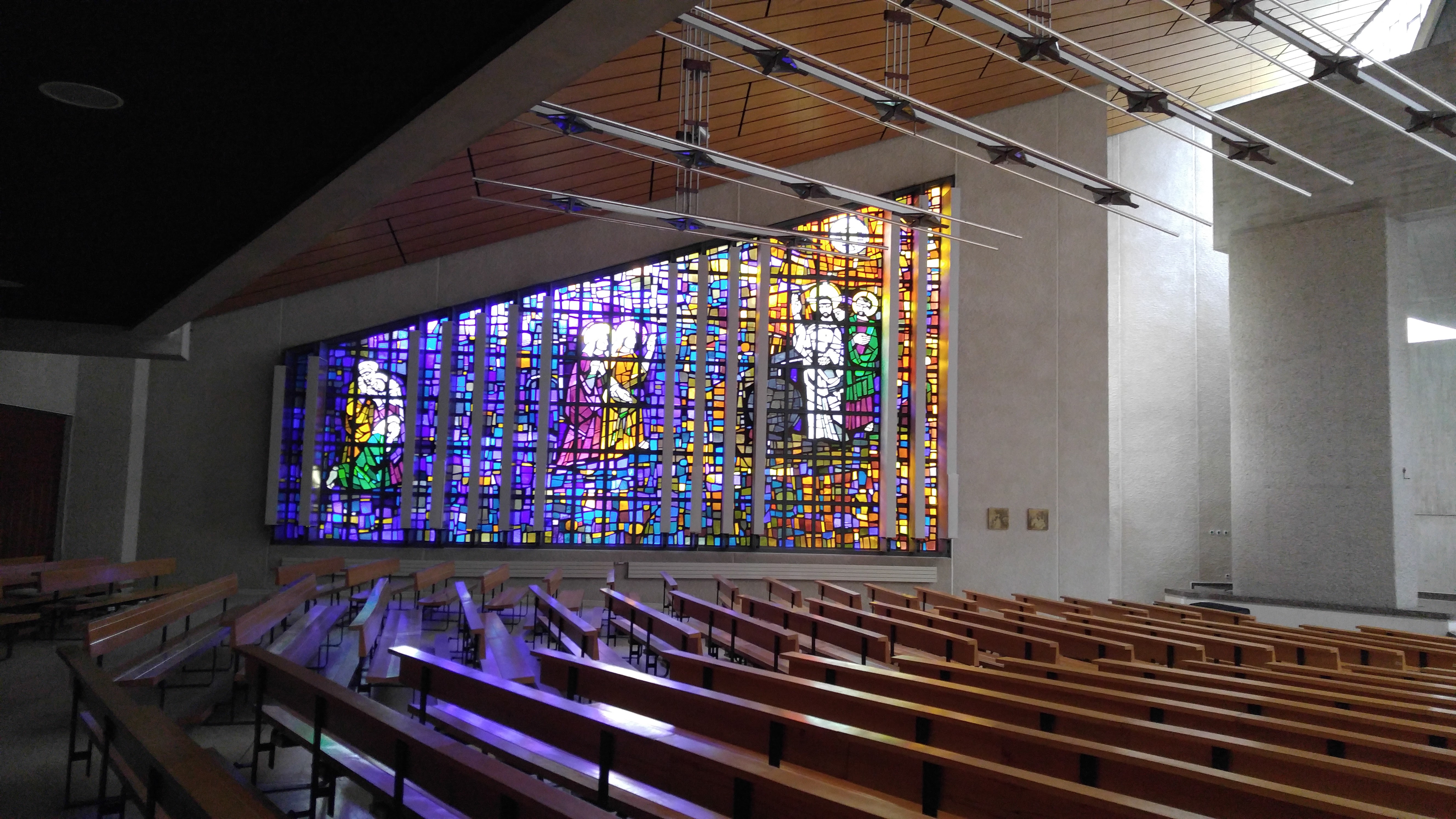 Centre catholique avec une belle église moderne et de splendides vitraux
