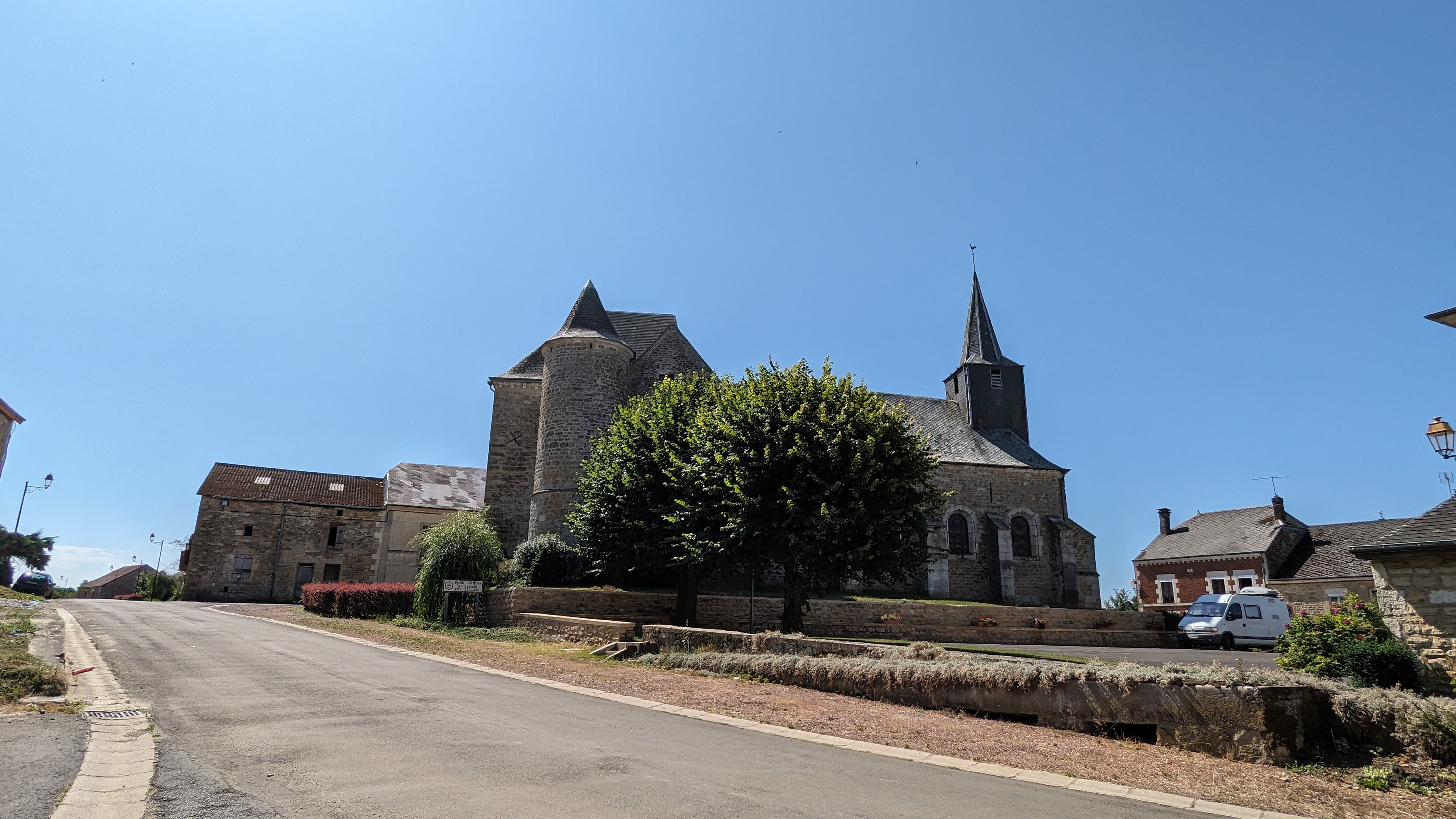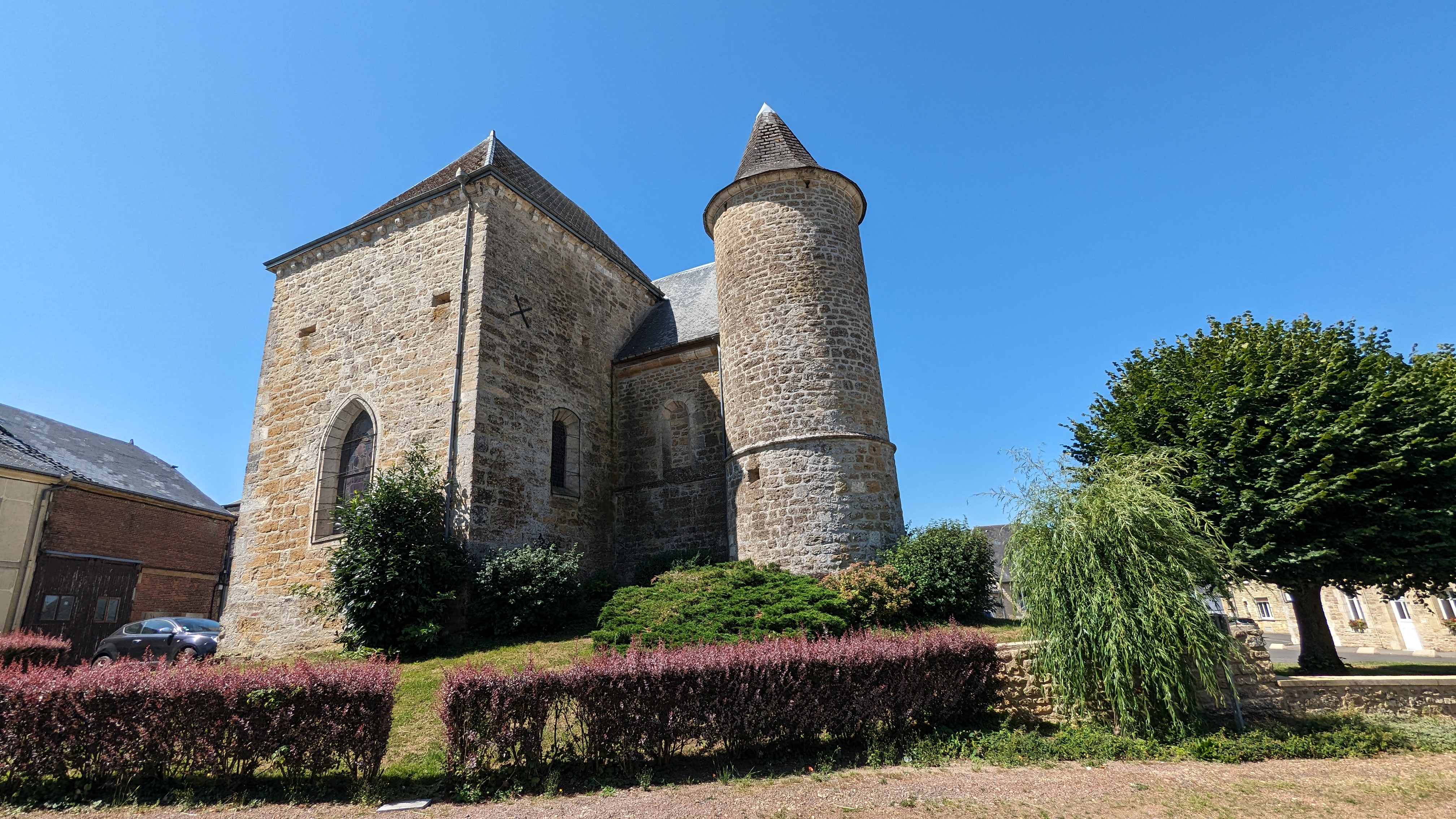 Église fortifiée, l'origine était une chapelle de 1075. Piliers et fondations d'origine de 1337-1453 (Guerre de Cent Ans). La tour ronde du XVe siècle sur l'église permet d'accéder à des meurtrières. Village pittoresque où aucun touriste ne passe,...sauf nous. Merveilleux endroit pour se détendre. Pas de magasins ni de tavernes, juste du calme, des tracteurs et un voisin sympathique. Idéal pour les chercheurs de silence. Assurez-vous de visiter l'église d'un point de vue historique.