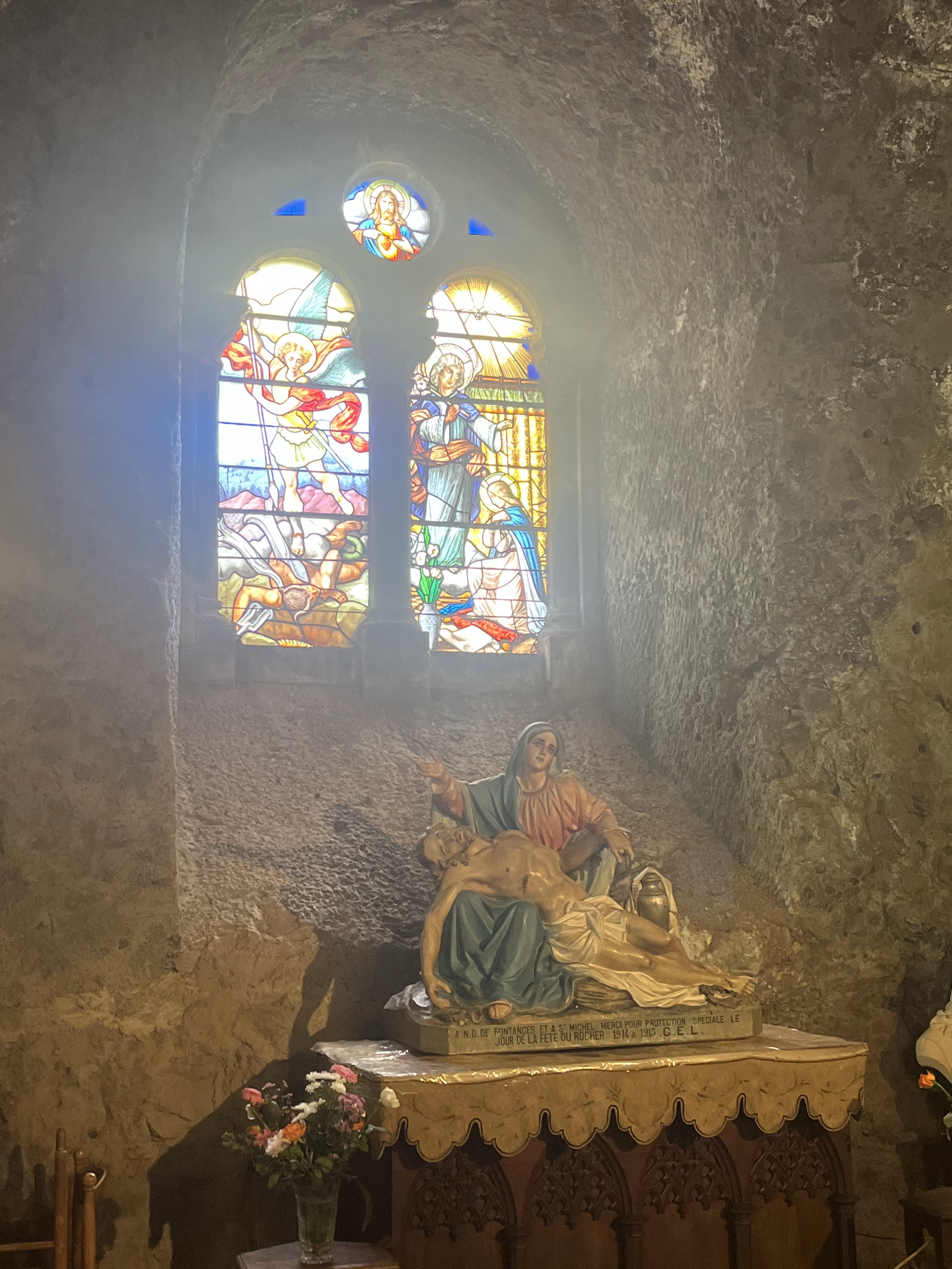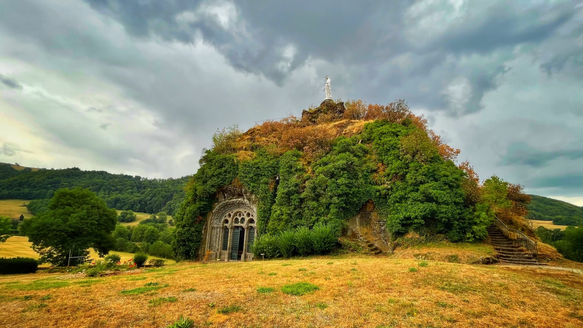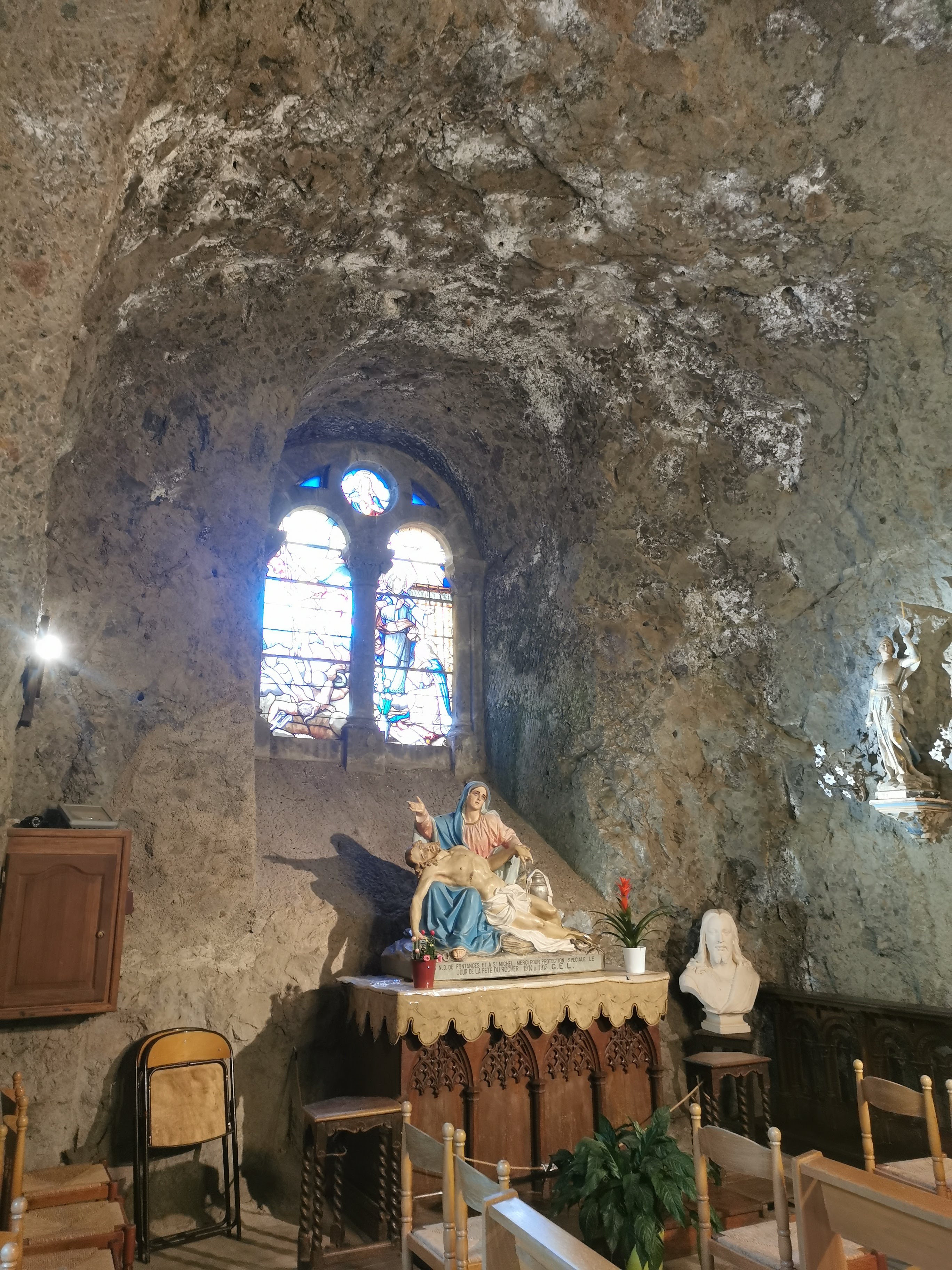 Chapelle creusée dans la roche avec une vue magnifique sur la vallée et fontanges au sommet de la vierge