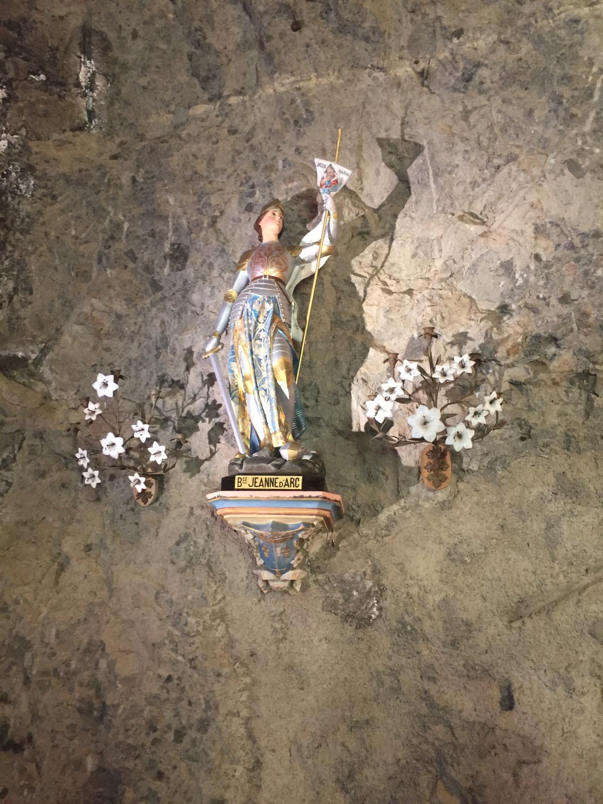 Chapelle creusée dans la roche. Des chauves-souris y résident. Dédiée à St Michel. Statue de Jeanne d'Arc. Luminons pour offrandes. Un escalier extérieur permet par un chemin de monter au sommet ou est située la statue de la vierge. Gérés par des bénévoles qui assurent l'ouverture de la chapelle et l'entretien. Mérite le détour.