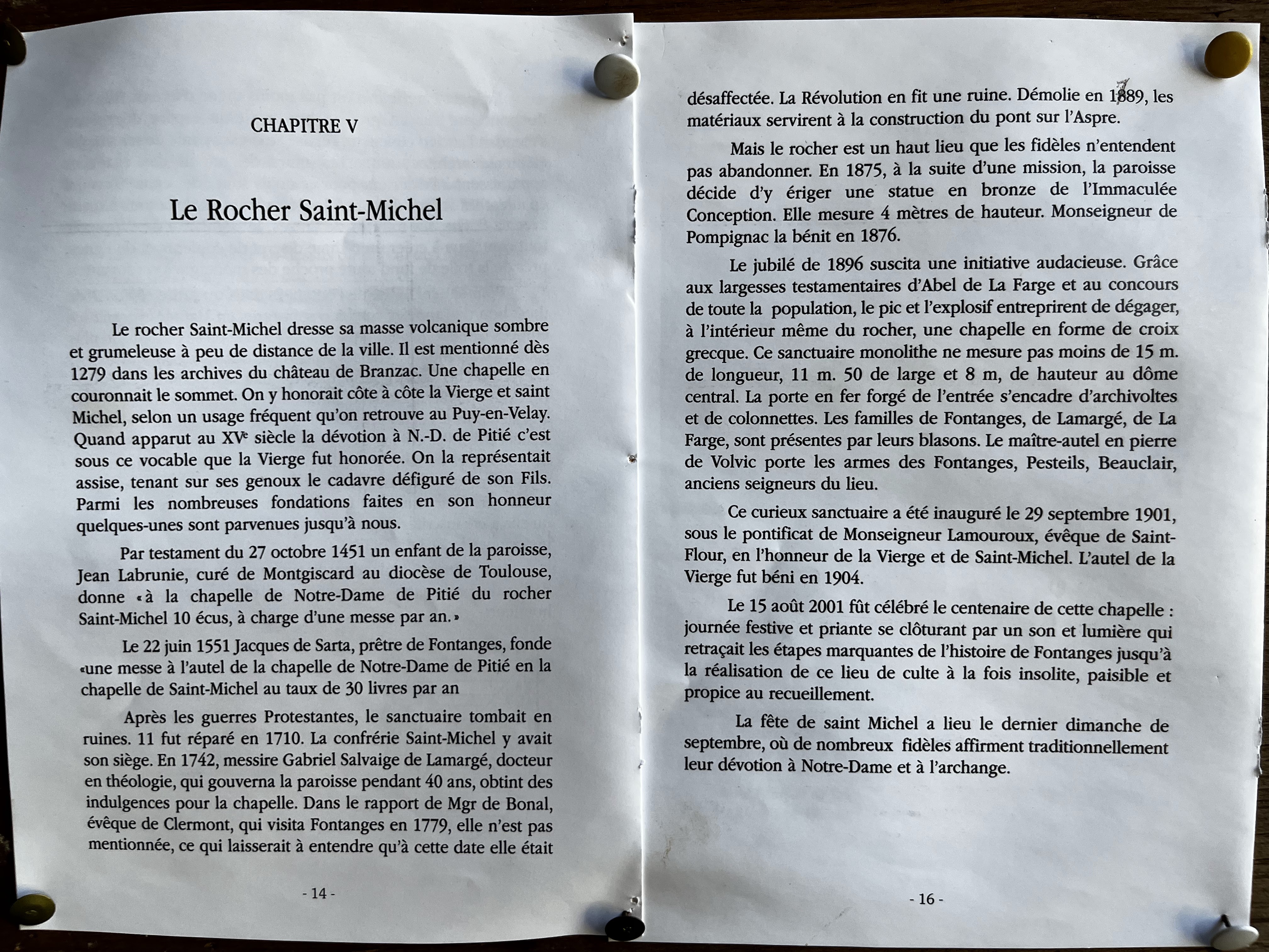 À cet énorme rocher était autrefois adossé un château fort, le château de Fontanges. A la cime de ce rocher, à côté des tours féodales, s'élevait une petite chapelle dédiée à Saint Michel. Au fil des siècles, la chapelle, les tours et le château ont disparu. Sur les ruines de la chapelle fut posée en 1876 la statue de la vierge qui y trone aujourd'hui. C'est en 1901 que ce rocher a été creusé pour y créer la chapelle monolithe. Vous pourrez visiter la jolie chapelle et monter jusqu'à la vierge( par des escaliers) pour dominer la vallée de Fontanges. Et peut-être même sonner la cloche si vous trouvez la chaîne qui pend le long du mur !