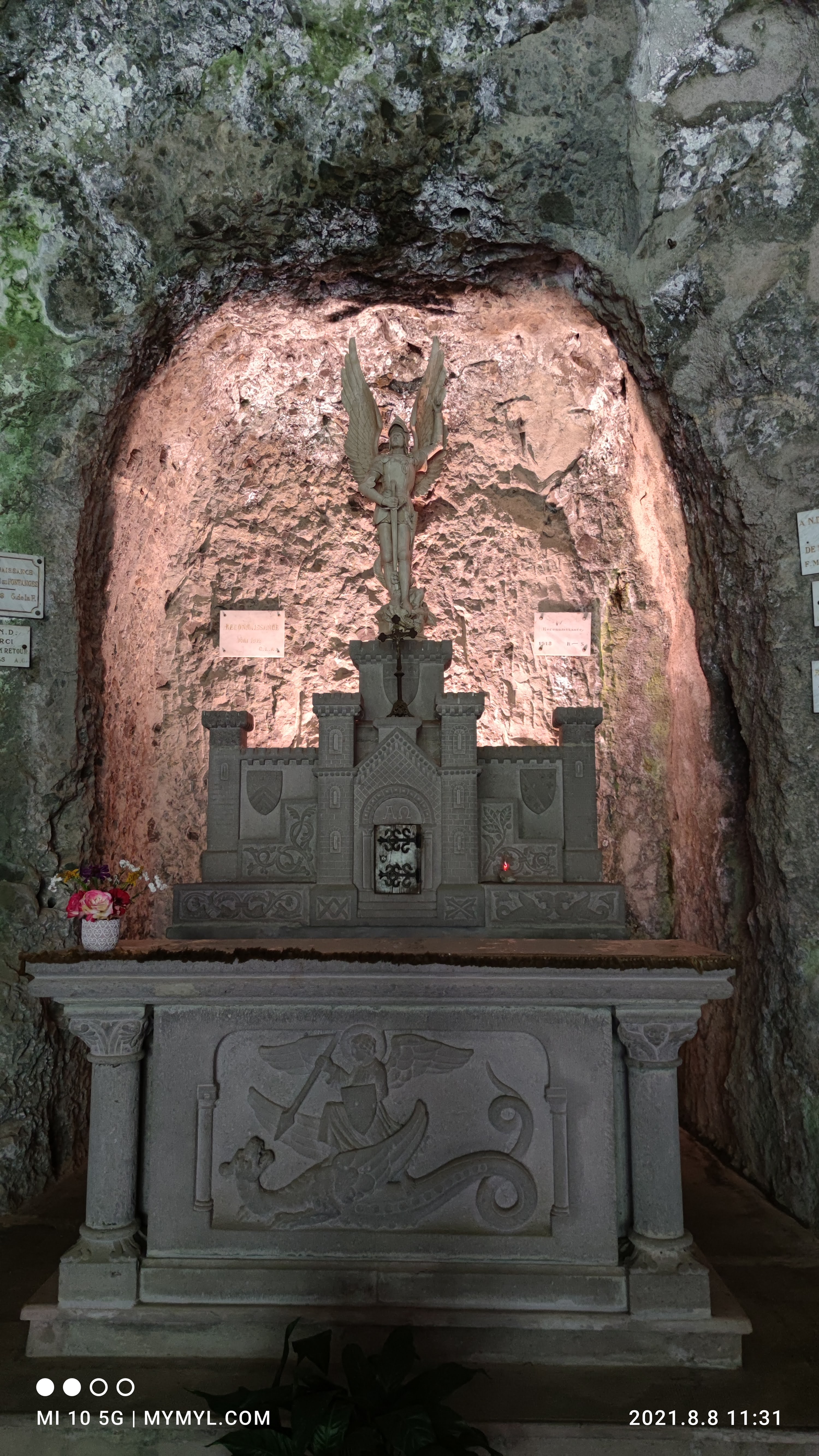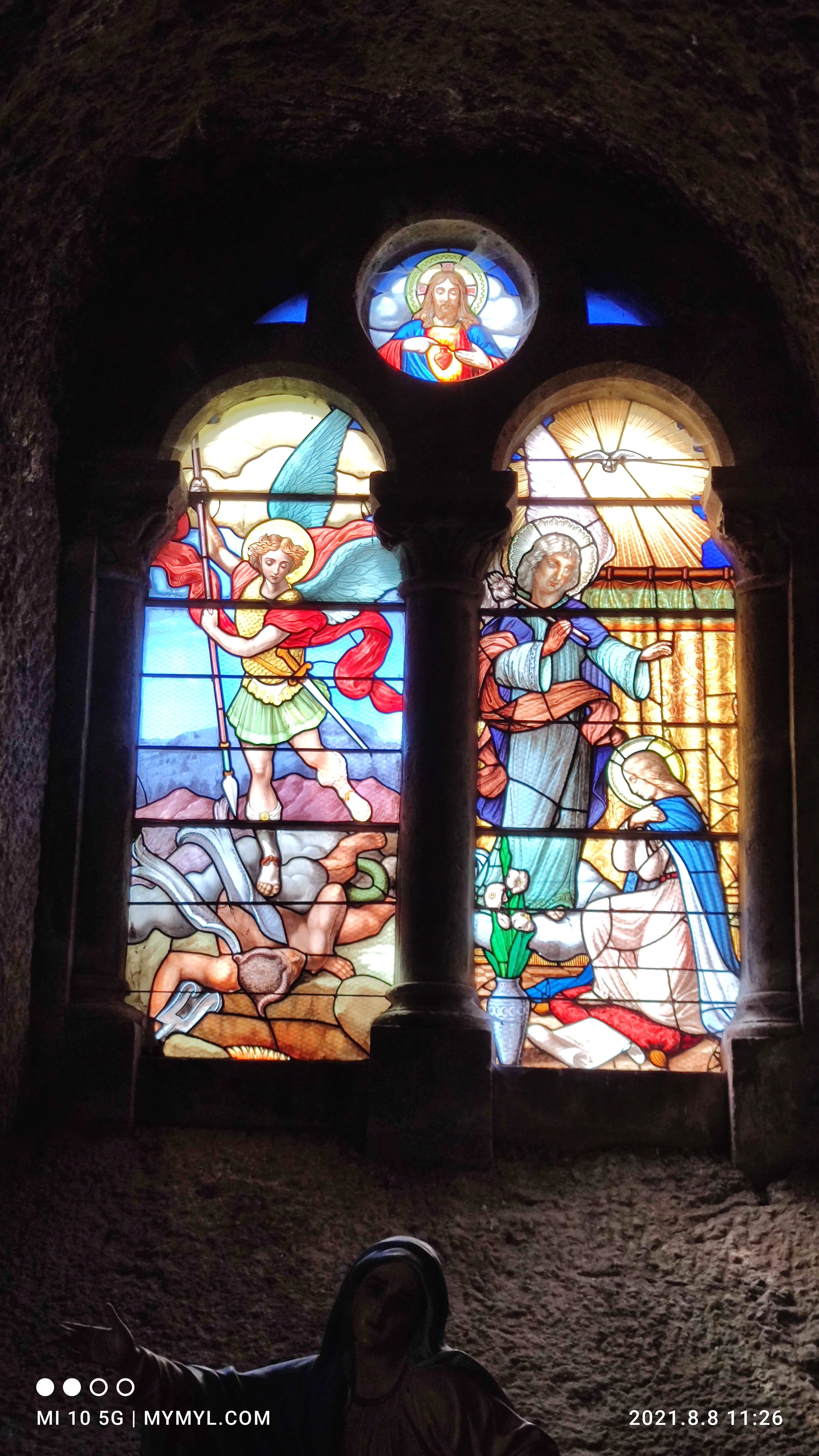 Une petite chapelle creusé dans la rocher. Un escalier permet de monter sur le rocher jusqu'a la statue de la vierge.