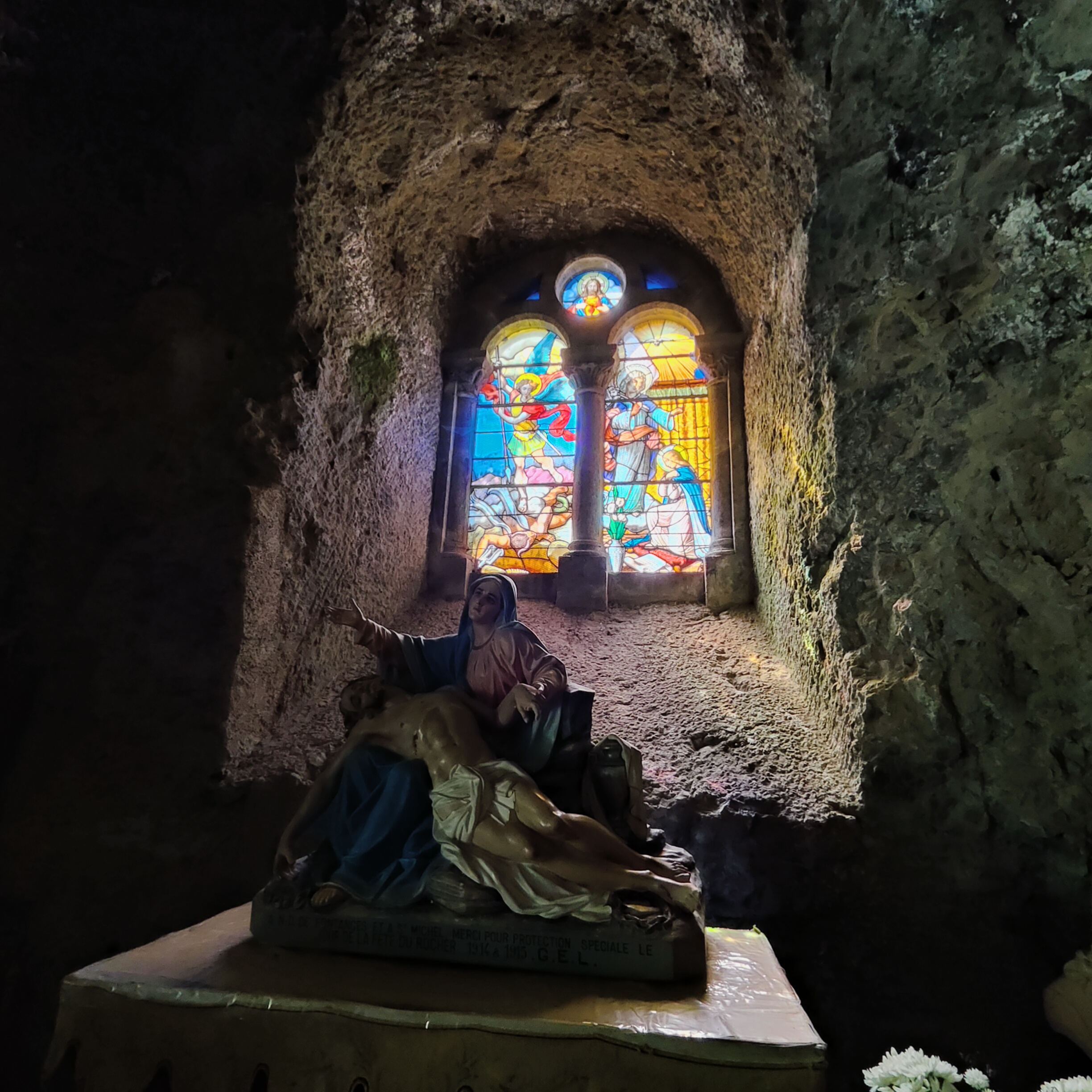 Grotte artificielle, creusée il y a un siècle, pour accueillir une petite église au centre d'un petit village de montagne.