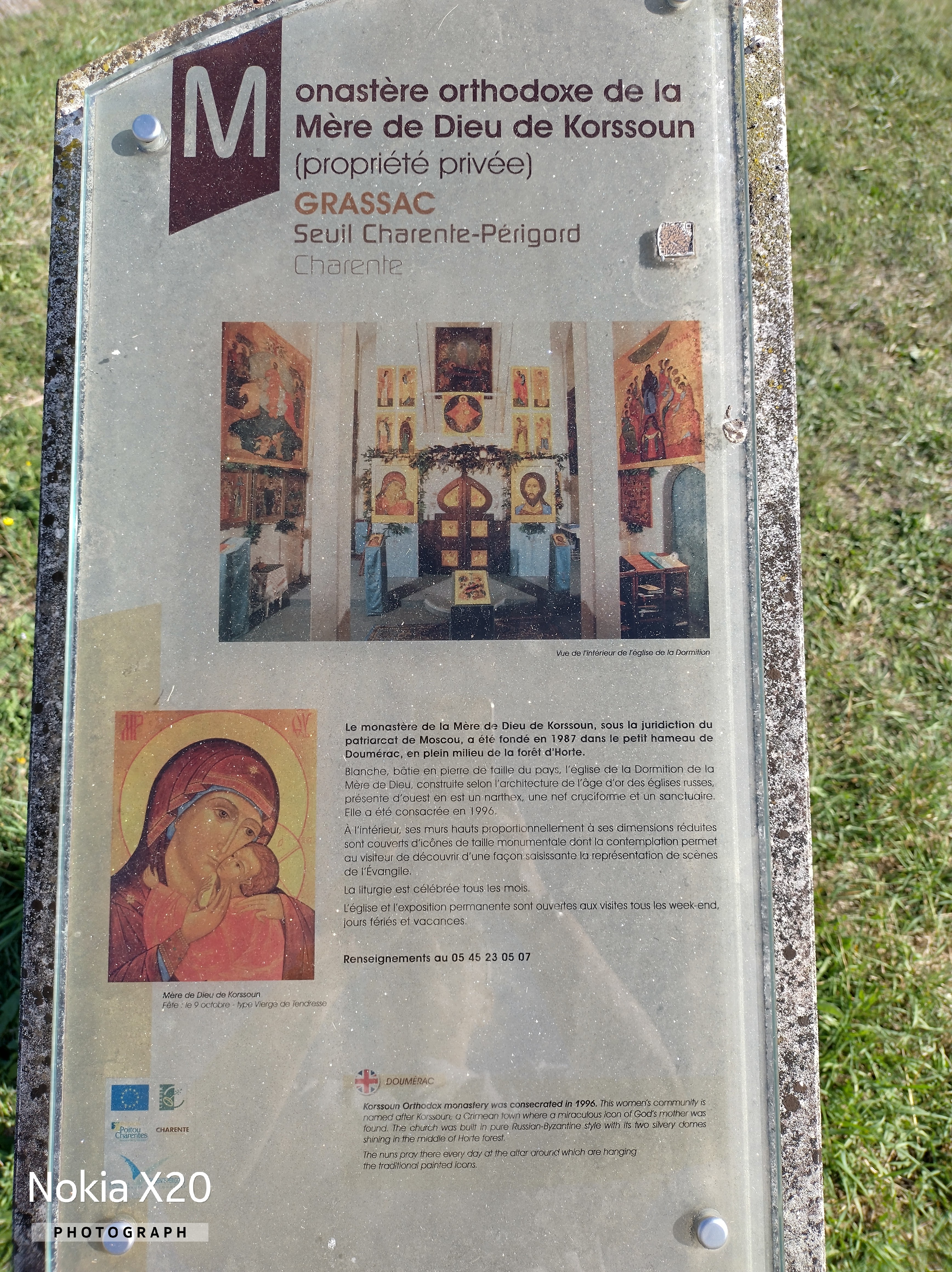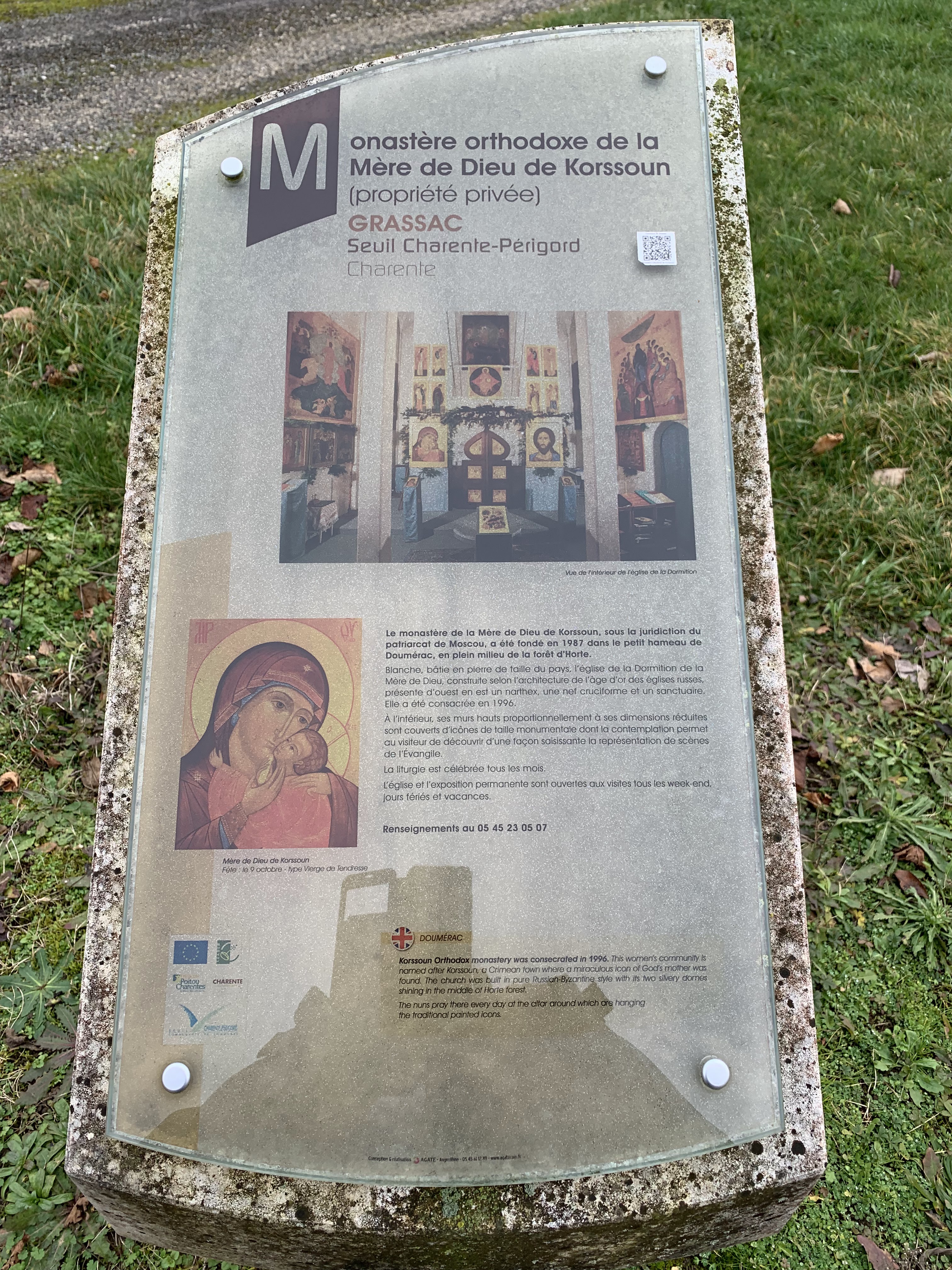 Un lieu improbable dans ce coin de Charente. Le Monastère Orthodoxe de la Mère de Dieu de Korssoum, sous la juridiction du Patriarcat de Moscou a été fondé en 1987 et consacré en 1996. L'existence-même de ce lieu peut paraître extraordinaire, situé à moins de 3 kms du bourg de Grassac, dans le hameau de Doumerac. La visite de l'église (petite mais remplie de trésors) en compagnie d'une Moniale est instructive et jalonnée de délicieuses découvertes colorées. Les Moniales y ont placé de nombreuses icônes réalisées par elles, l'harmonie des couleurs à l'intérieur de l'église est superbe. L'exposition-vente permanente d'icônes, œufs peints, tableaux, créations diverses des sœurs, c'est l'opportunité de participer à l'économie du monastère, tout en repartant avec des cadeaux ou des souvenirs.