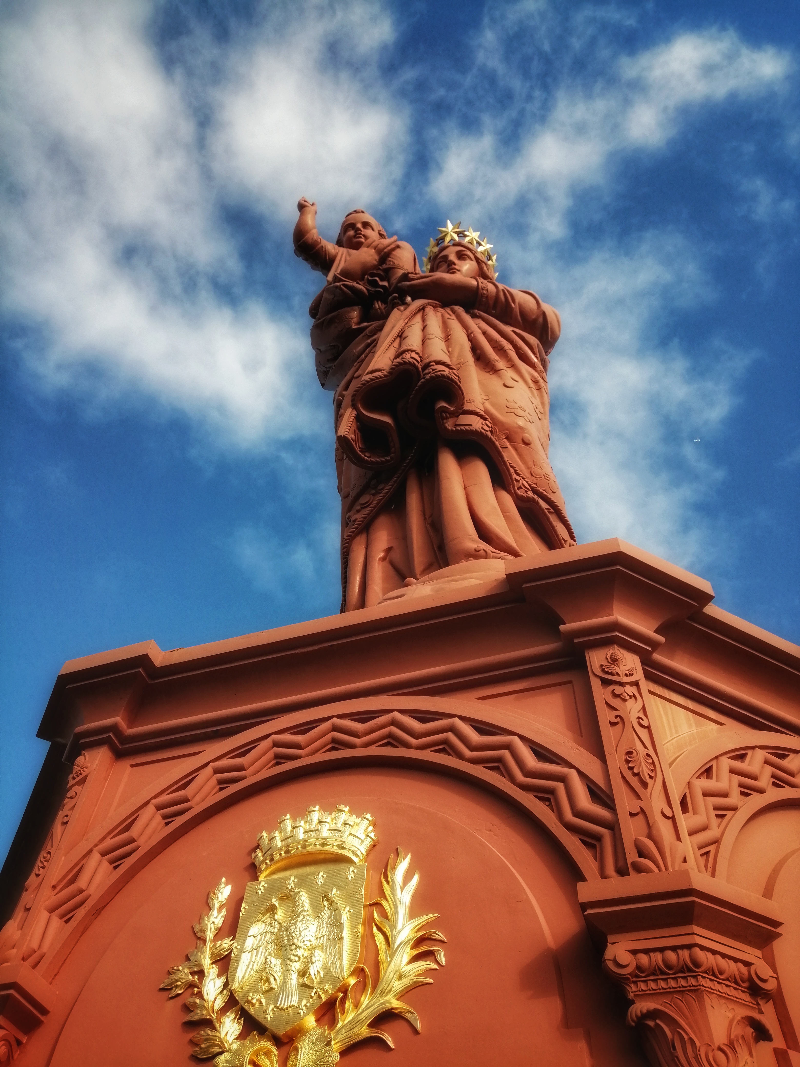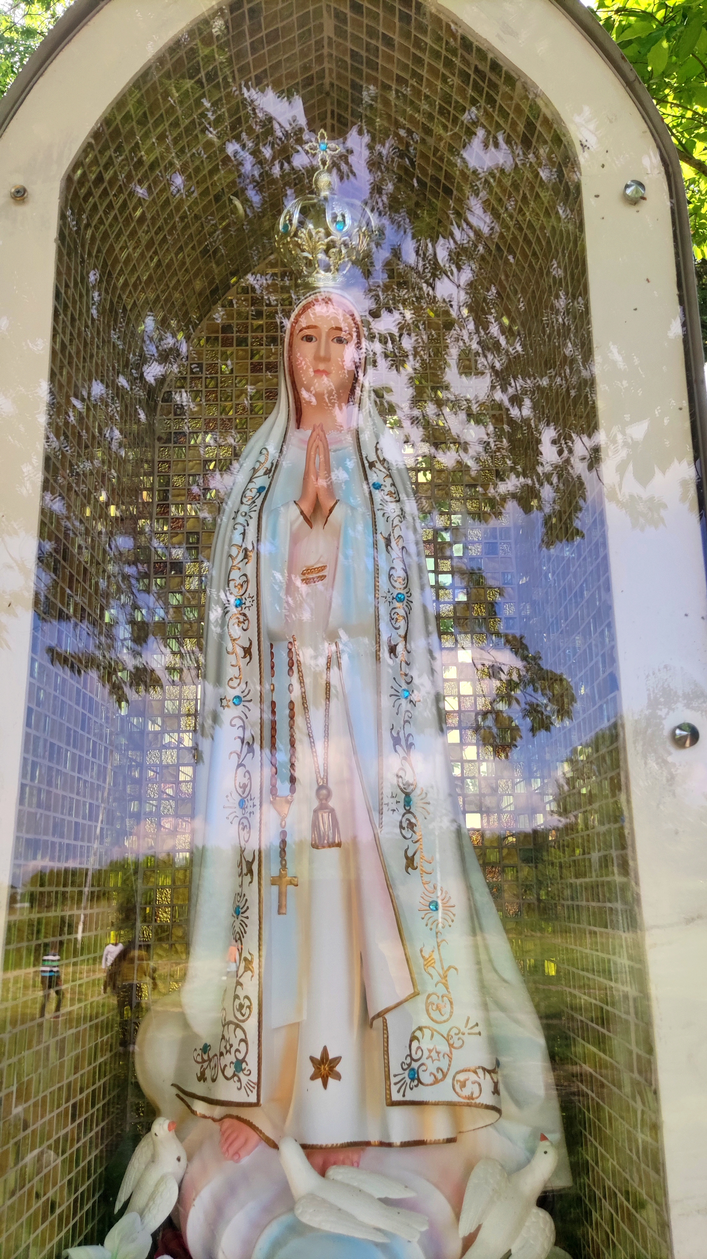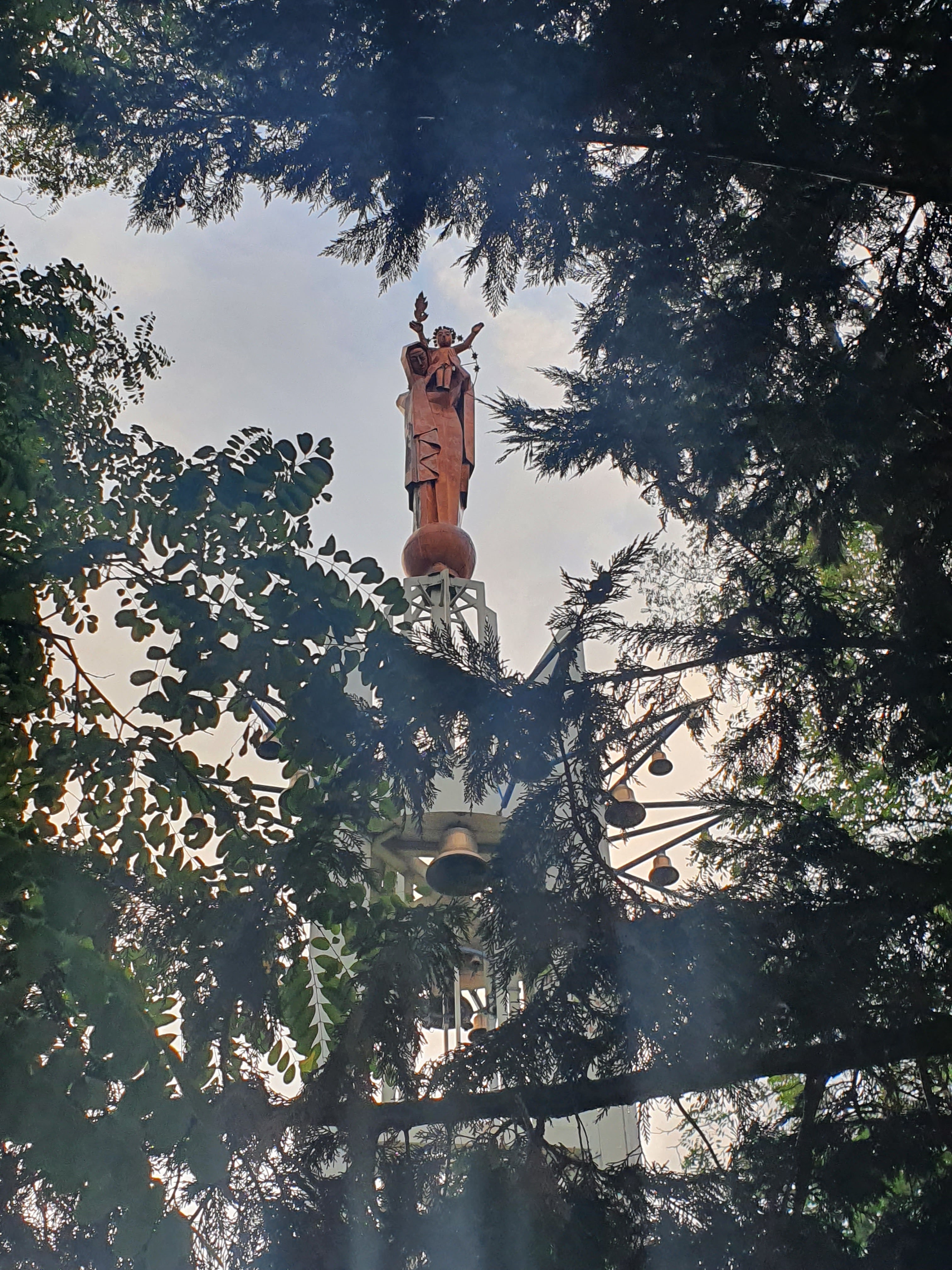 Un charmant lieu intimiste dans lequel on peut se (re)connecter à Dieu grâce à nos prières. L'édifice est surmonté d'une statue en cuivre doré de 7,2 m et représentant la Vierge Marie portant sur son épaule l'enfant, les bras ouverts sur le monde. Celle-ci est au sommet d'un piédestal de 25m et surplombe un carillon sophistiqué de 50 cloches programmées pour jouer un chant mariale. Outre cela, d'autres statues représentant toujours la Vierge Marie et l'enfant Jésus, inspirées de différentes sculptures religieuses de France et dites Vierges pèlerines sont érigées à l'extérieur du pavillon et accueillent le visiteur avec grâce et bienveillance.! 🙏🏻