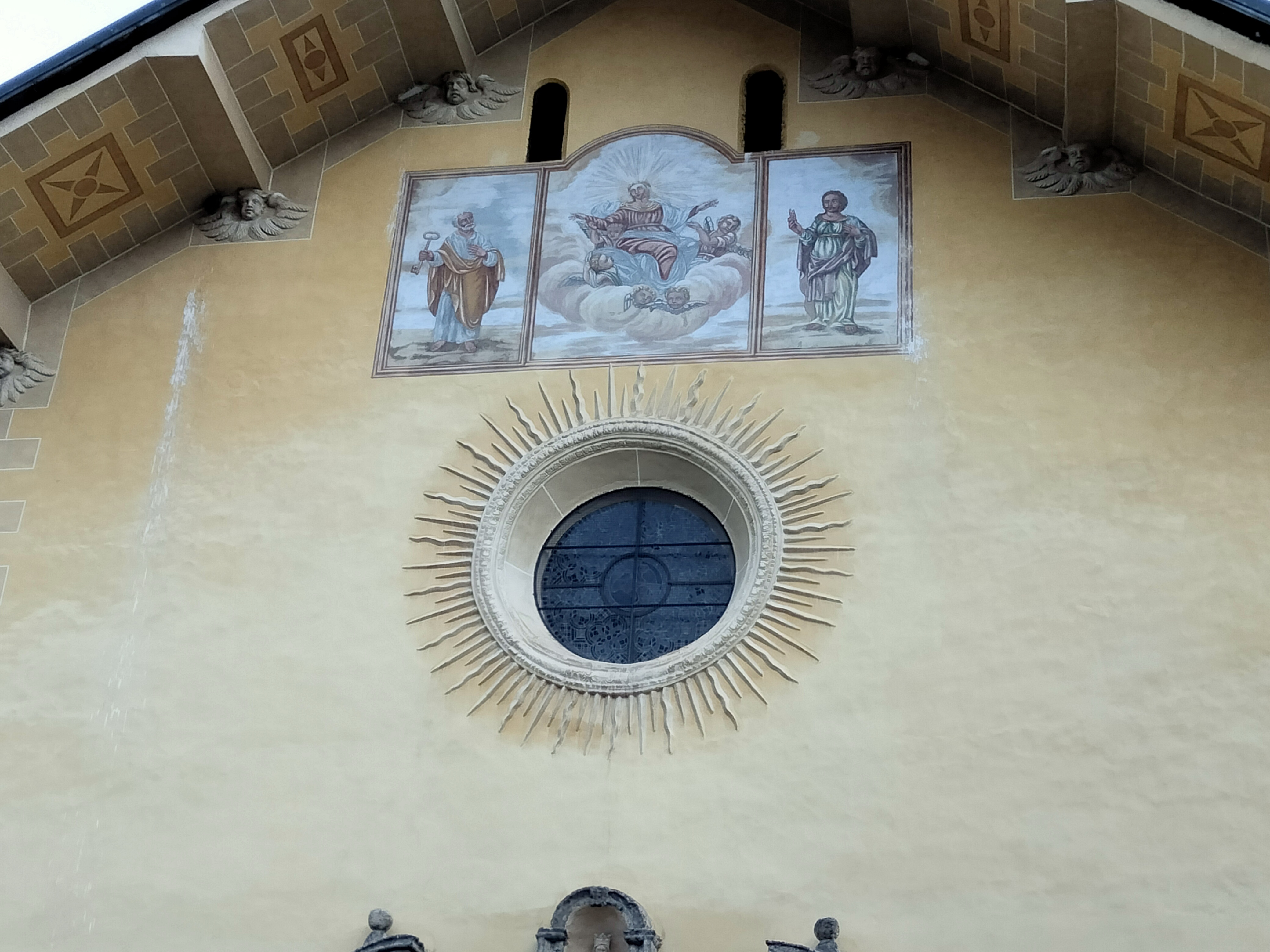 Église principale de Valloire à façade peinte. Intérieur avec stucs précieux représentant des chérubins et des anges.