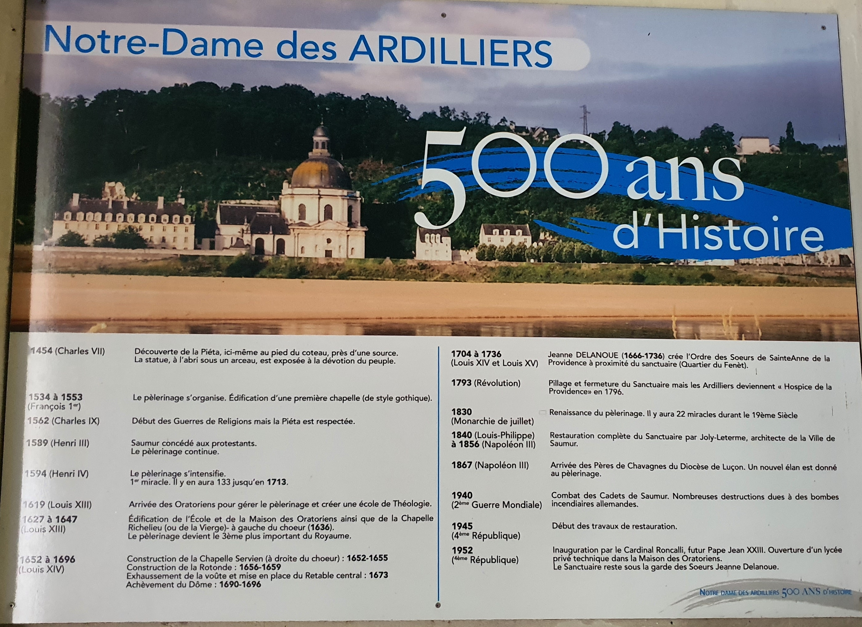 Une histoire de presque 6 siècles, un édifice à l'architecture surprenante et magistrale. Une piéta découverte au 15ème siècle, fut la source, au 16ème et 17ème siècles du pèlerinage le plus important de l'ouest de la France. Au milieu du 15ème siècle, une chapelle gothique est construite, le pèlerinage s'intensifie. Les projets architecturaux vont se succéder, une école de théologie est créée, des ordres s'installent, une magnifique rotonde est construite au 17ème siècle, dotant ce sanctuaire d'une surprenante et magistrale architecture. Les différentes restaurations ont permis d'offrir aux visiteurs un édifice en bel état, la piéta est abritée aujourd'hui dans un retable construit pour elle. Je ne peux que conseiller la visite de Notre Dame des Ardilliers si l'on passe à Saumur. Personnellement, la visite m'a pris 1 heure.