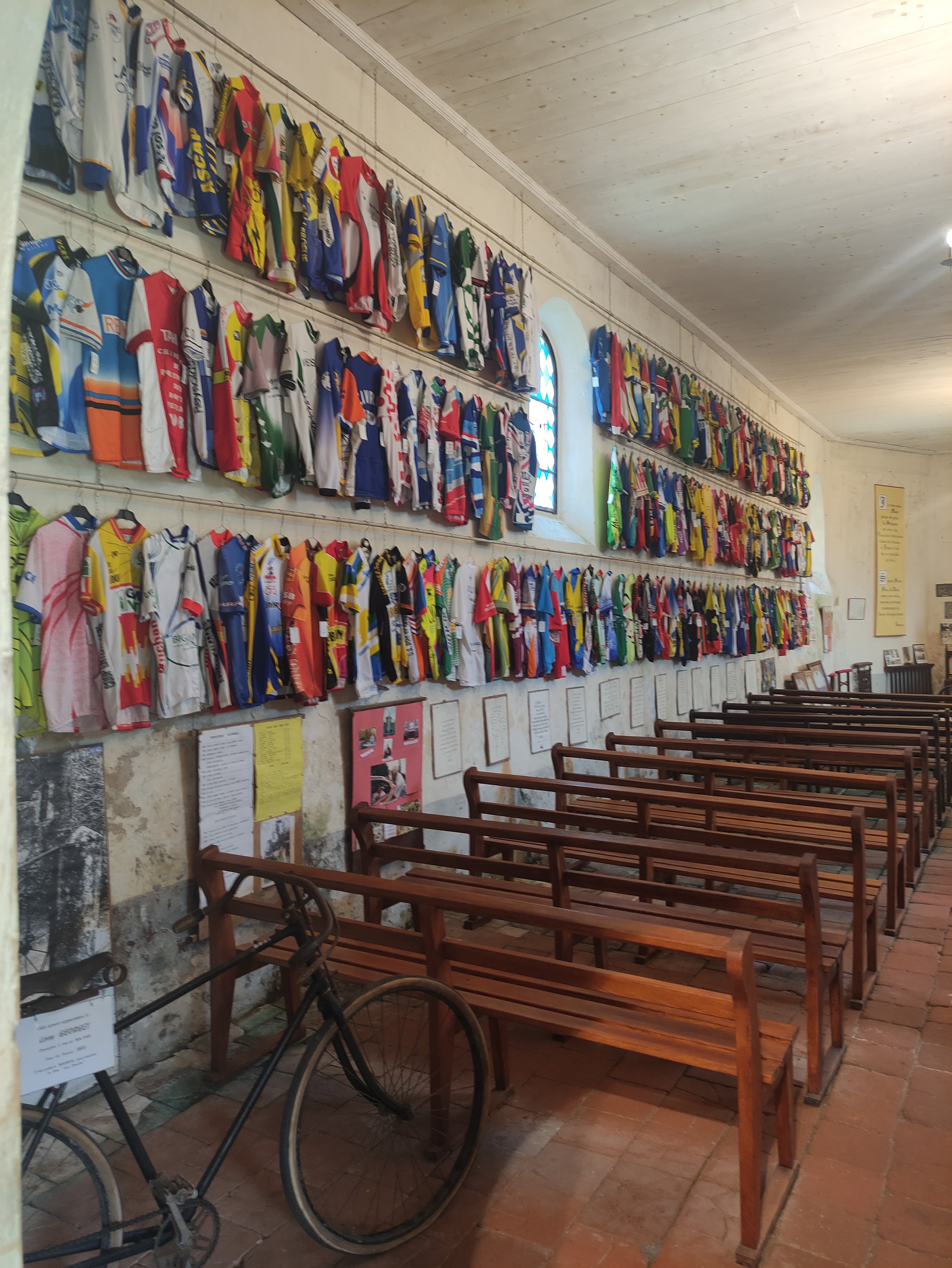 Sympa, les vieux vélos, les vieilles photos de nos champions, et les maillots multicolores qui tapissent les murs de cette toute petite église